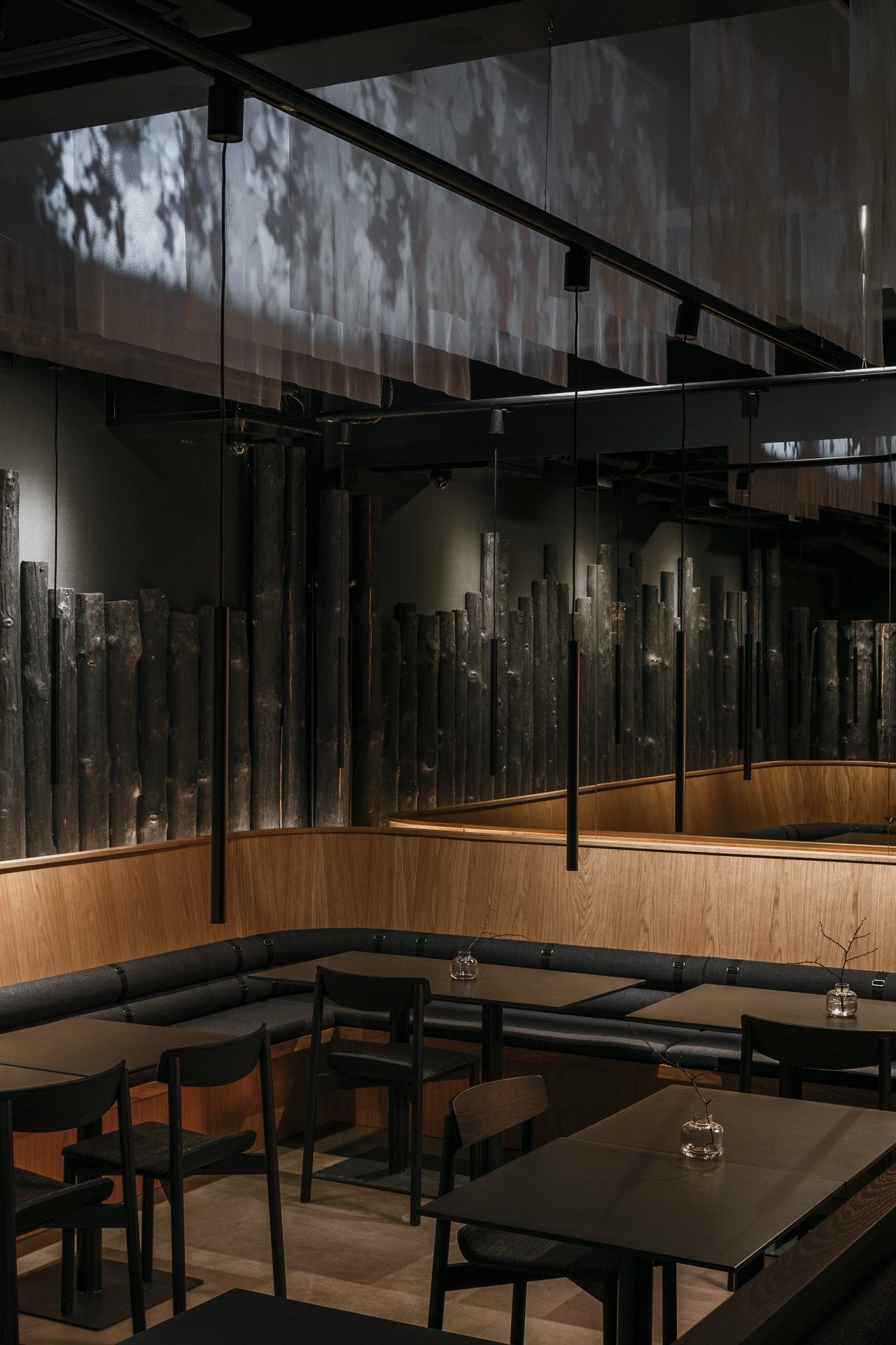 We have united a small hall with a long two-level bench and an extensive podium - this is how we managed to create three zones with different moods without building actual partitions, and to solve the problem of an entrance raised above the floor level, turning it into a plus. A "grove" zone appeared at the lavishly landscaped window, a "gazebo" zone with a high planting to the left of the entrance to the bar, and a "forest" zone surrounded by burnt tree trunks is the heart of the hall
