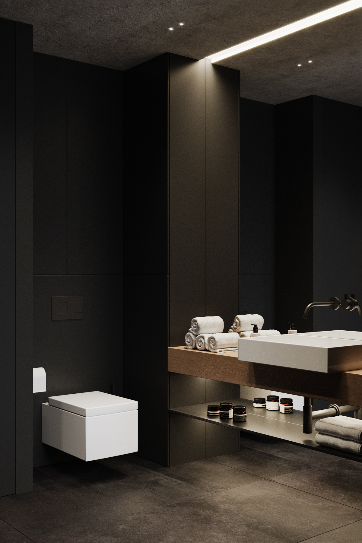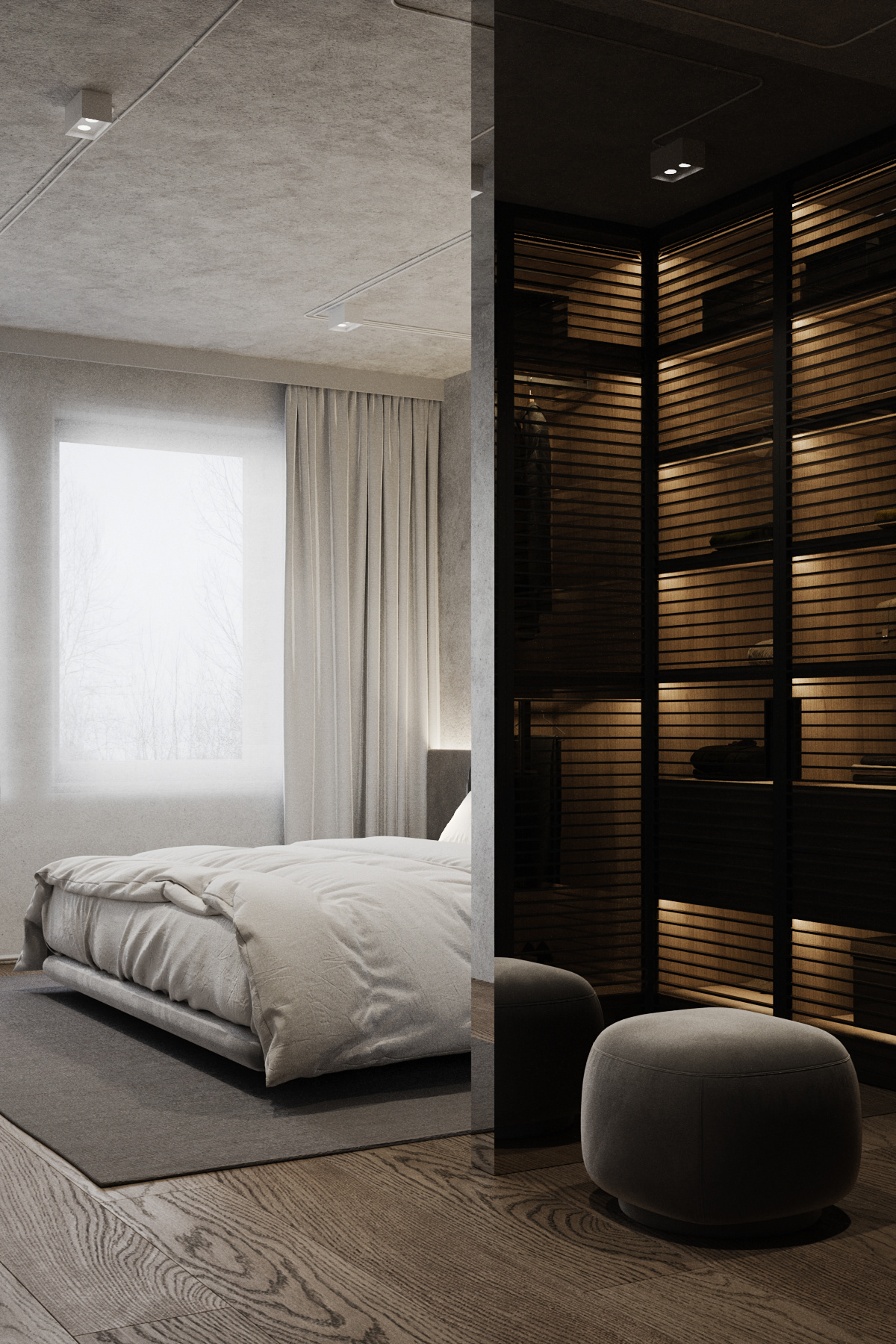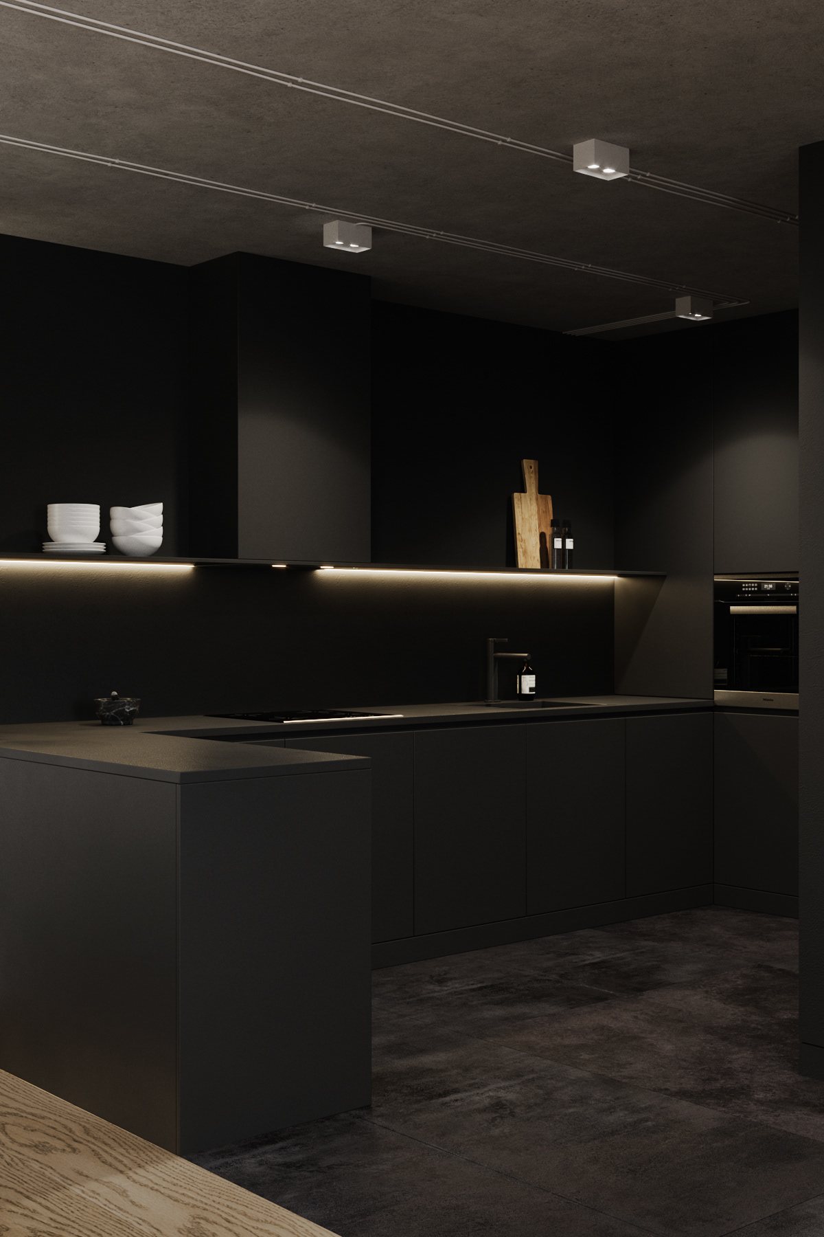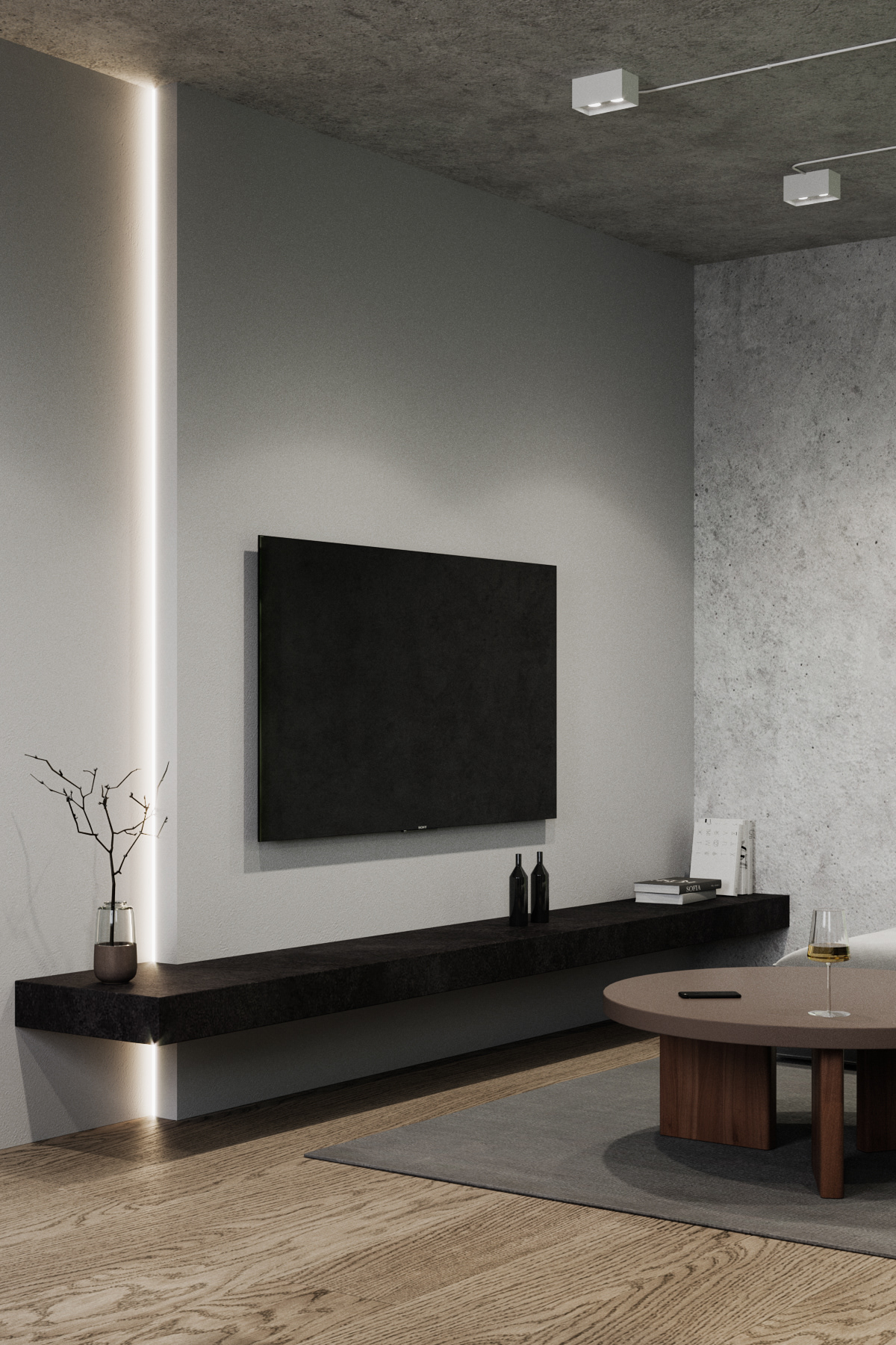 Country apartment for temporary living located in a quiet and green area near Saint Petersburg. Client knew perfectly well how he saw his future home: dark, laconic, rough, monolithic. The cosiness should be created only with the help of various lighting scenarios.