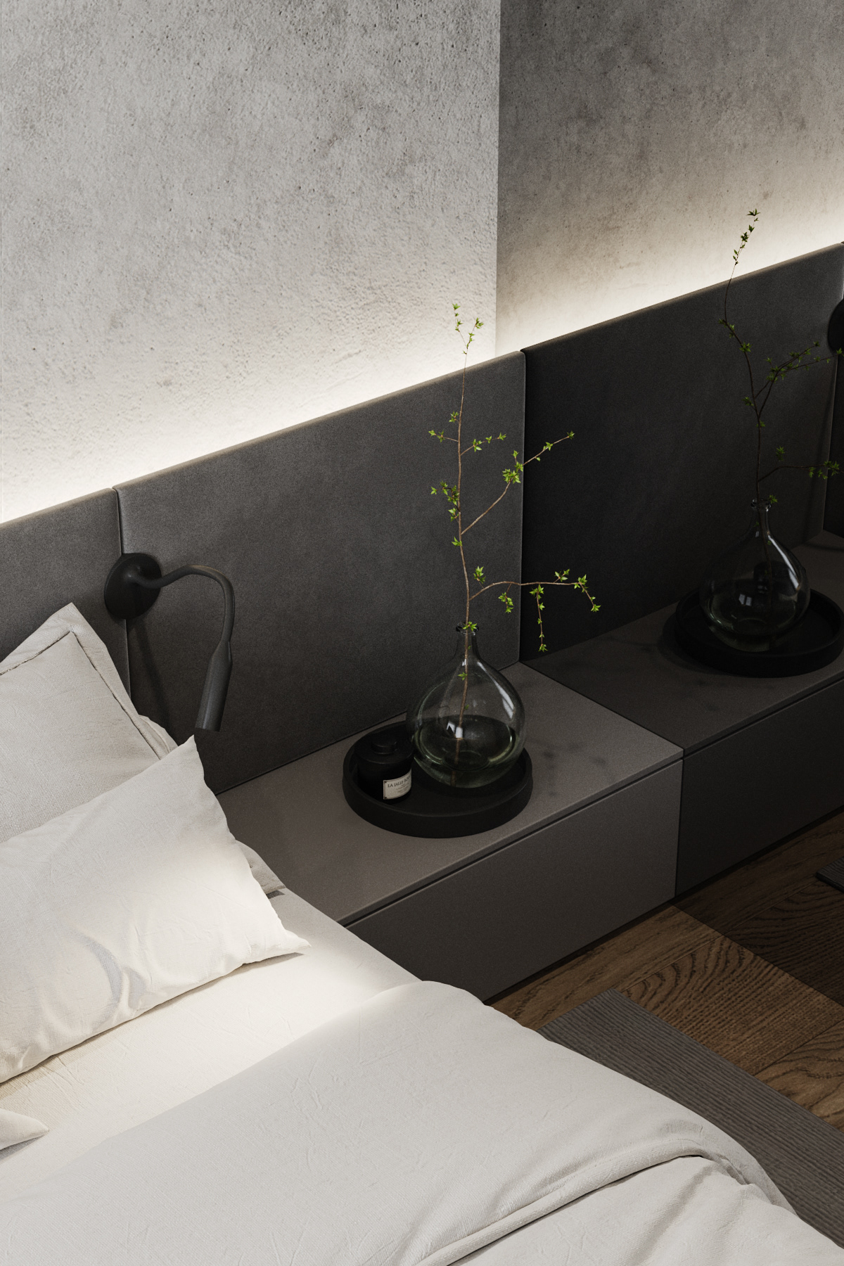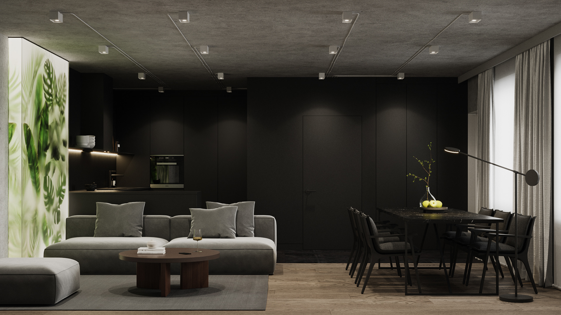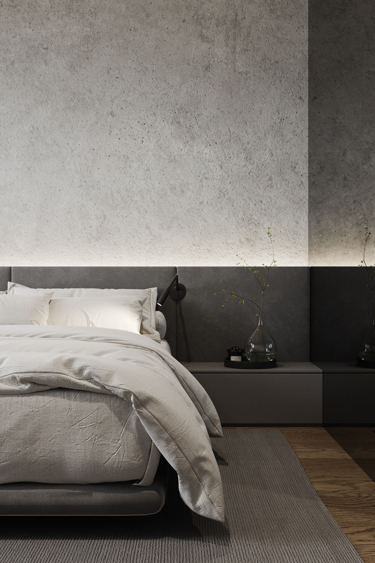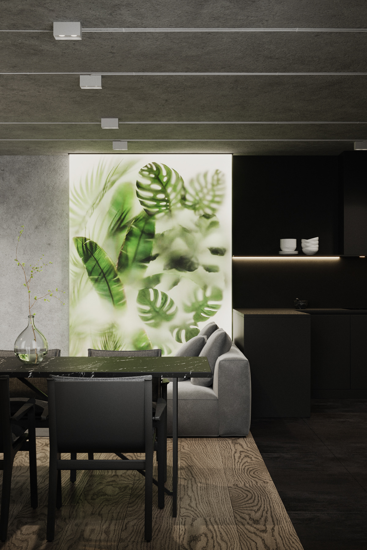Country apartment for temporary living located in a quiet and green area near Saint Petersburg. Client knew perfectly well how he saw his future home: dark, laconic, rough, monolithic. The cosiness should be created only with the help of various lighting scenarios.