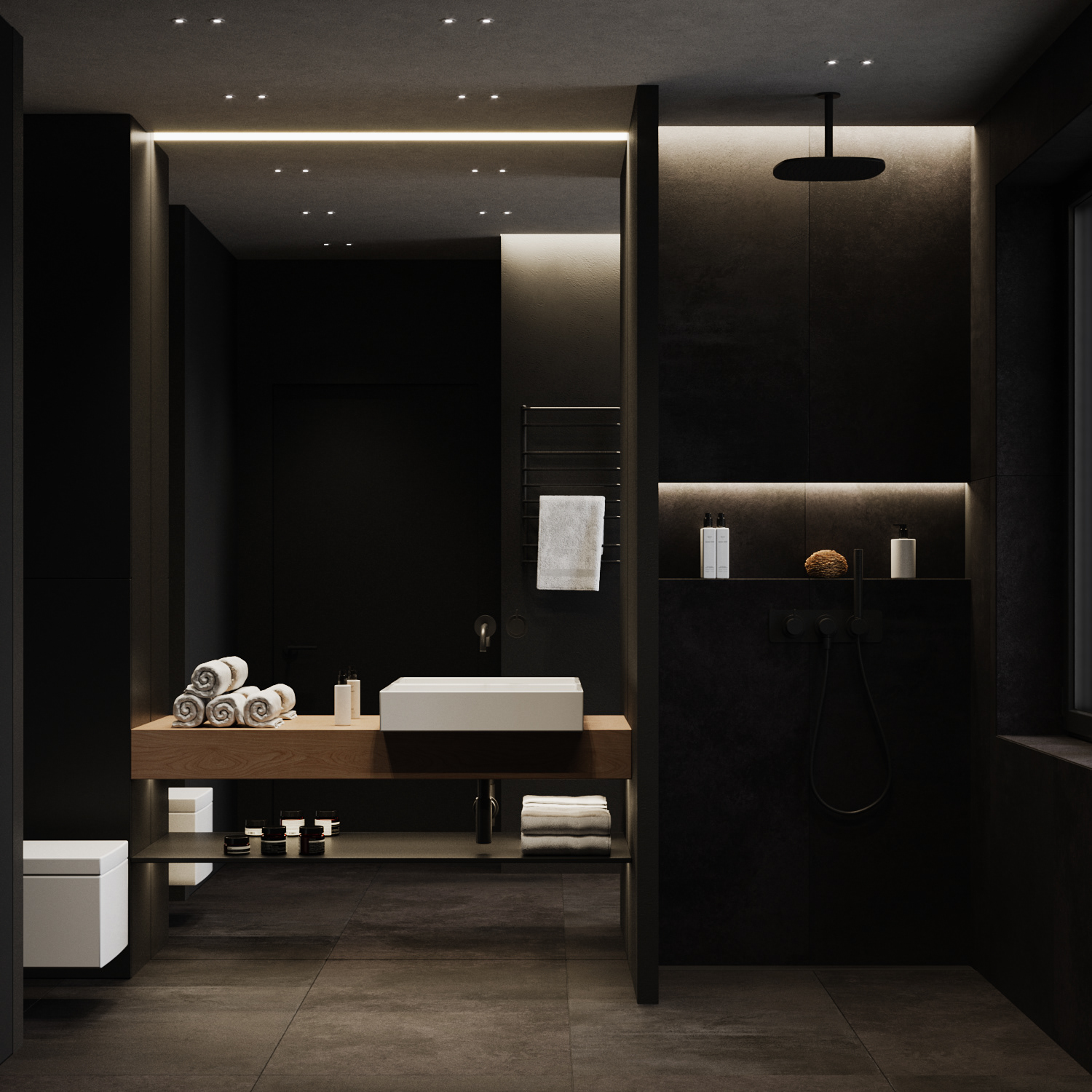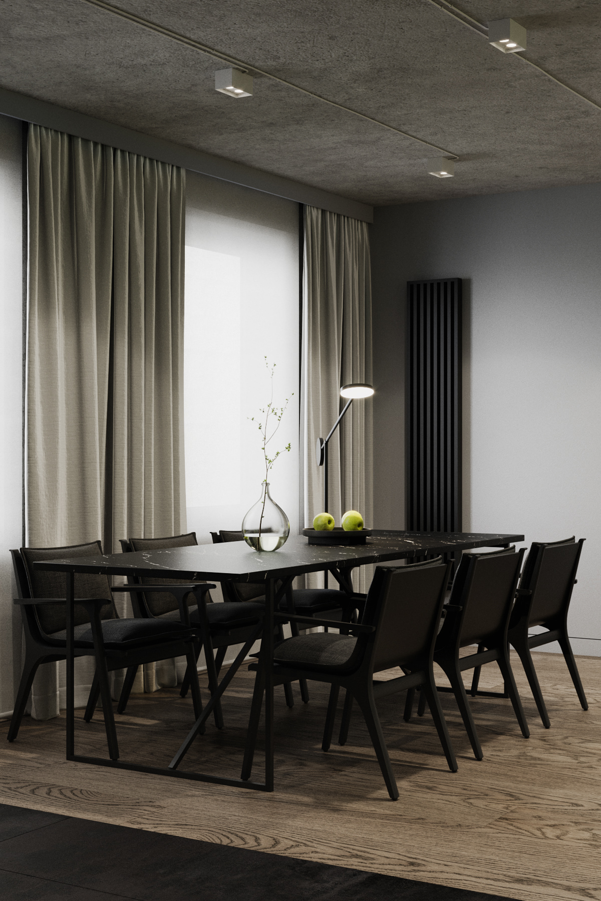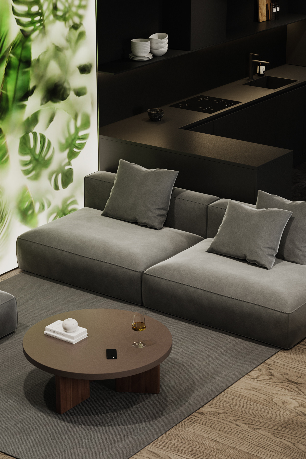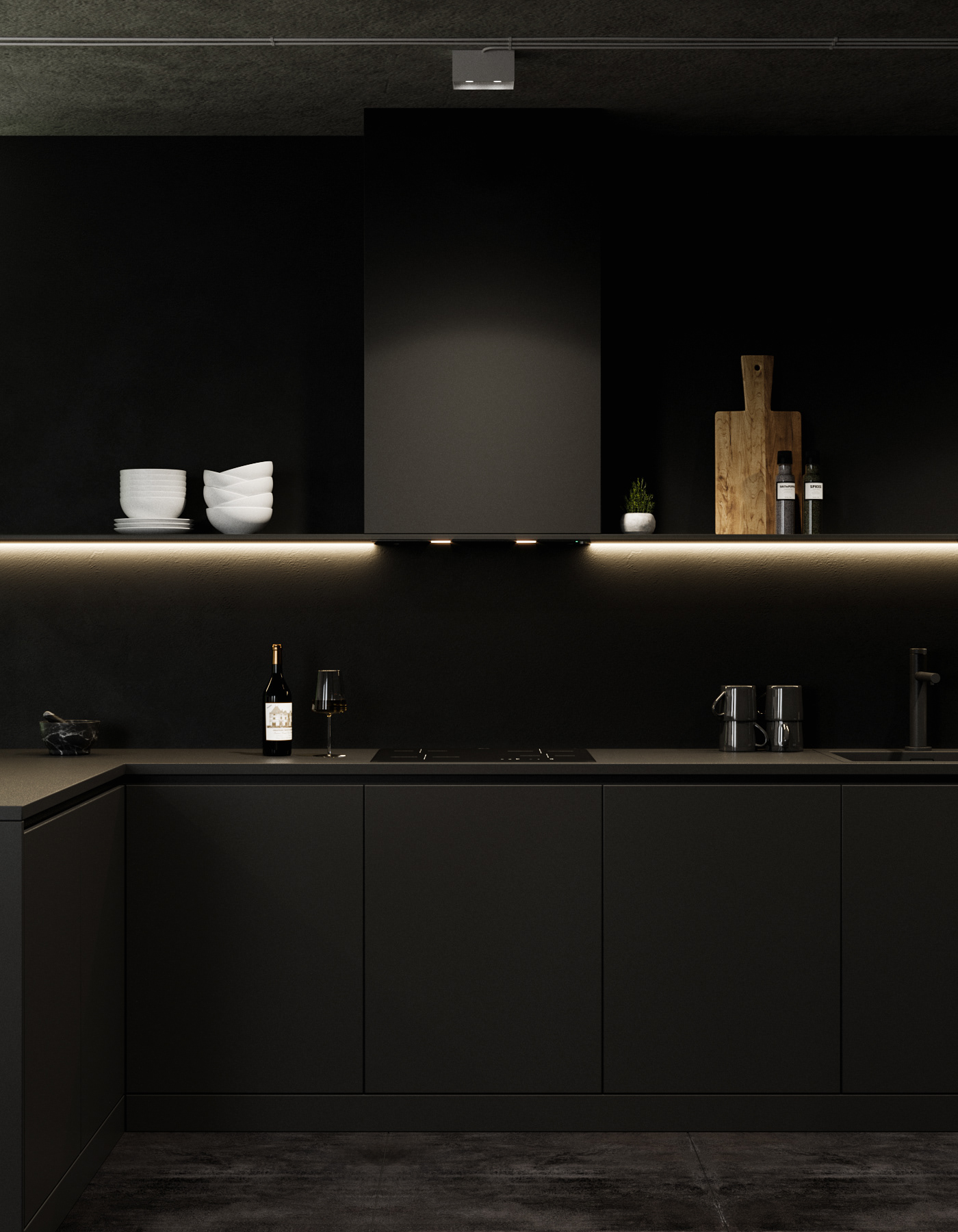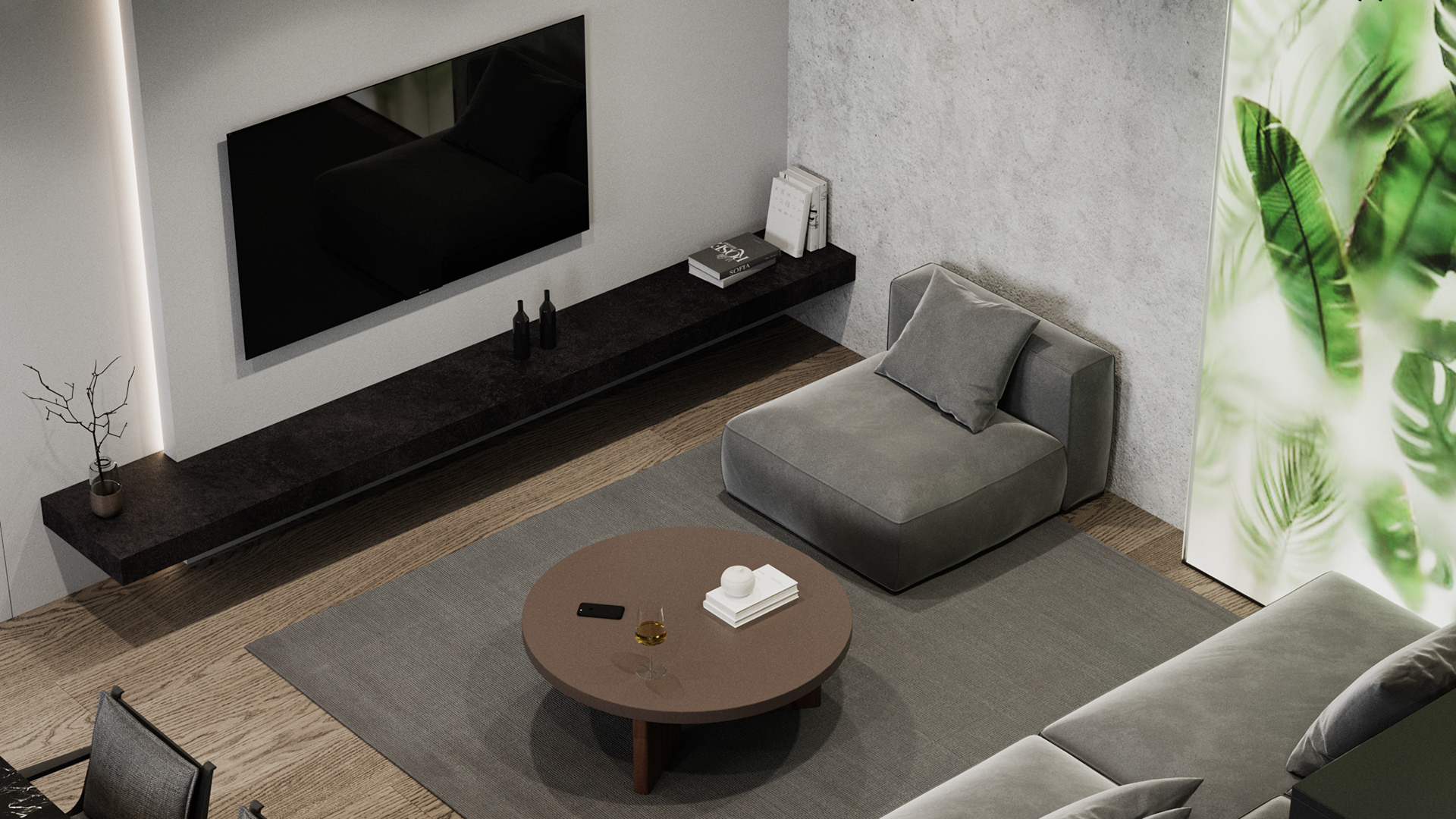 Country apartment for temporary living located in a quiet and green area near Saint Petersburg. Client knew perfectly well how he saw his future home: dark, laconic, rough, monolithic. The cosiness should be created only with the help of various lighting scenarios.