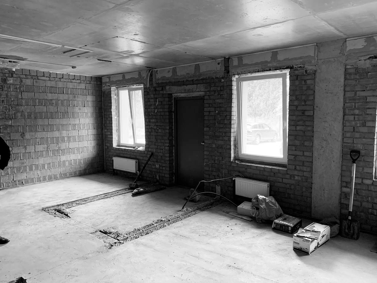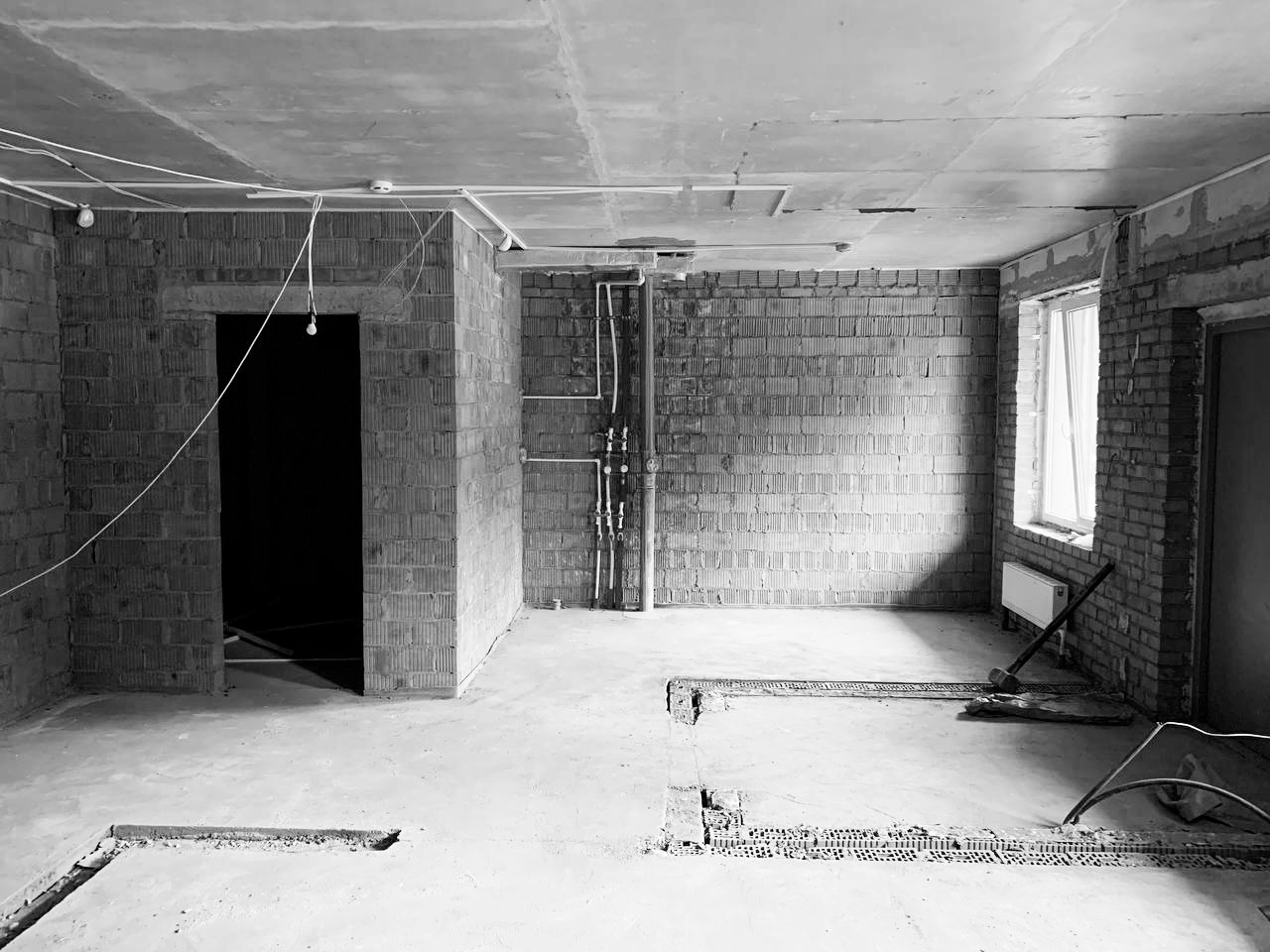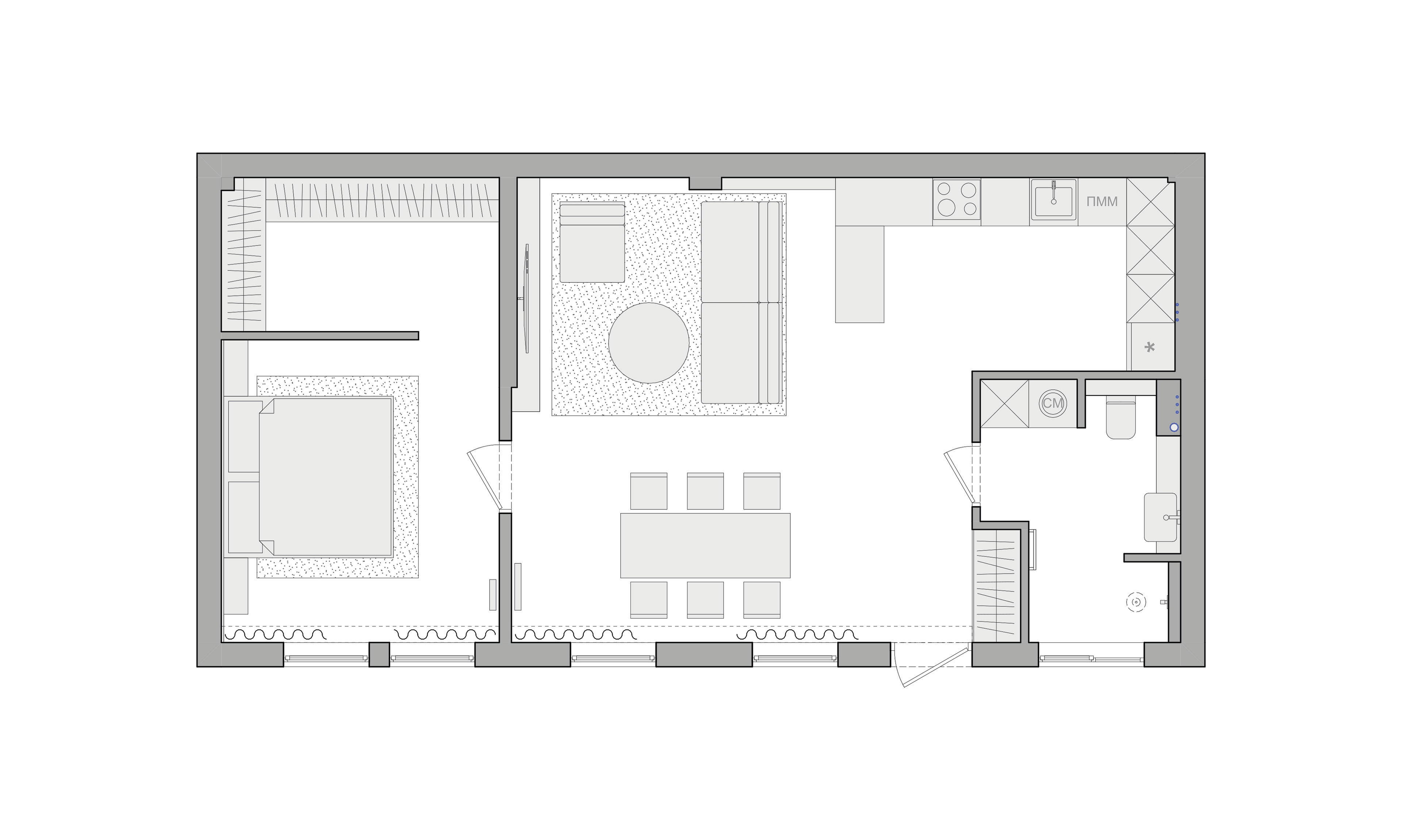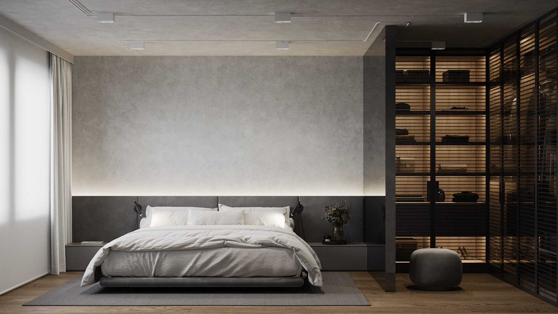 Country apartment for temporary living located in a quiet and green area near Saint Petersburg. Client knew perfectly well how he saw his future home: dark, laconic, rough, monolithic. The cosiness should be created only with the help of various lighting scenarios.
