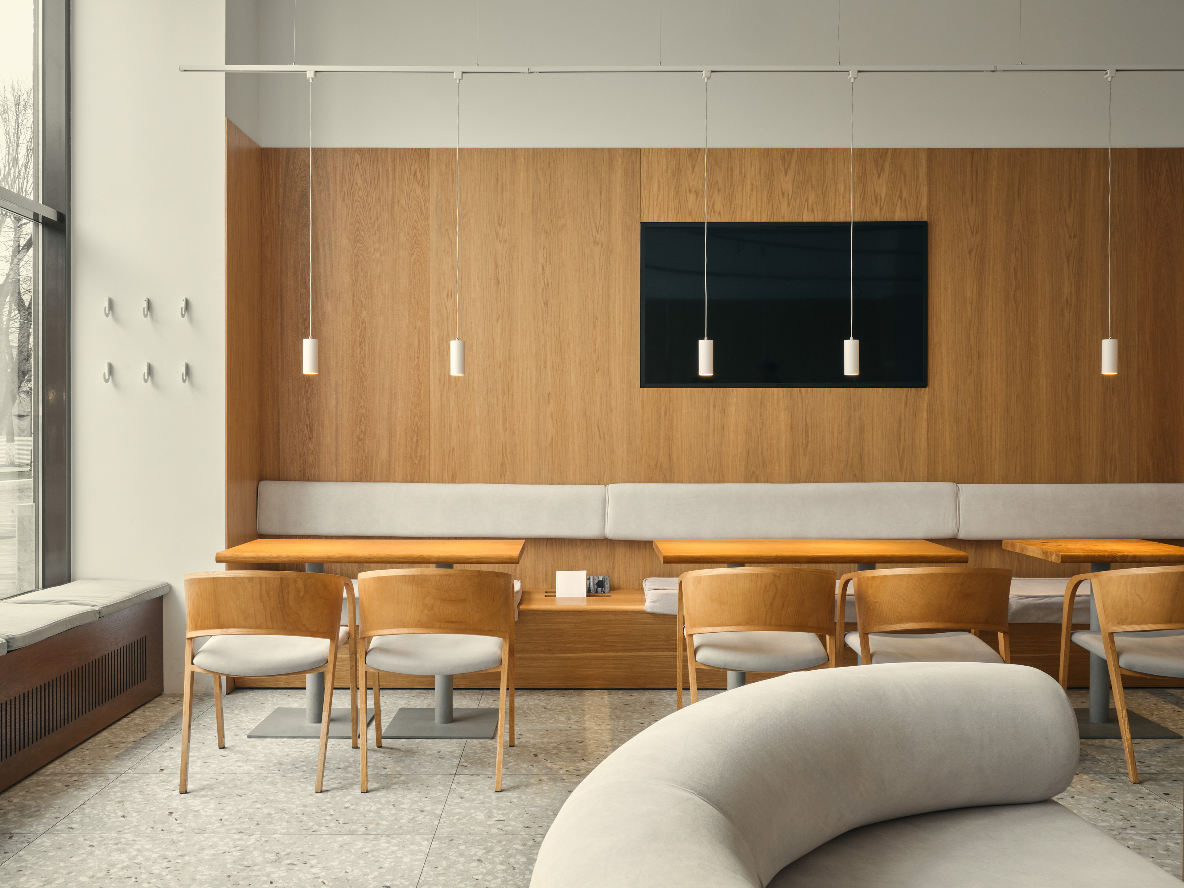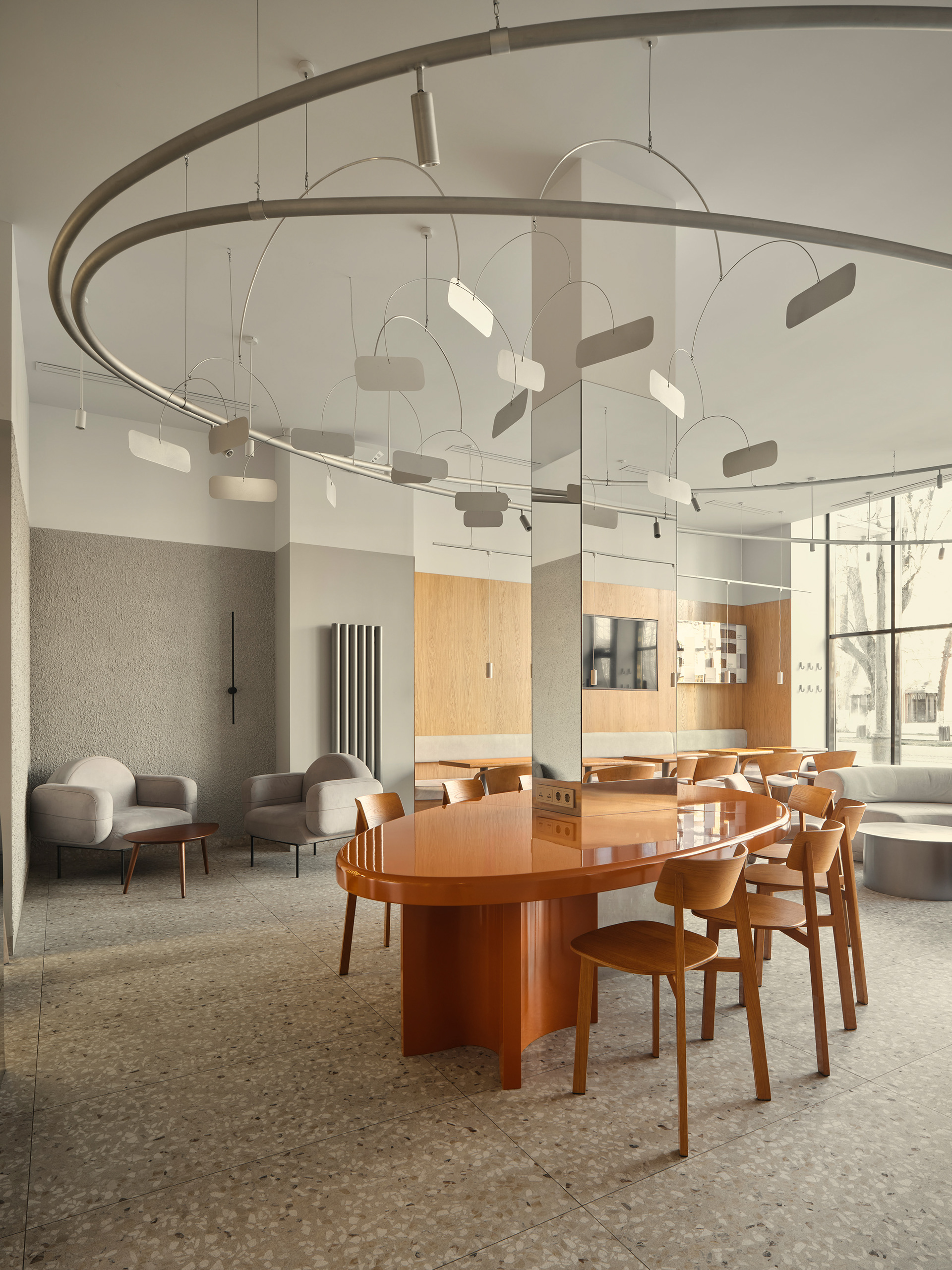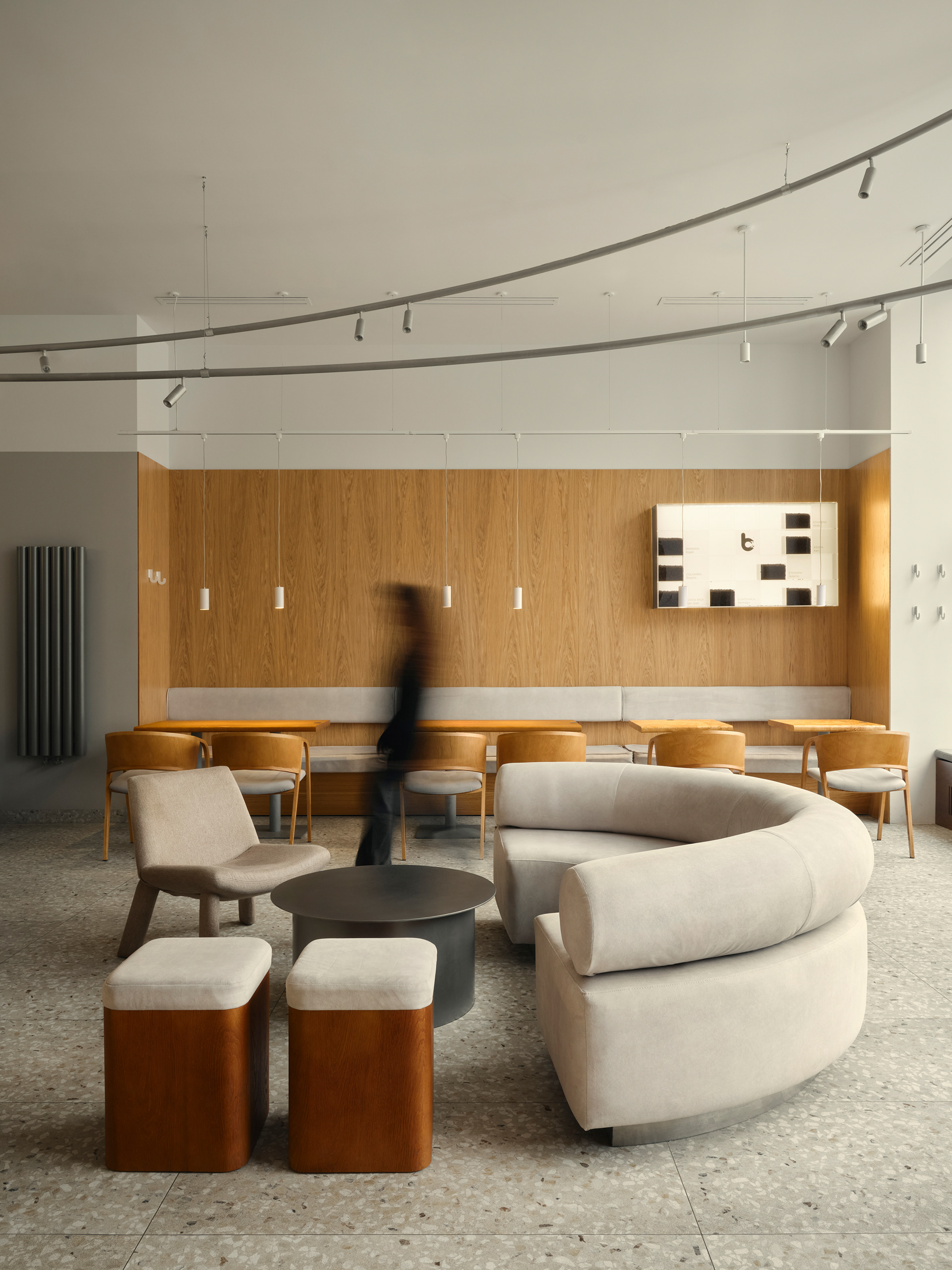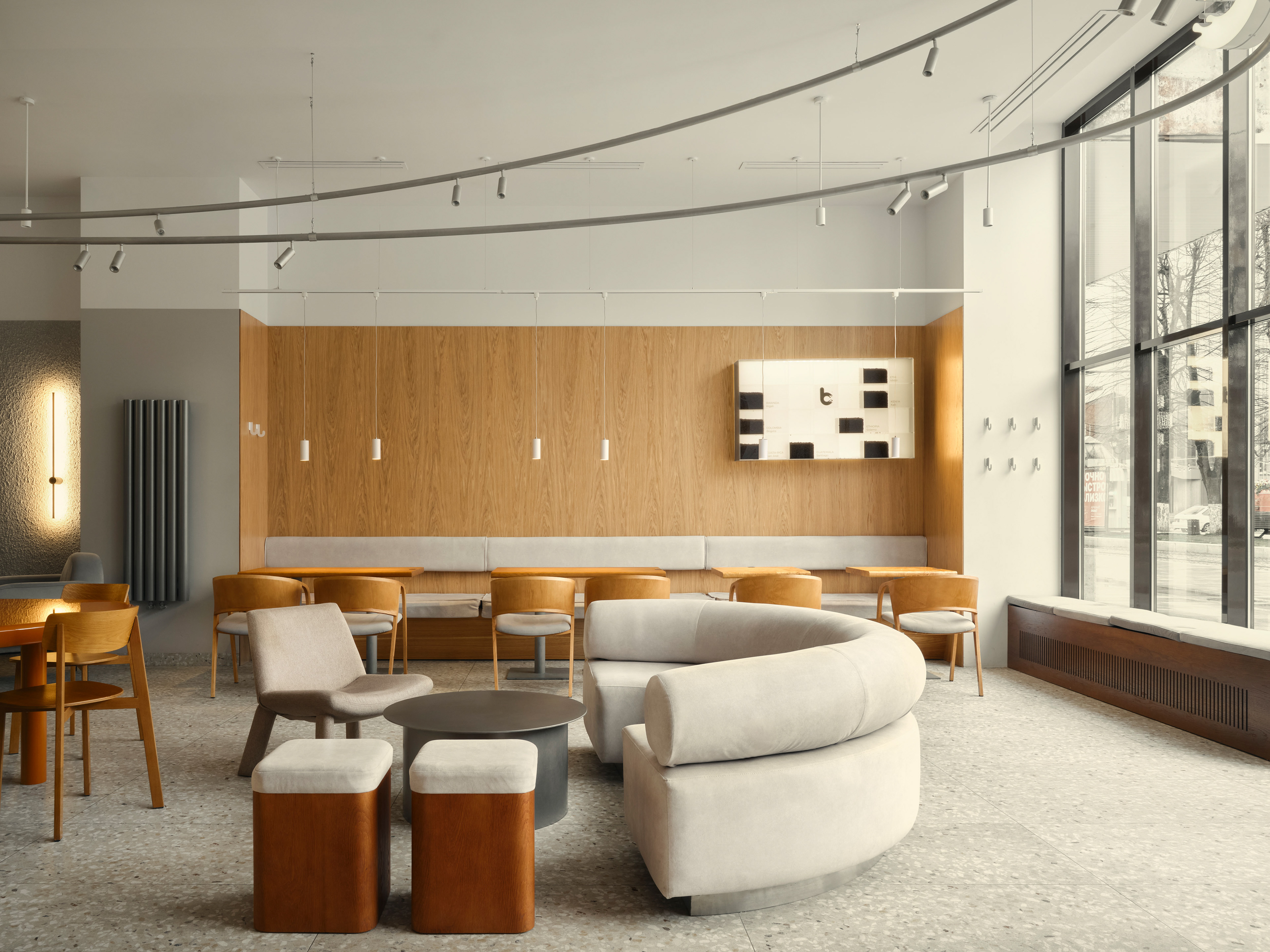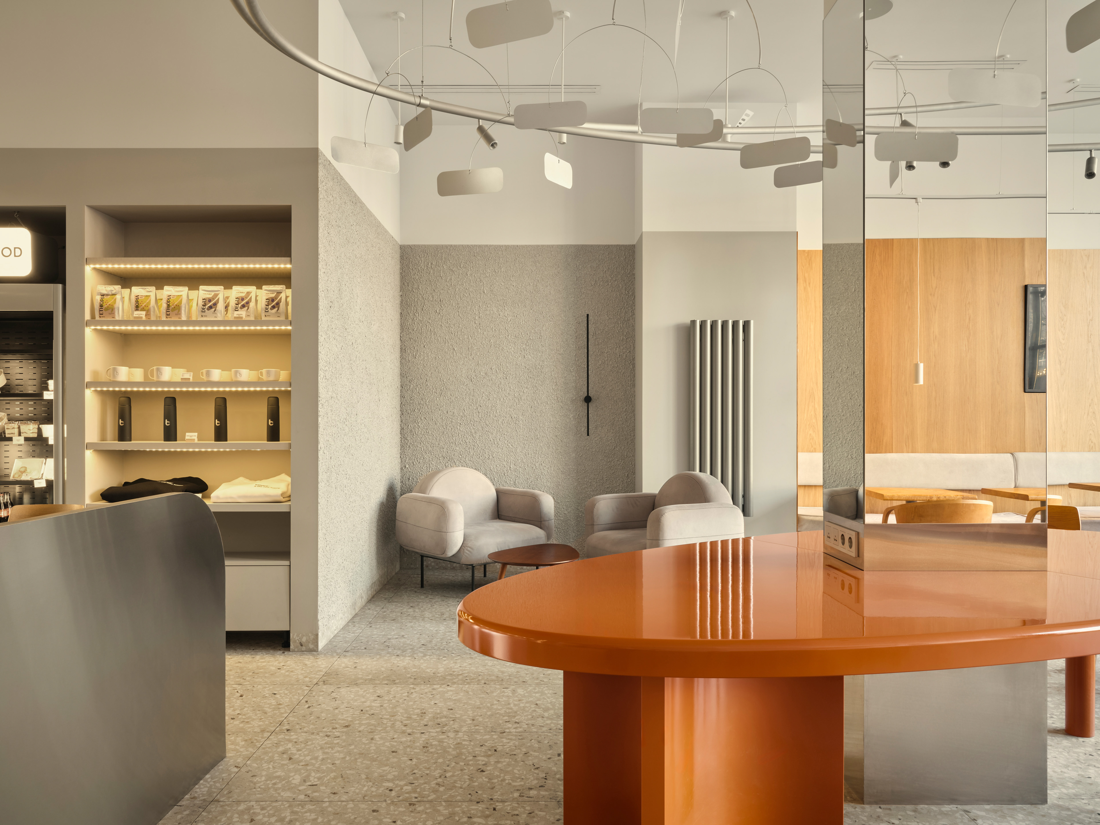 Since Balance is a minimalist coffee shop designed to captivate visitors, we opted for a more subdued color scheme, taking inspiration from the film Fantastic Mr. Fox. As a result, the entire space feels warm and muted, with the glossy communal table in a salted caramel shade serving as the focal point.