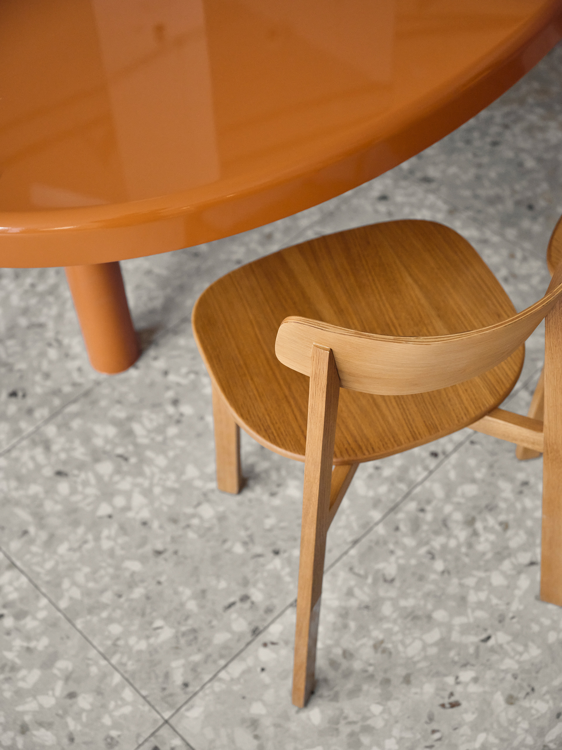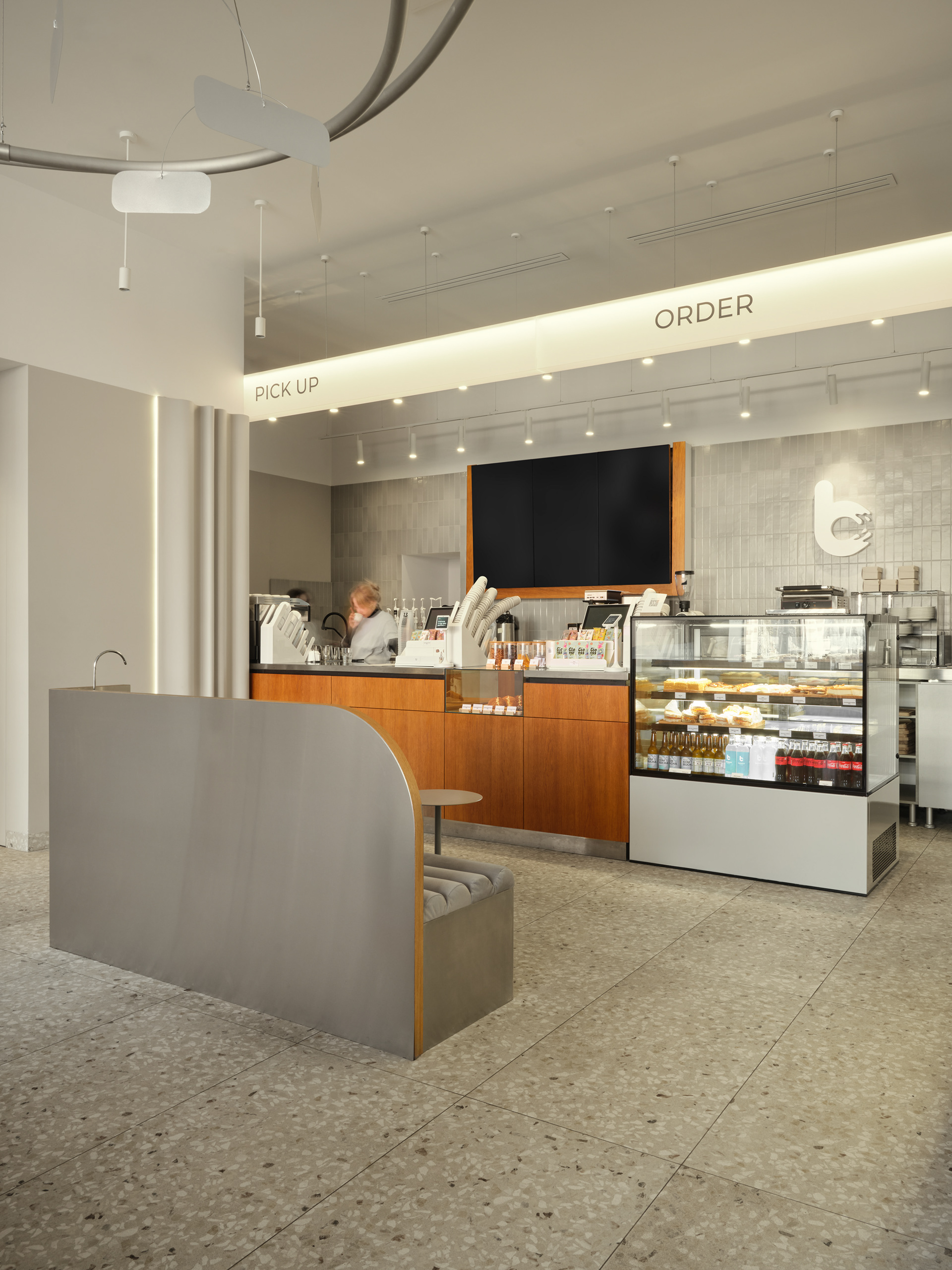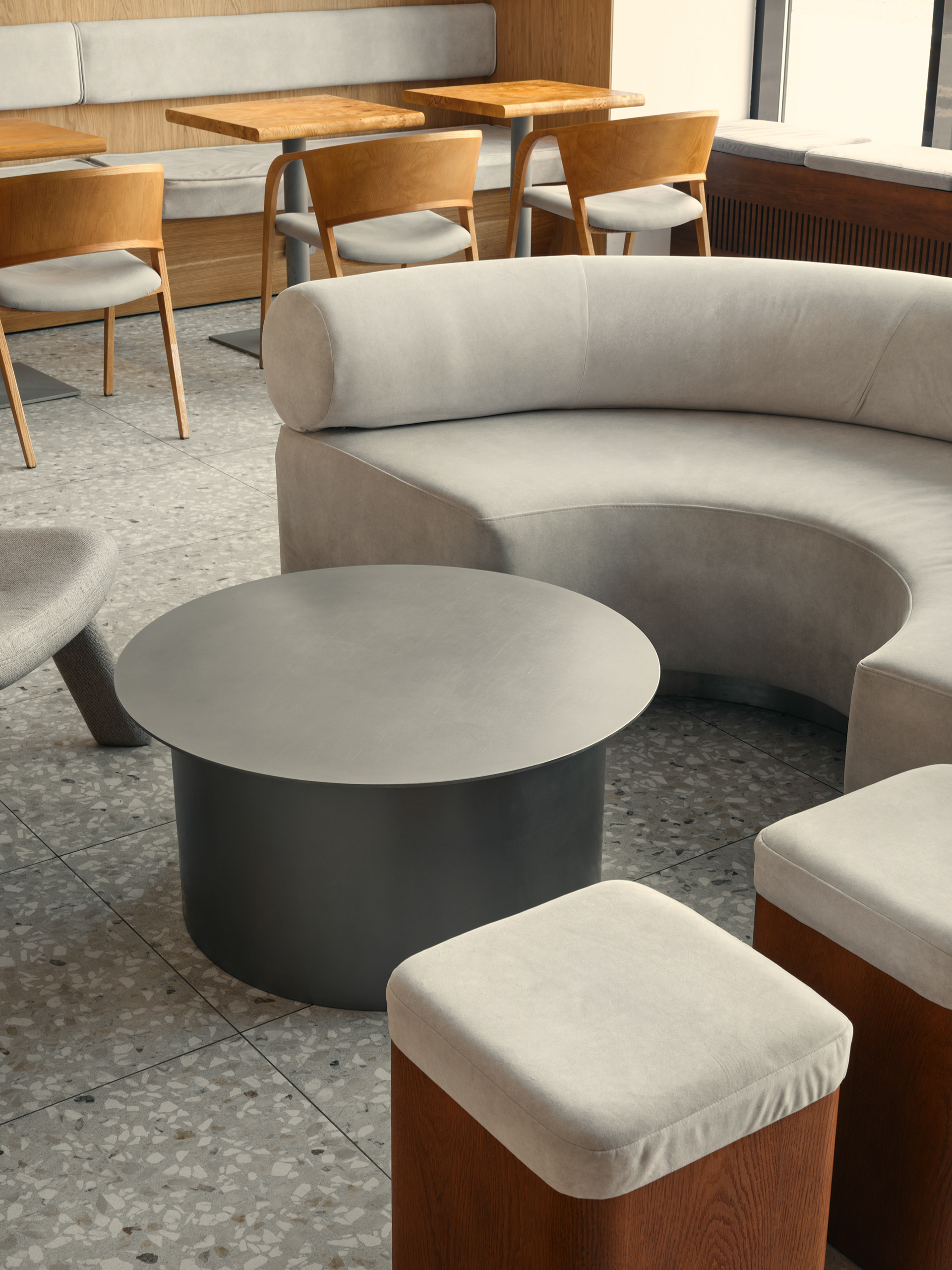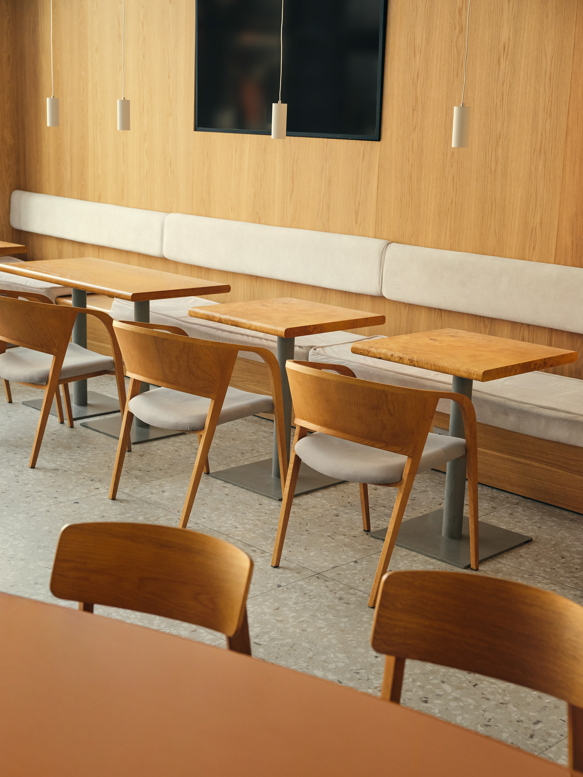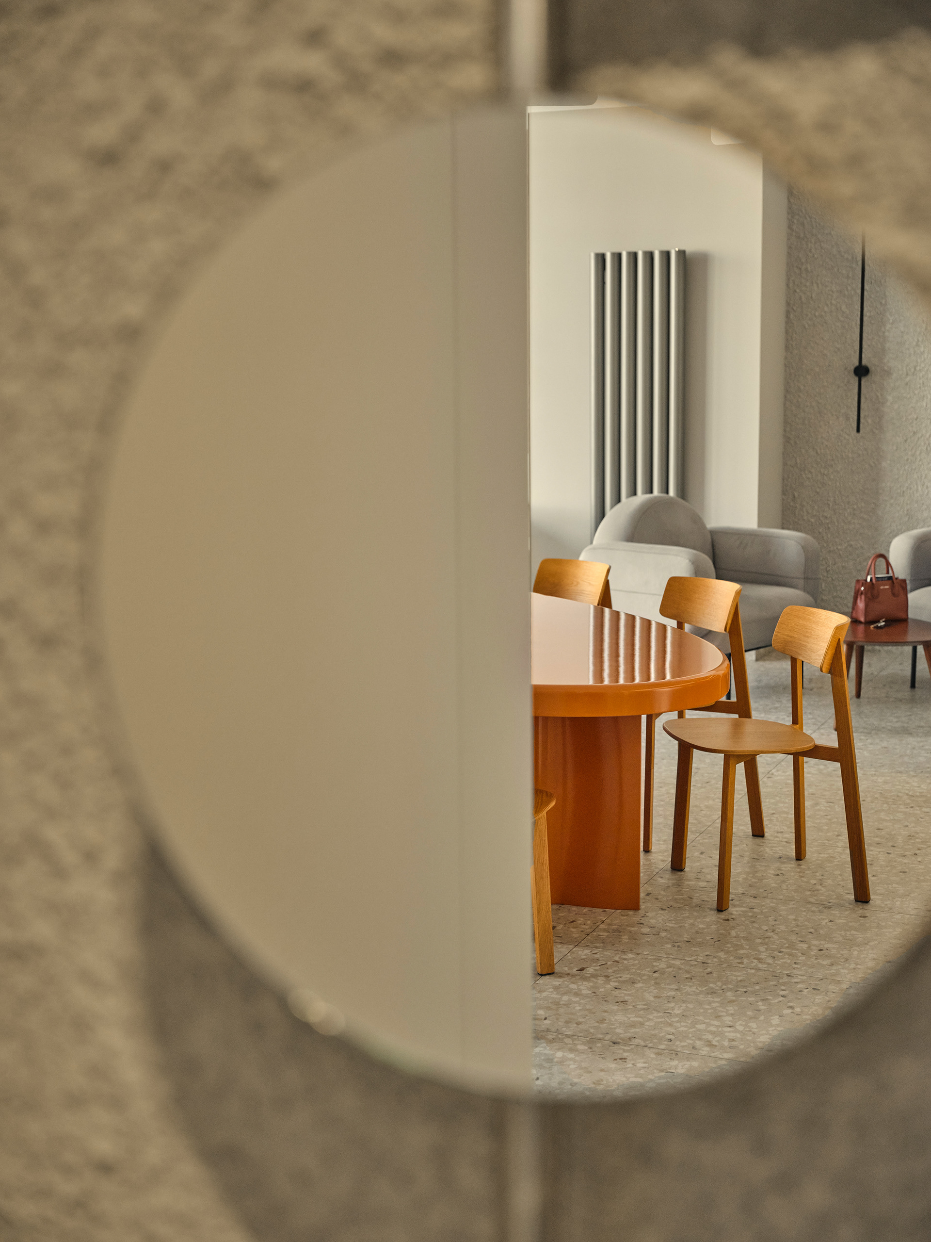 Since Balance is a minimalist coffee shop designed to captivate visitors, we opted for a more subdued color scheme, taking inspiration from the film Fantastic Mr. Fox. As a result, the entire space feels warm and muted, with the glossy communal table in a salted caramel shade serving as the focal point.