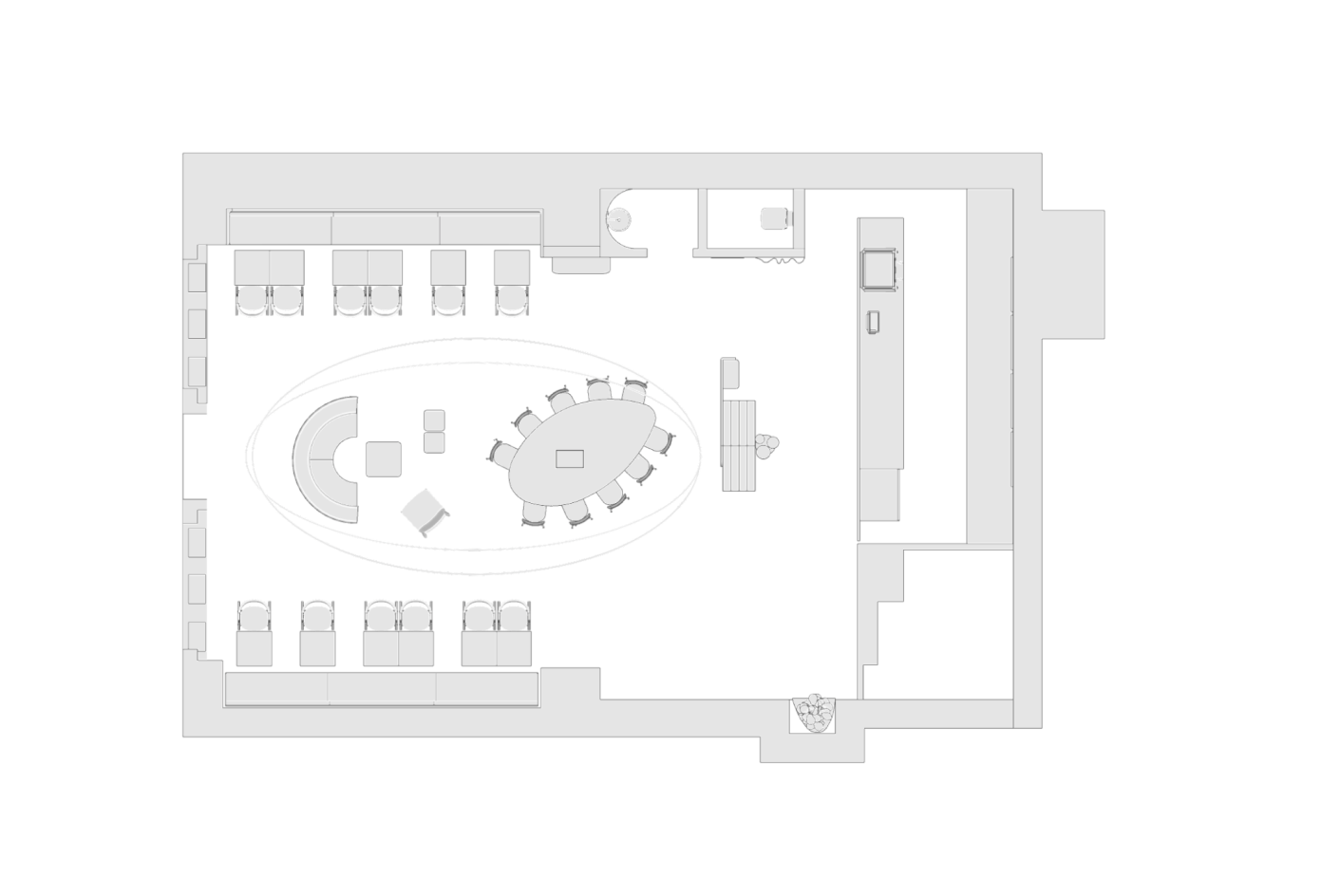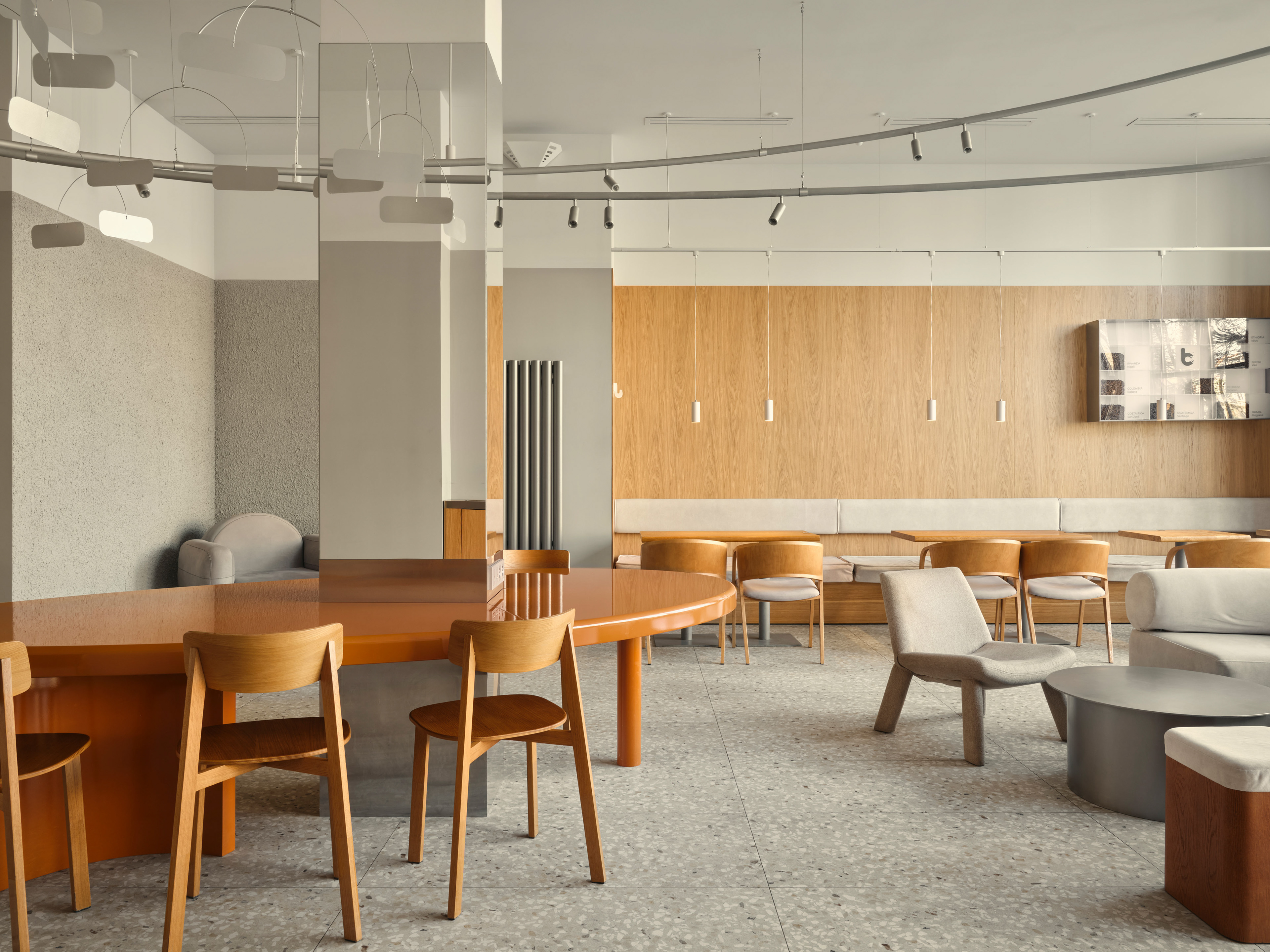 Here, a central column played into our hands, becoming the axis of the composition. To blend the axis into the space, we used mirrors, with seating on the left perfectly reflecting the seating on the right. A semicircular sofa welcoming visitors at the entrance further amplified this effect.