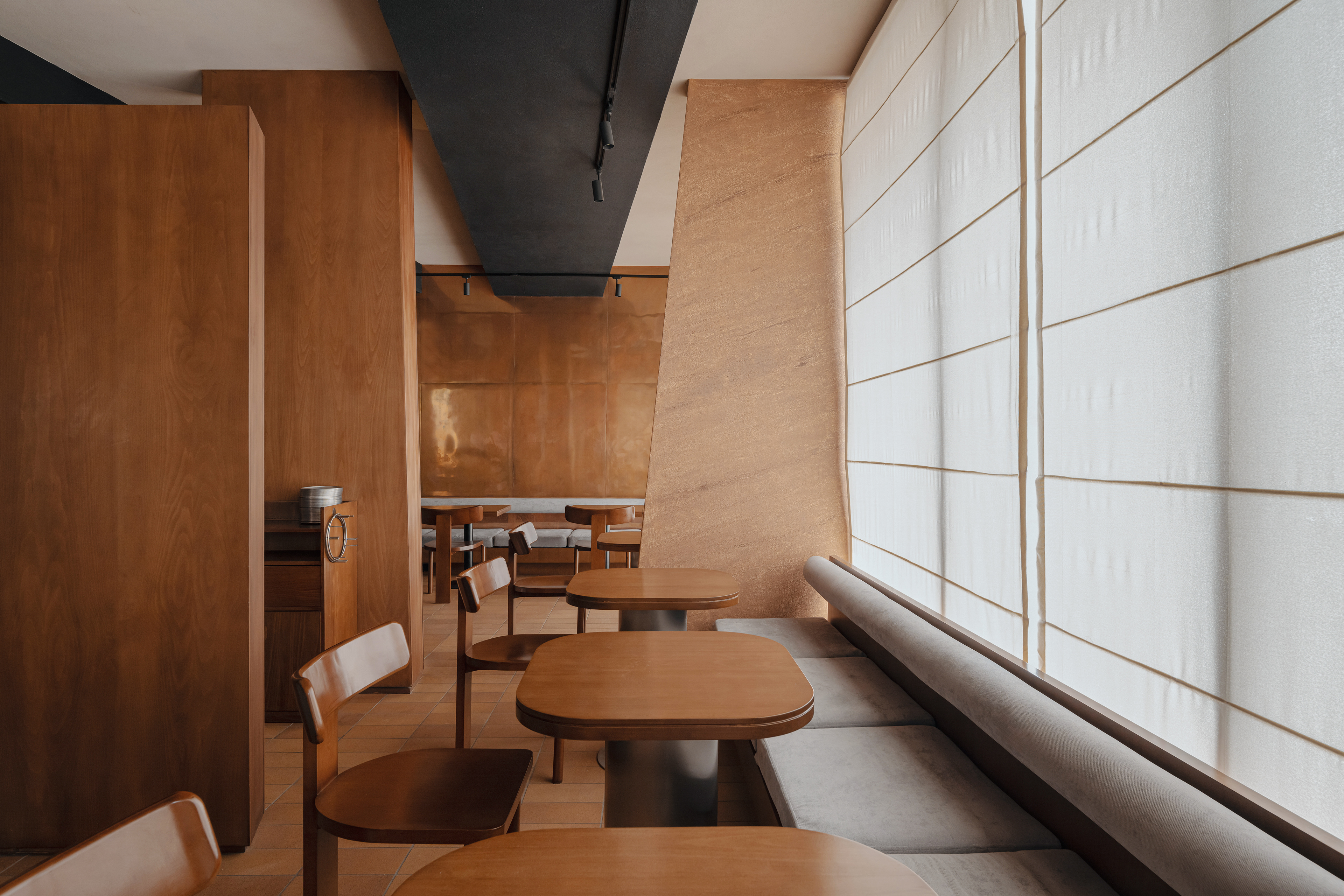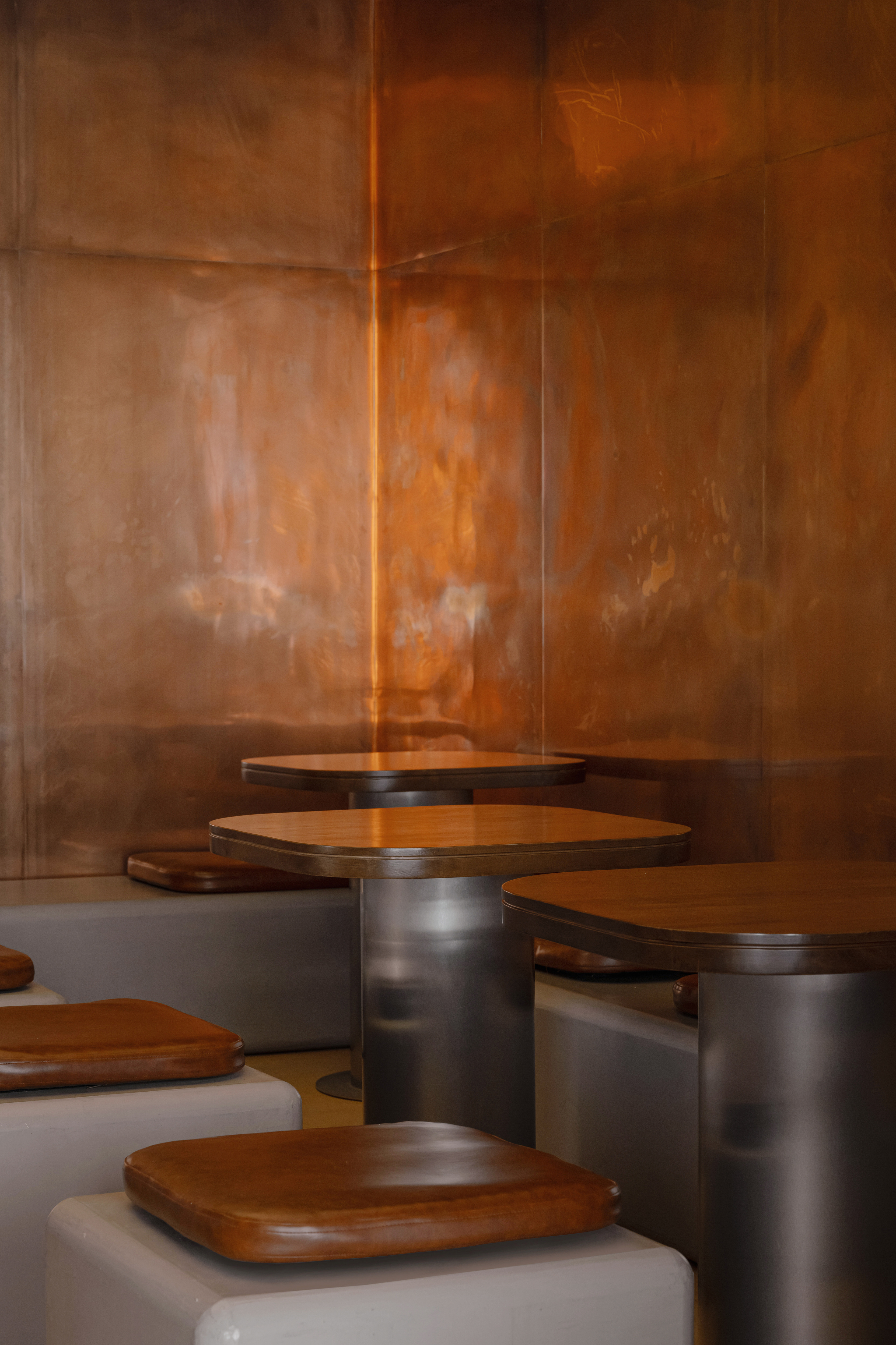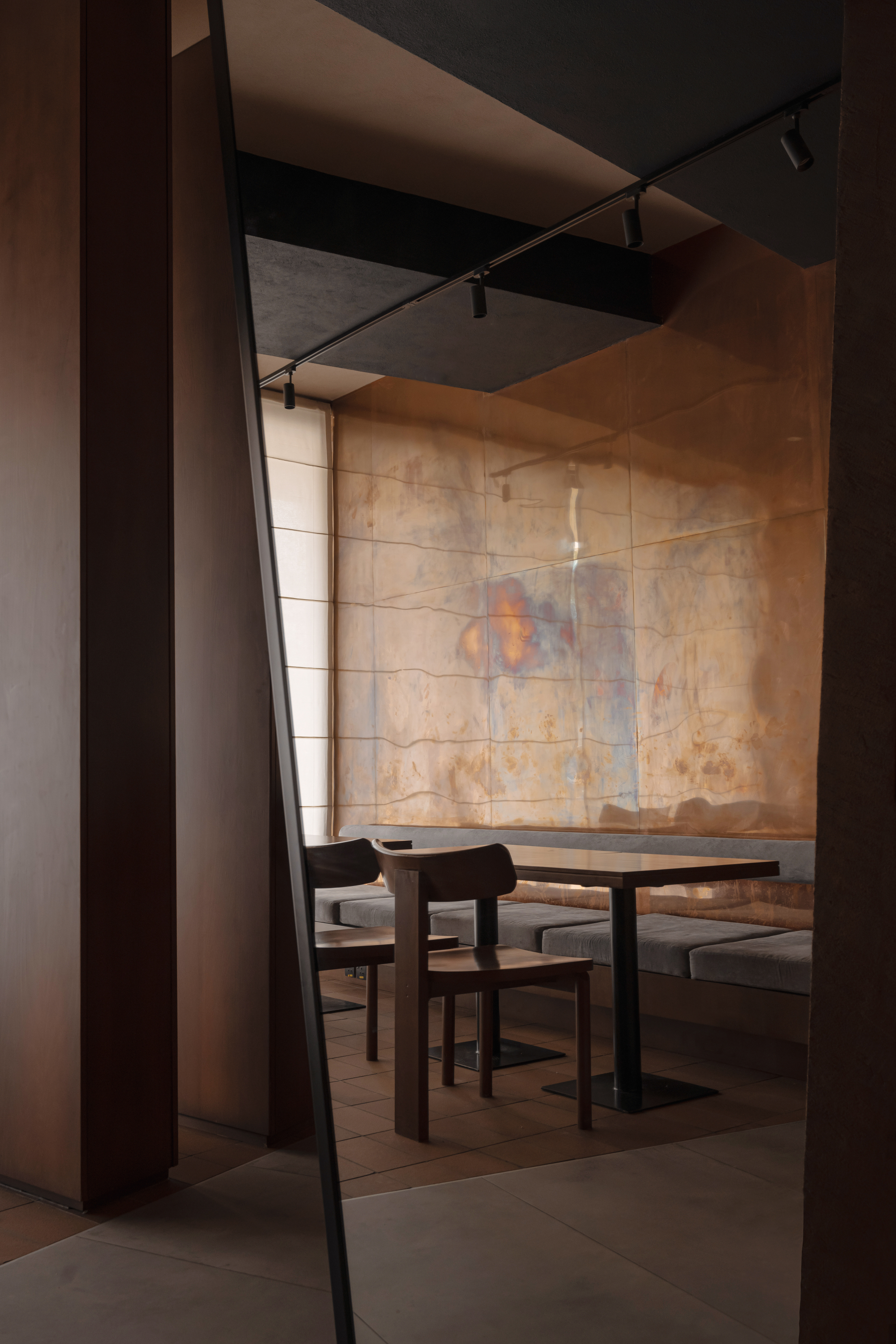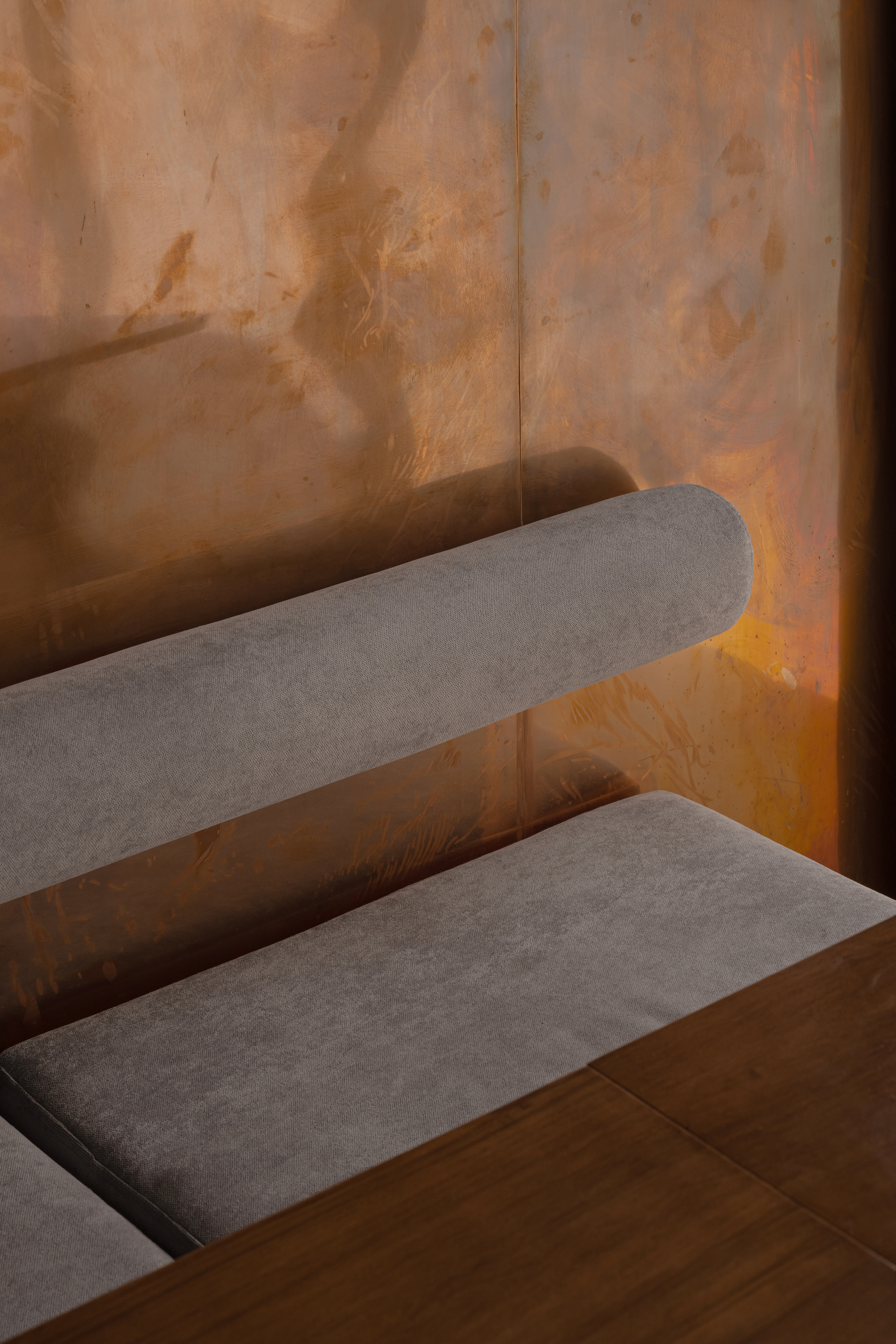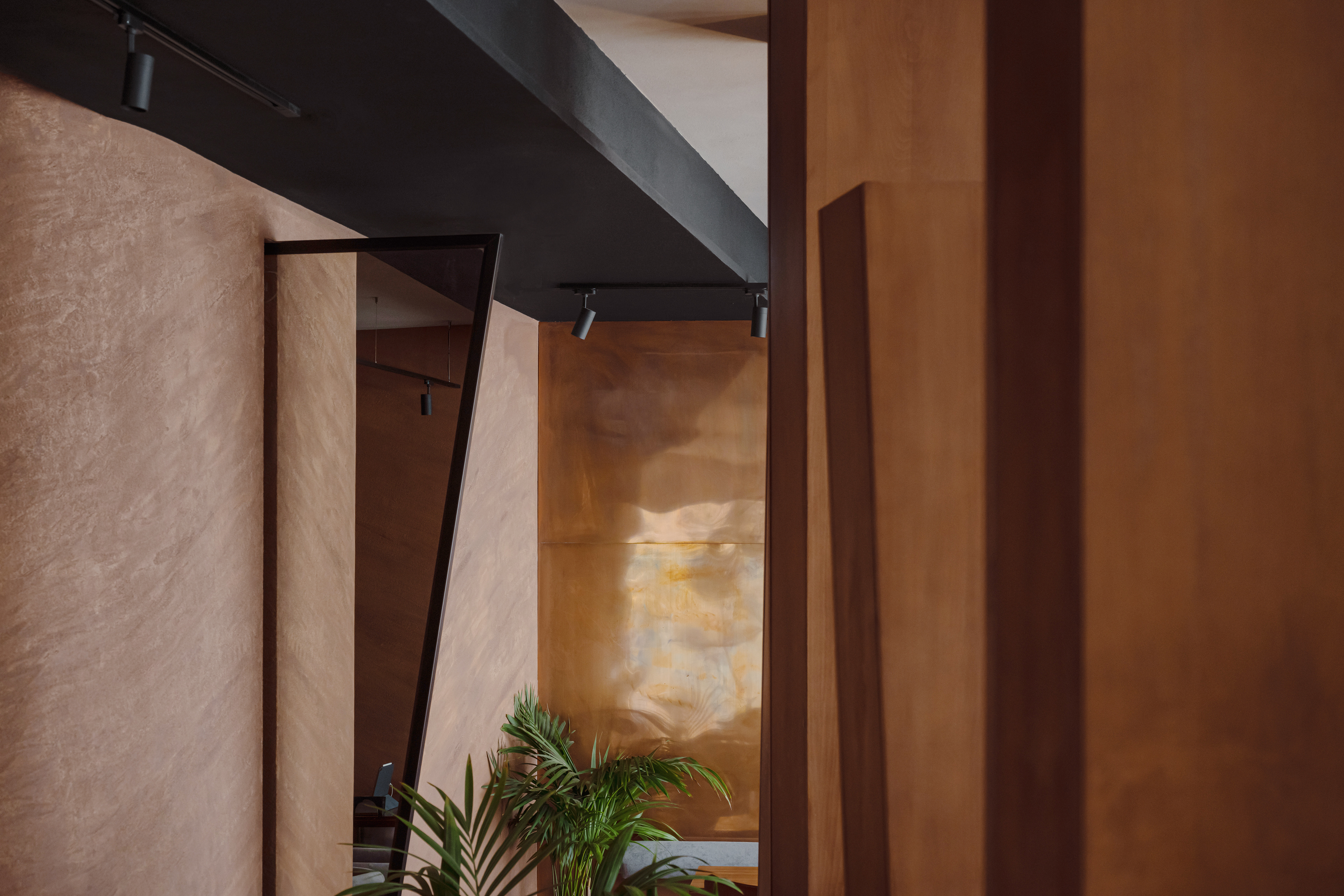 The material palette is warm and grounded: textured plaster, microcement-effect porcelain tile, and copper wall panels. These materials support the natural concept while creating a tactile richness and density.