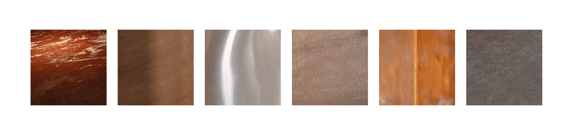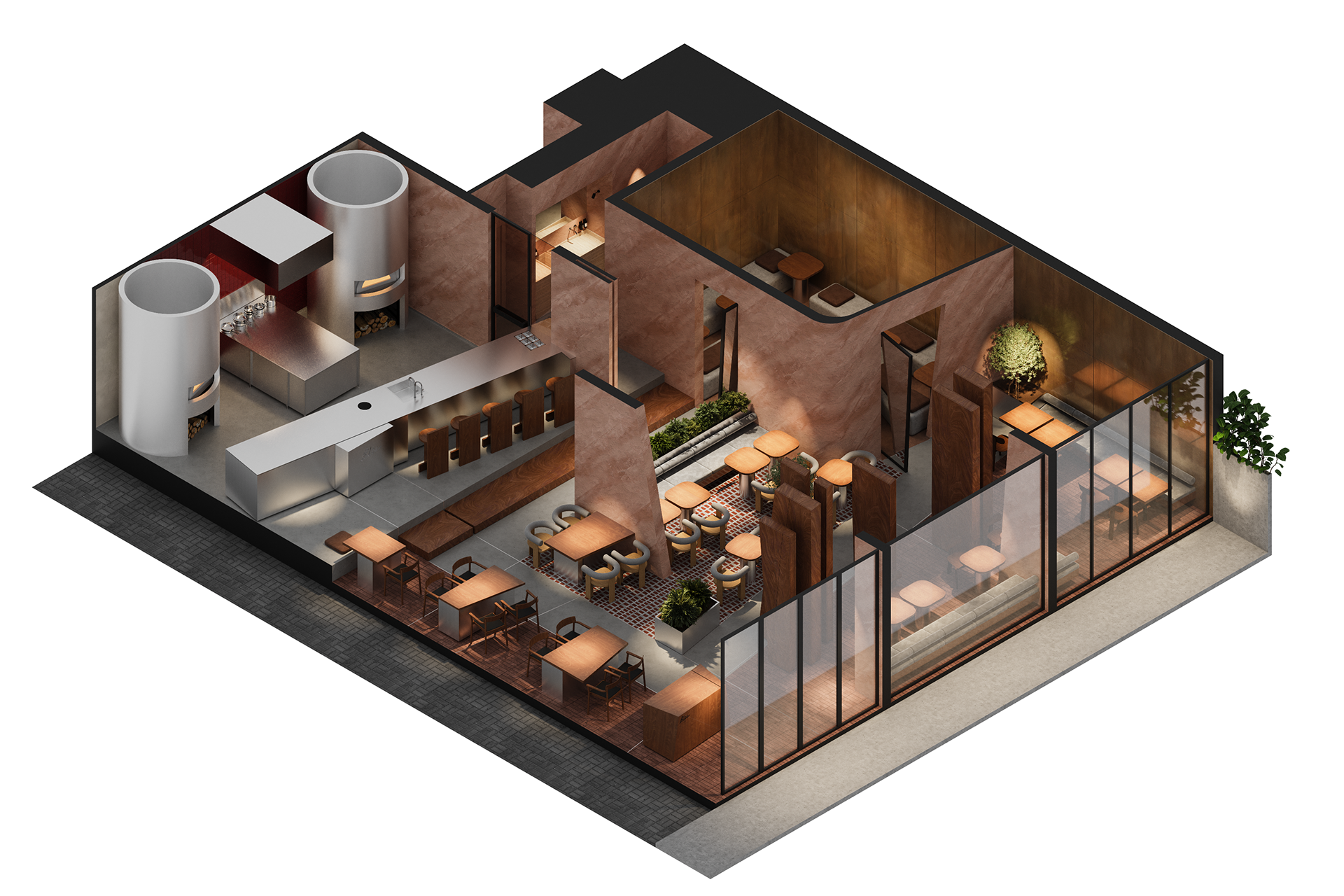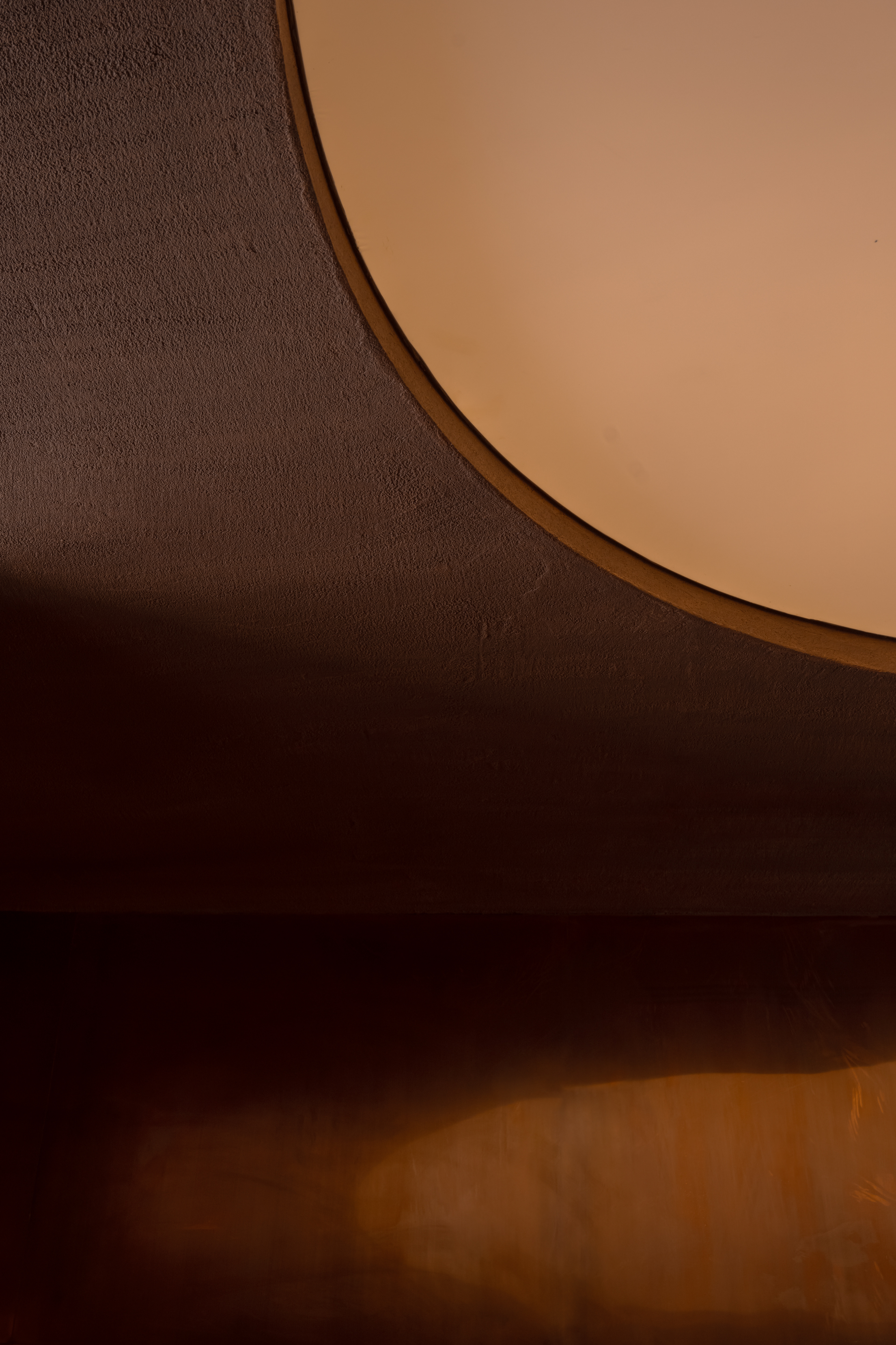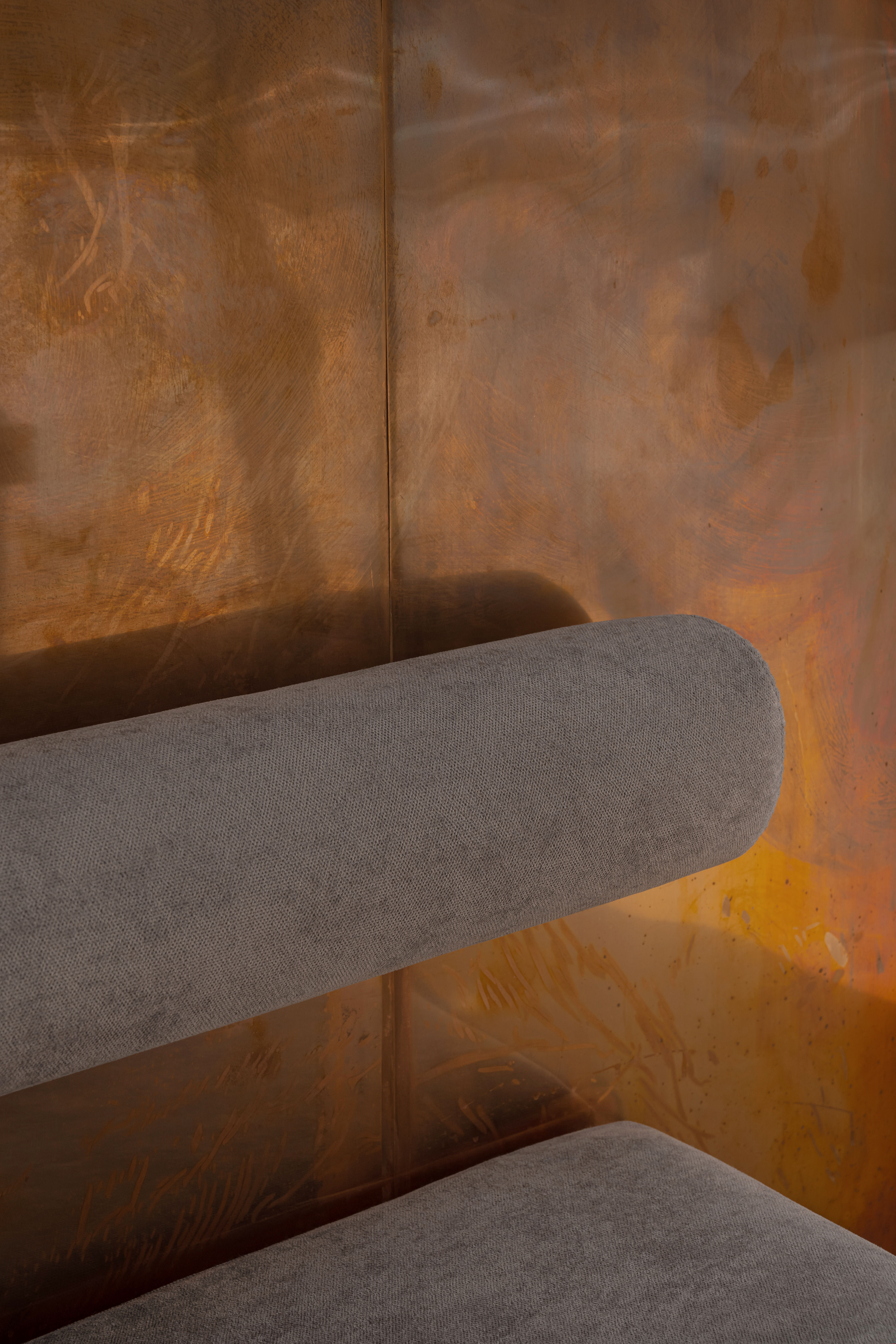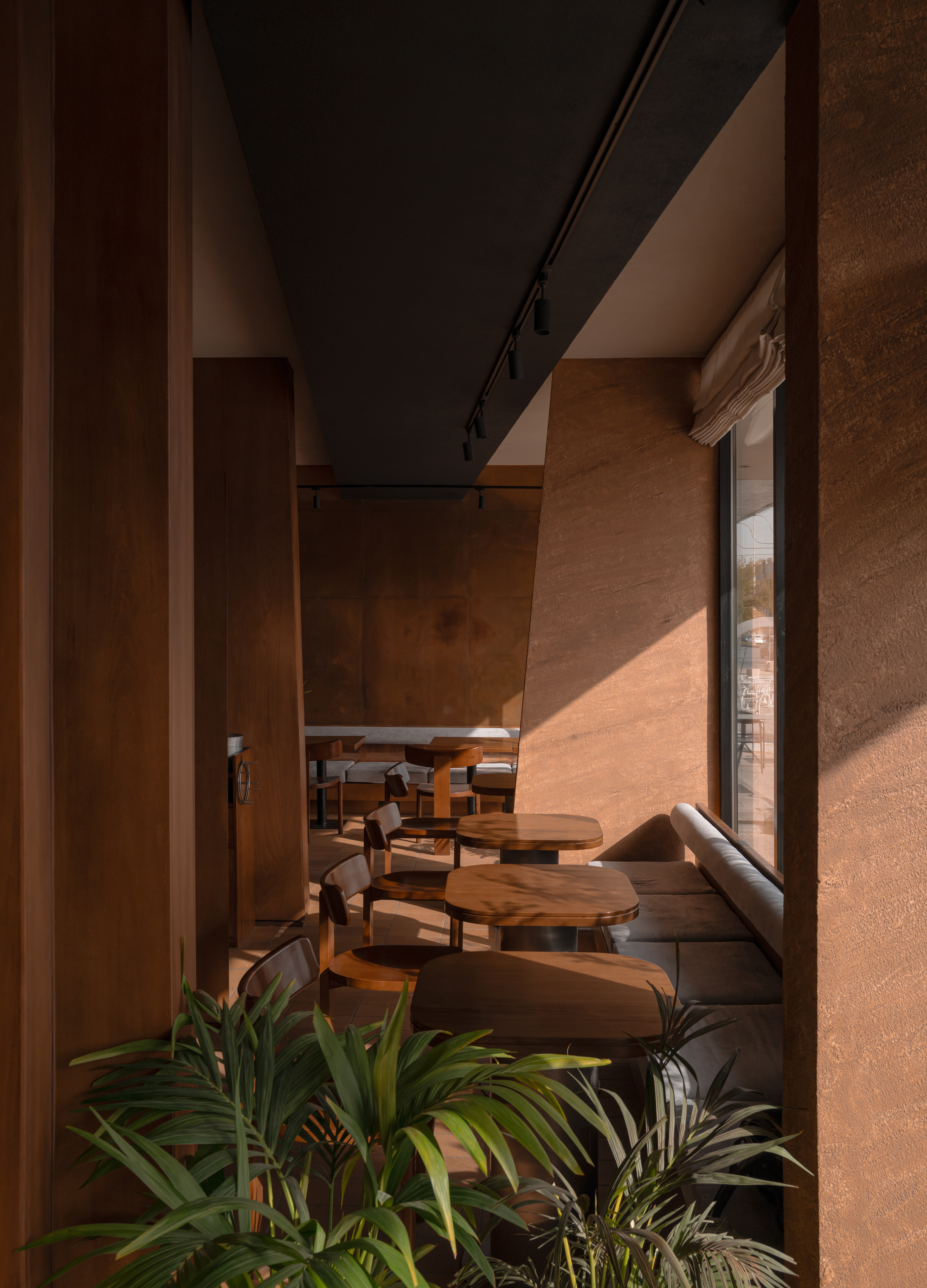 The material palette is warm and grounded: textured plaster, microcement-effect porcelain tile, and copper wall panels. These materials support the natural concept while creating a tactile richness and density.