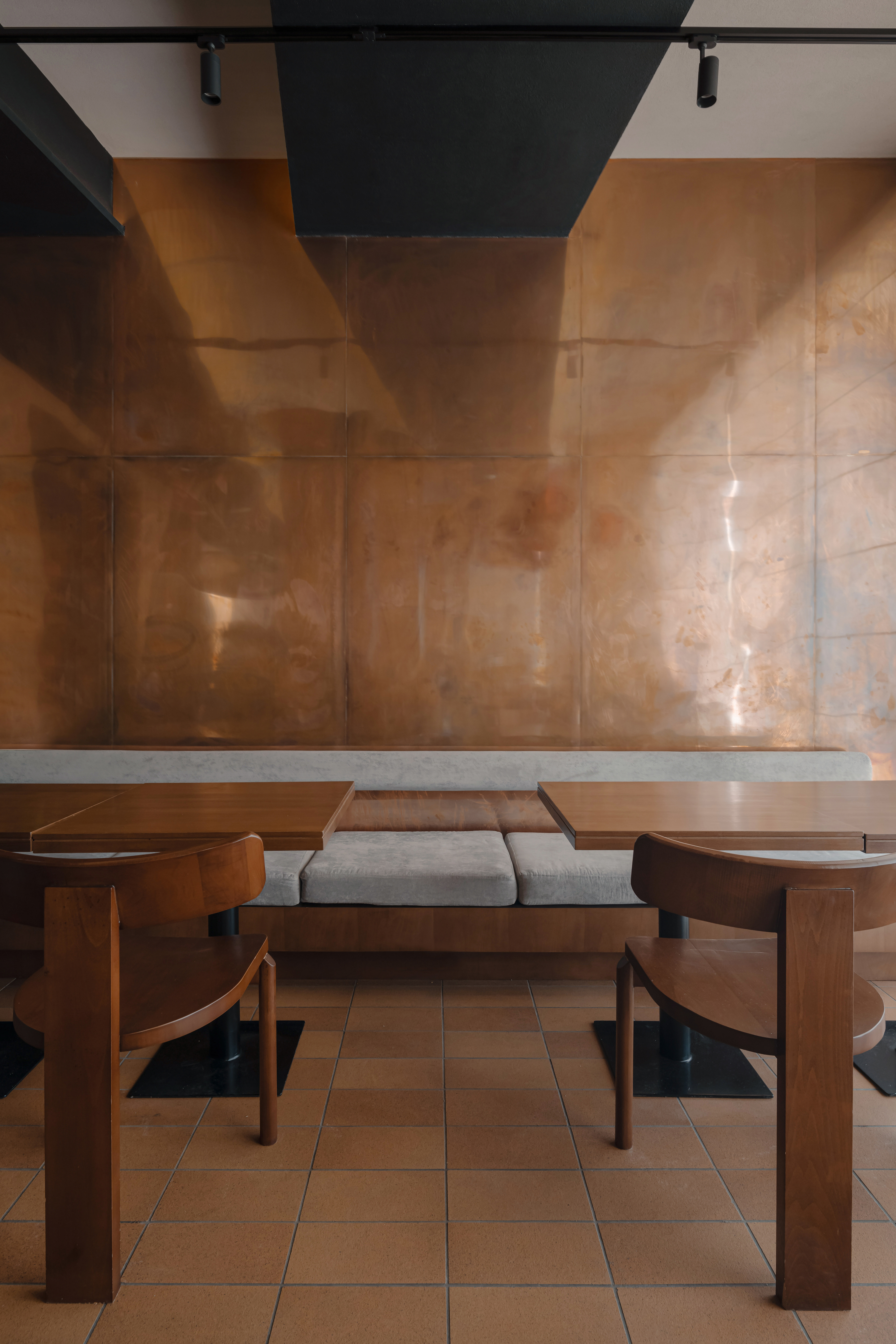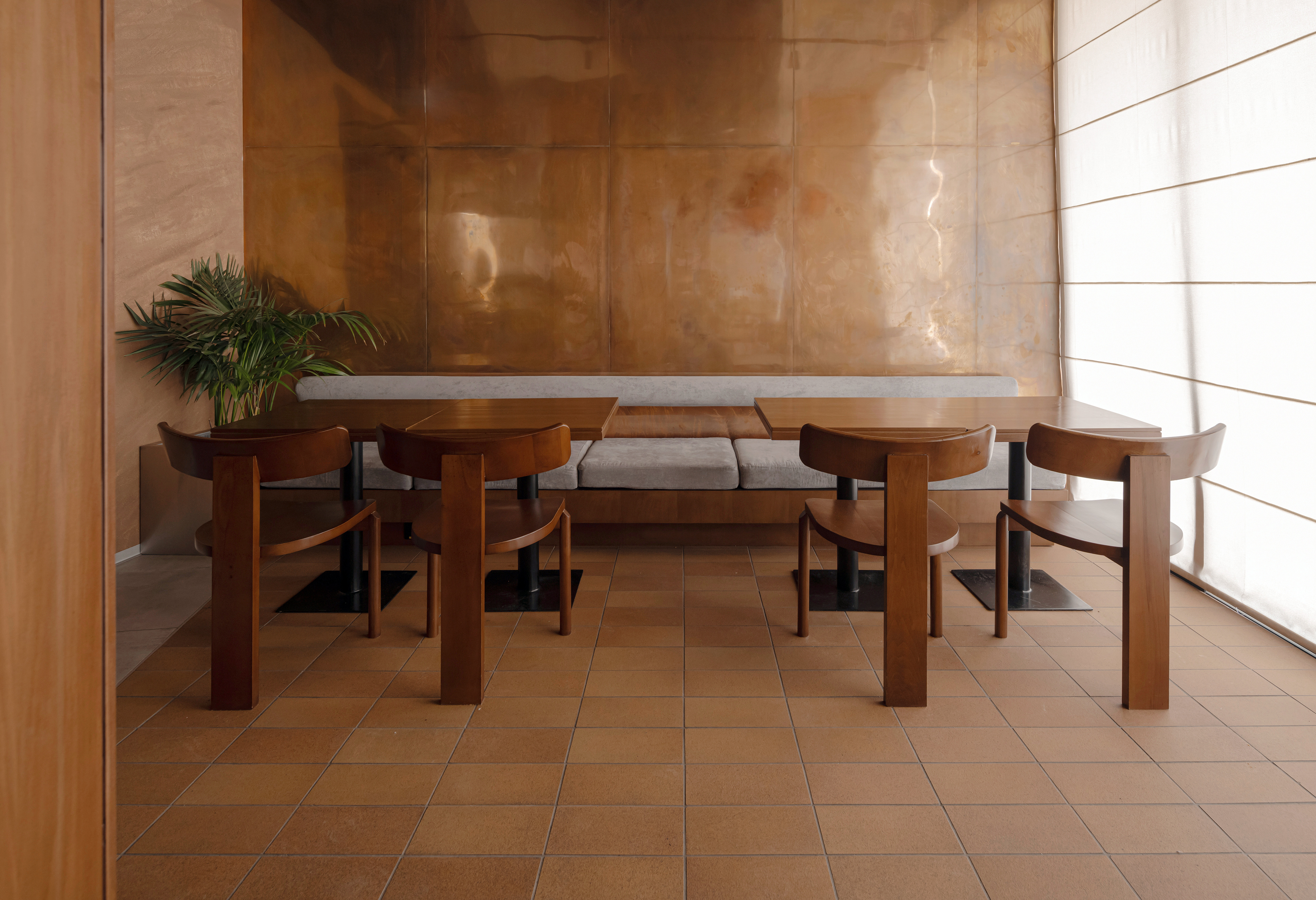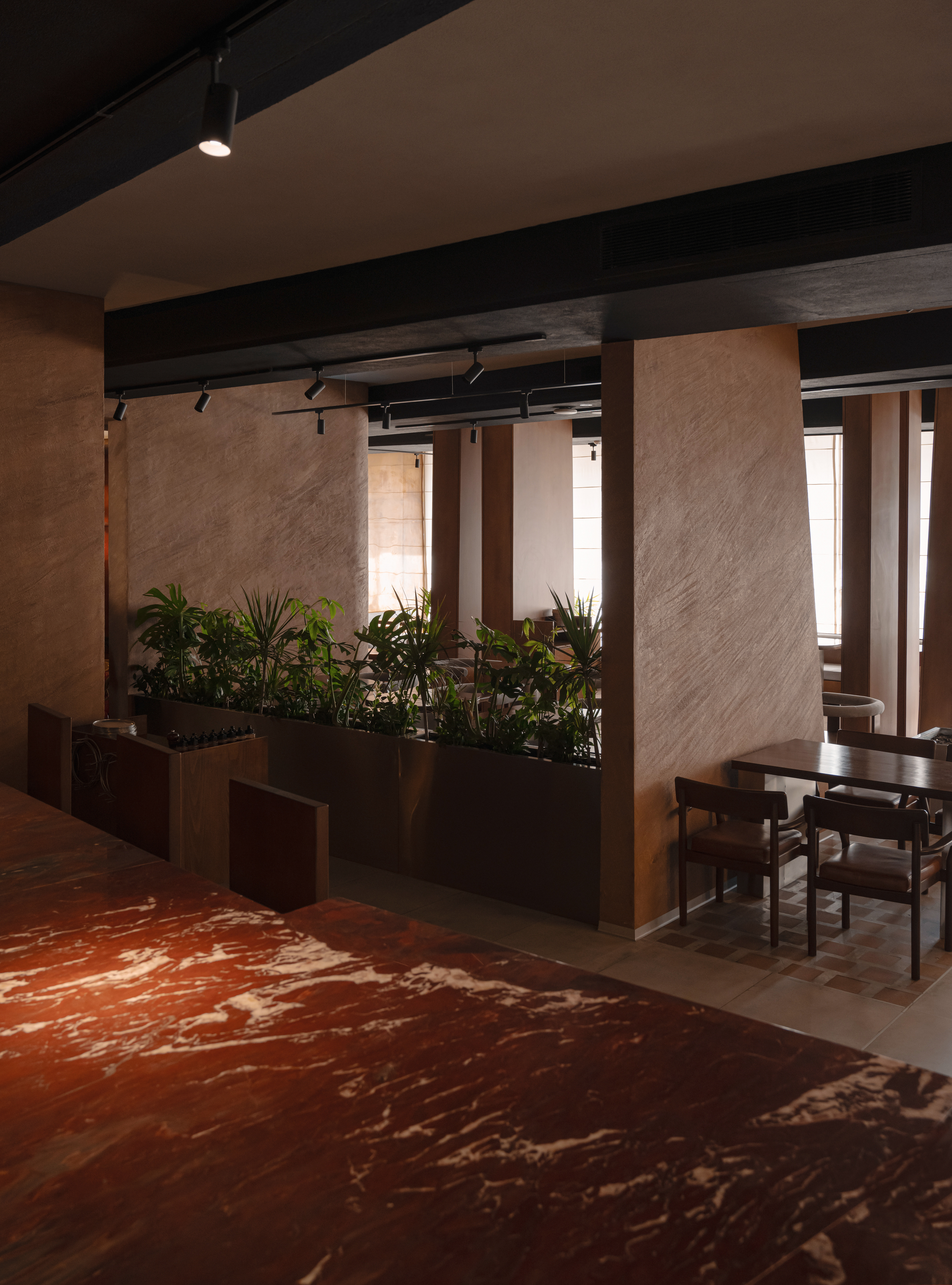 Contrast became a key design strategy: the warm, saturated tones of sandstone, copper, and wood are set against subtle, restrained green accents. What initially seemed like a challenge—the large number of columns in the space—became a point of inspiration.