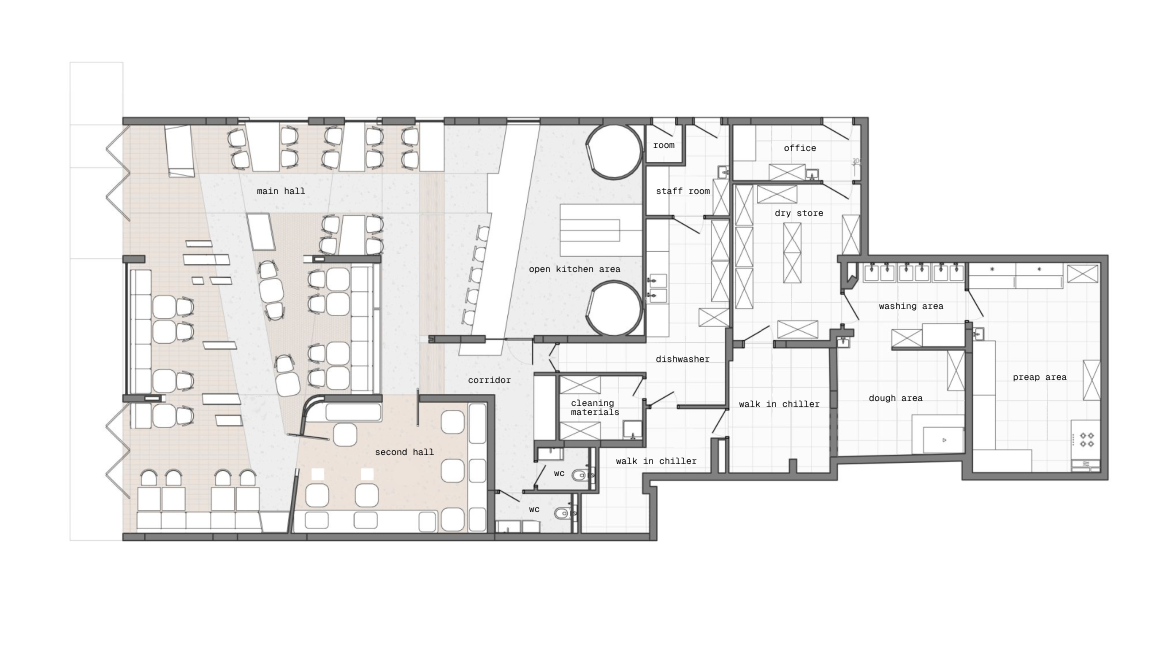 The layout is organized into several key zones. At the center is an open kitchen with two ovens, surrounded by seating that includes both standard and lounge-style arrangements.