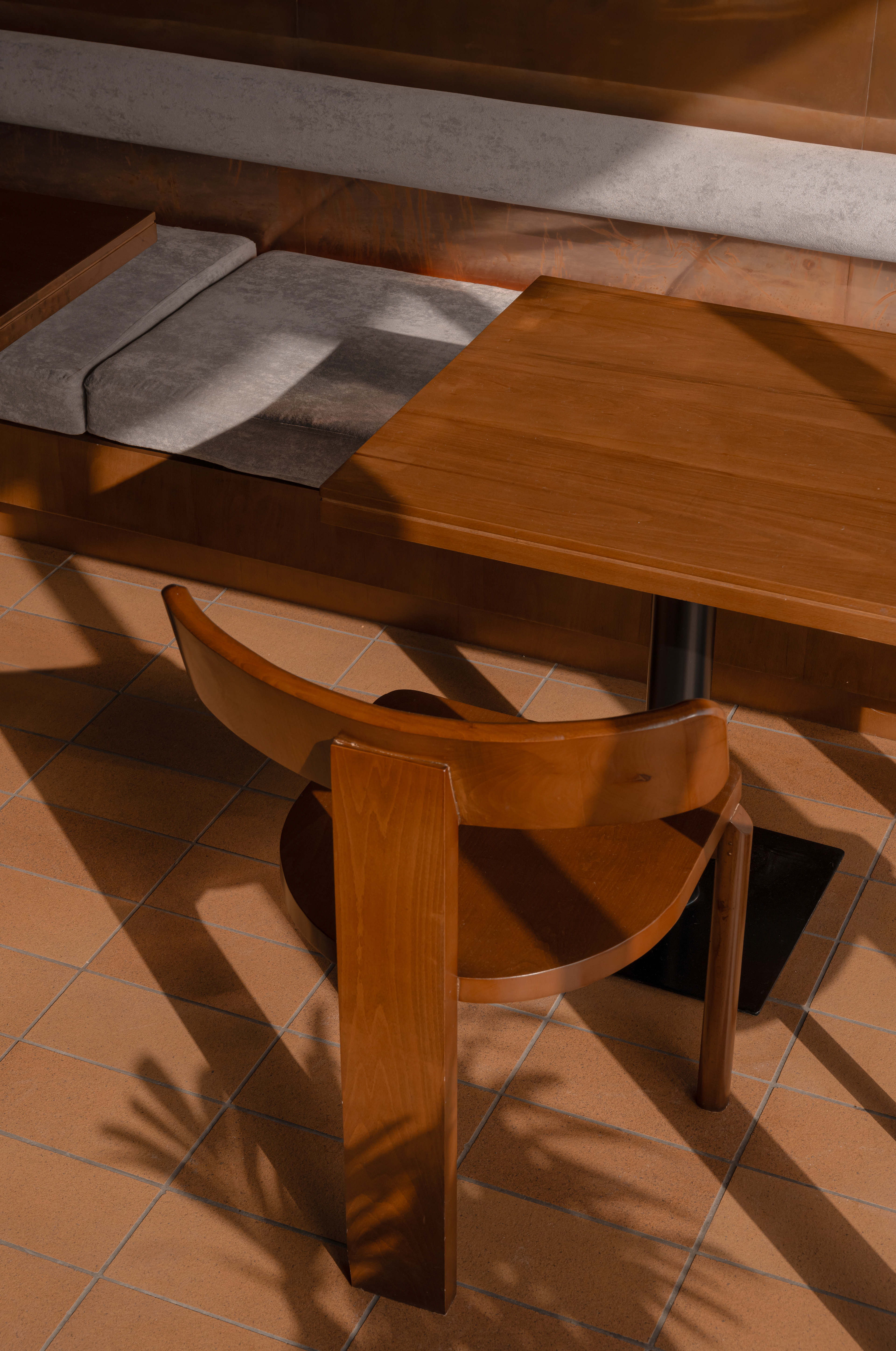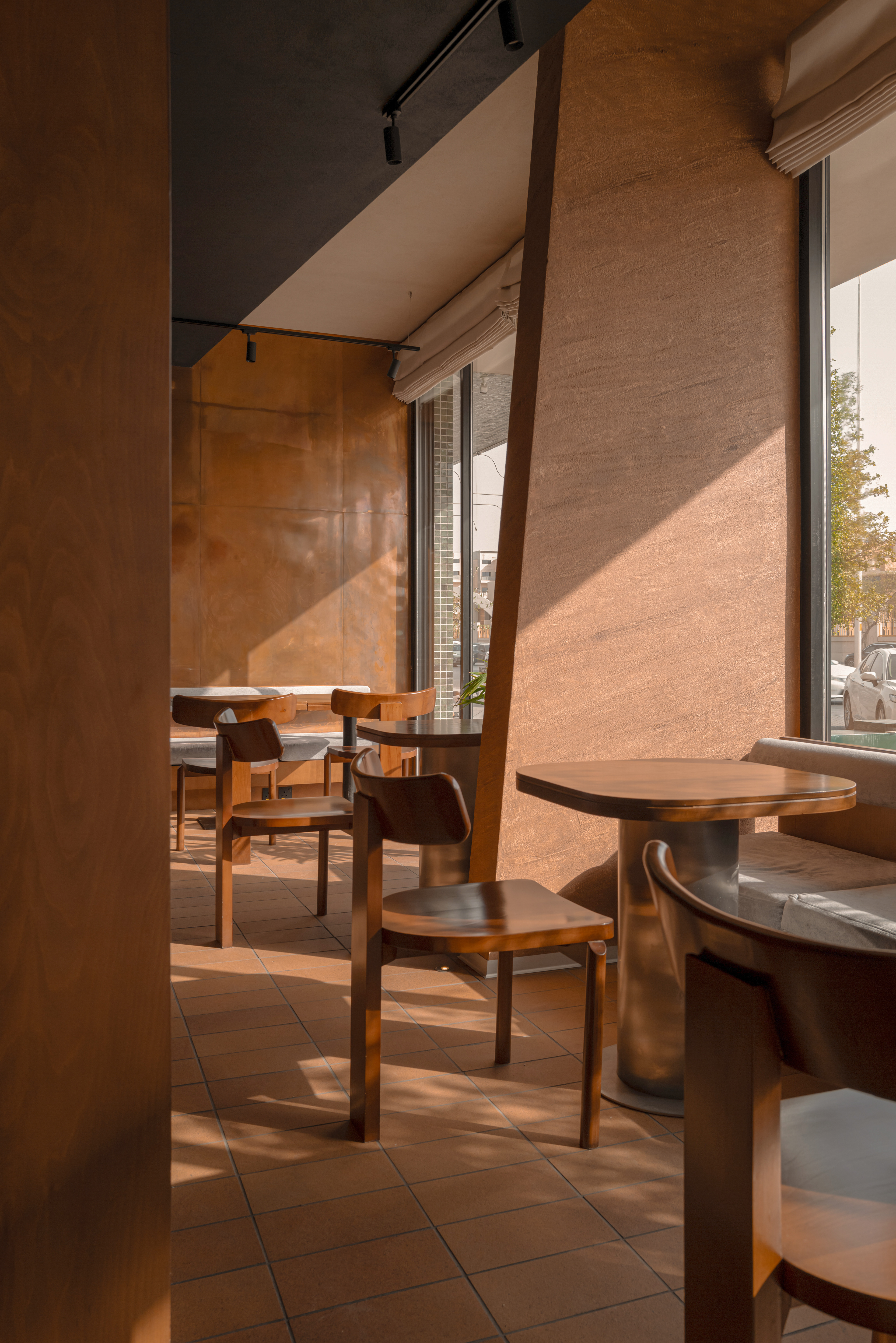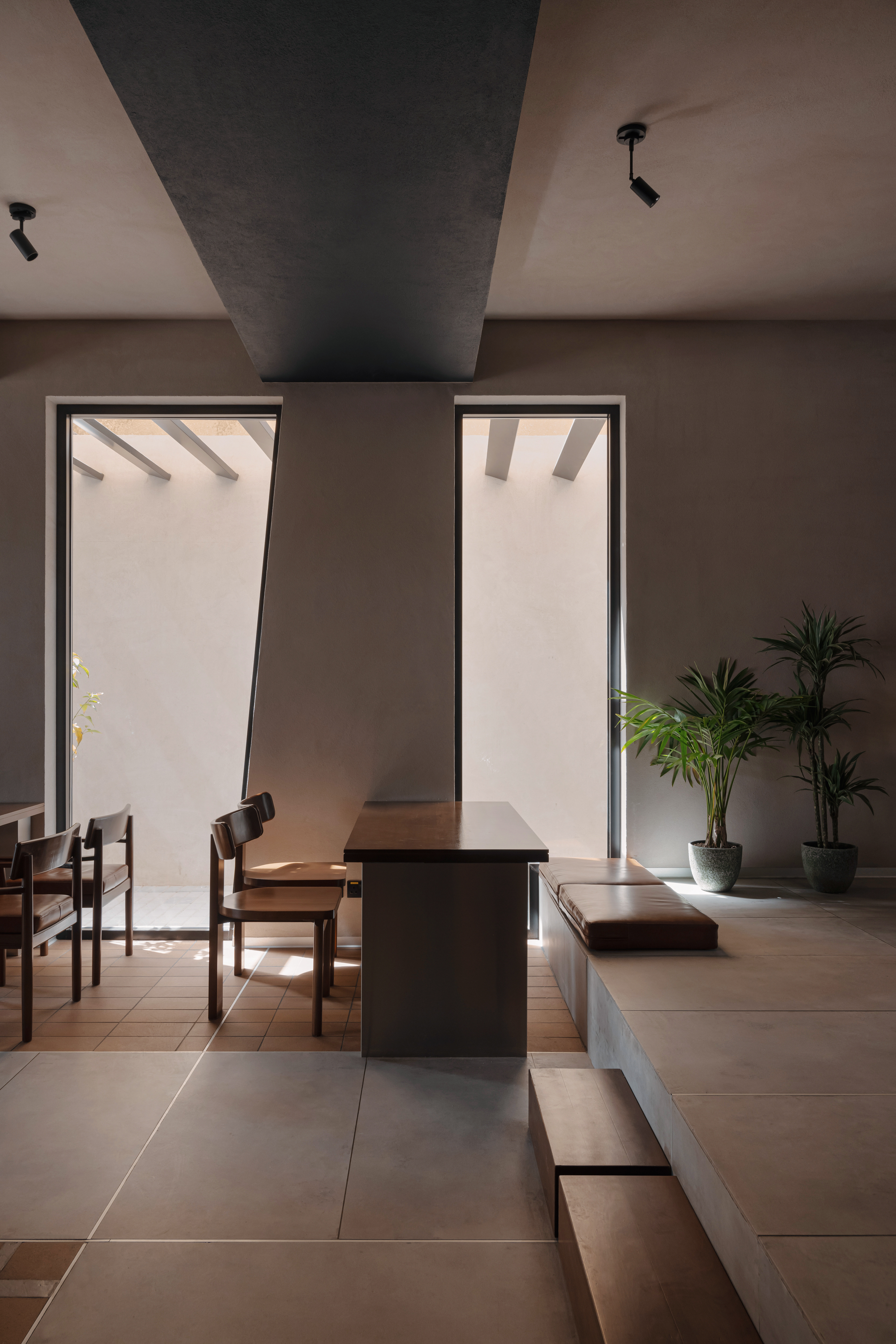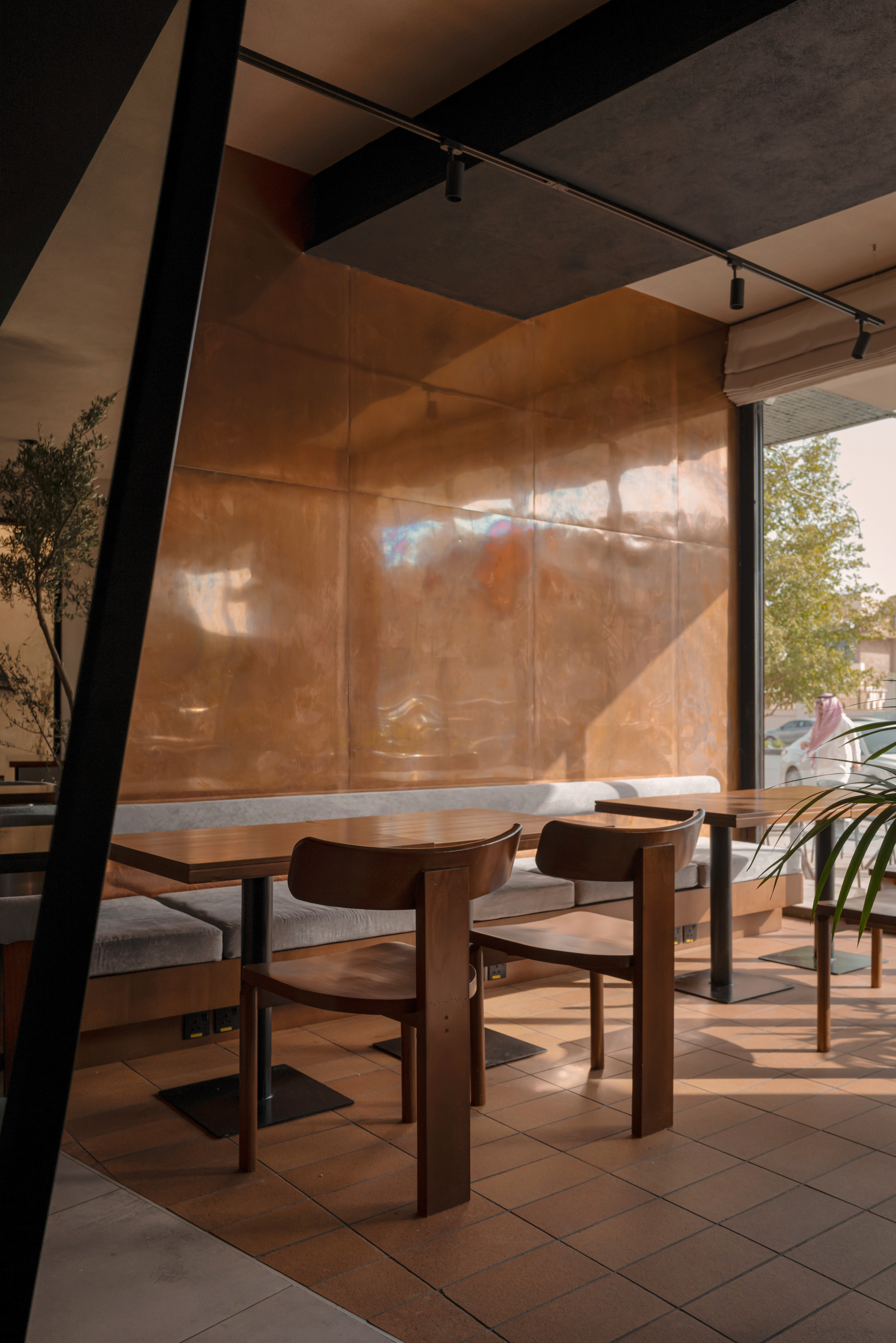 Along the facade, four-person tables echo the geometry of the trapezoidal windows.