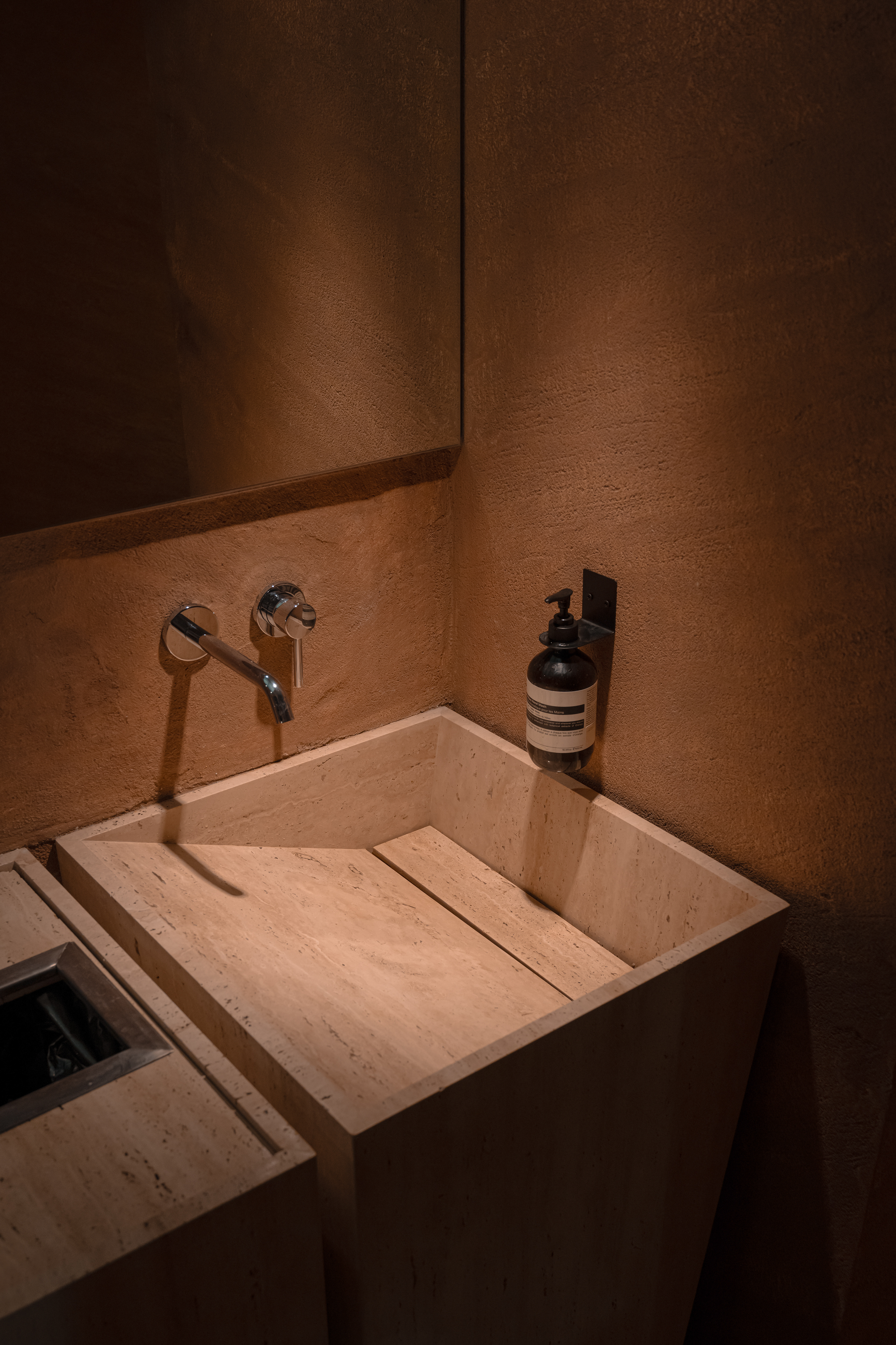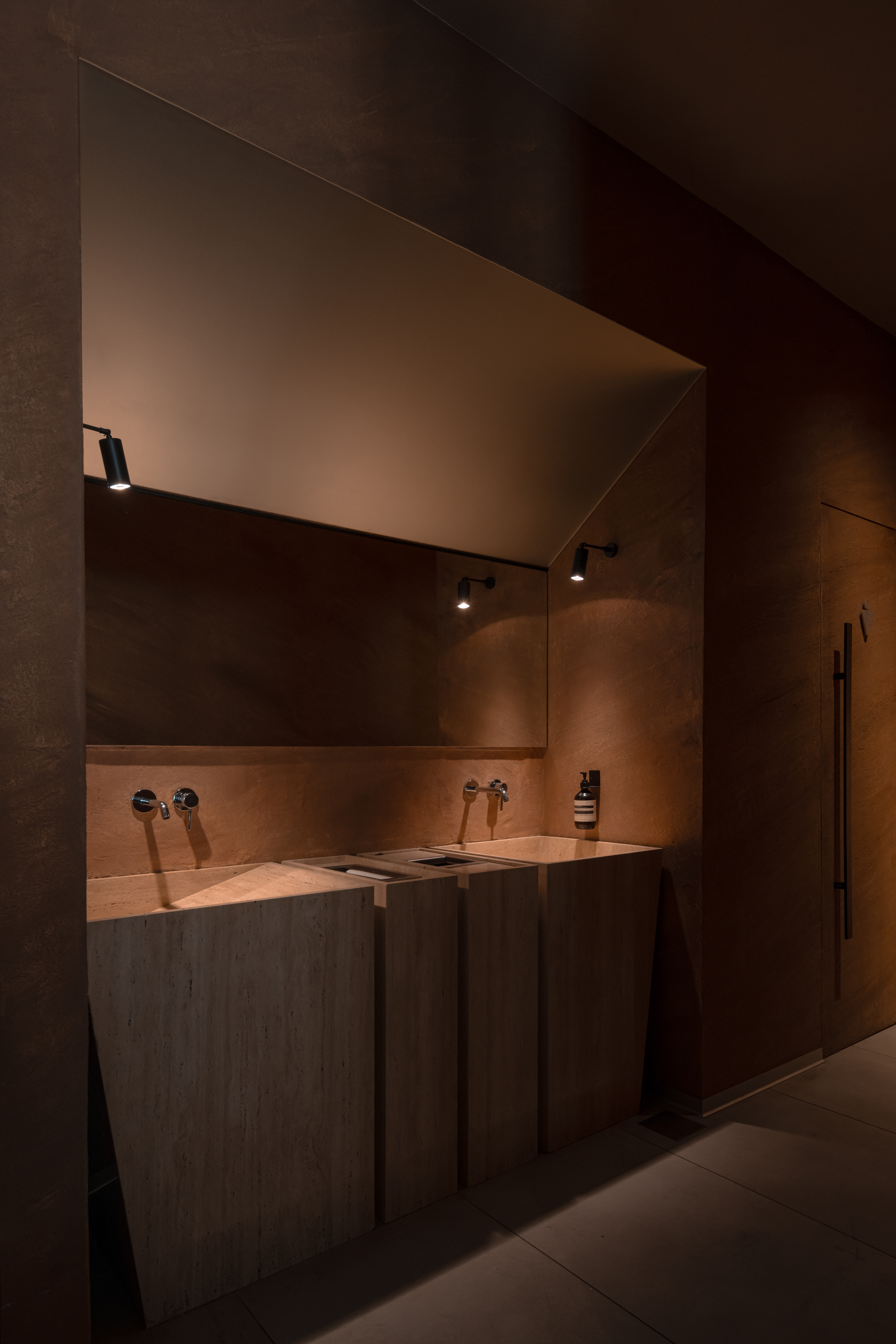 The design incorporates details rarely found in the region: slim sink traps, custom copper wall panels, and specially developed mounting methods for functional elements.