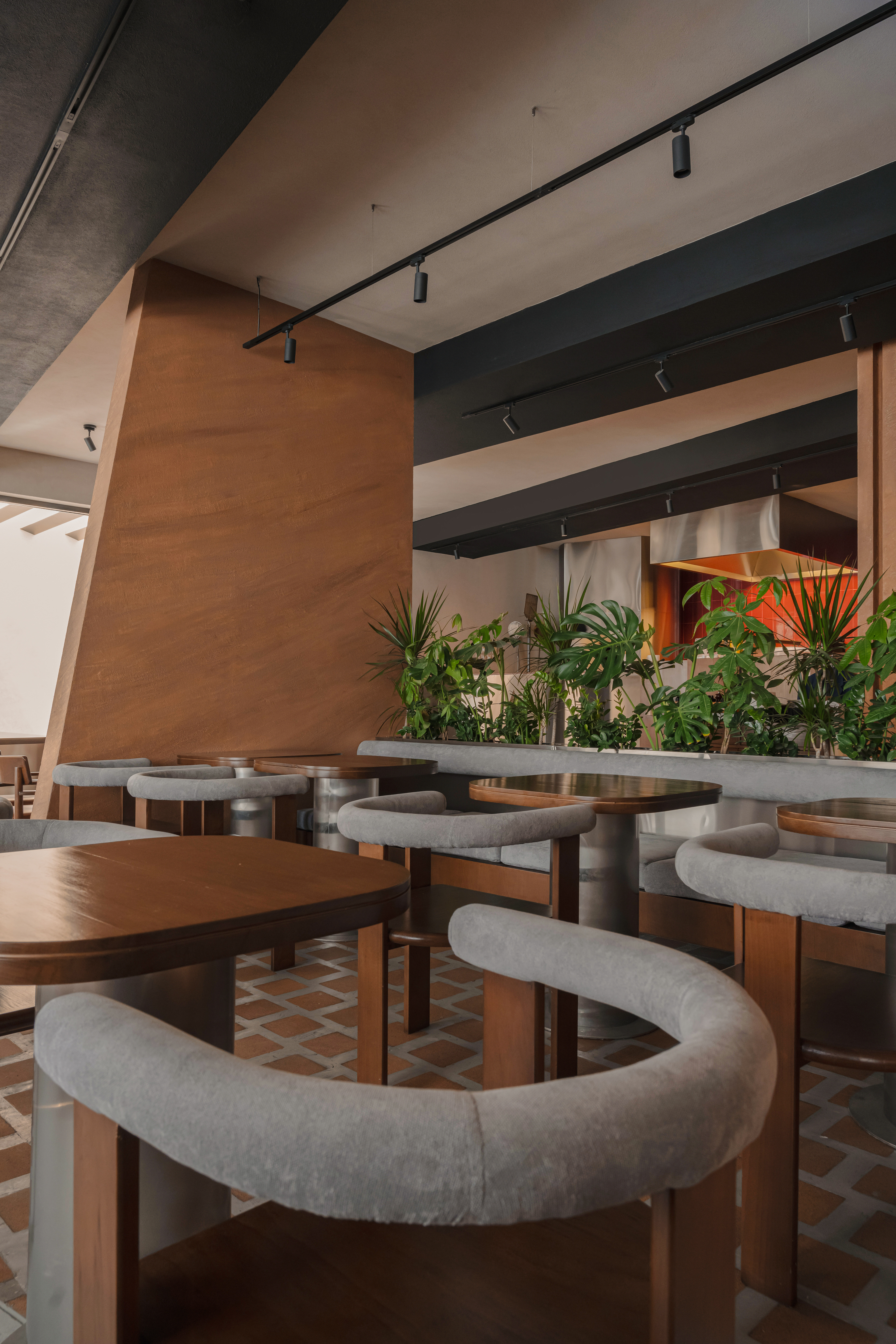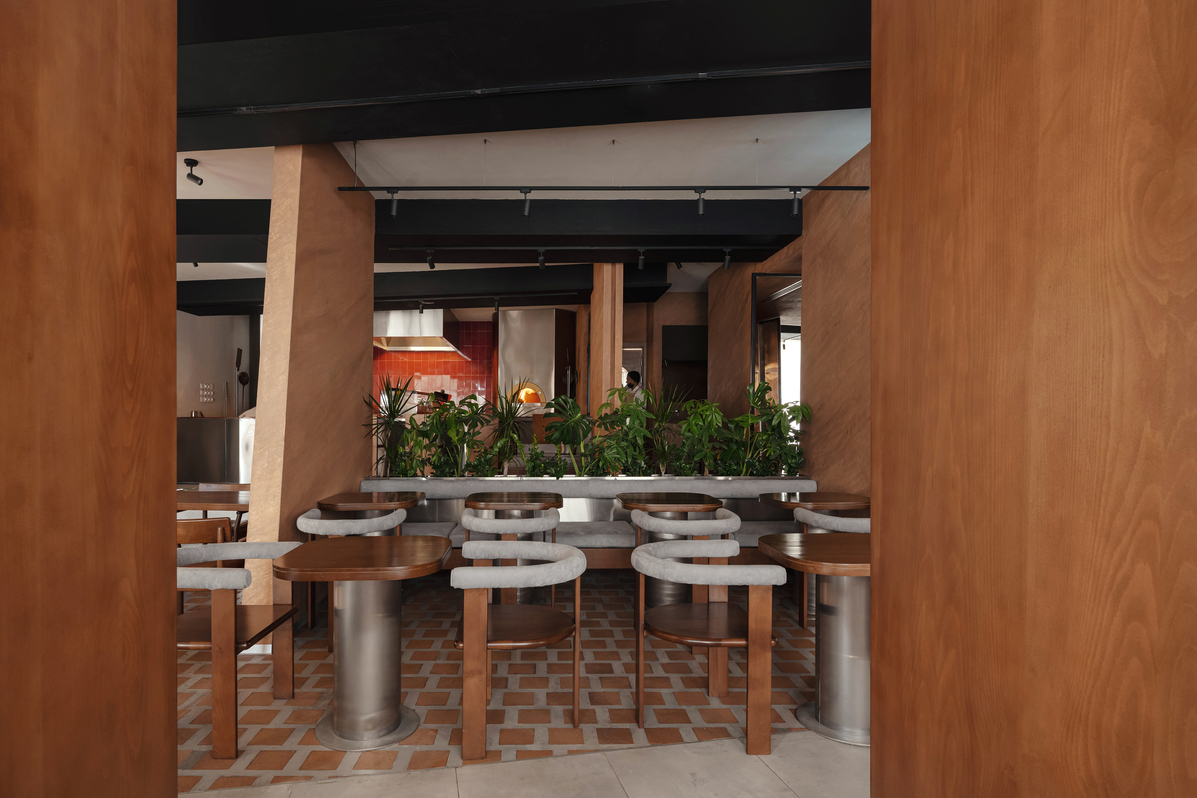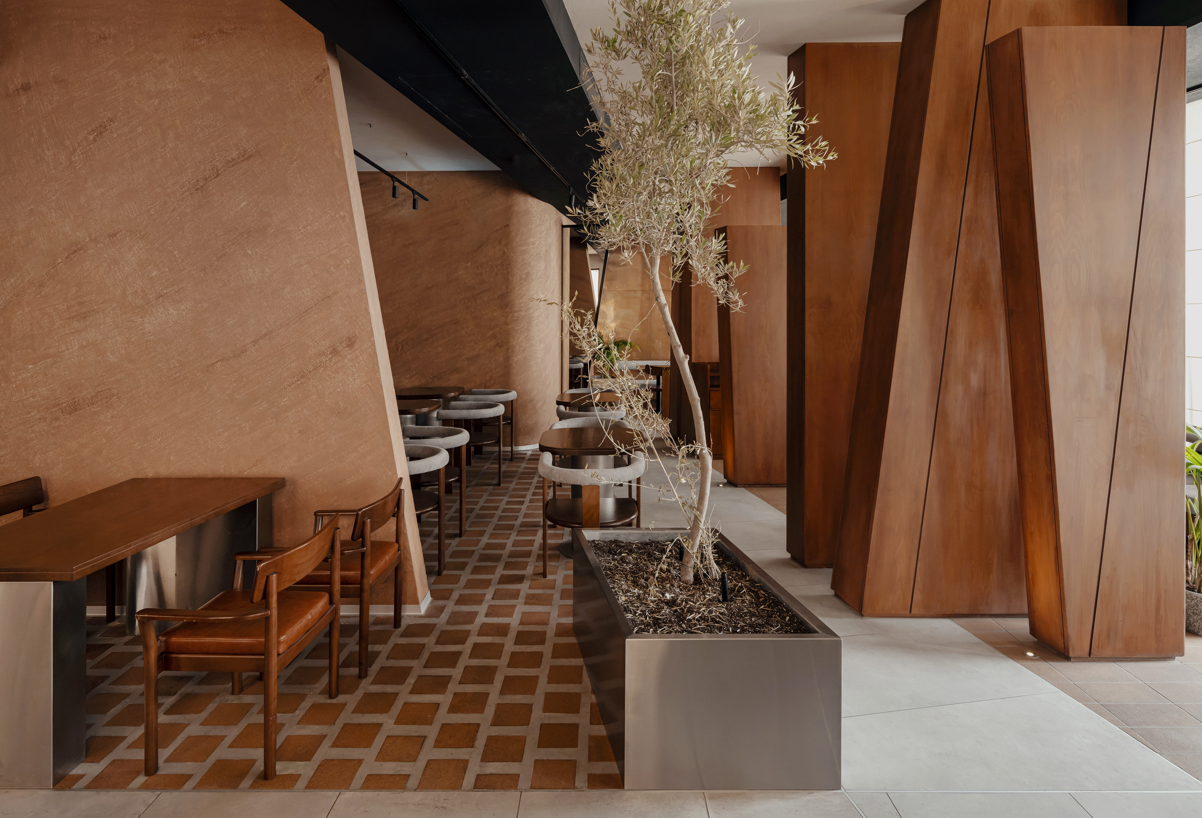 Upon entry, guests are greeted by a host stand, flanked by timber-clad structural elements that reinforce the visual rhythm of the space.