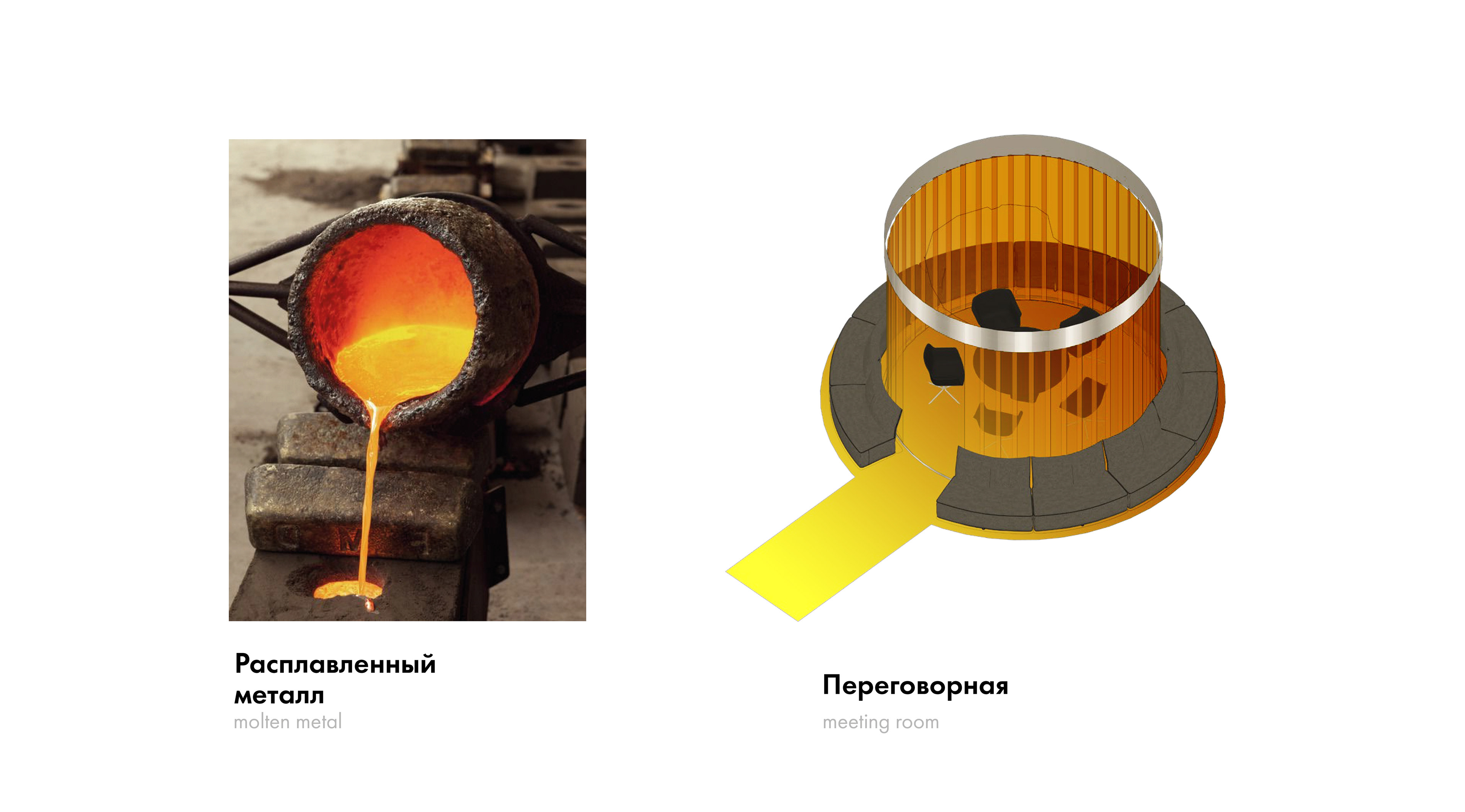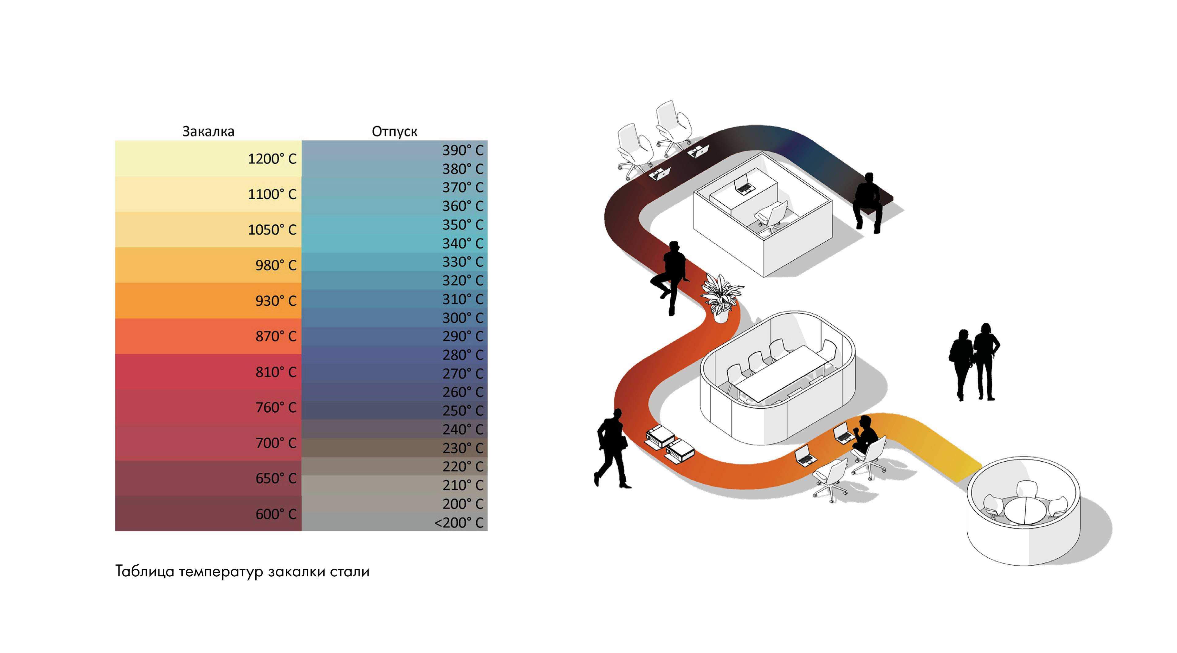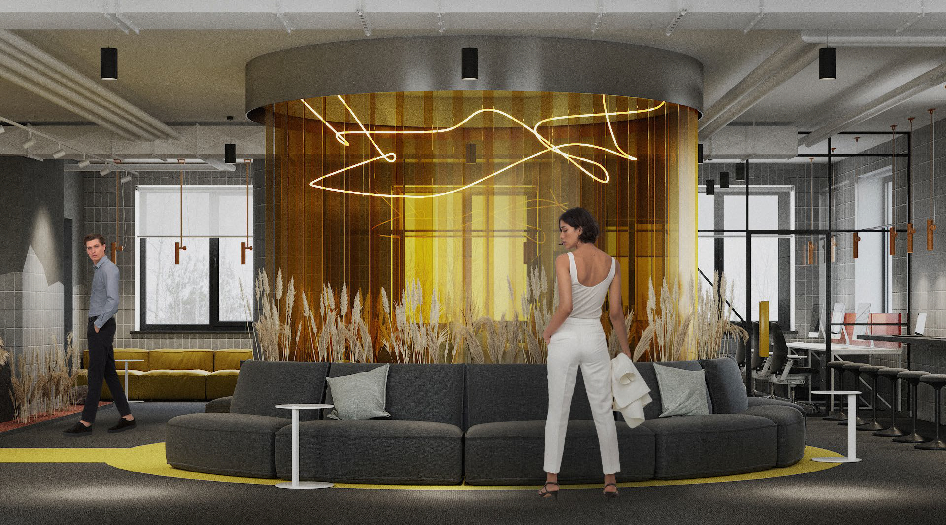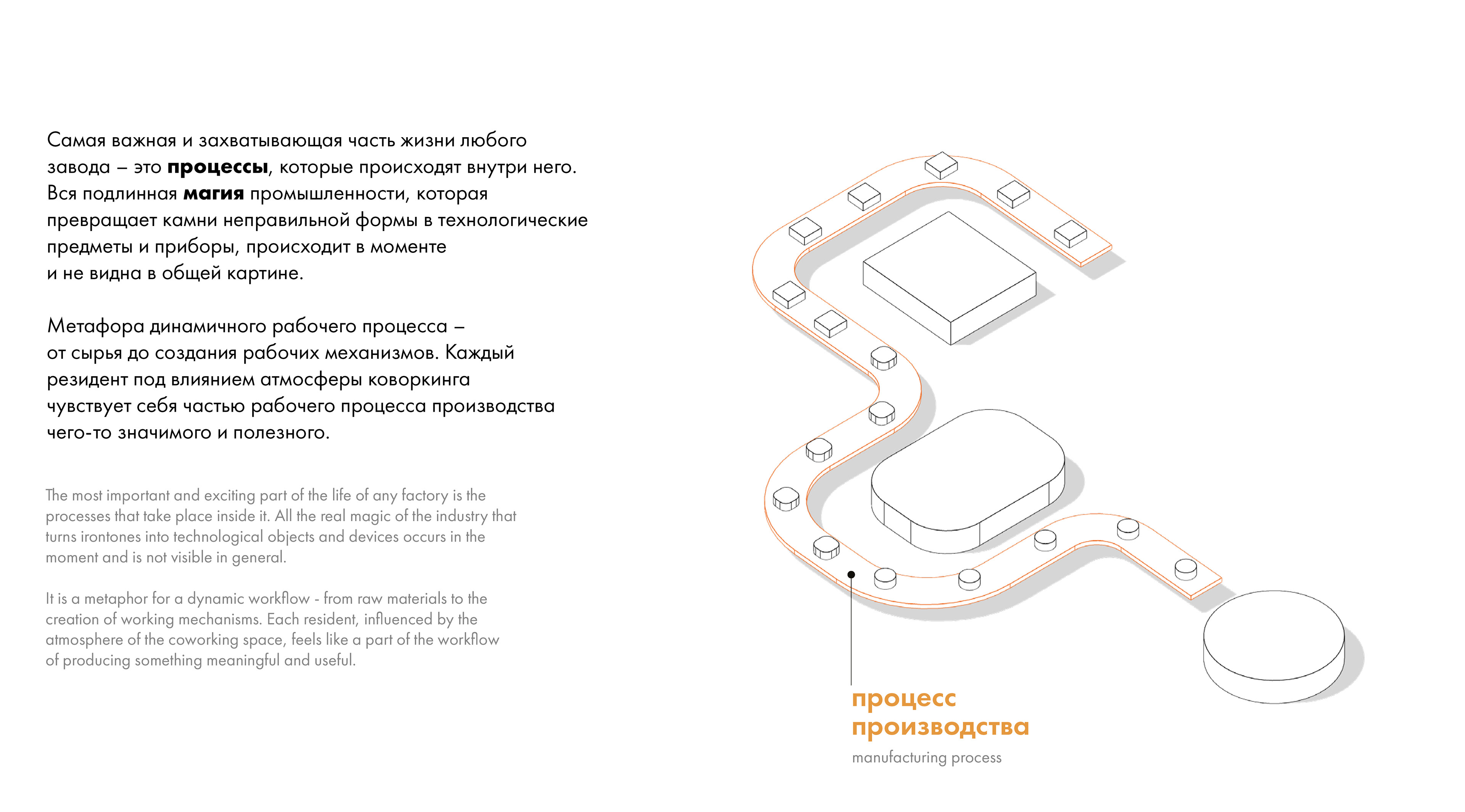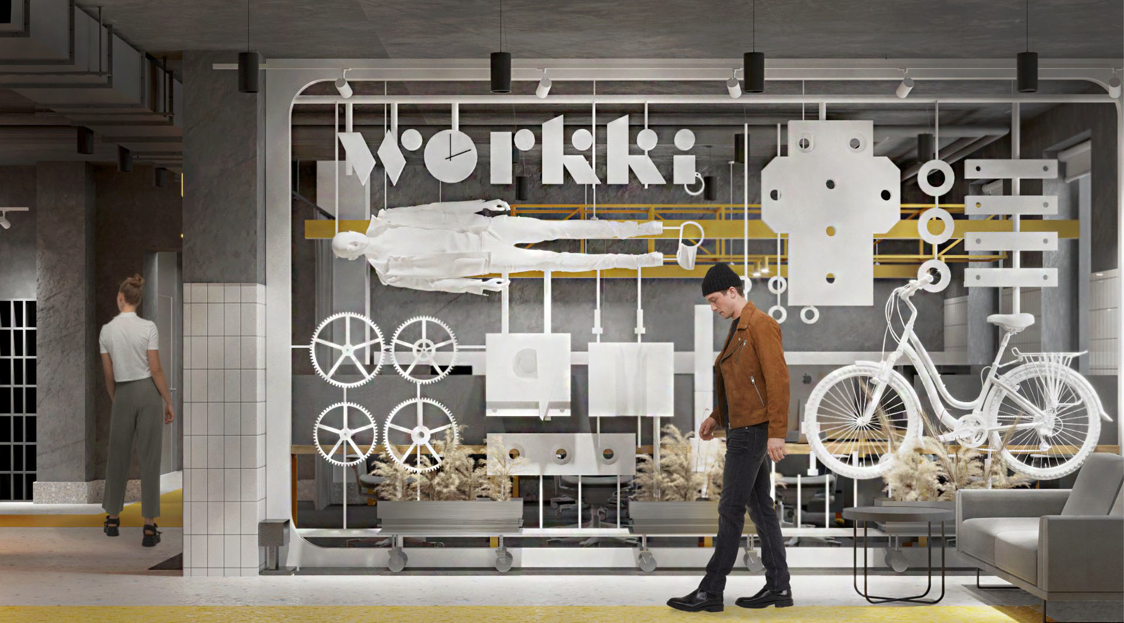 WORKKI's new coworking space is located in a former building of a design institute that developed metal industry enterprises. It was the optimal production process, the magical path from raw material to the finished part of a train or plane, that was the main focus of the Institute. We depicted this process in the interior of the new office space - exploring different zones of the coworking space, through the elements of furniture and decoration, you literally observe how the metal remelted from raw materials gradually cools down and takes shape. Each resident of a coworking space, immersed in his personal workflow, can feel like a part of a large and significant production process, frozen in an endless flow