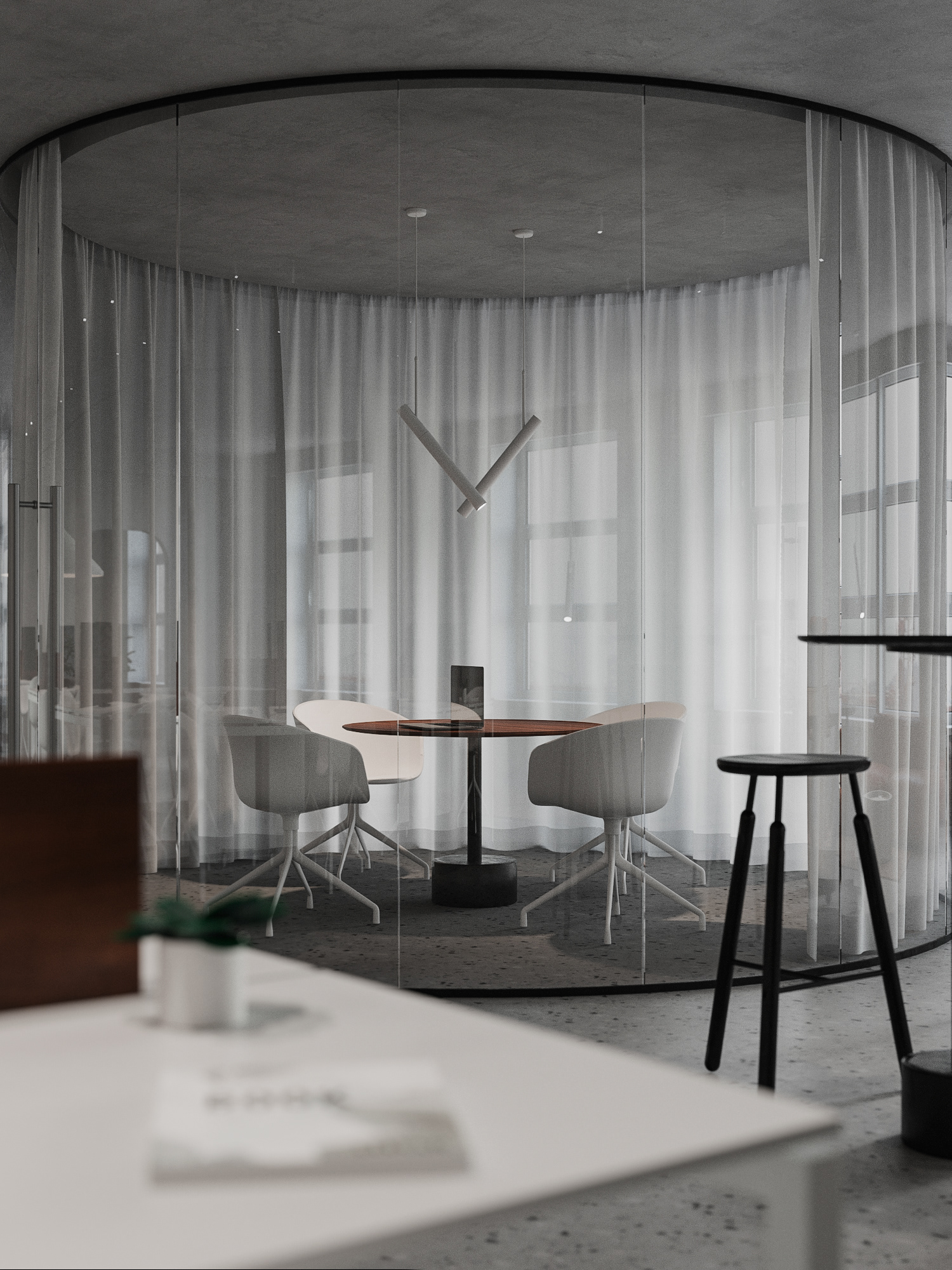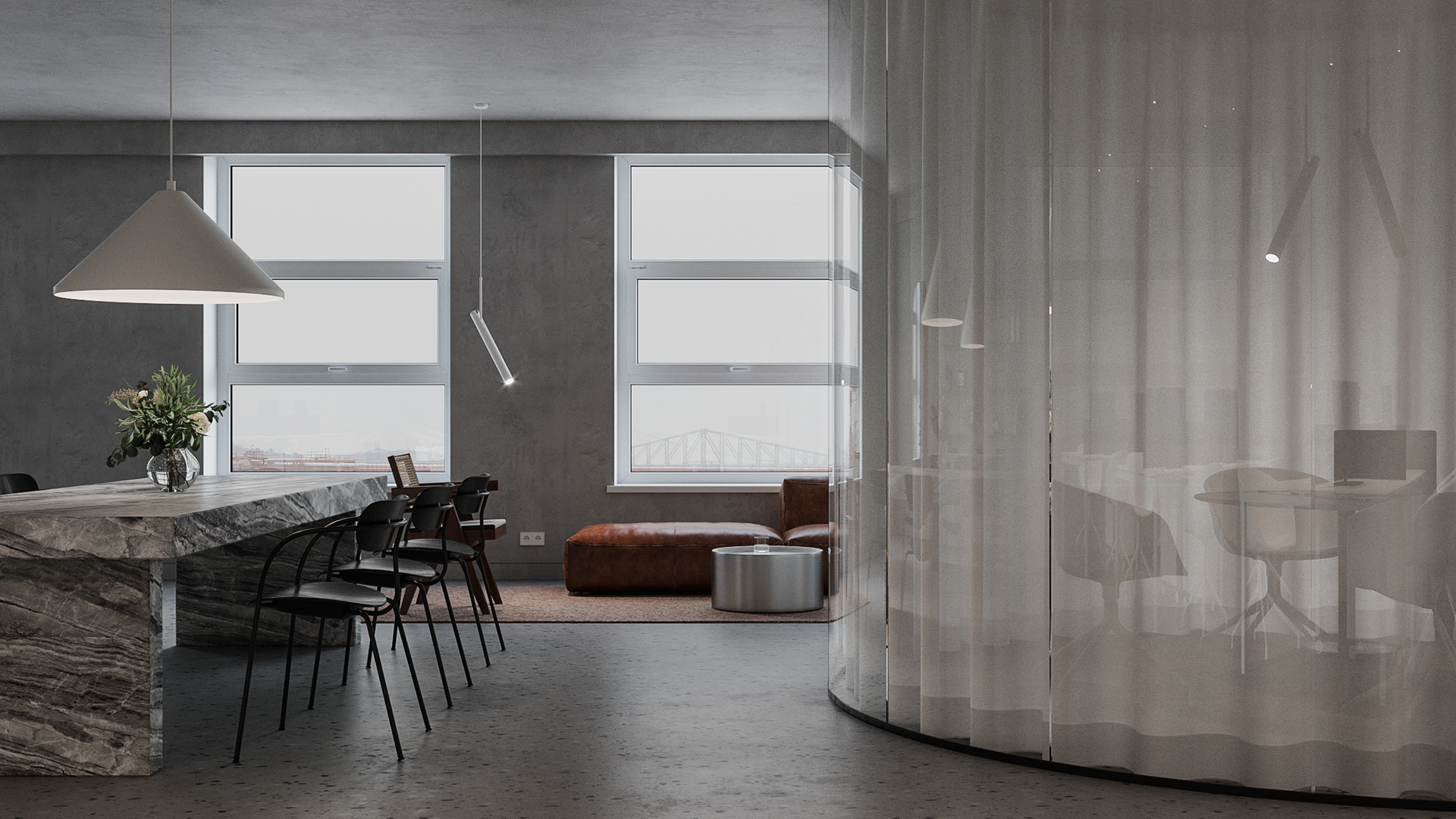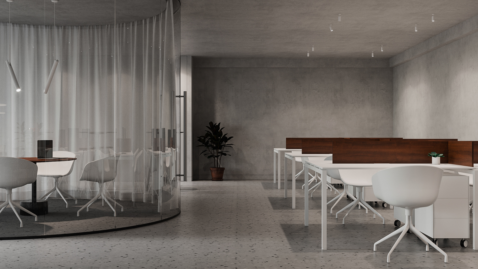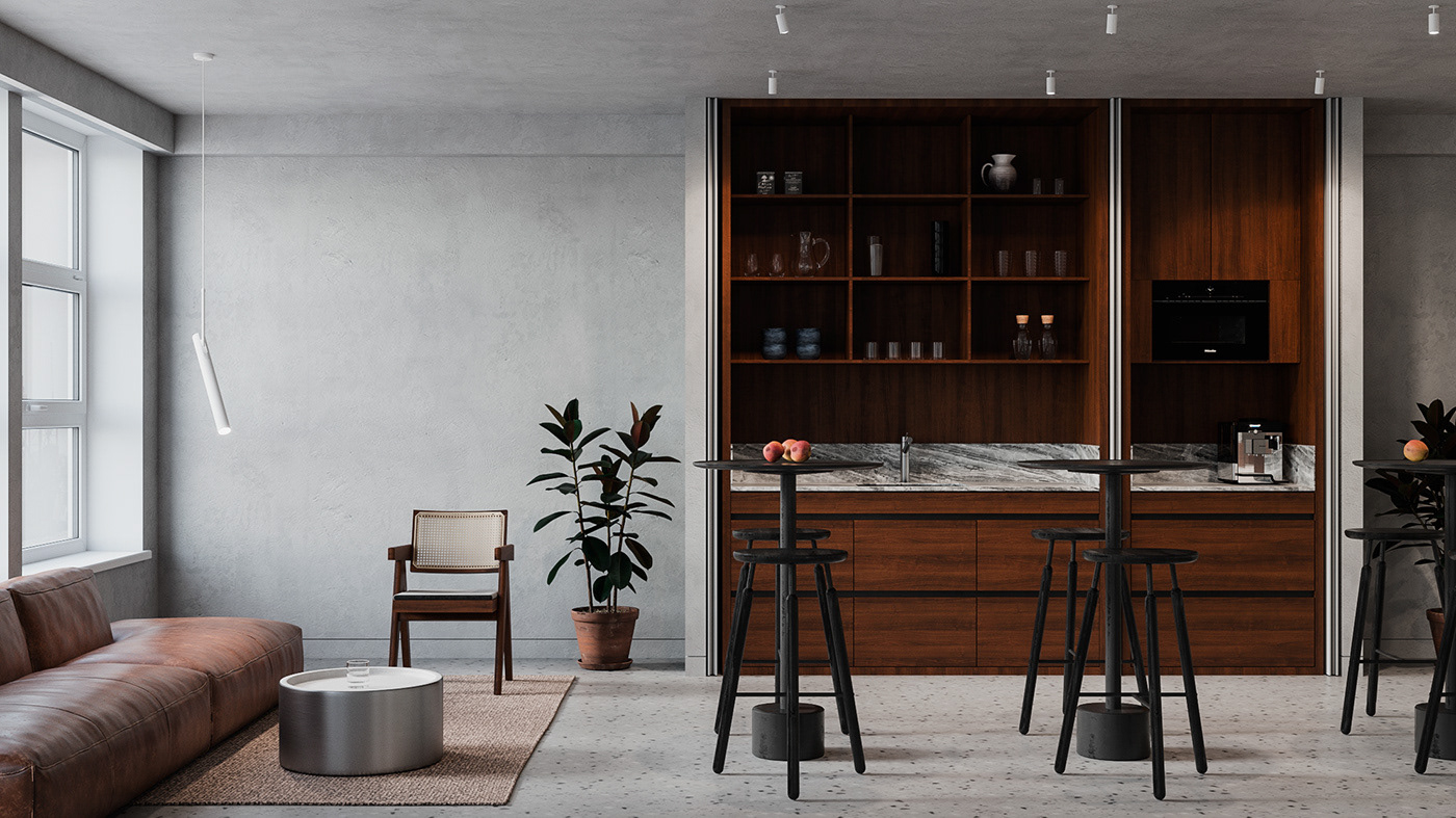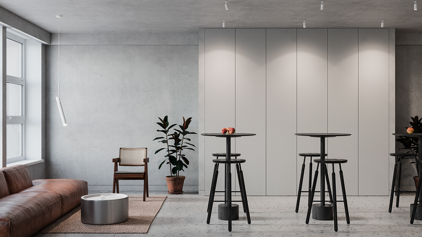 Minimalistic and strict office of a development company, located in a former industrial building. We were faced with the task of creating an interesting and clean space that does not look like standard office solutions. We have provided several tables for joint work, a meeting room, recreation areas, as well as a small kitchen. A strict light range was diluted with dark wood and brick shades