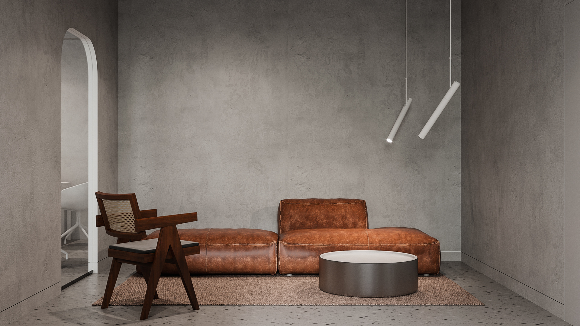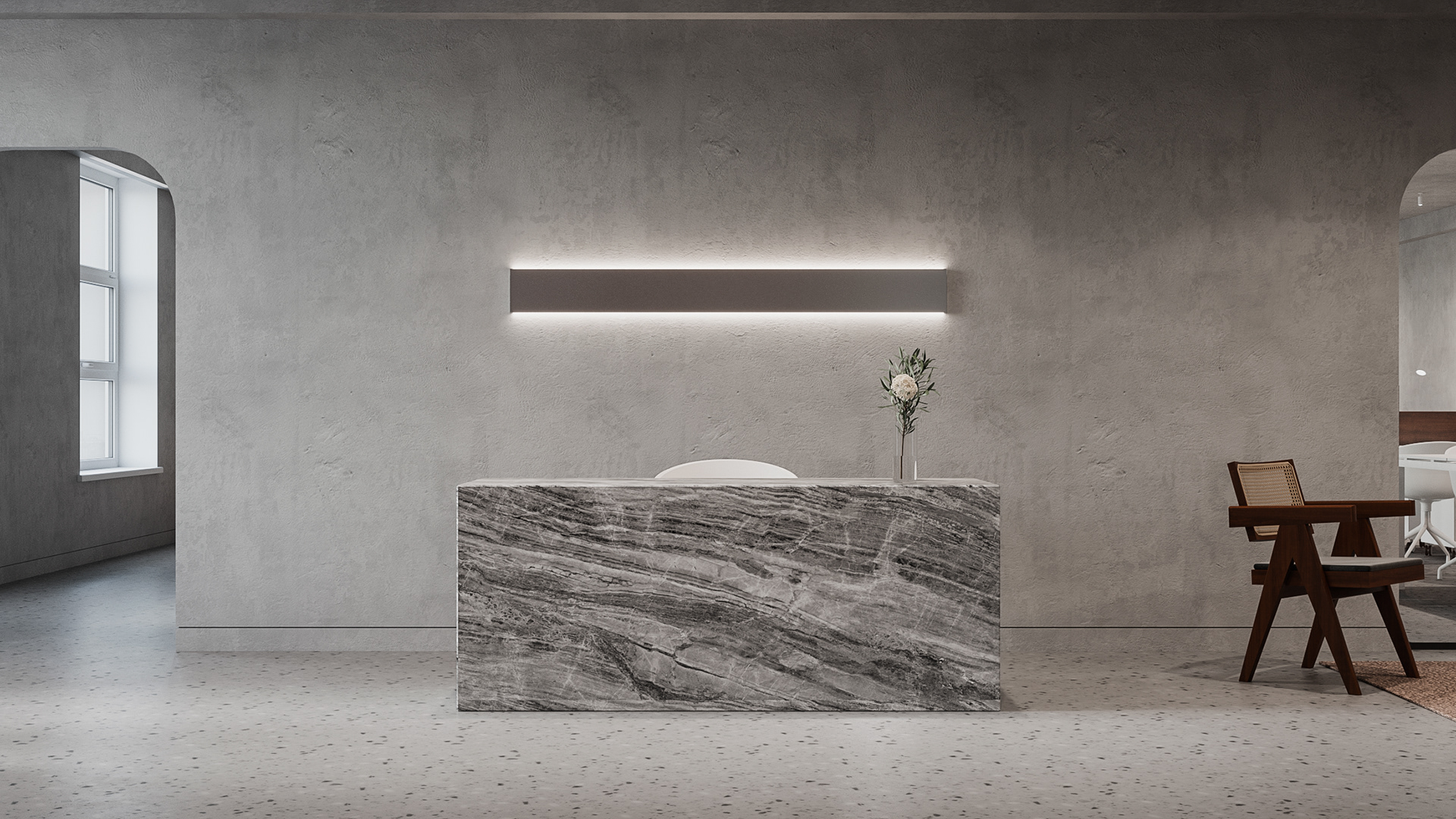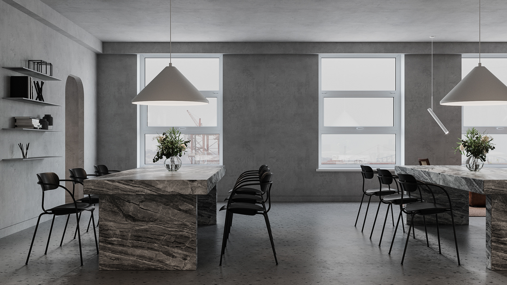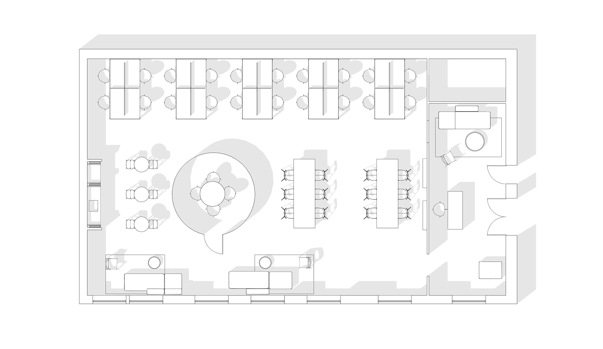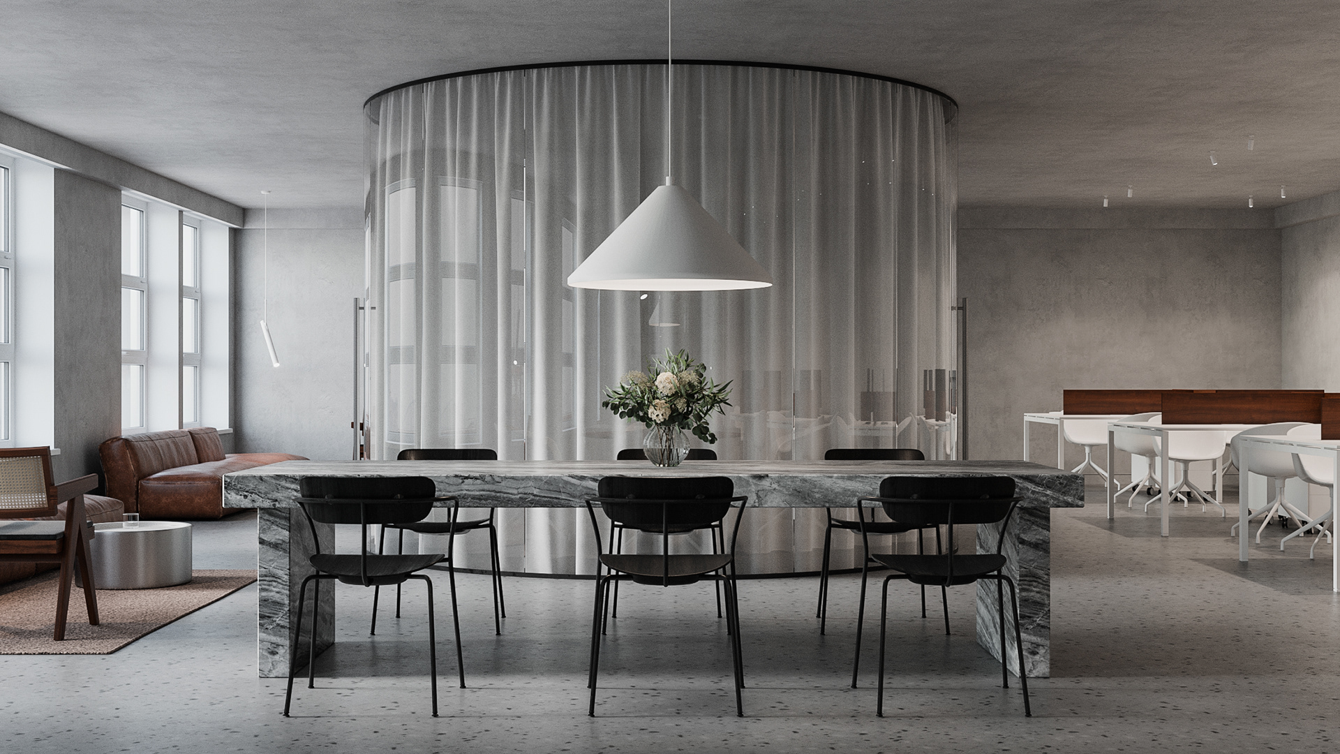 Minimalistic and strict office of a development company, located in a former industrial building. We were faced with the task of creating an interesting and clean space that does not look like standard office solutions. We have provided several tables for joint work, a meeting room, recreation areas, as well as a small kitchen. A strict light range was diluted with dark wood and brick shades