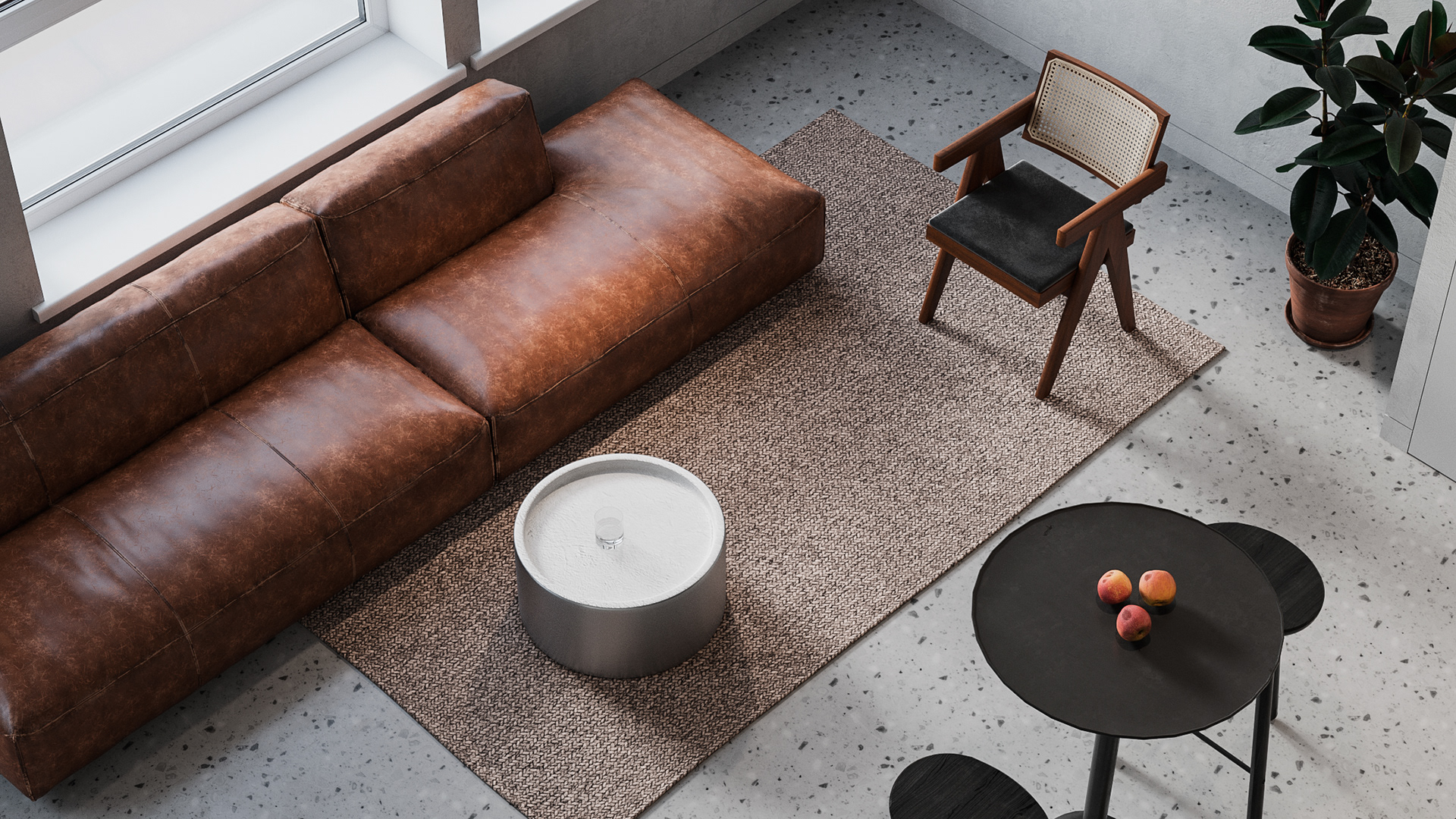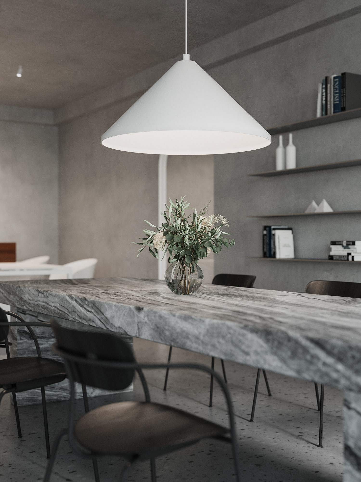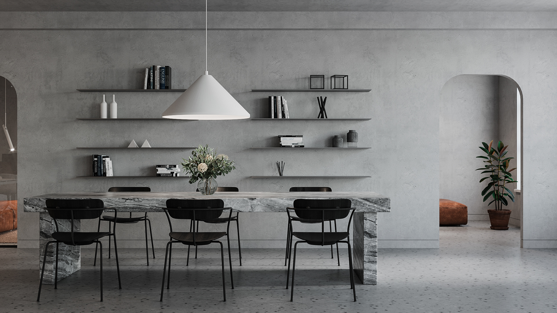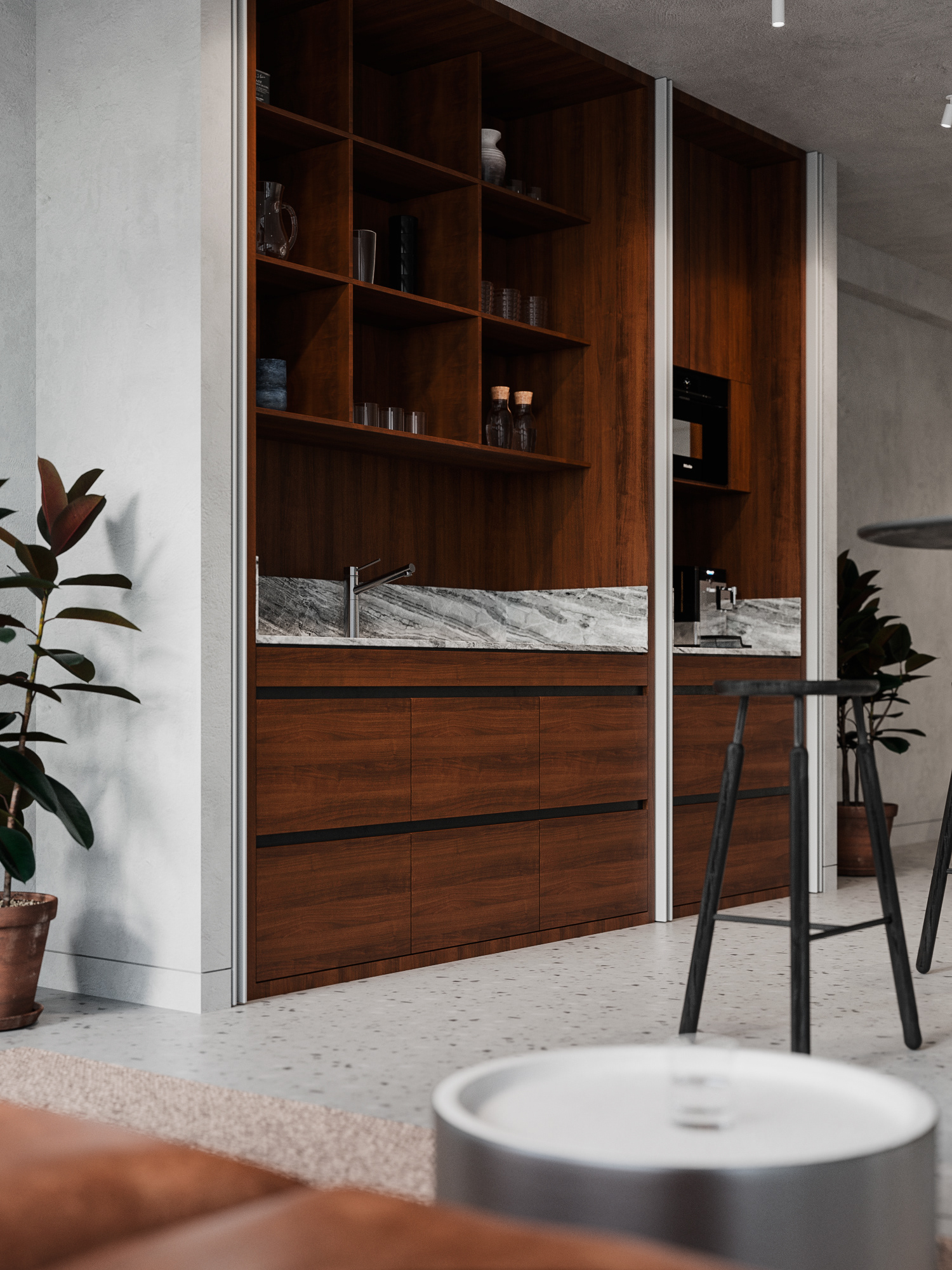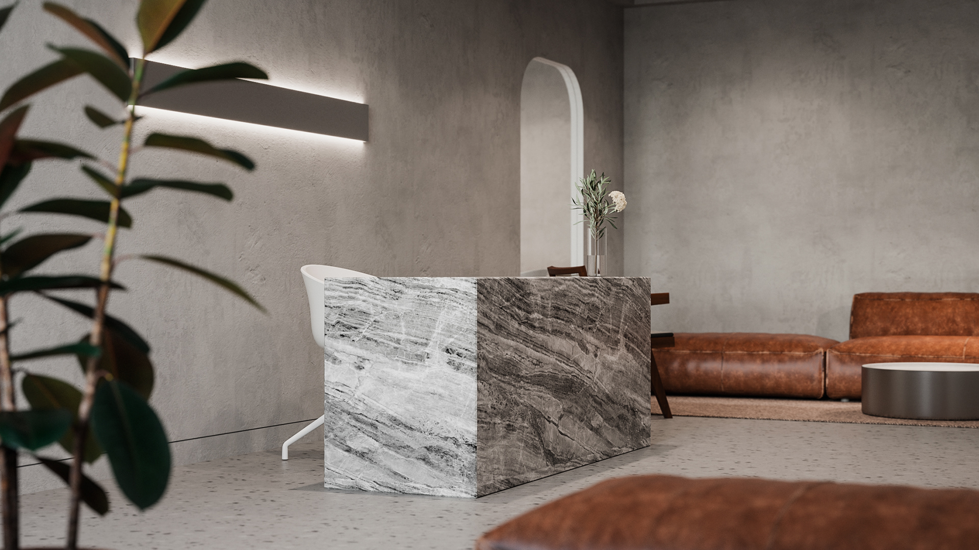 Minimalistic and strict office of a development company, located in a former industrial building. We were faced with the task of creating an interesting and clean space that does not look like standard office solutions. We have provided several tables for joint work, a meeting room, recreation areas, as well as a small kitchen. A strict light range was diluted with dark wood and brick shades