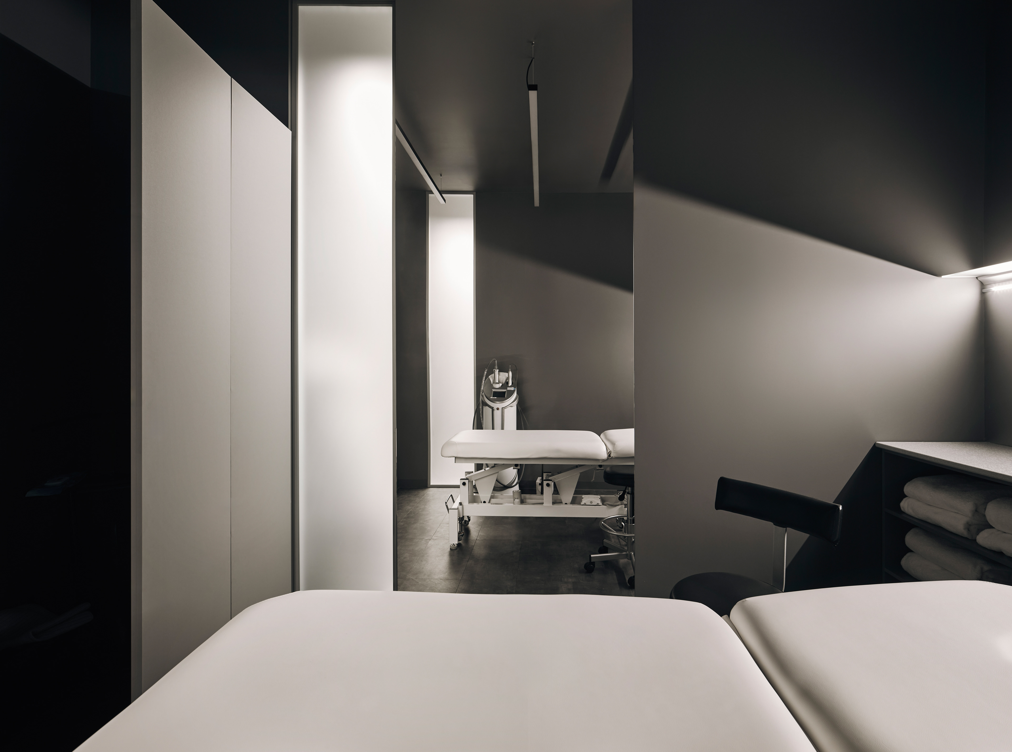 We wanted to highlight the "sterility" and medical aspect of the space. While beauty services usually hide this, we decided to bring it to the forefront. This led us to seek inspiration in the medical world.