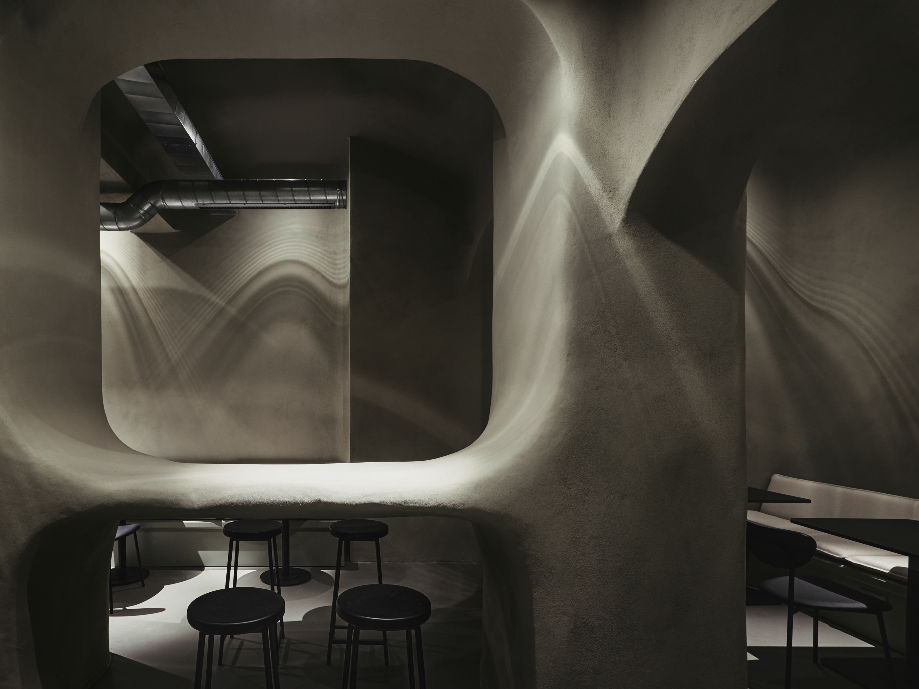 The branding ideas continued into the interior design—from very complex yet fluid, soft-shaped signage to wall finishes and an abundance of plants—everything in this project speaks of coffee and flower gardens.