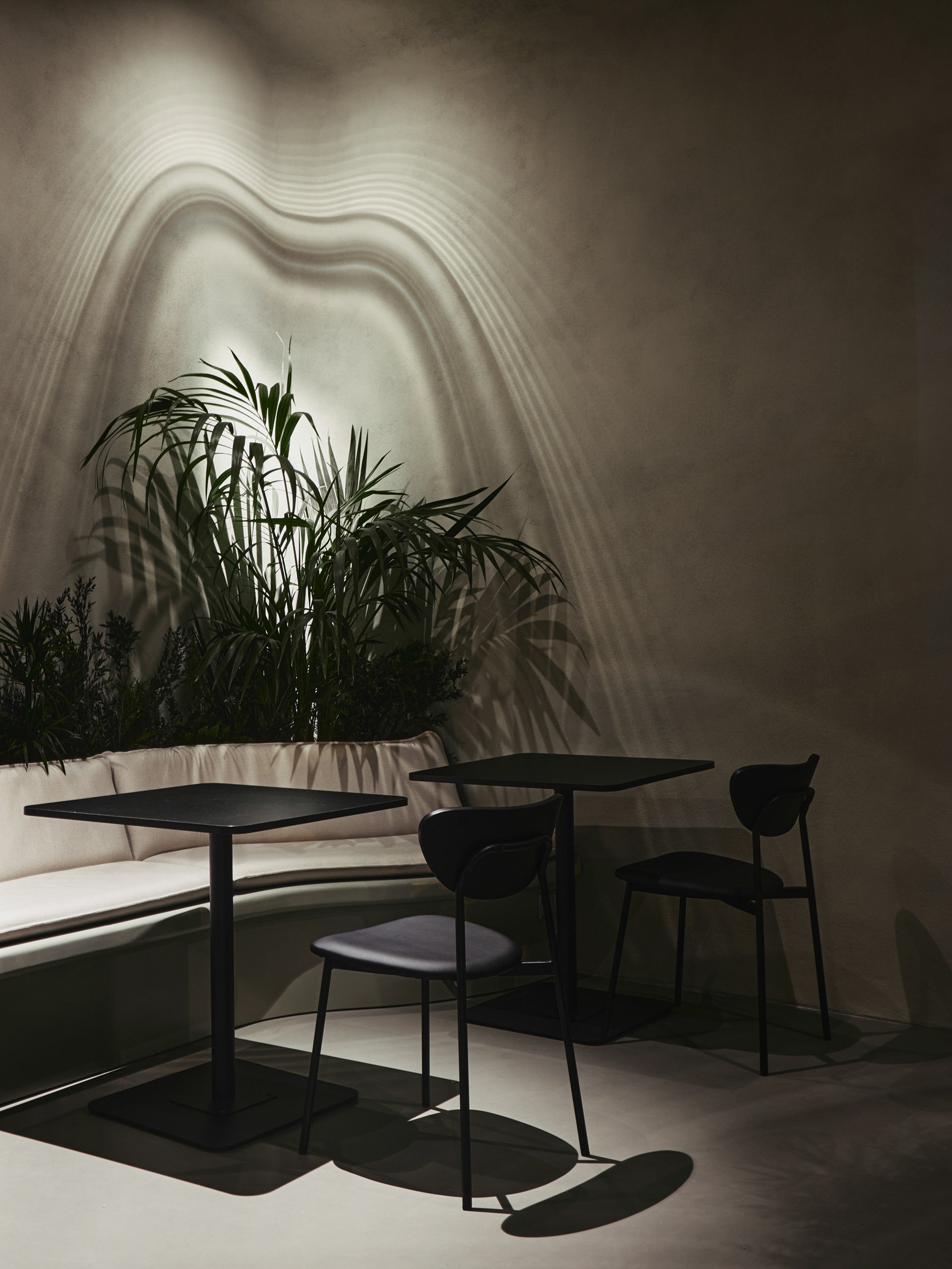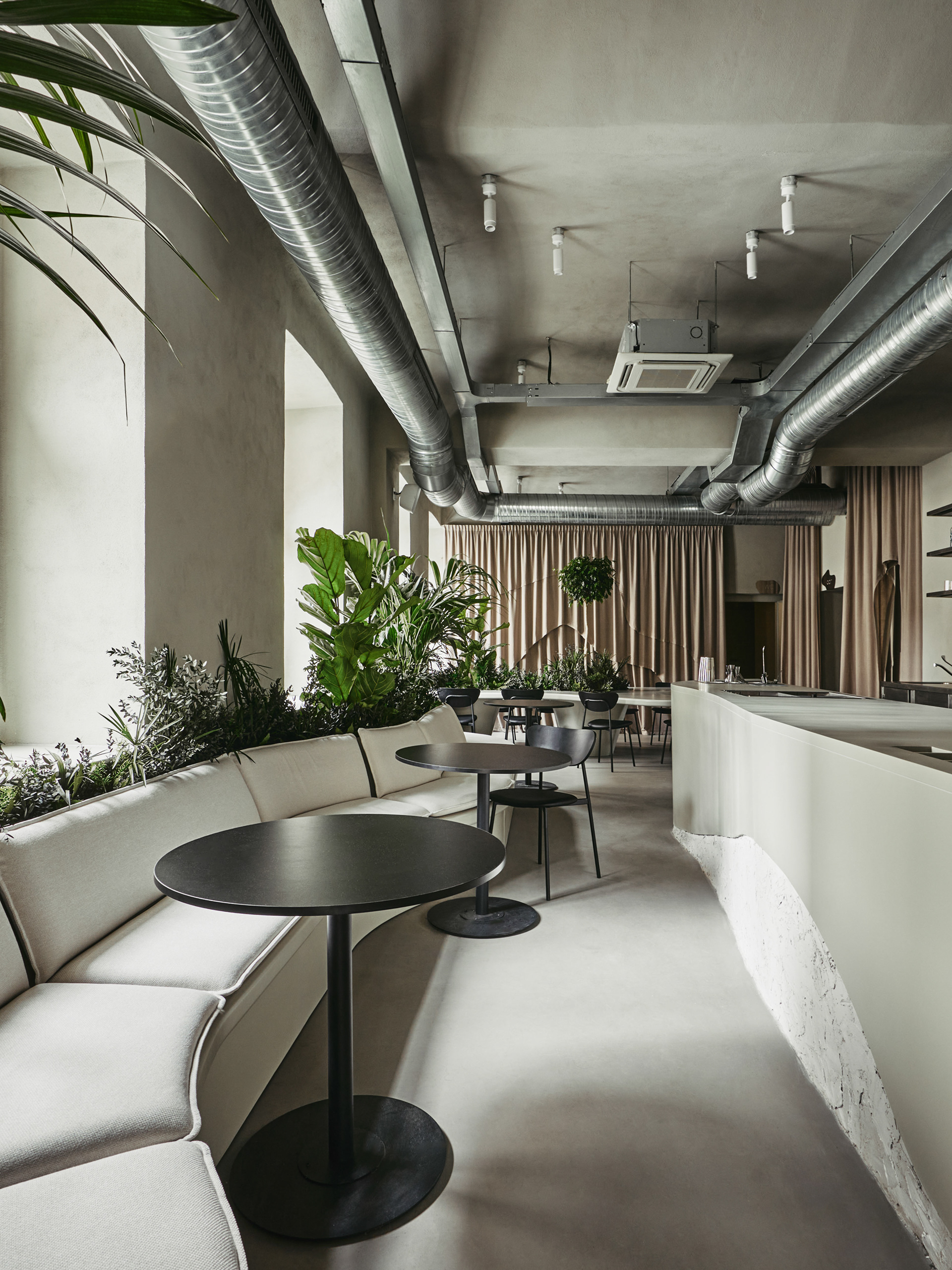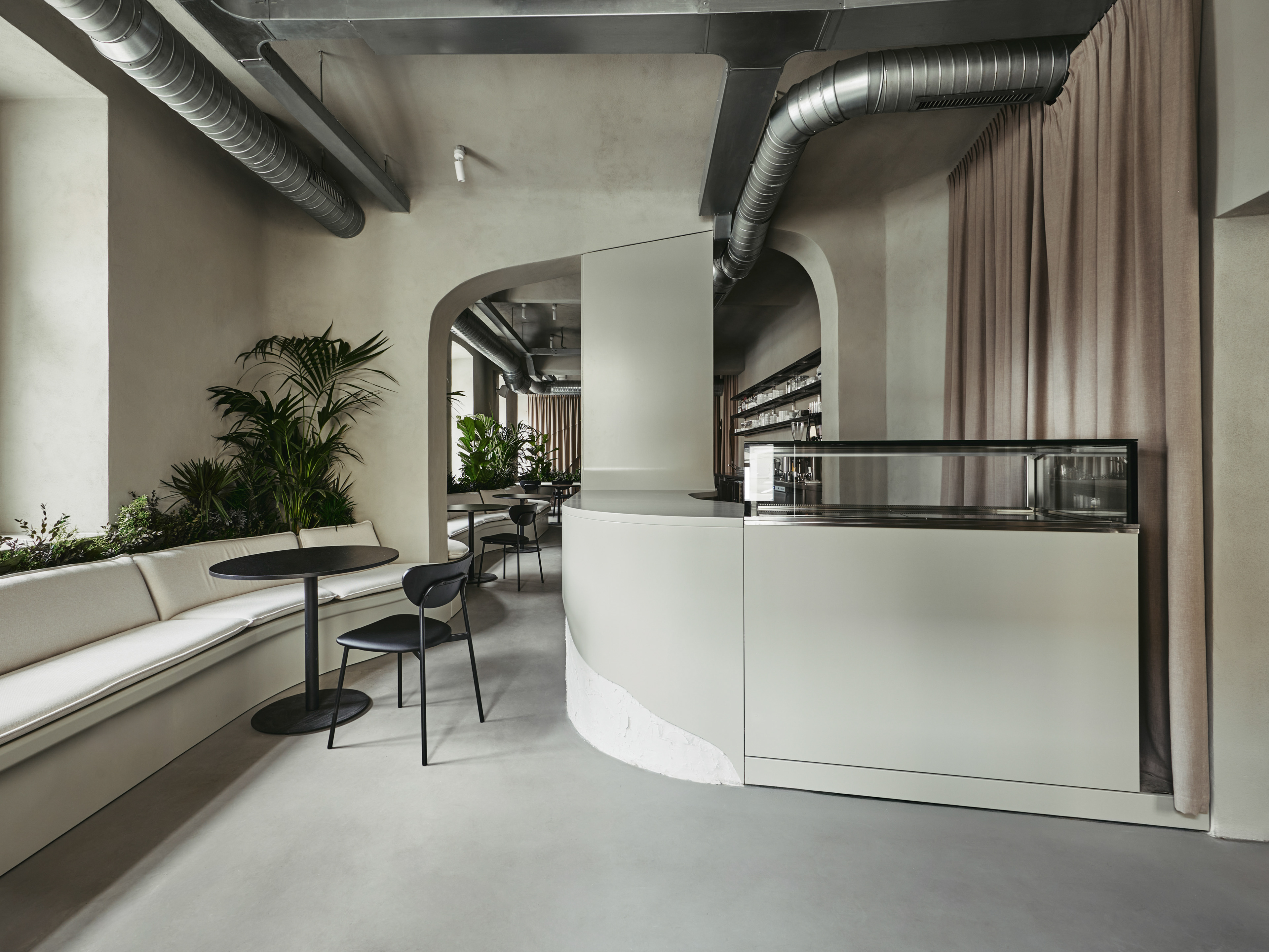The café is envisioned as a garden with organic and natural pathways leading to secluded spots, creating an atmosphere of tranquility and privacy. The space was divided into several zones to create diverse moods. The main hall symbolizes an urban garden with long lines, such as the 8-meter-long sofa area and the welcoming bar station. The secondary hall, a bar area, offers a more intimate ambiance with muted colors and special lighting, creating a sense of unity and natural monolithicity.