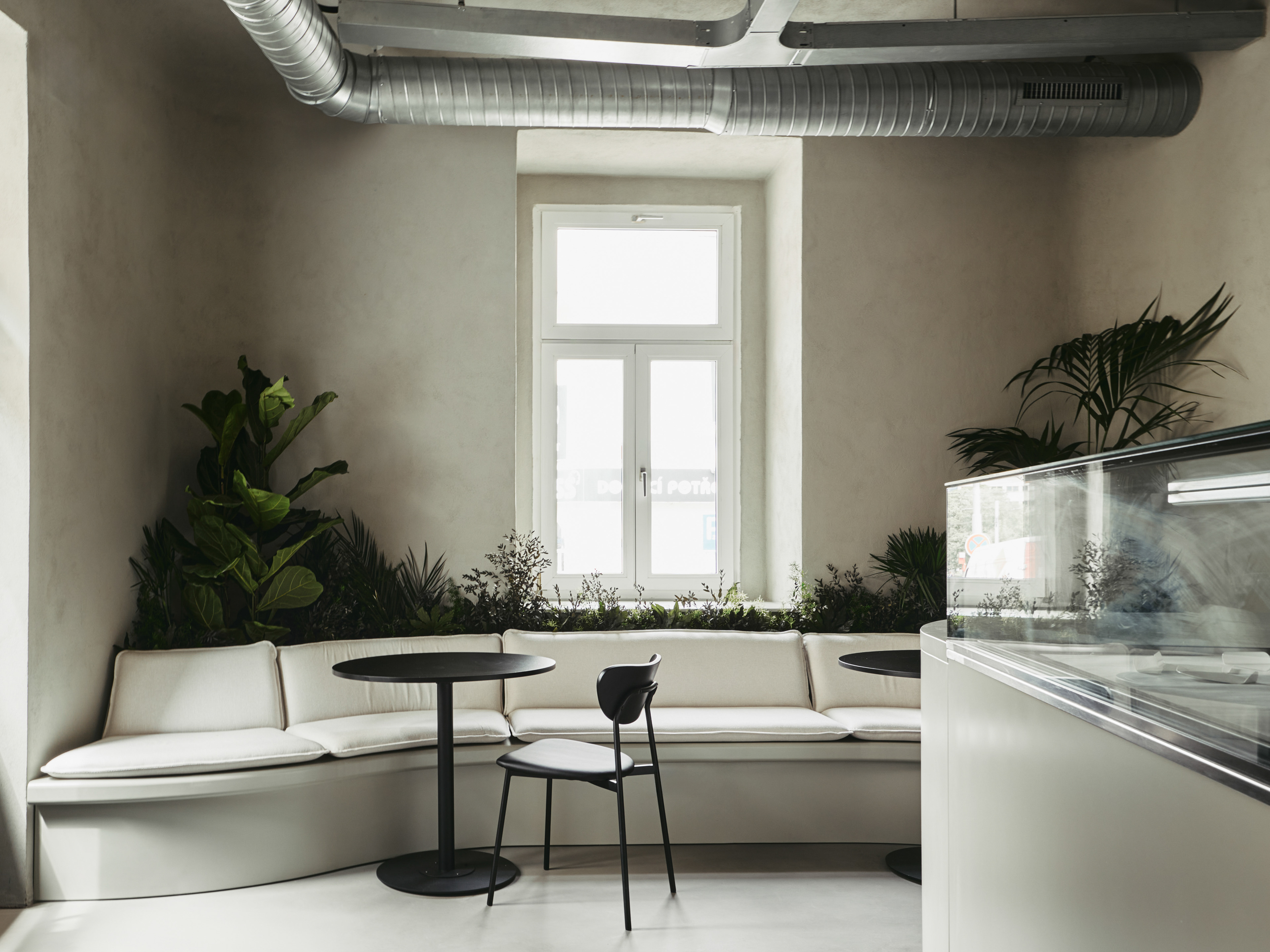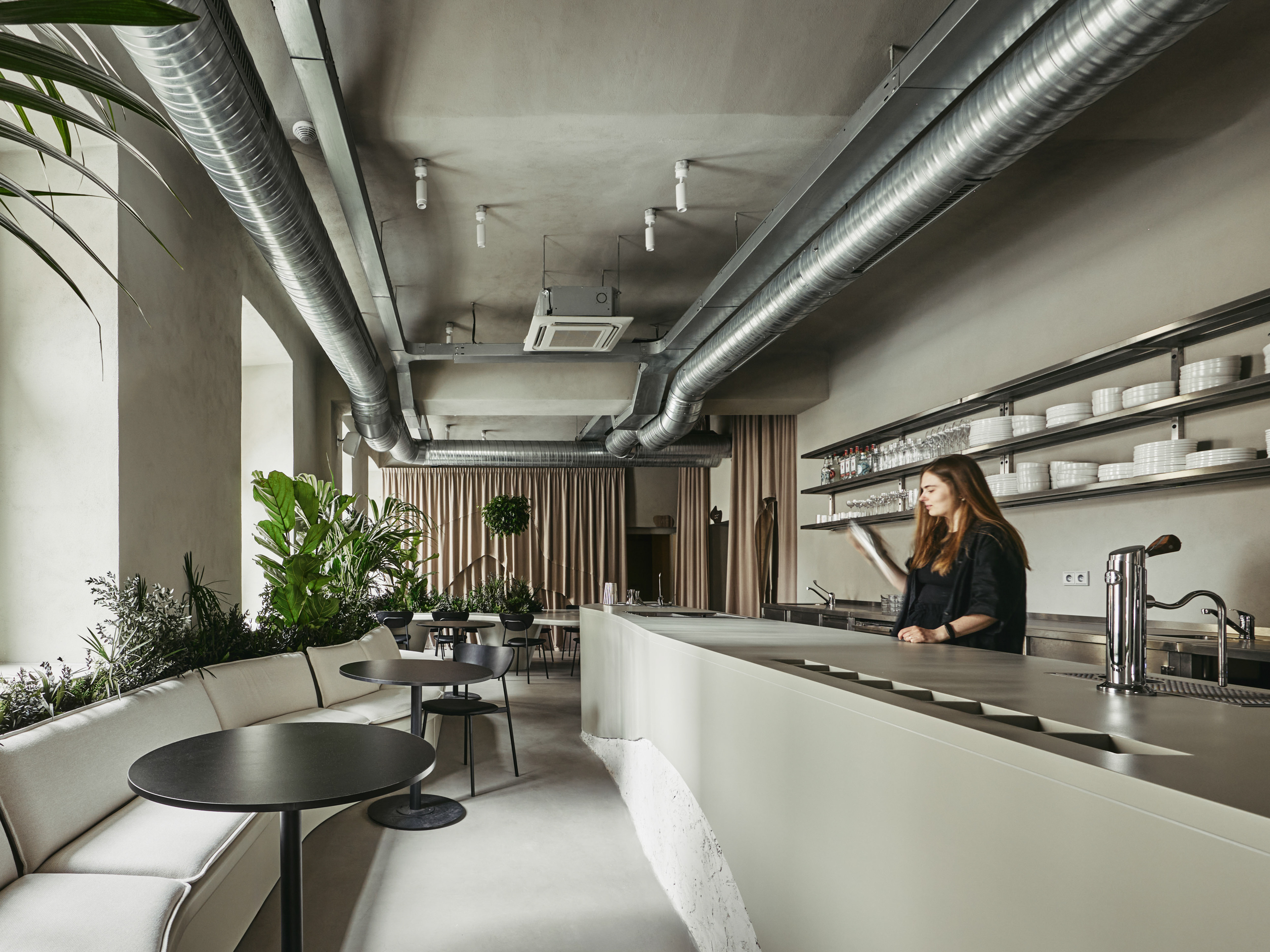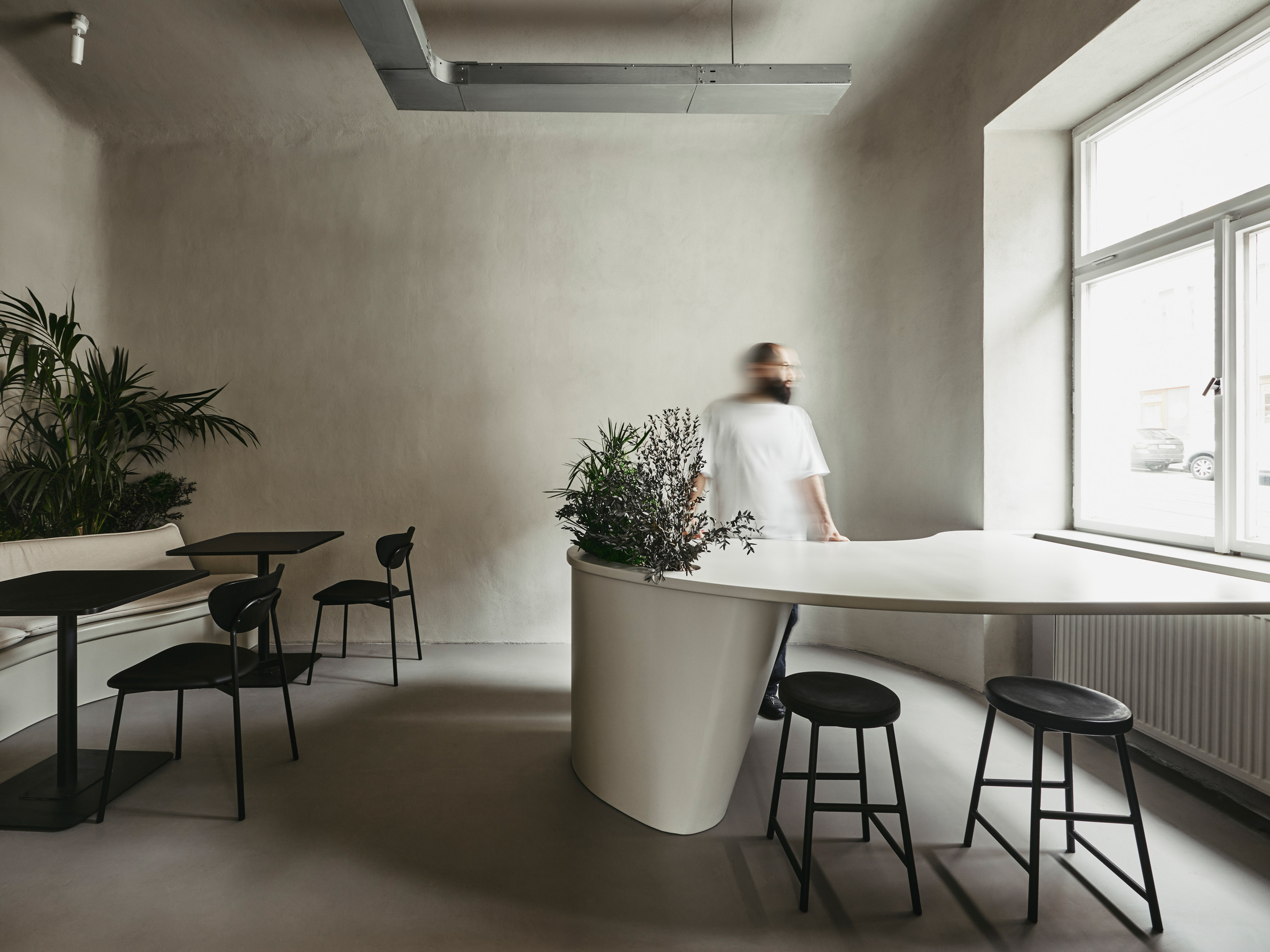 The Efsy Café project in Prague embodies the concept of blending nature and urbanism. The name Efsy represents the transcription of the initials from "flowers" and "coffee," setting the foundation for a project rich in greenery and coffee culture. Over time, the concept expanded to include a bar, introducing the slogan "Fresh AM, Sexy PM," highlighting the dual nature of the establishment – invigorating in the morning and alluring in the evening.