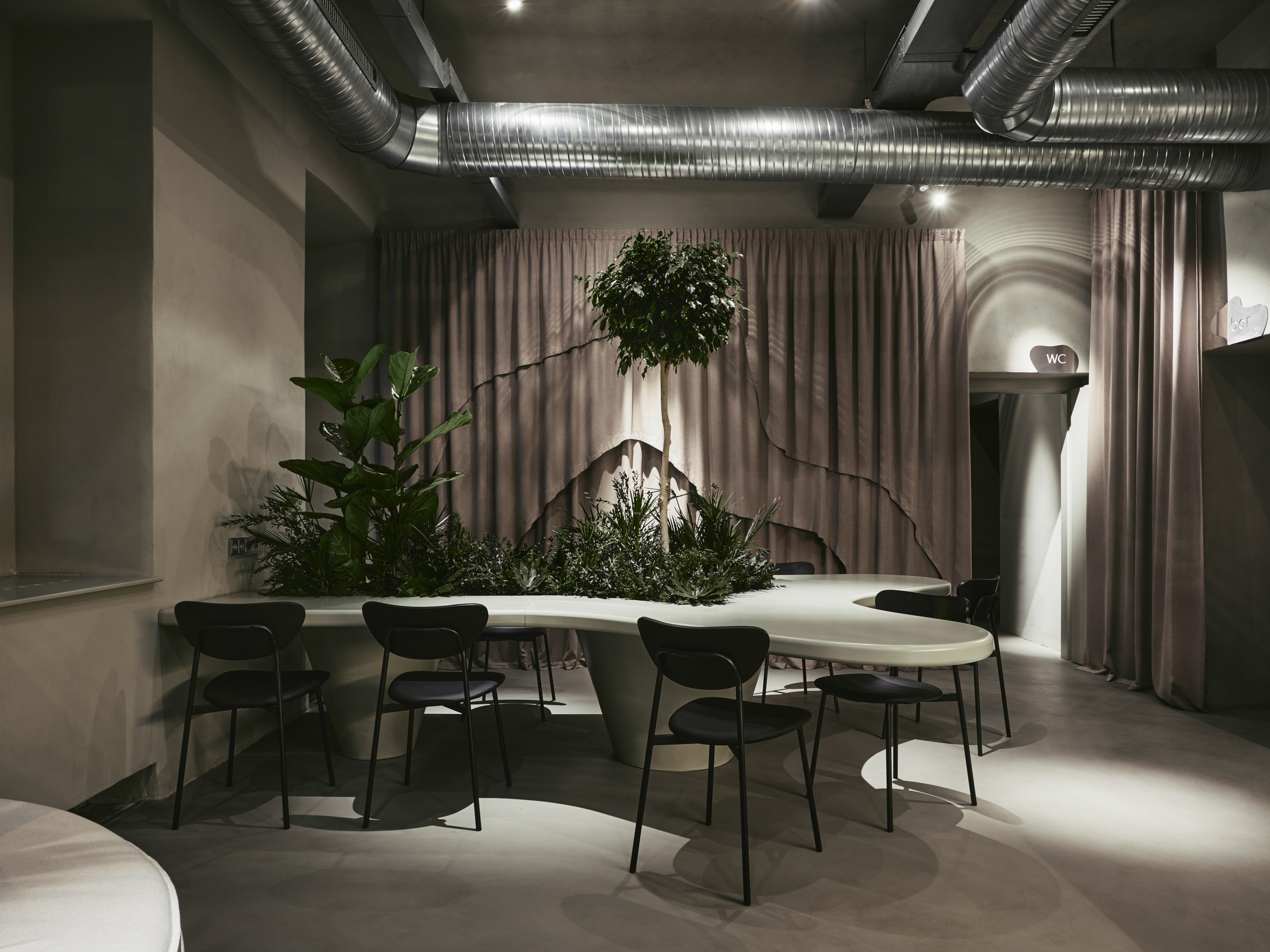 The central communal table, designed to appear as a natural phenomenon emerging from the floor, is adorned with plants and consists of four tables seating three people each, fostering a sense of community and unity despite the individuality of each seat