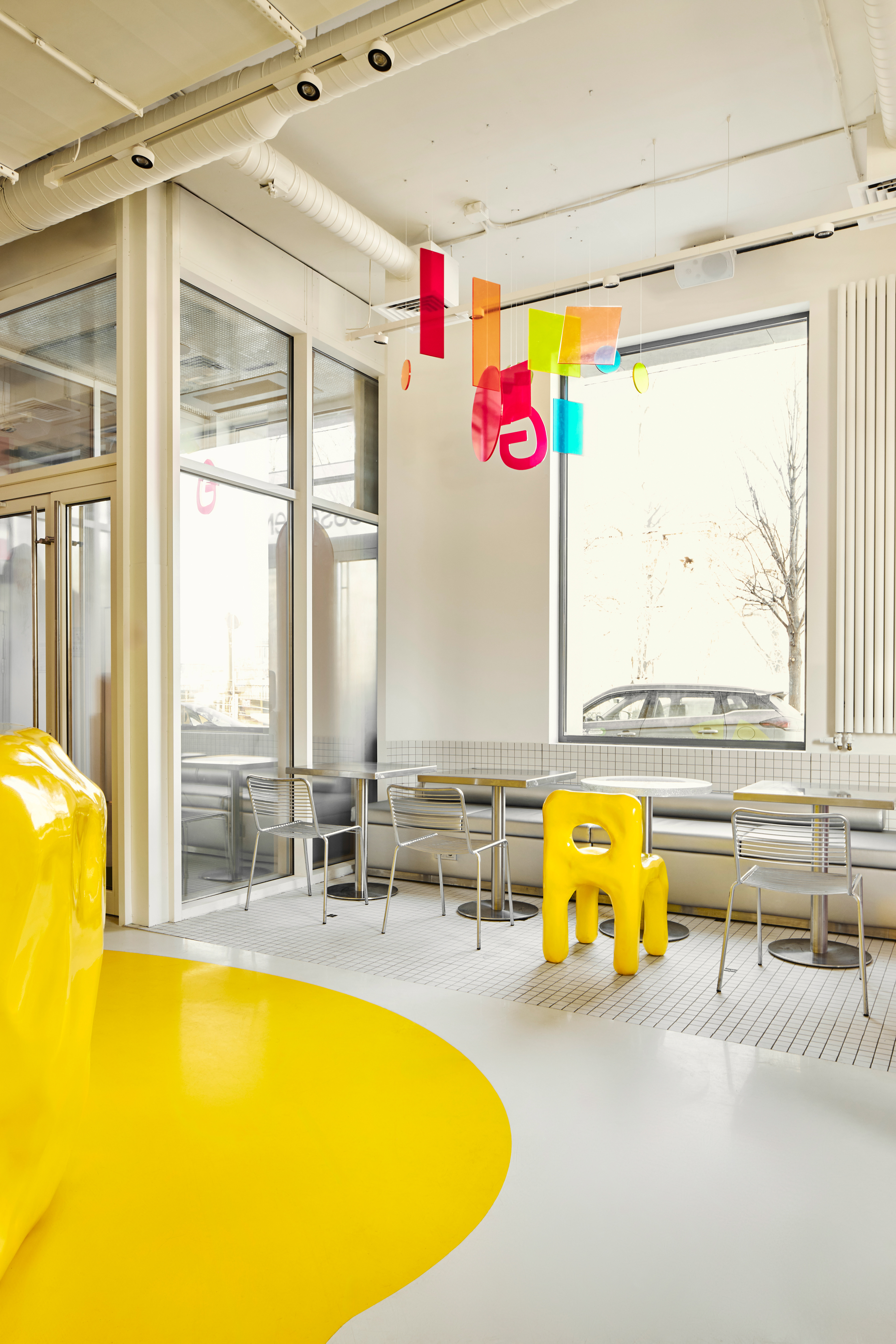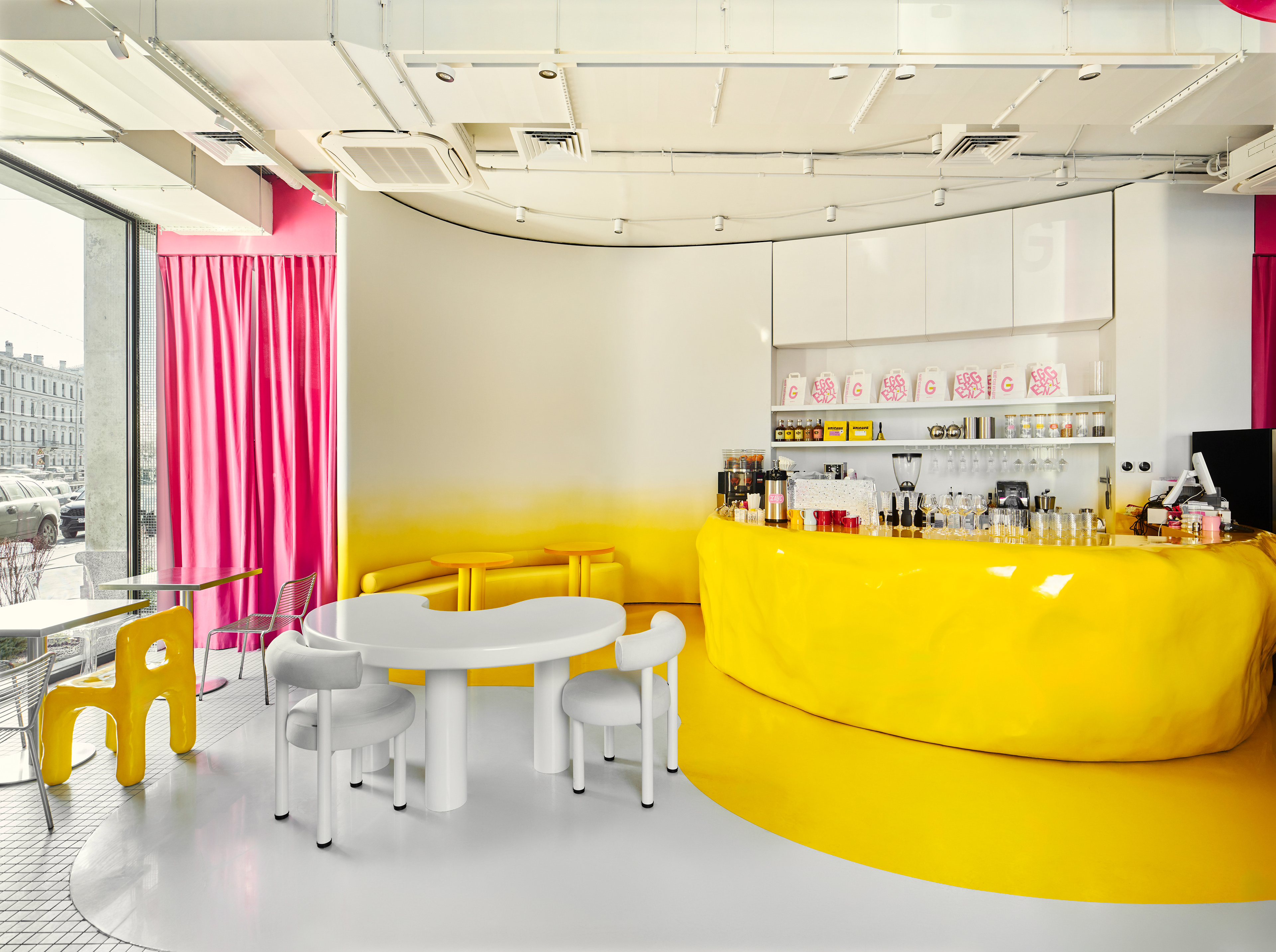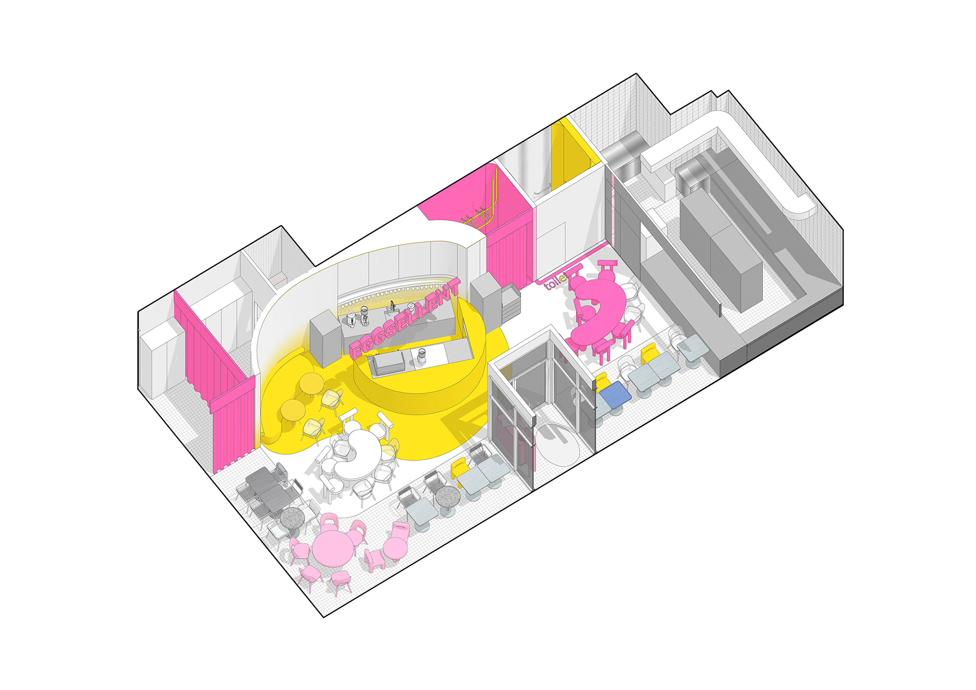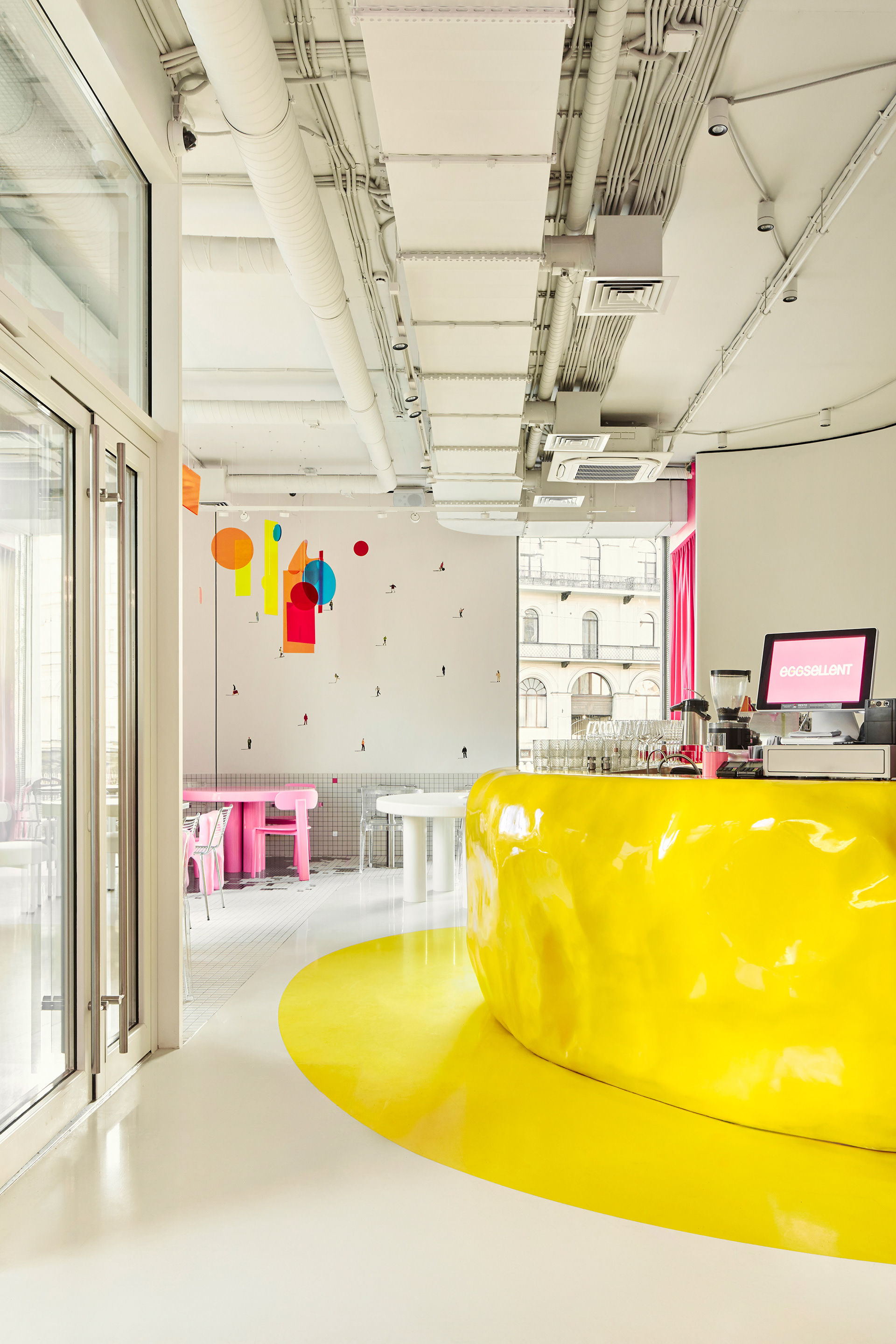 The design project for the new café by Eggsellent represents a unique blend of modern style and classic architecture. The café's interior contrasts sharply with the building's austere exterior, featuring a symbiosis of colors and shapes inspired by the Eggsellent brand concept. The layout resembles a plate with the bar counter and open kitchen as the central yolk, surrounded by seating areas of various shapes, akin to scattered salad leaves and other ingredients on a plate. The café's design employs a signature color palette of yellow and pink, enhanced with glitter and rounded shapes, reflecting the Eggsellent style. While the initial concept envisioned a brighter and more diverse color scheme, the team opted for a more restrained and refined approach to harmoniously blend the interior with the building's architecture and the urban environment. This resulted in a balance between playfulness and elegance, naivety and rationality, giving the project a unique character and broad appeal
