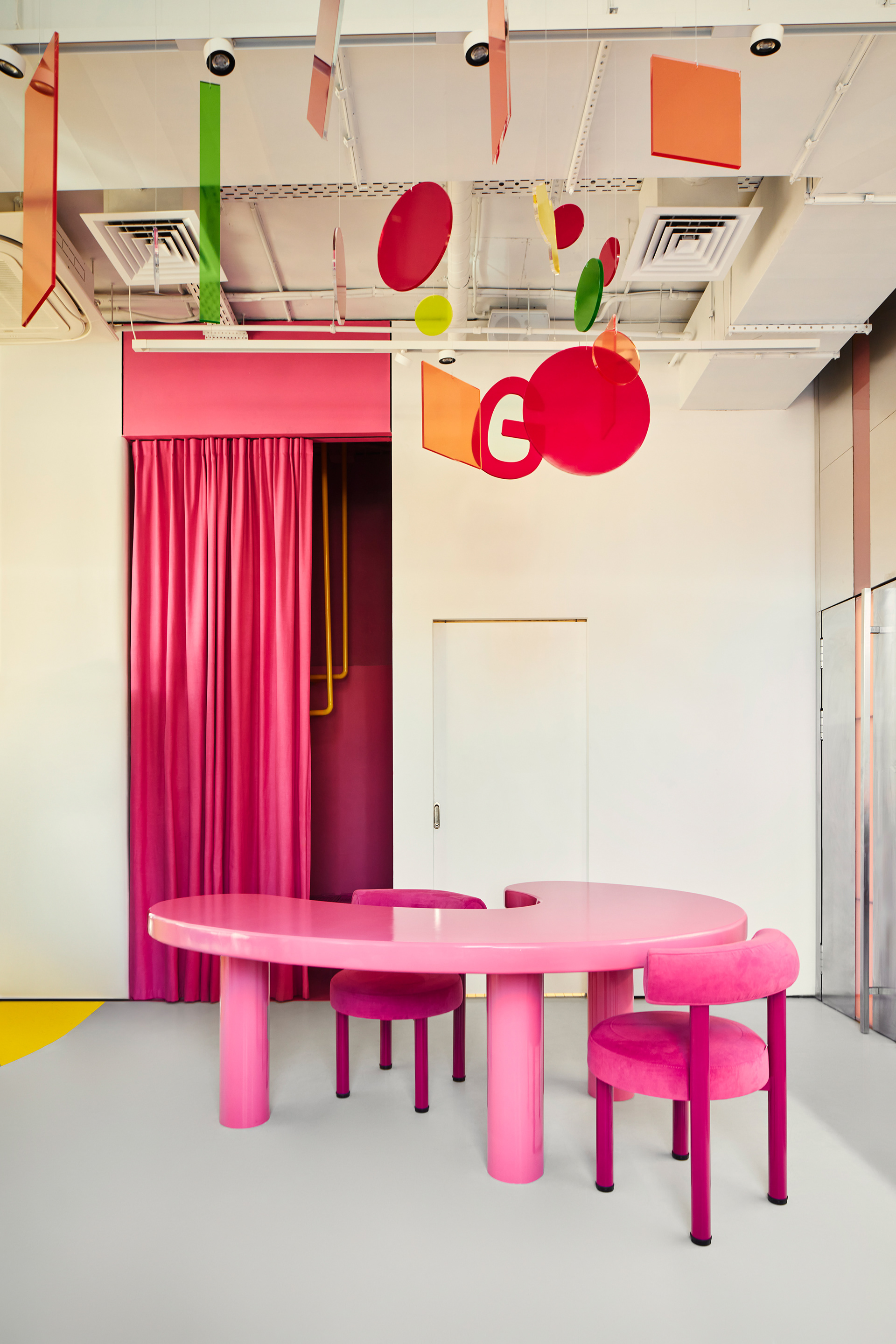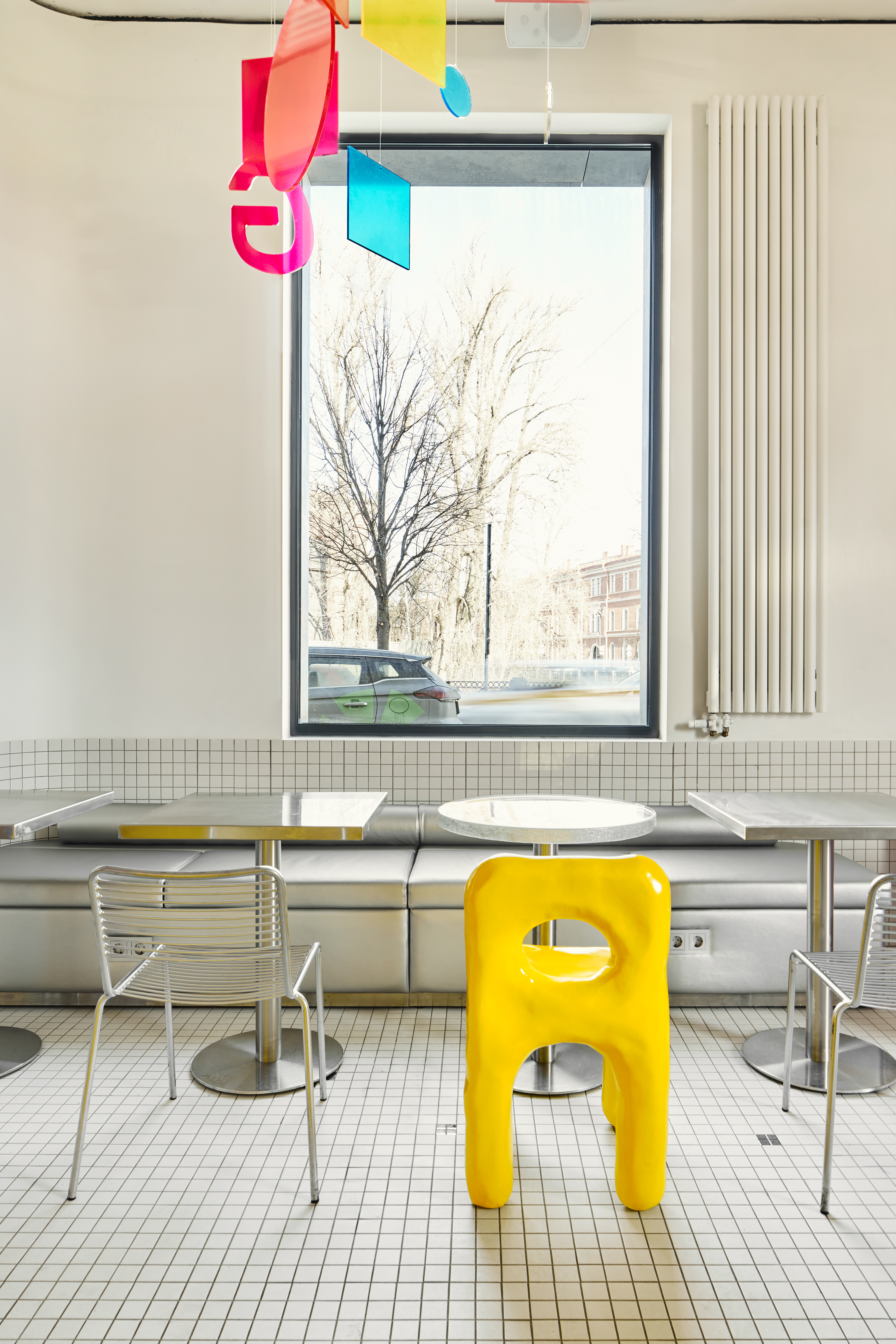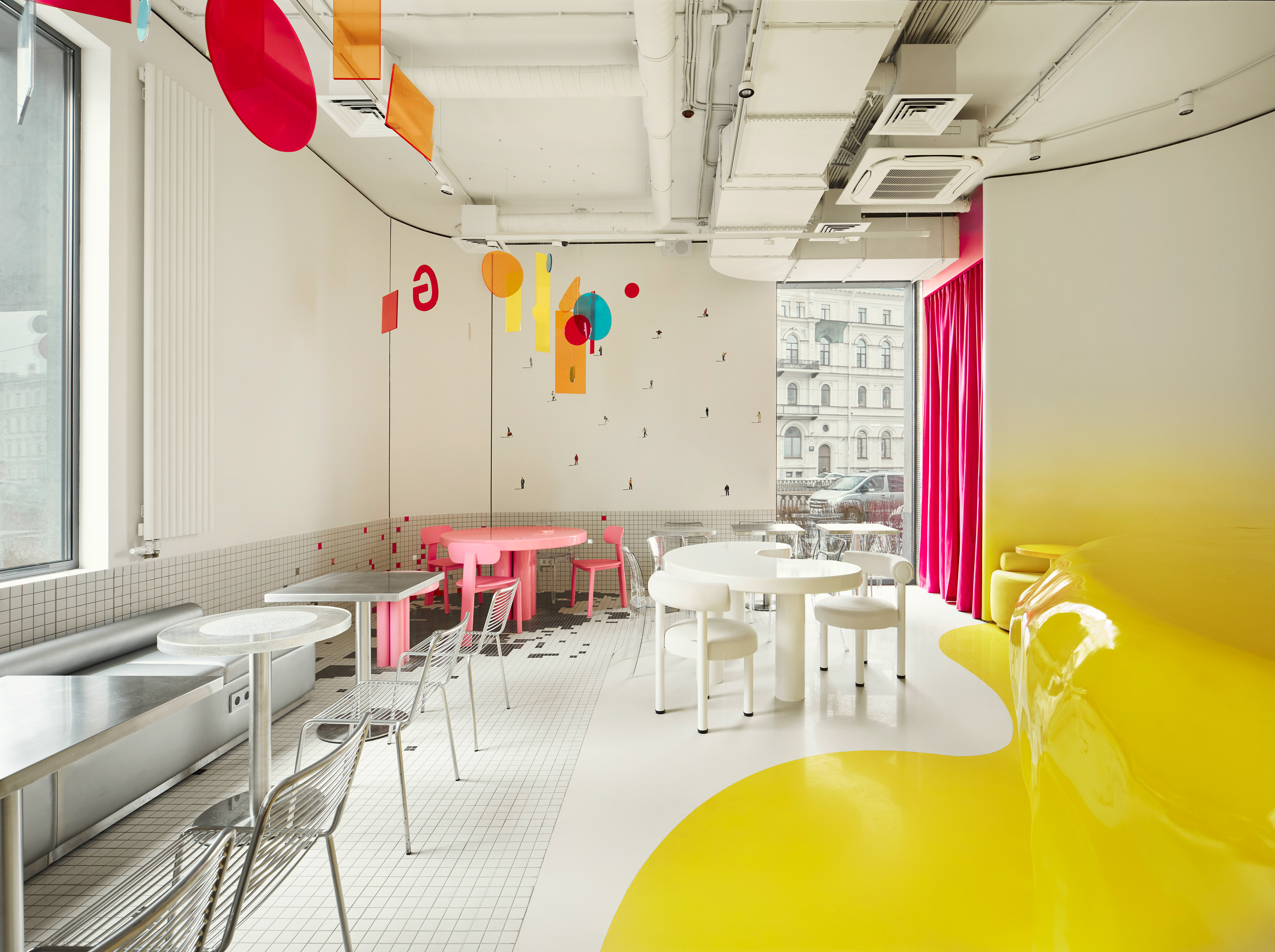 The design project for the new café by Eggsellent represents a unique blend of modern style and classic architecture. The café's interior contrasts sharply with the building's austere exterior, featuring a symbiosis of colors and shapes inspired by the Eggsellent brand concept. The layout resembles a plate with the bar counter and open kitchen as the central yolk, surrounded by seating areas of various shapes, akin to scattered salad leaves and other ingredients on a plate. The café's design employs a signature color palette of yellow and pink, enhanced with glitter and rounded shapes, reflecting the Eggsellent style. While the initial concept envisioned a brighter and more diverse color scheme, the team opted for a more restrained and refined approach to harmoniously blend the interior with the building's architecture and the urban environment. This resulted in a balance between playfulness and elegance, naivety and rationality, giving the project a unique character and broad appeal