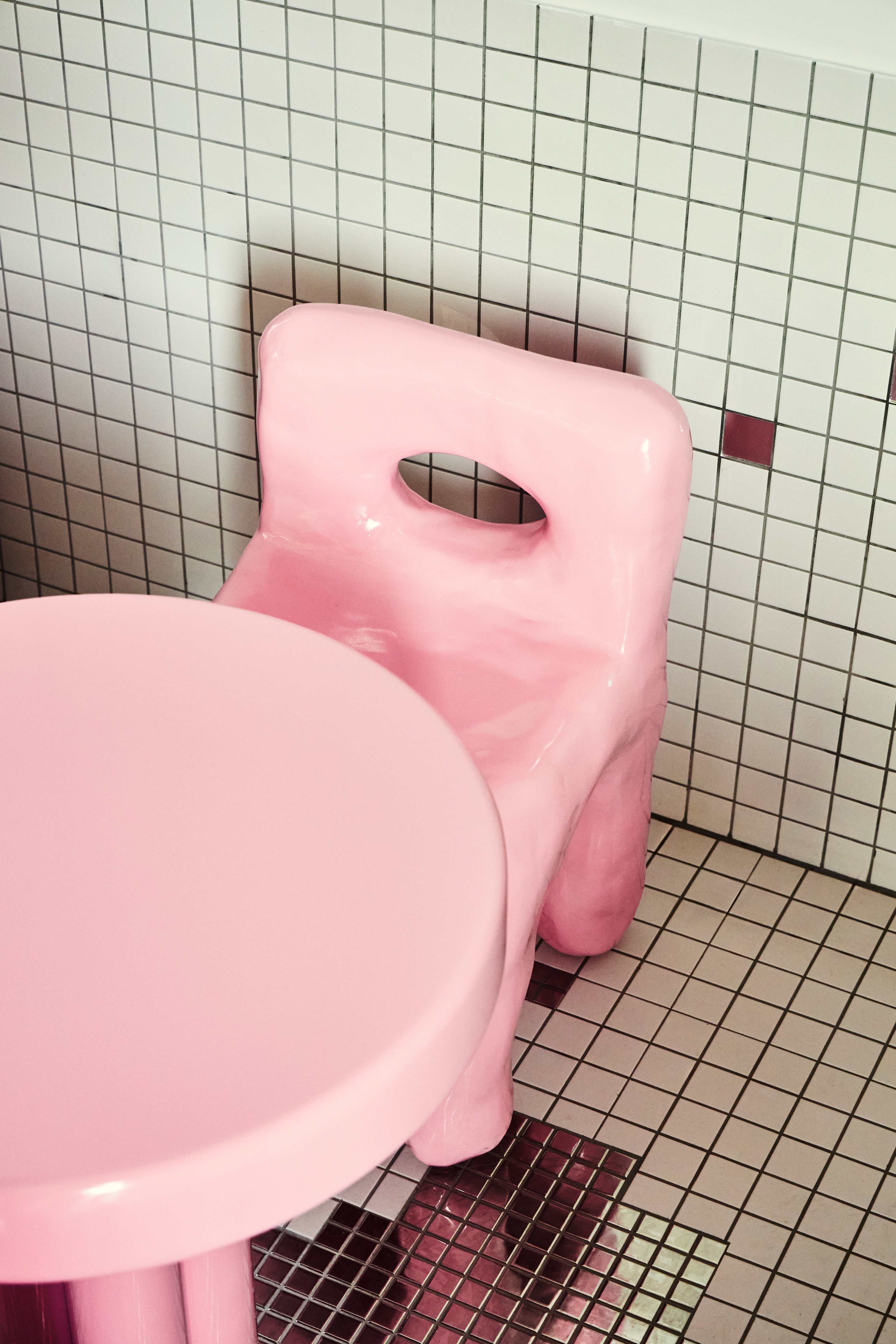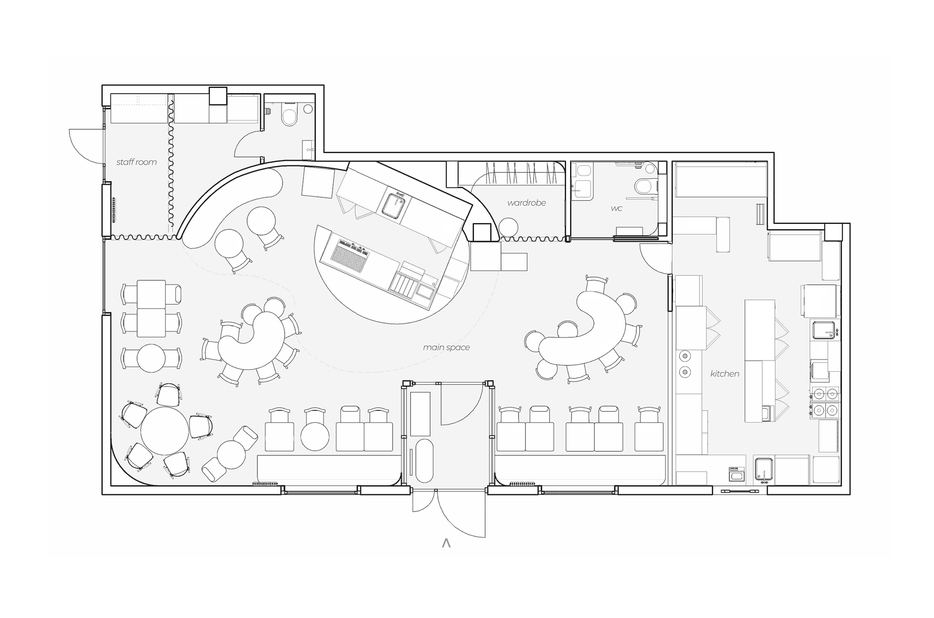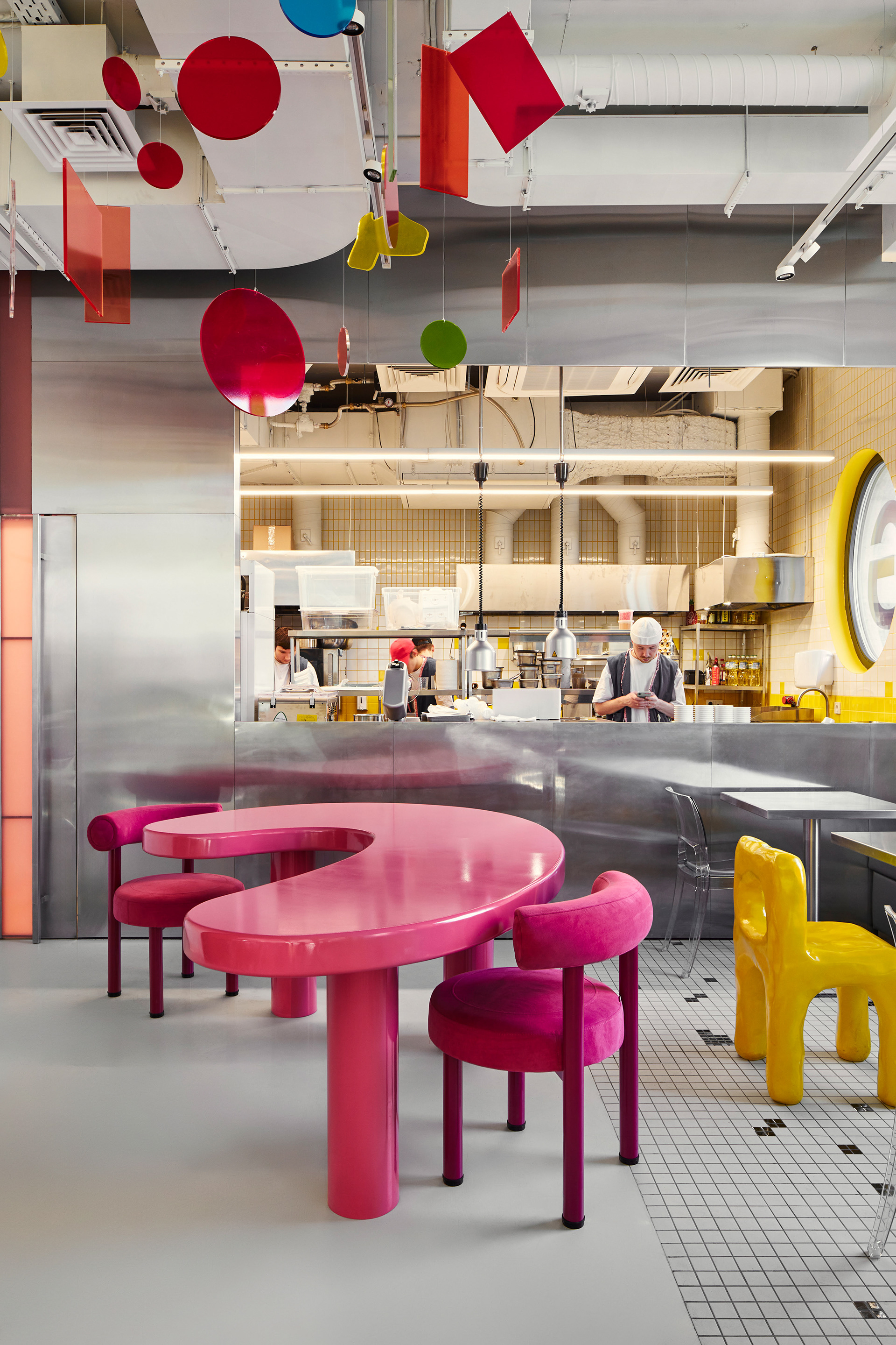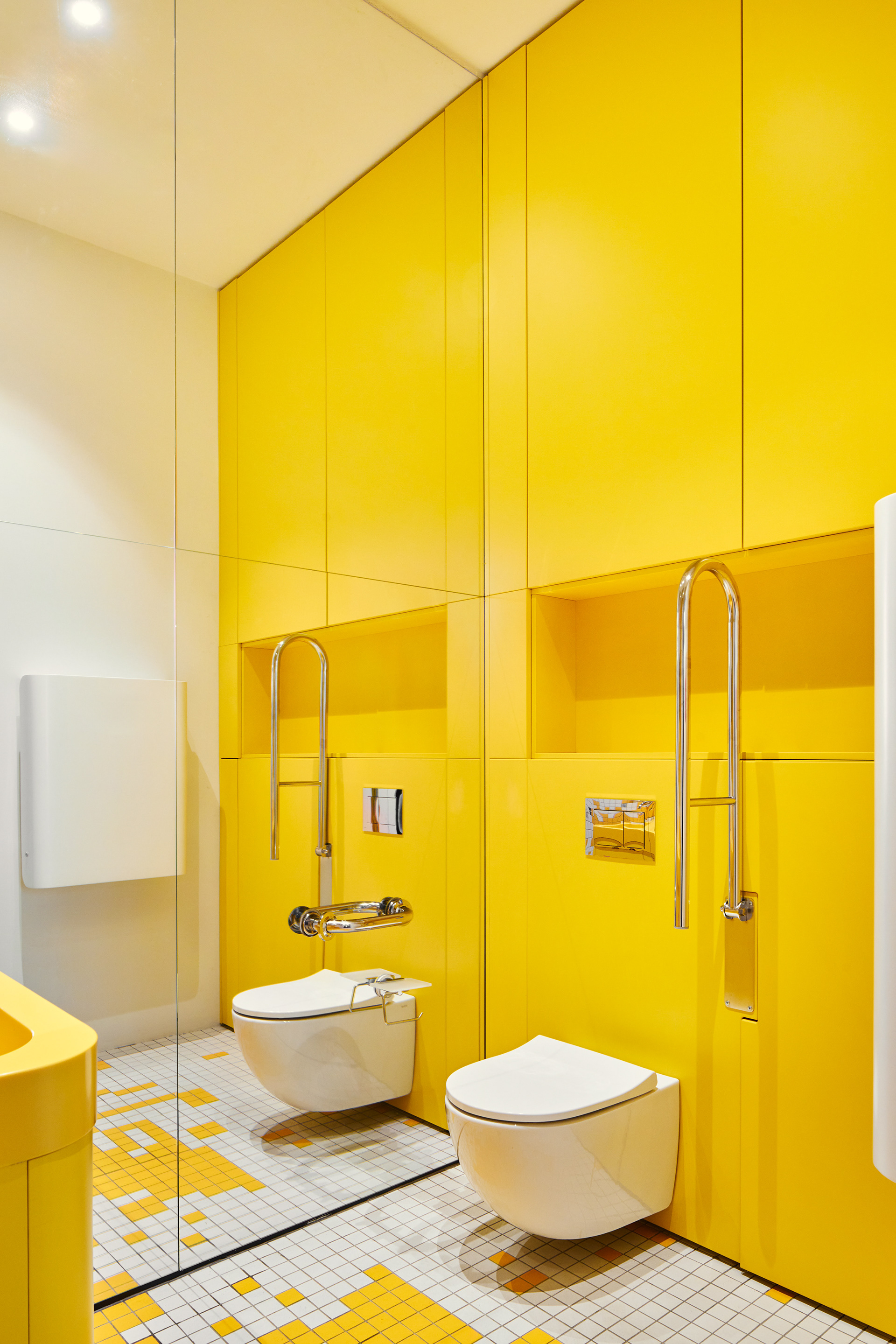 The design project for the new café by Eggsellent represents a unique blend of modern style and classic architecture. The café's interior contrasts sharply with the building's austere exterior, featuring a symbiosis of colors and shapes inspired by the Eggsellent brand concept. The layout resembles a plate with the bar counter and open kitchen as the central yolk, surrounded by seating areas of various shapes, akin to scattered salad leaves and other ingredients on a plate. The café's design employs a signature color palette of yellow and pink, enhanced with glitter and rounded shapes, reflecting the Eggsellent style. While the initial concept envisioned a brighter and more diverse color scheme, the team opted for a more restrained and refined approach to harmoniously blend the interior with the building's architecture and the urban environment. This resulted in a balance between playfulness and elegance, naivety and rationality, giving the project a unique character and broad appeal