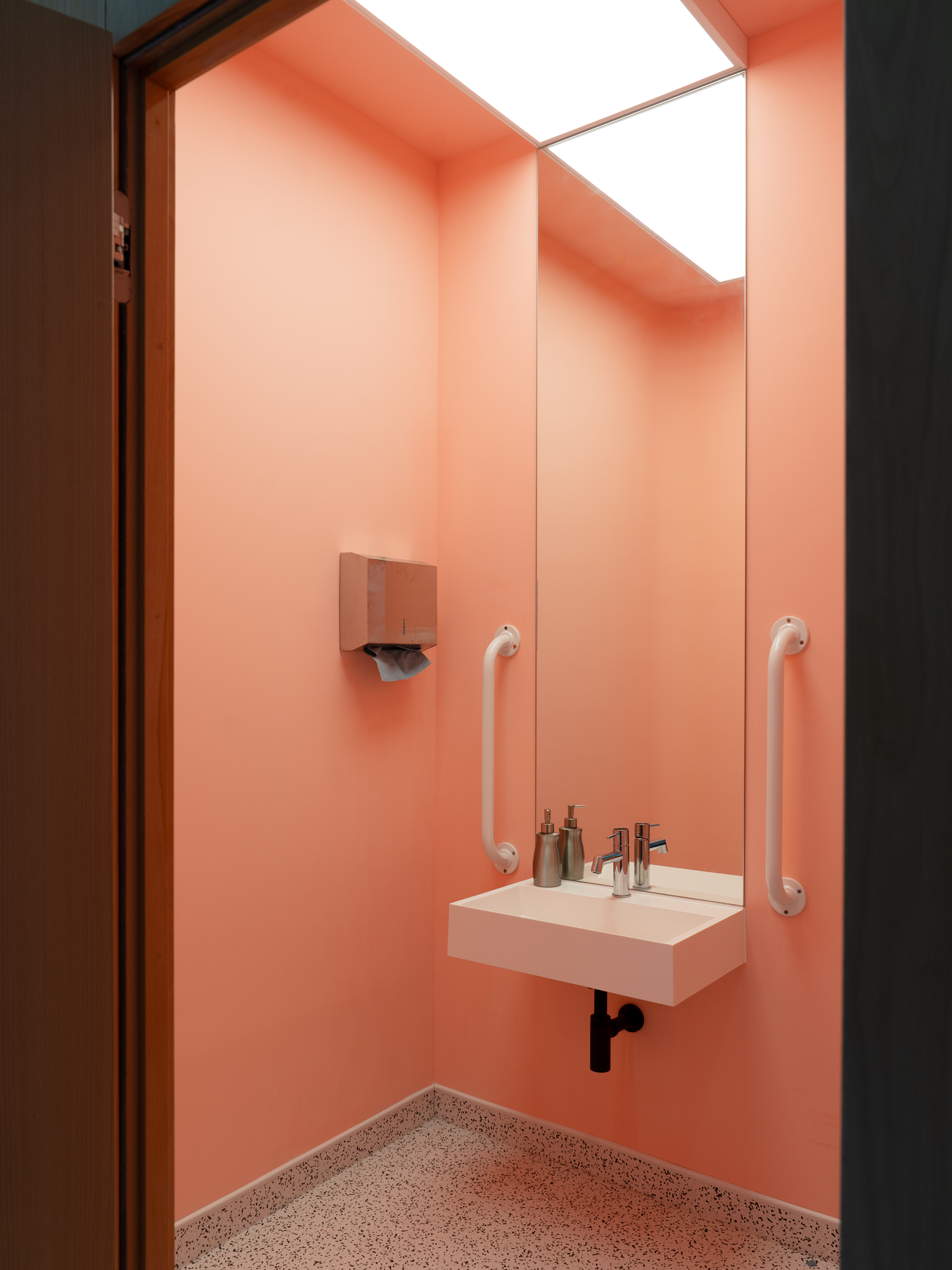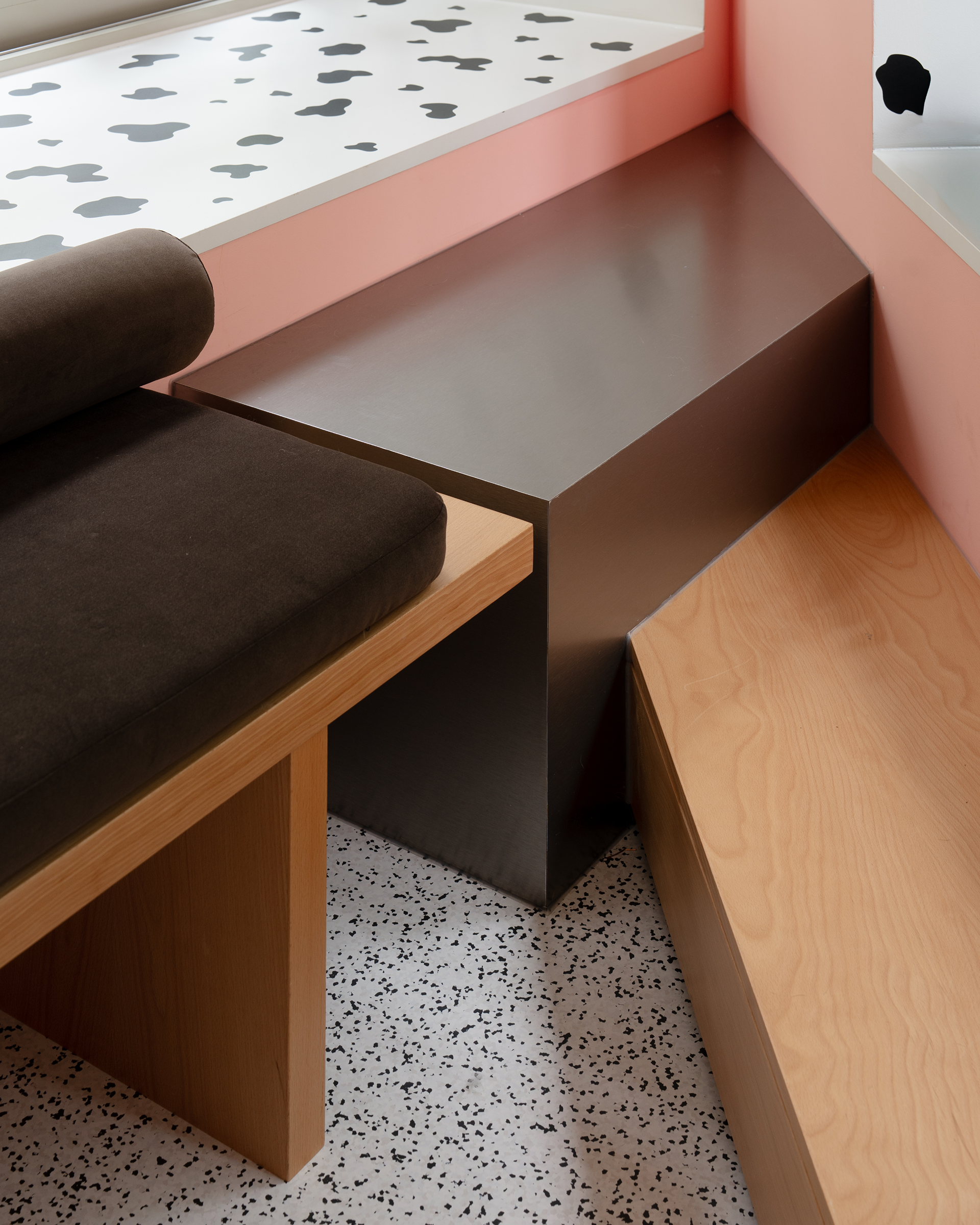The materials were selected for both durability and comfort: beech veneer panels, painted walls, ceramic tiles, stainless steel, and light gray quartz vinyl flooring with a terrazzo effect.