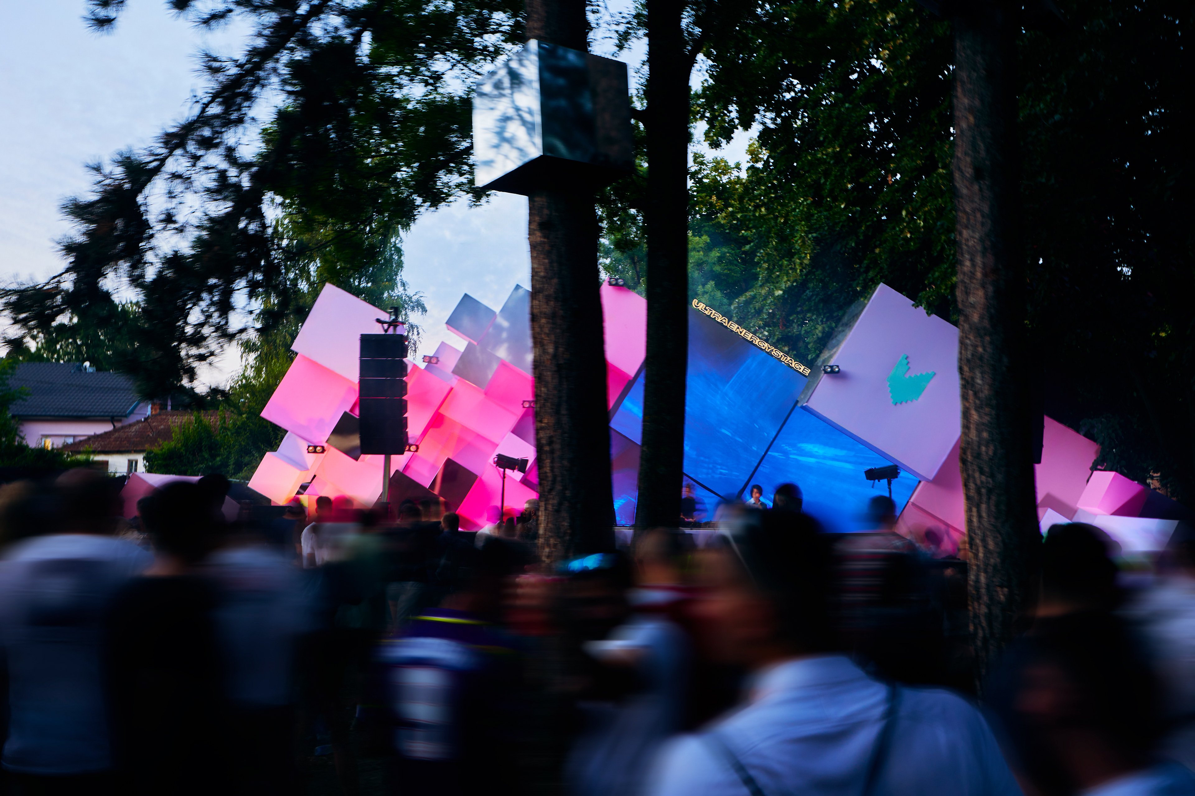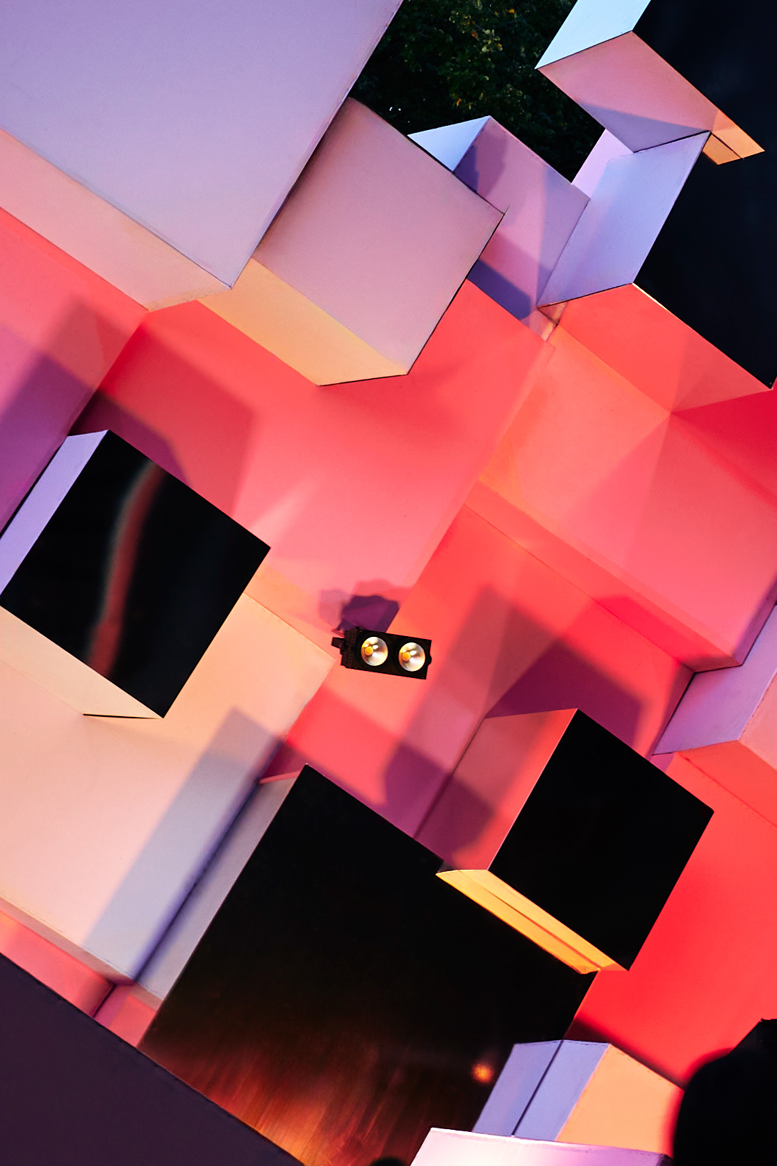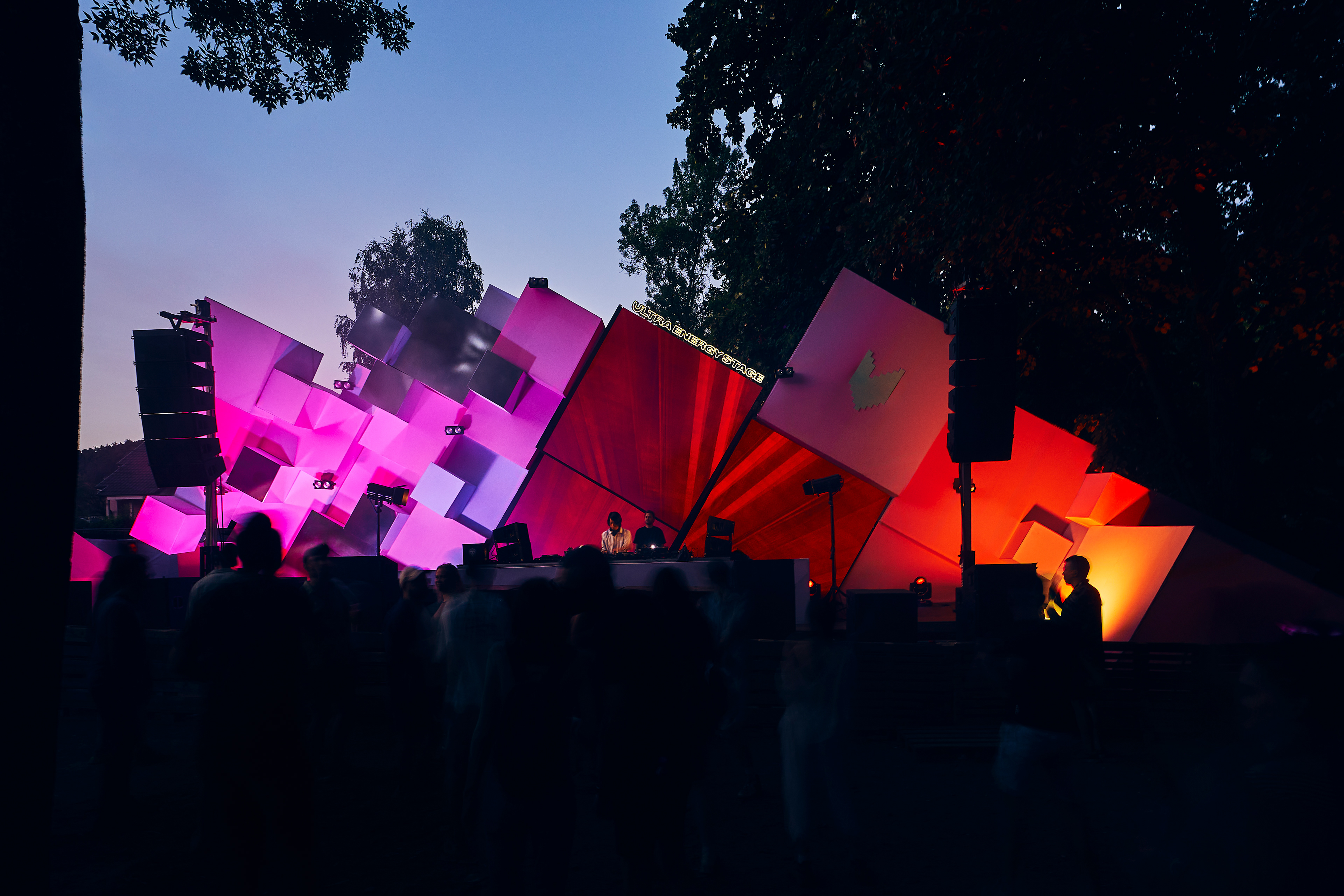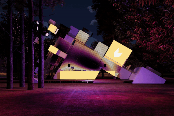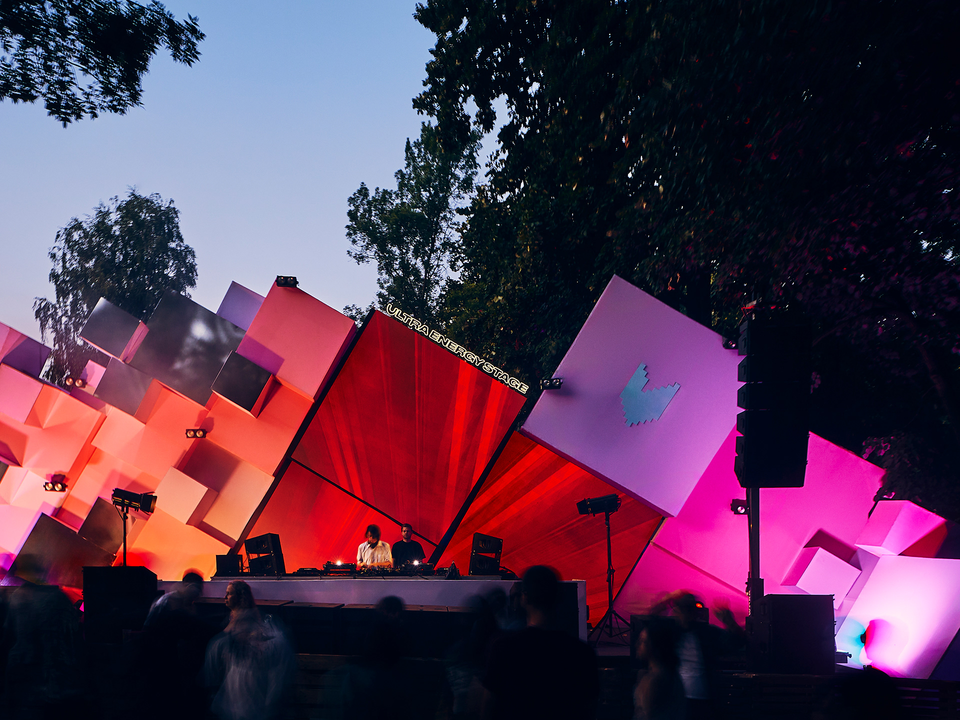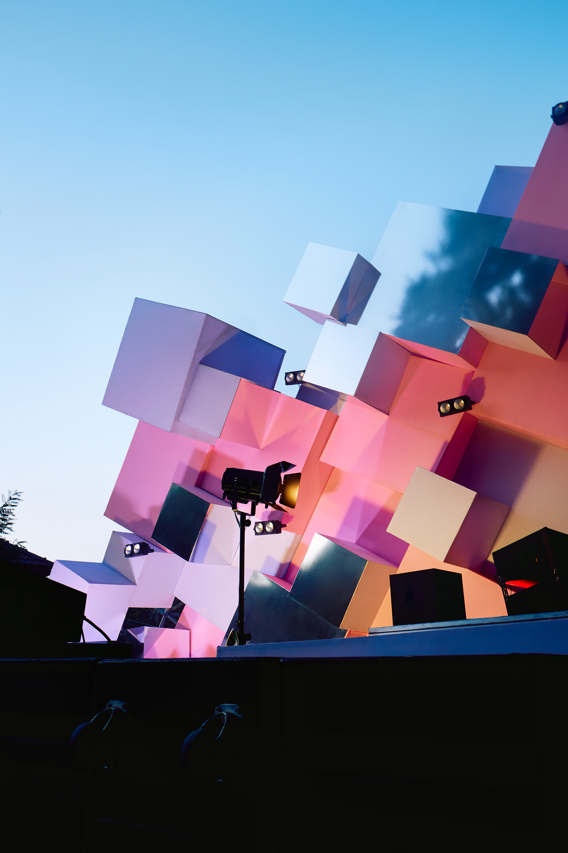Special attention was given to the lighting design: most of the cubes are equipped with LED lighting synchronized to the music beats. Behind the DJs, a media screen in an unconventional shape mirrors the tilted blocks, enhancing the sense of movement. Some surfaces of the stage elements are covered with mirrored panels that reflect the surrounding nature, creating a floating effect and transforming the spatial experience.
