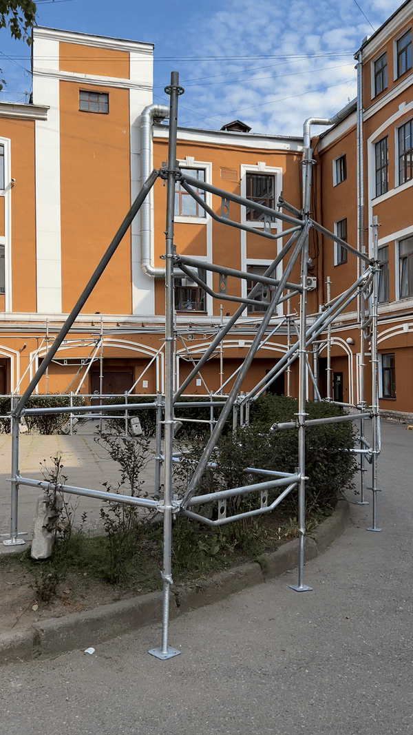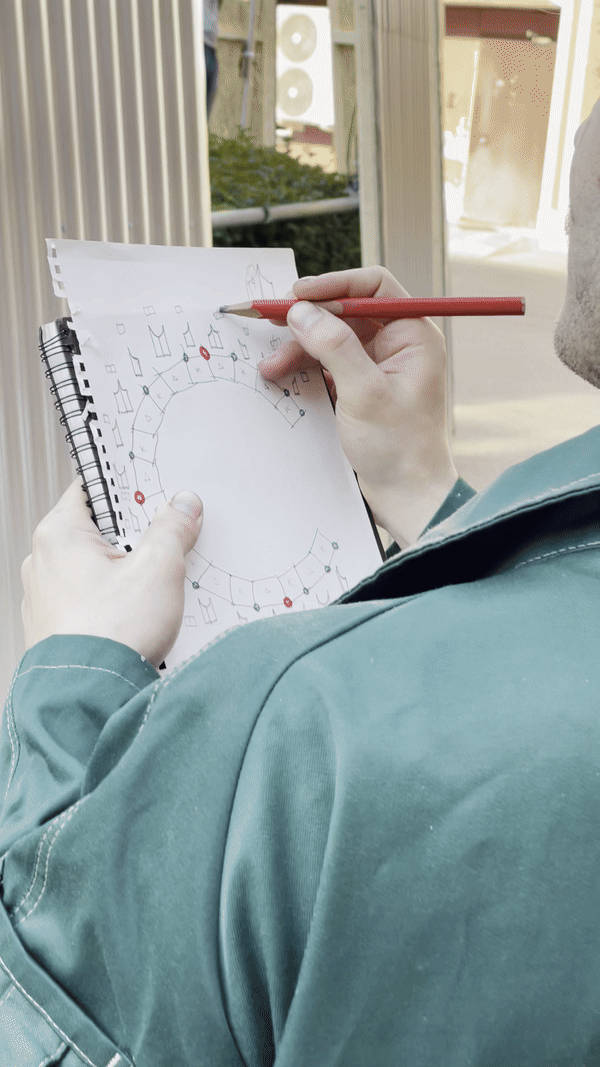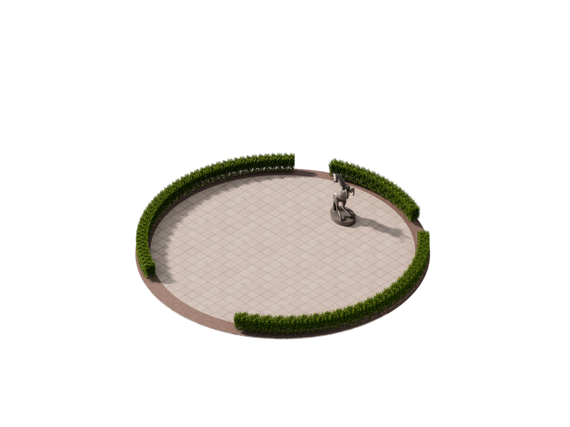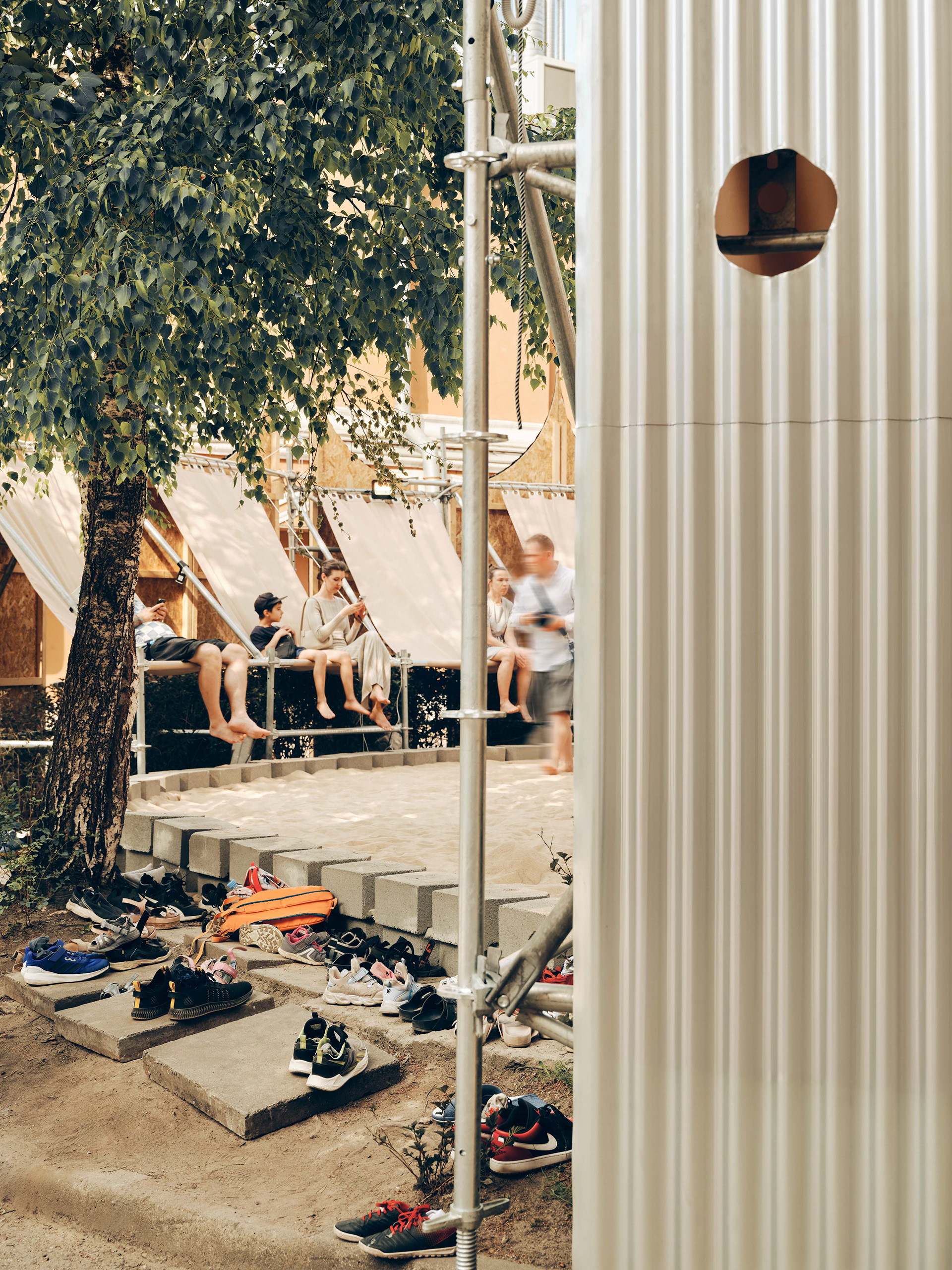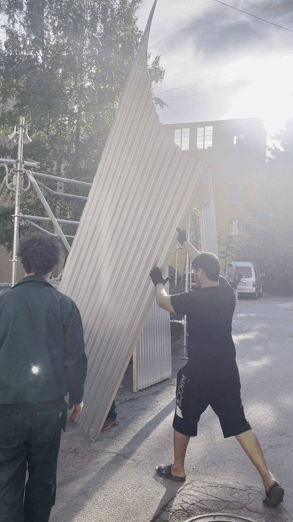 The pavilion’s structure is formed by an outer fence made of corrugated metal sheets attached to a scaffolding frame. On the inside of the frame, tent fabrics are tied, serving as hammock-style seating. Concrete blocks are laid around the inner perimeter, forming the 10-meter-wide sandbox, into which we placed several tons of fine-grained sand. In the center of the site, there was already a metal horse sculpture, which we chose not to remove. Instead, we carefully covered it with waterproof metallic fabric.