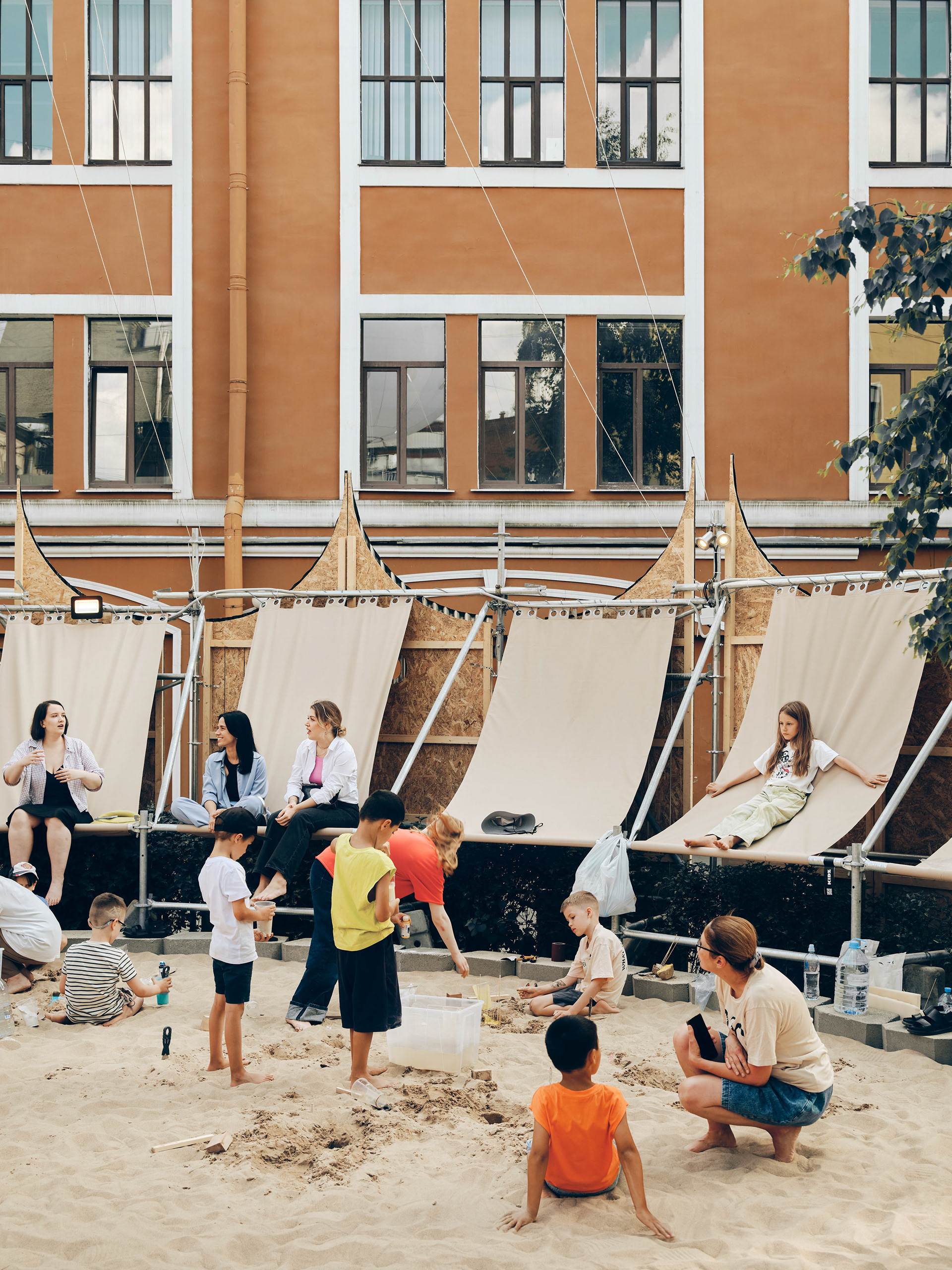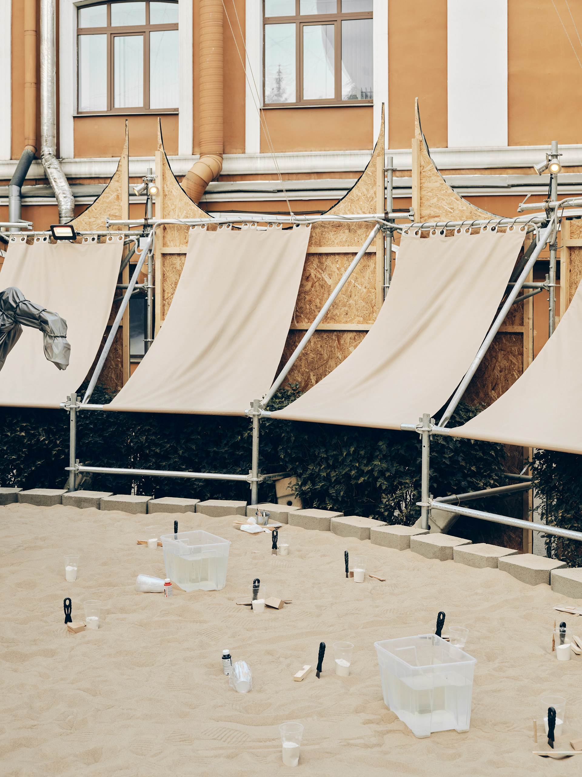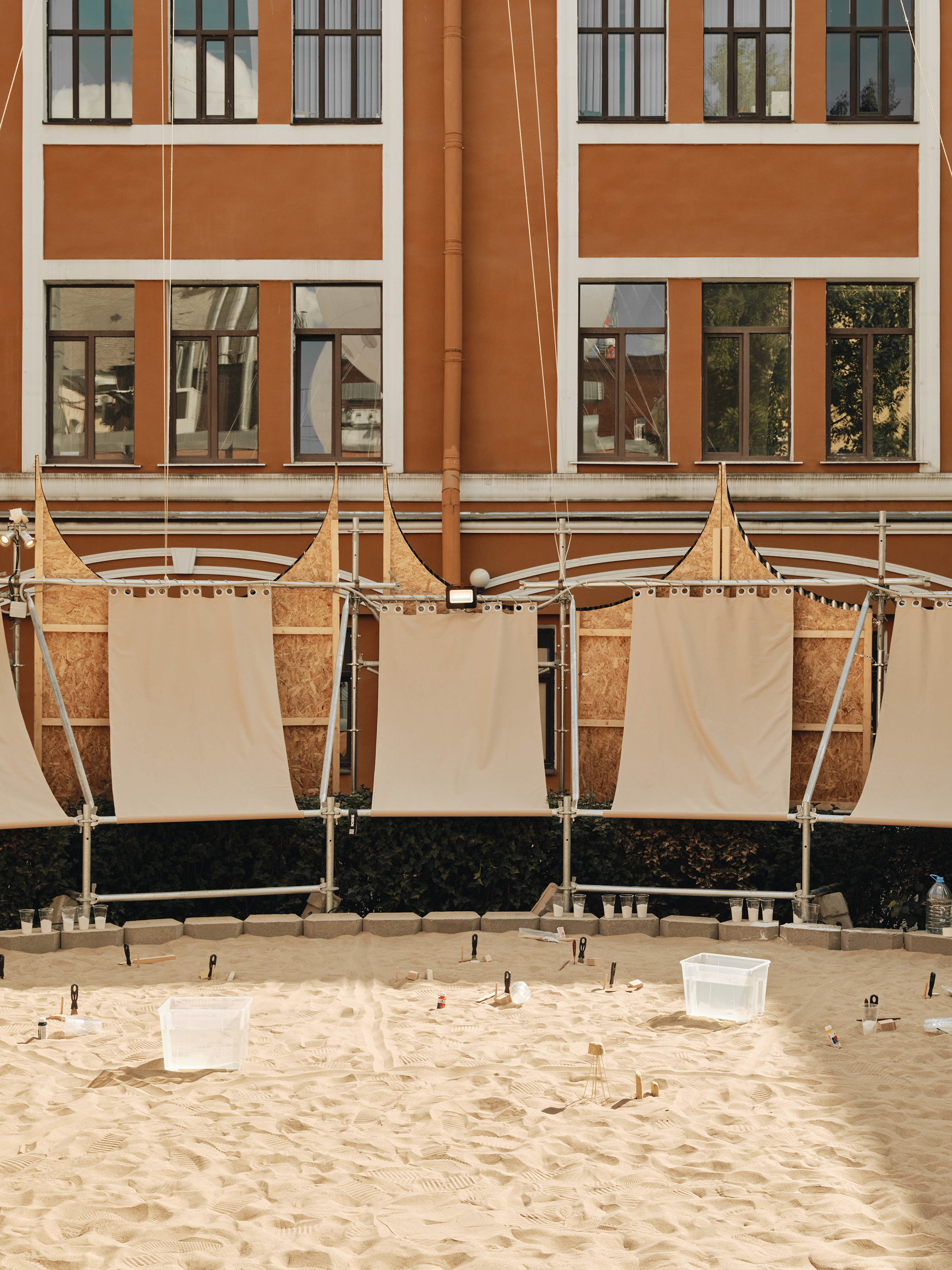 As our interactions with each other and the world around us increasingly digitalize—often happening through computers and smartphone screens—many of us start to miss tactile experiences. That’s why we intentionally made sand the primary material for this pavilion. Sand is very tactile and easily adaptable. This large sandy field in the middle becomes a kind of canvas for drawing or a pleasant natural construction material, familiar to us from childhood and without limits for our imagination.
