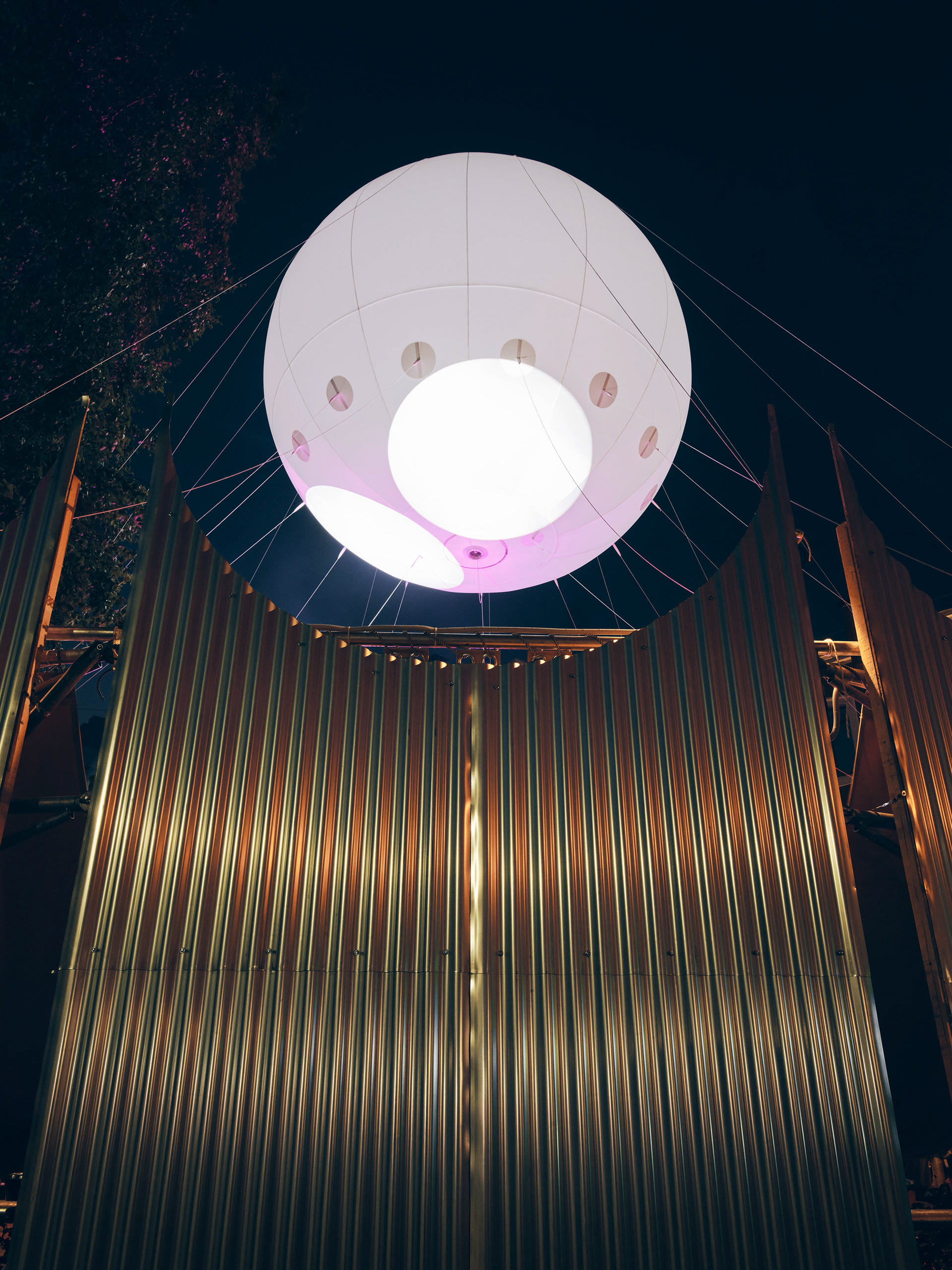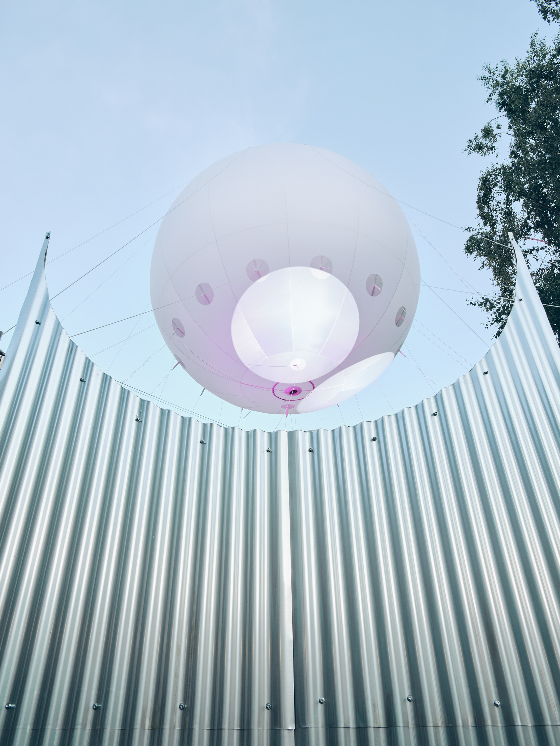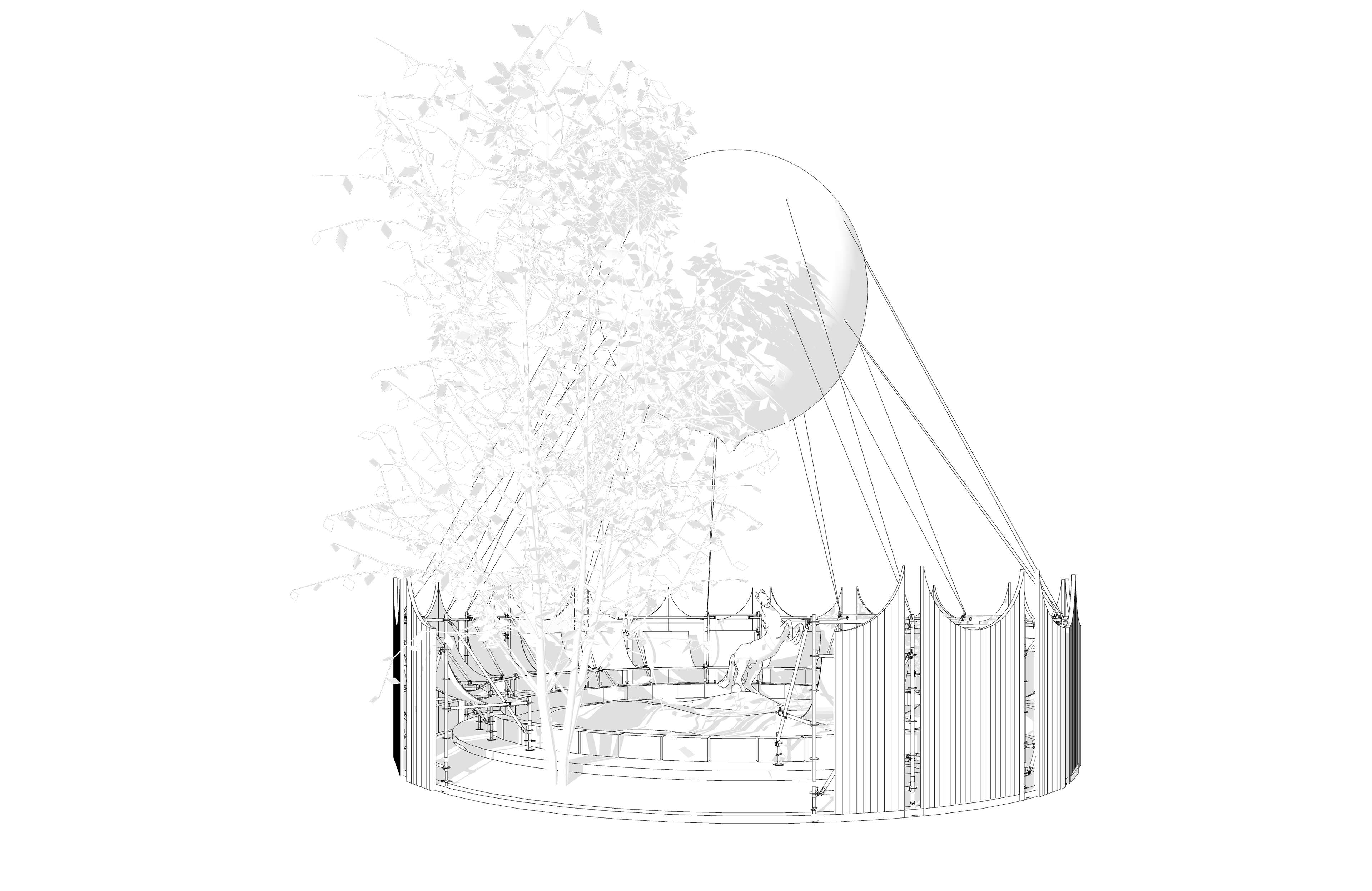 The final accent is a large white balloon, 6 meters in diameter, floating above the site. Filled with helium and tethered to the pavilion’s frame, it creates a feeling of lightness. When people sit in the hammocks and look at the balloon swaying gently in the breeze, we hope they can momentarily escape, unwind, and relax.