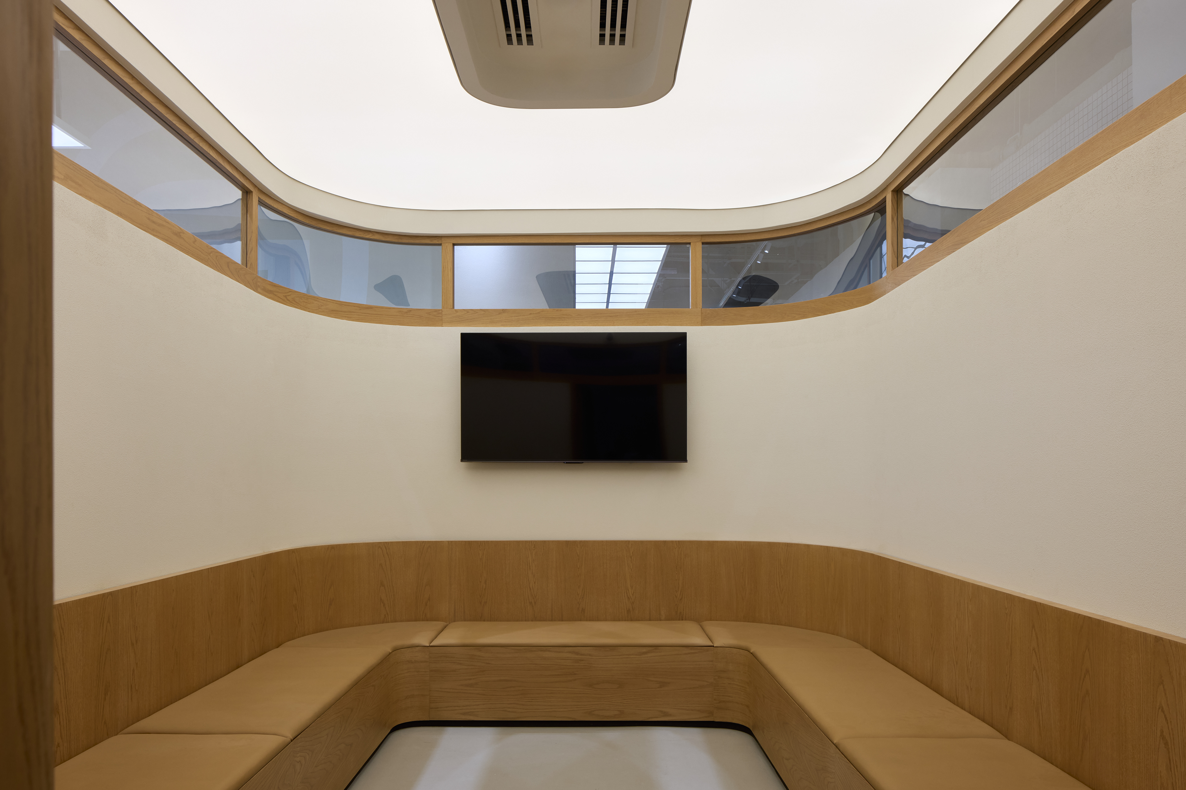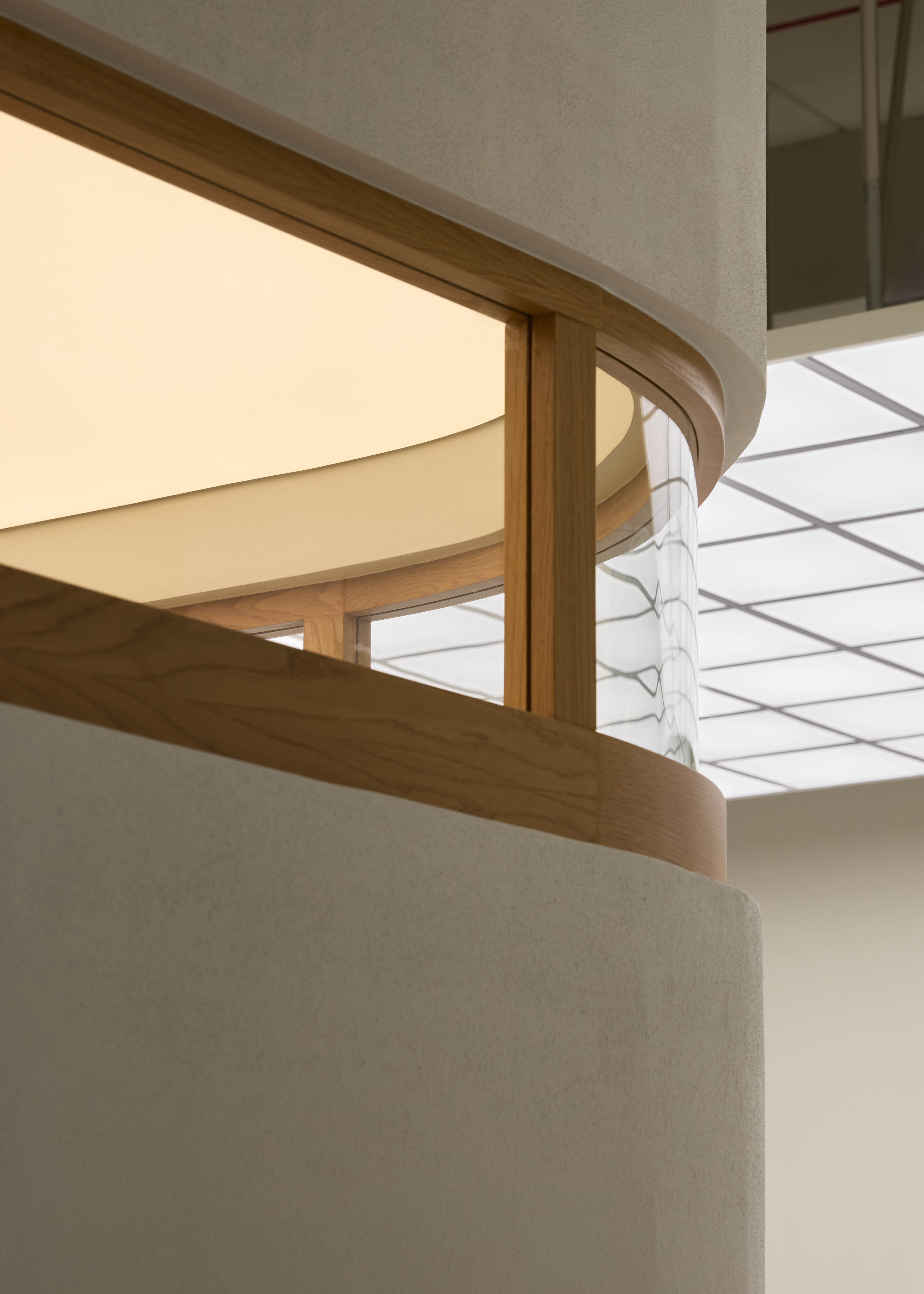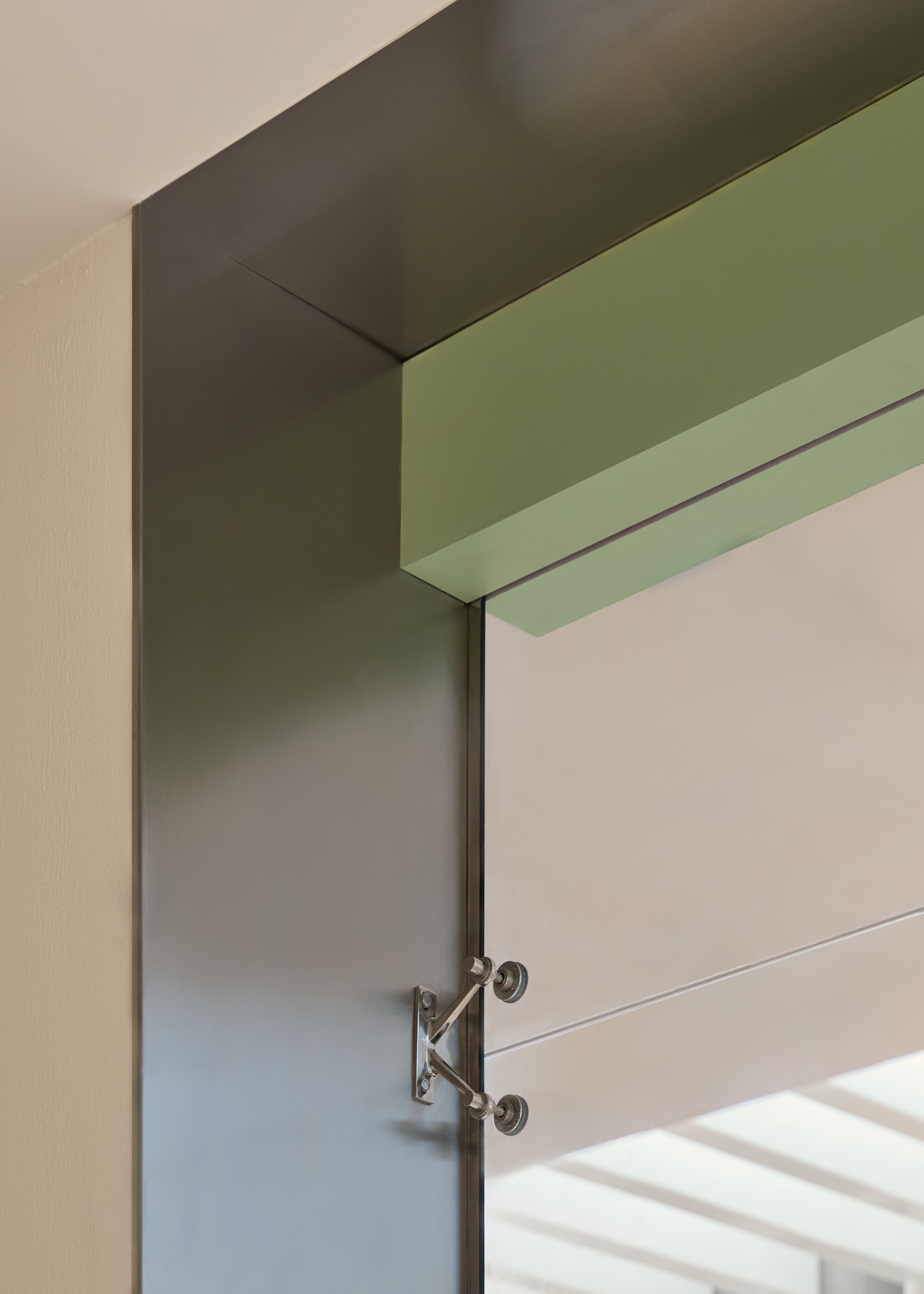 Spider glazing and metal fastenings, combined with stainless steel cladding, add functional rigor and balance the warm tones of the interior palette.