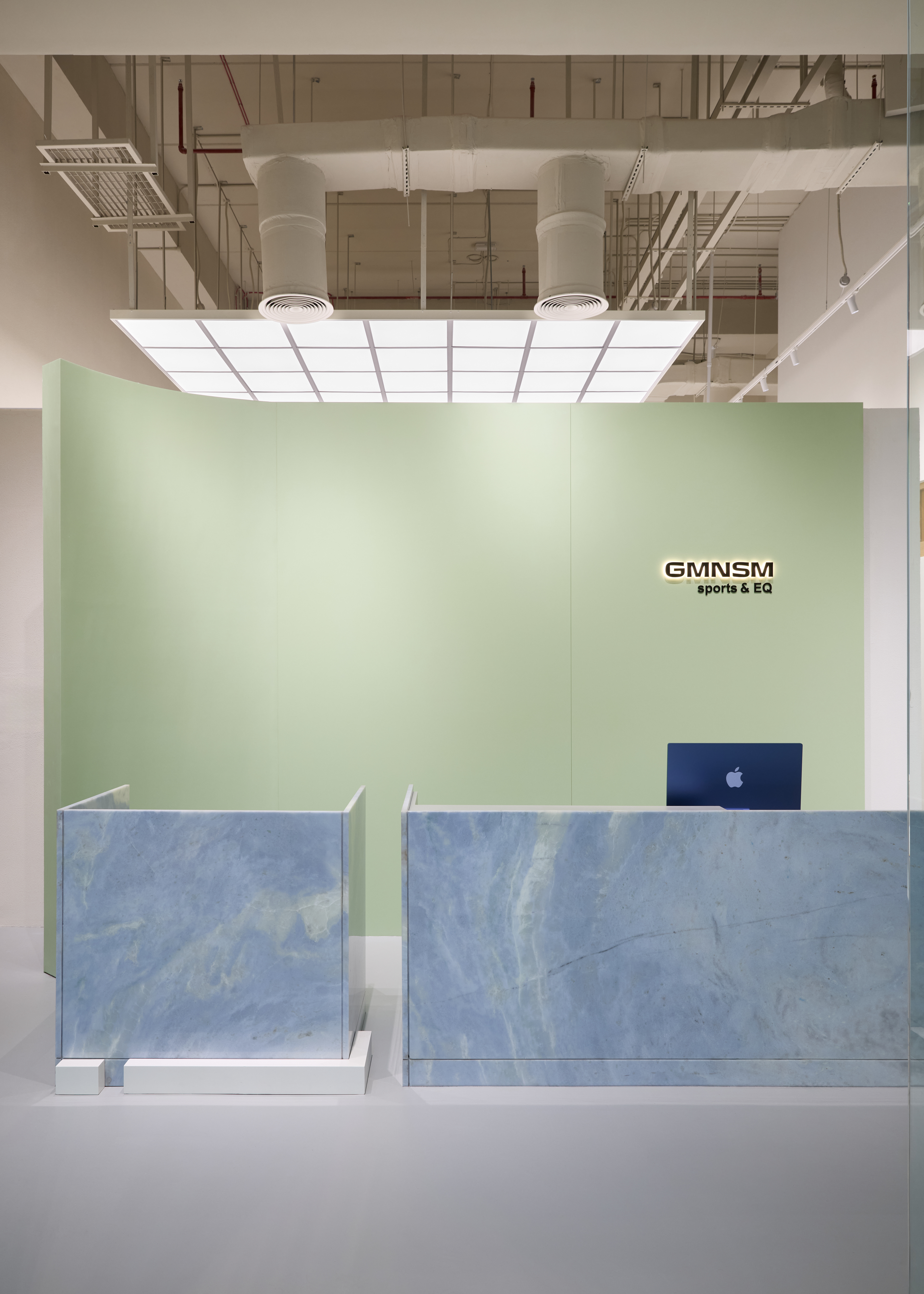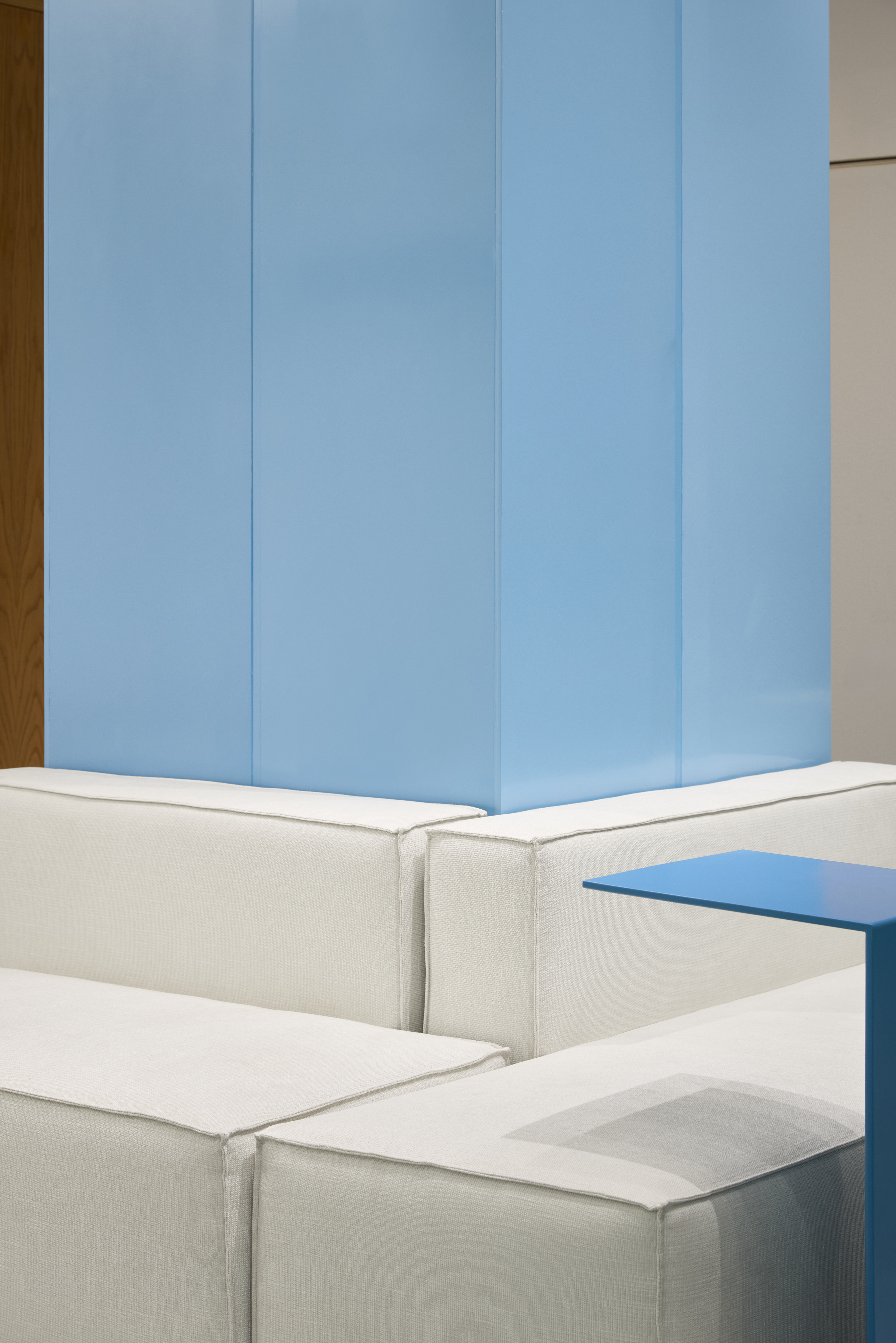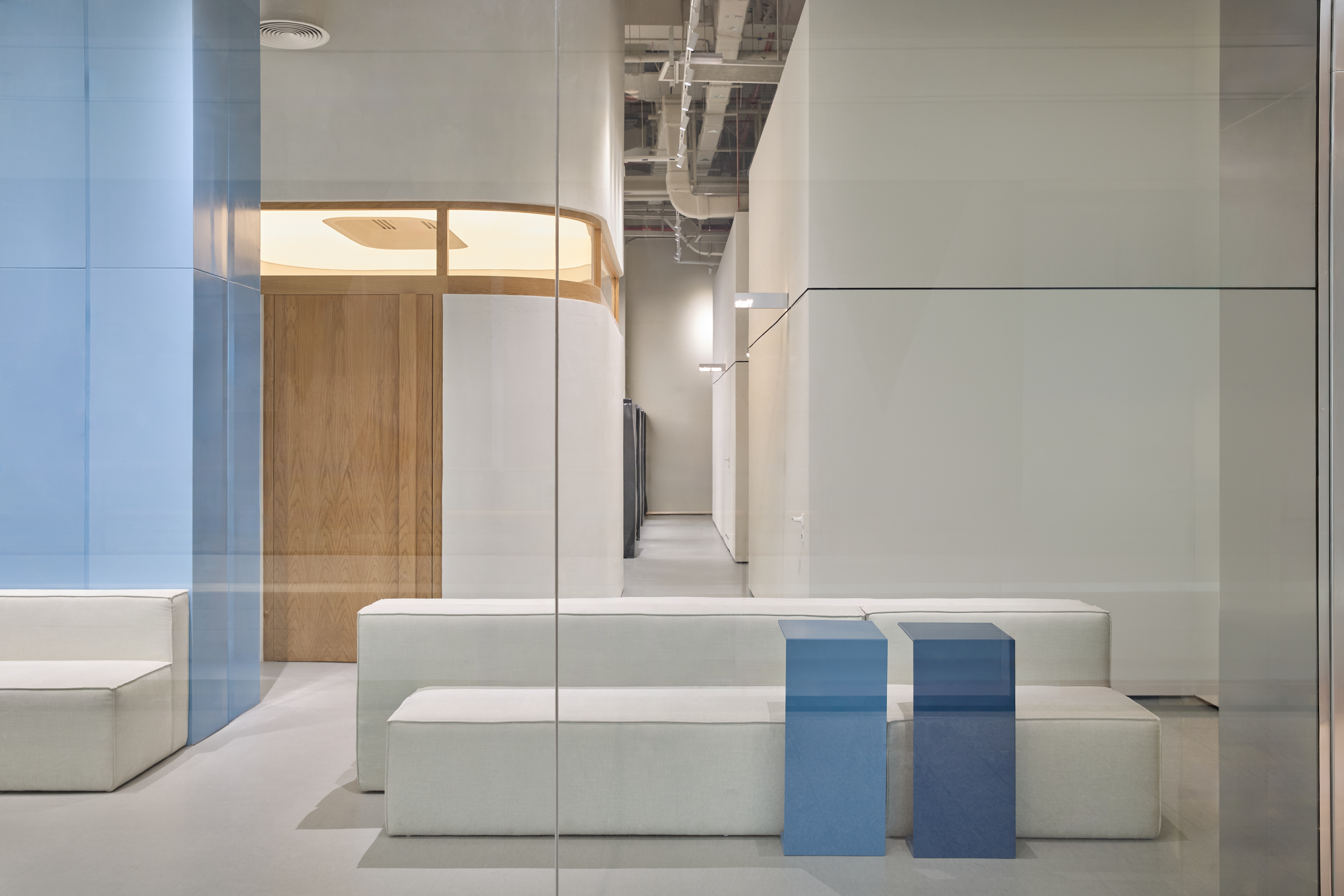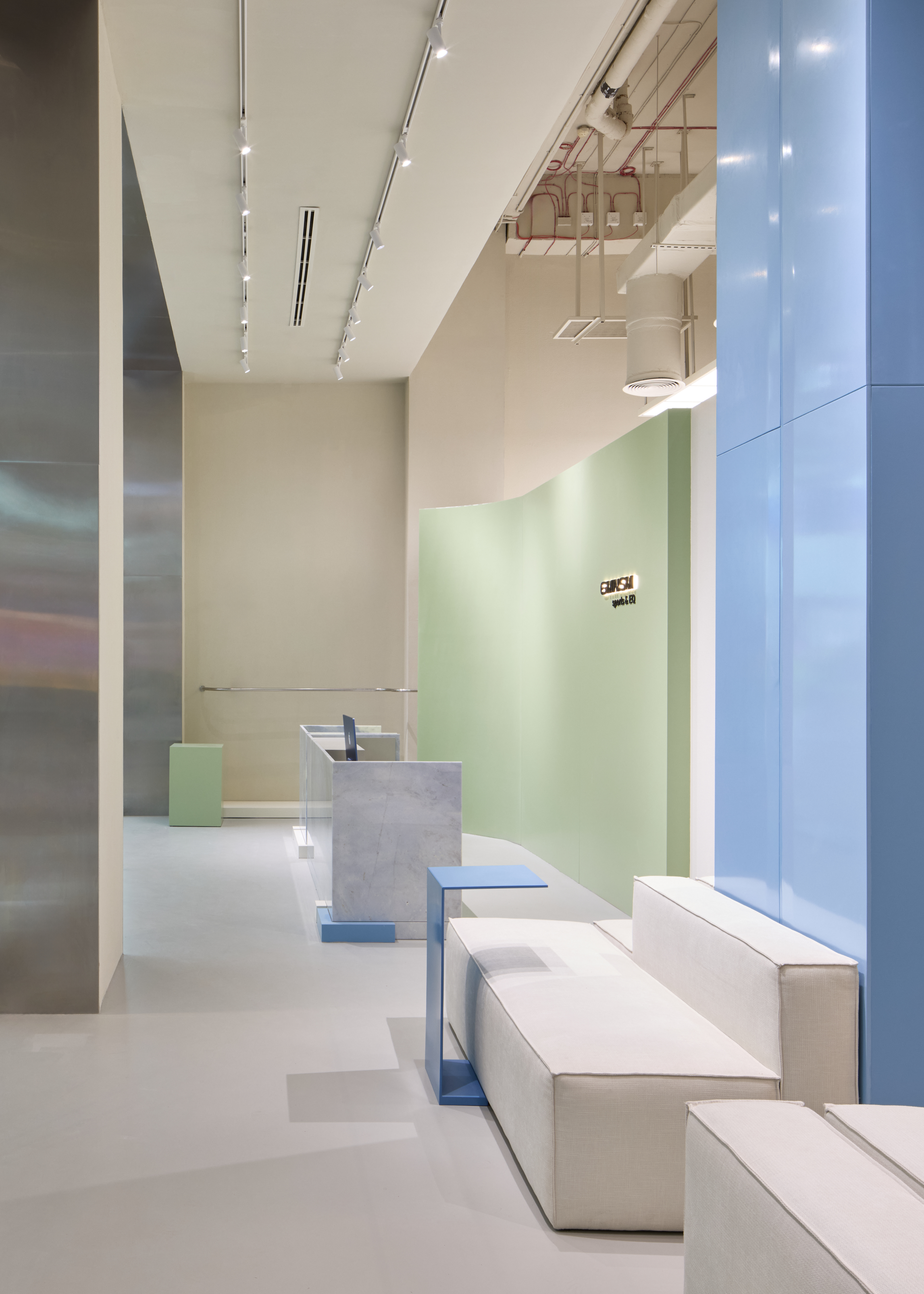 Special attention is given to the façade: green orthogonal elements extend into the interior, merging with the reception area to form a unified composition.