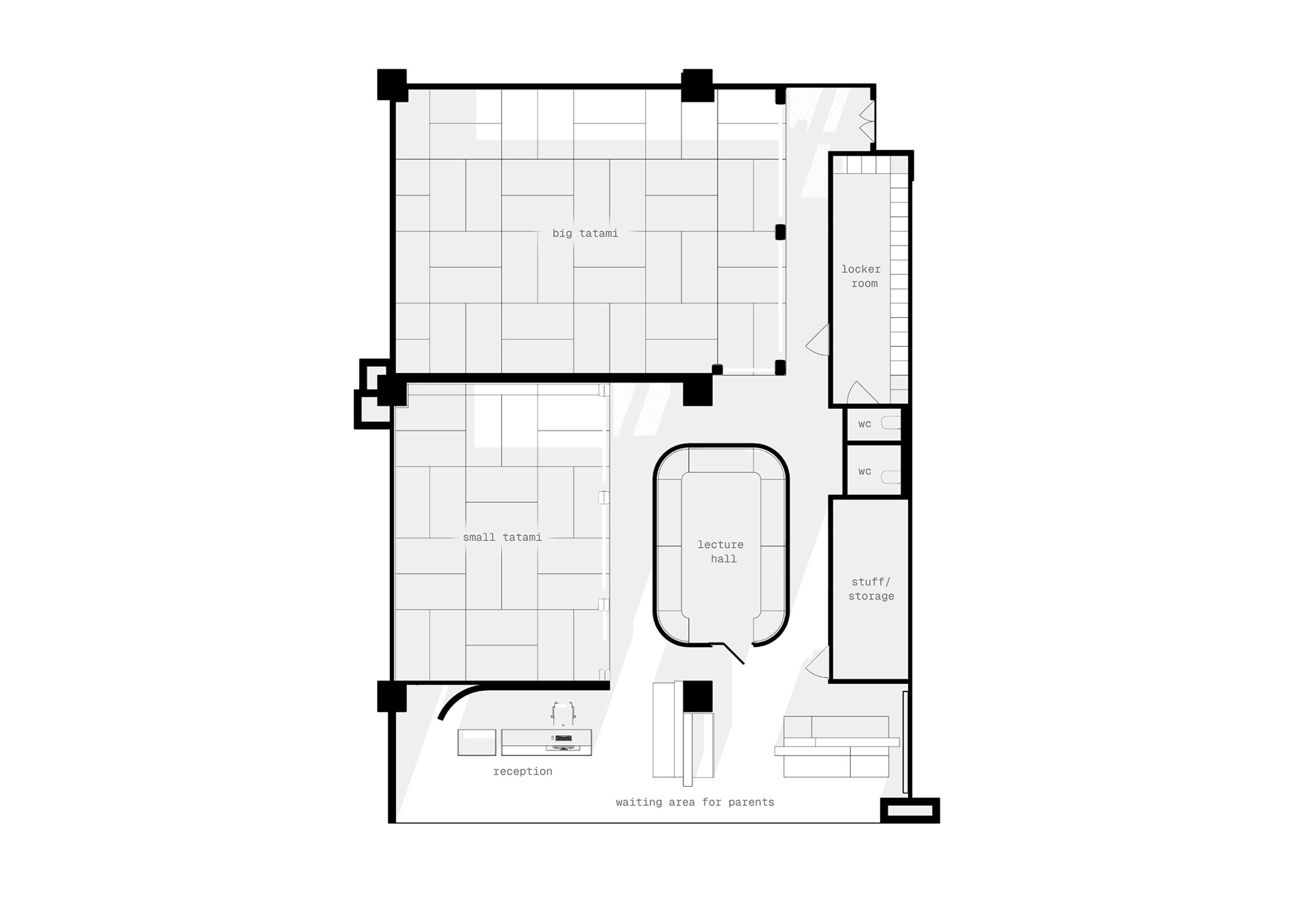 The layout is clearly zoned: two tatami halls, changing rooms, staff areas, and a reception with a waiting zone facing the façade. As in other clubs of the network, the lecture area serves as the compositional centerpiece, uniting the space and defining its rhythm.