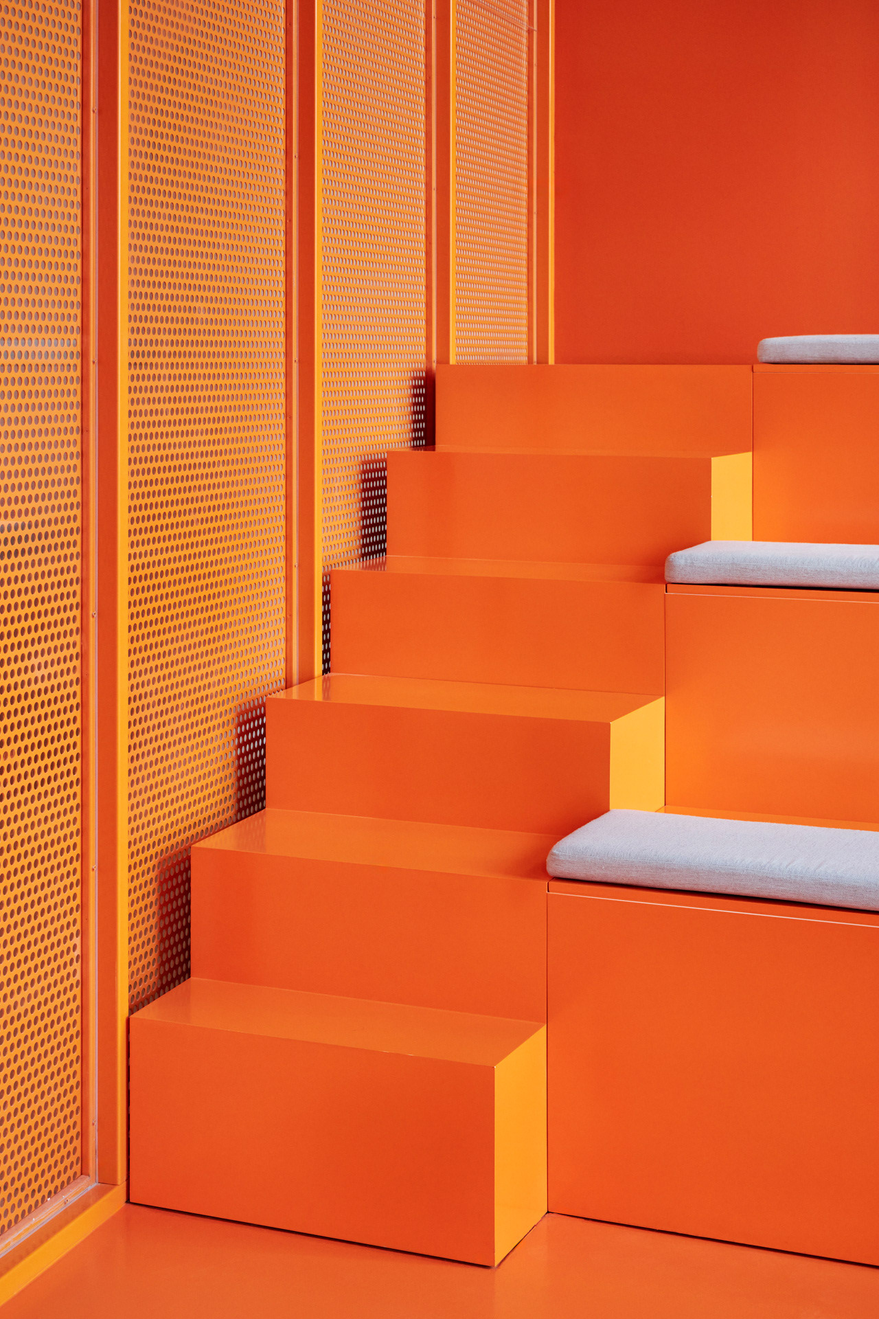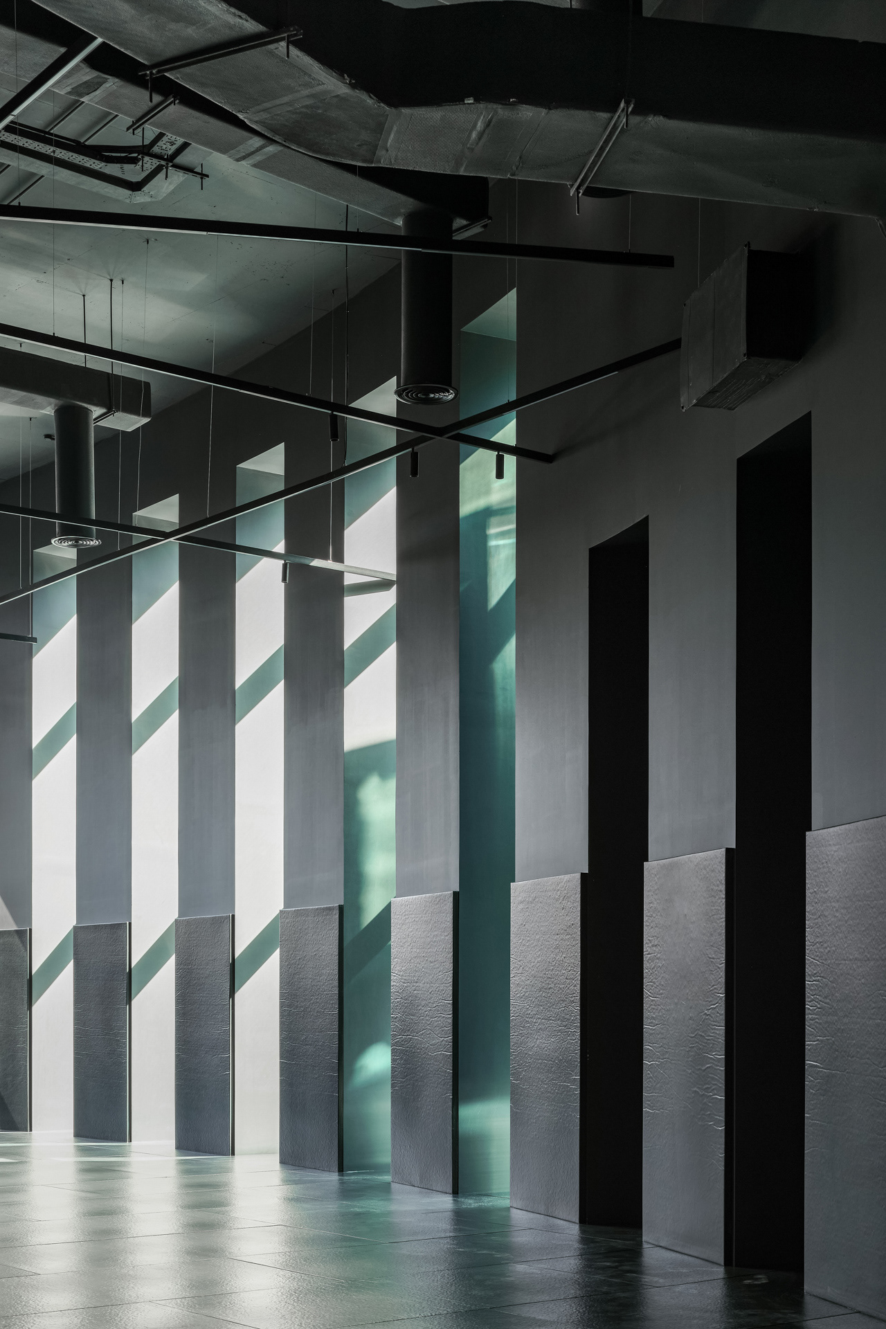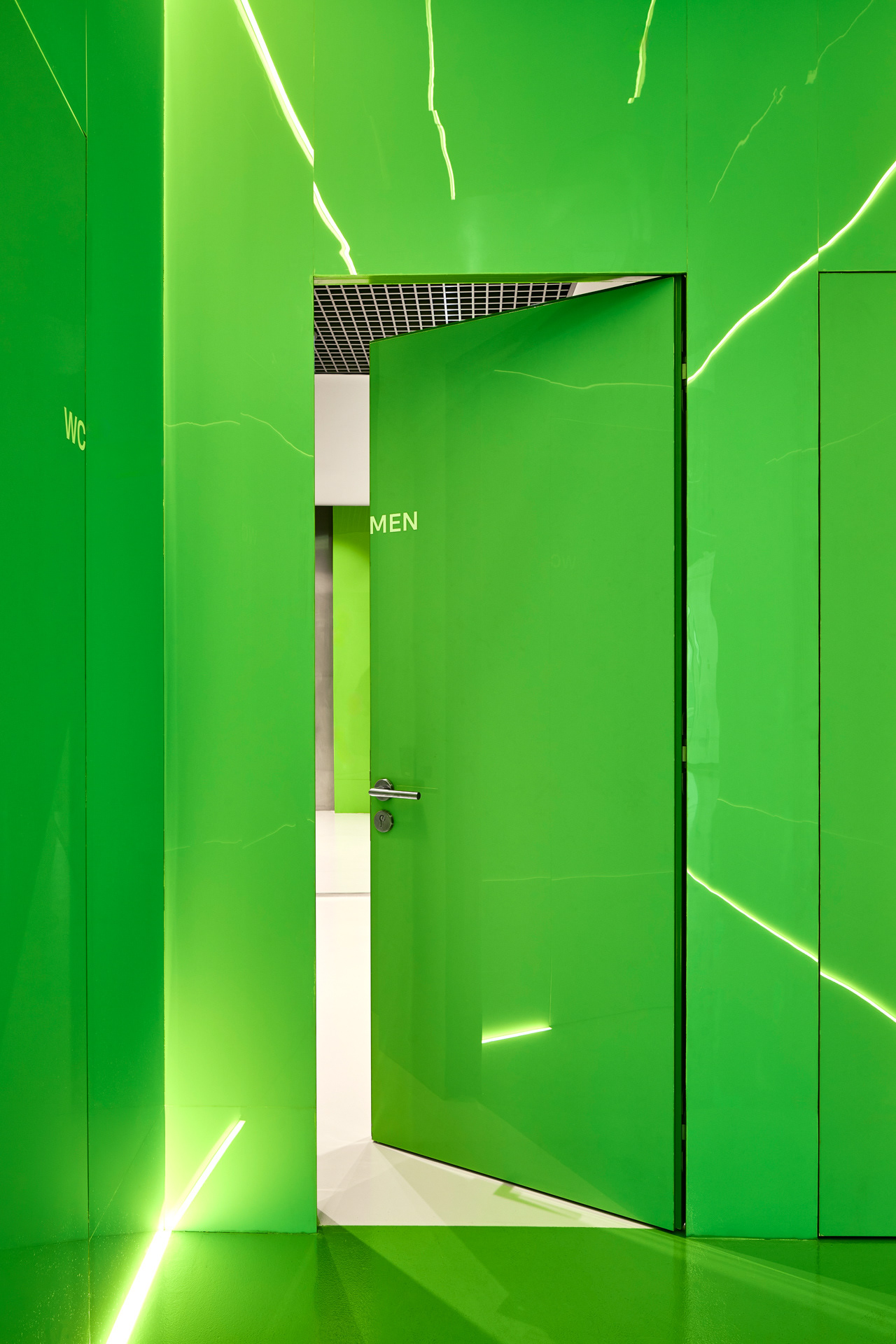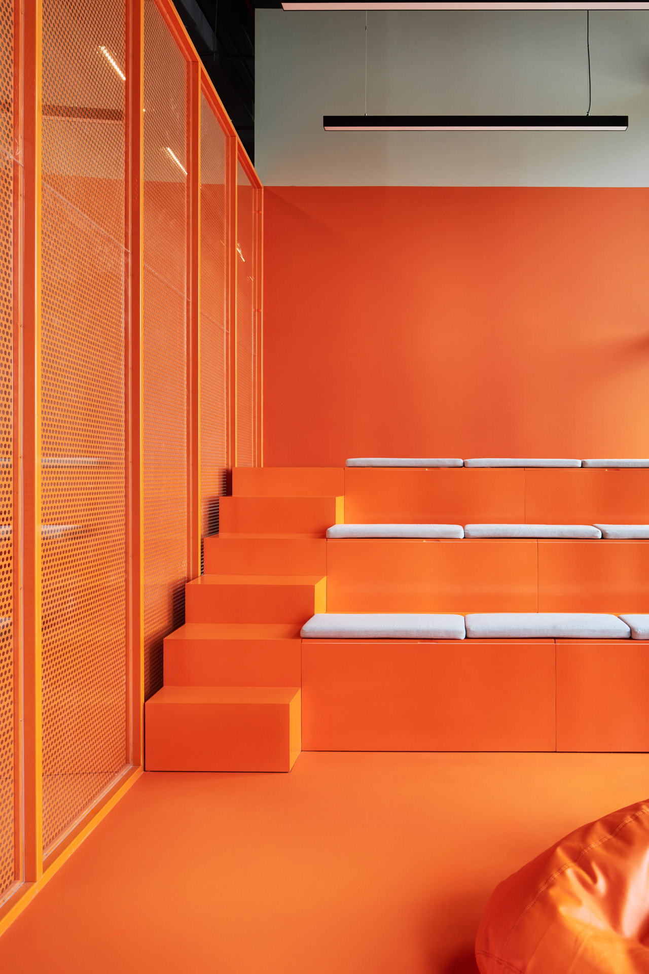 The design features many subtle details inspired by the jujutsu aesthetic. Modular sofas with an uneven layout borrow their morphology from the tatami - an integral part of any wrestling competition. The lighting design adds graphics and detail to the clean space - long, thin lines cut through the air throughout the club area, contrasting with solid blocks of color. Track lights located on these lines in a strictly defined order highlight the main directions of the planning solution with bright light accents.