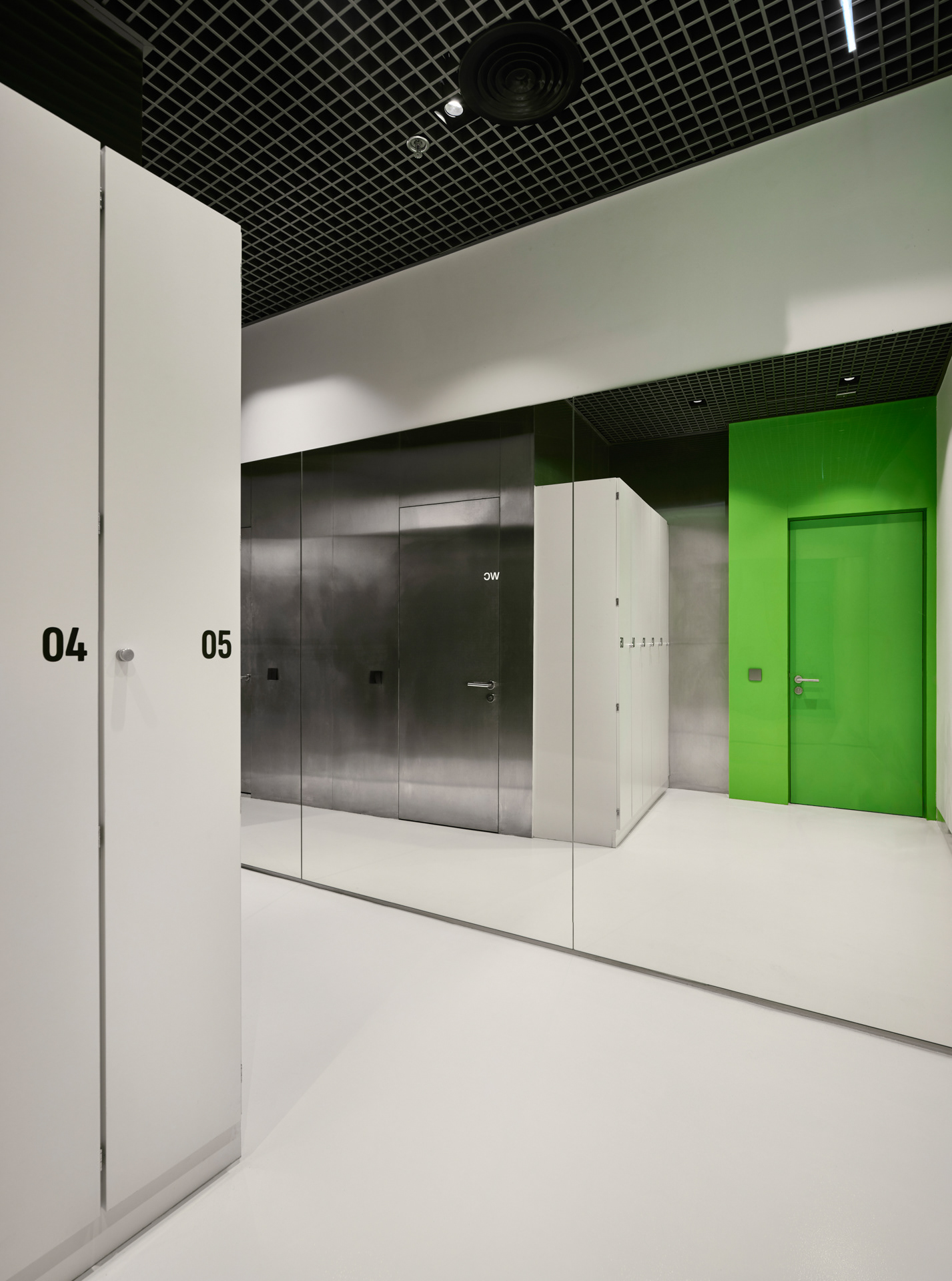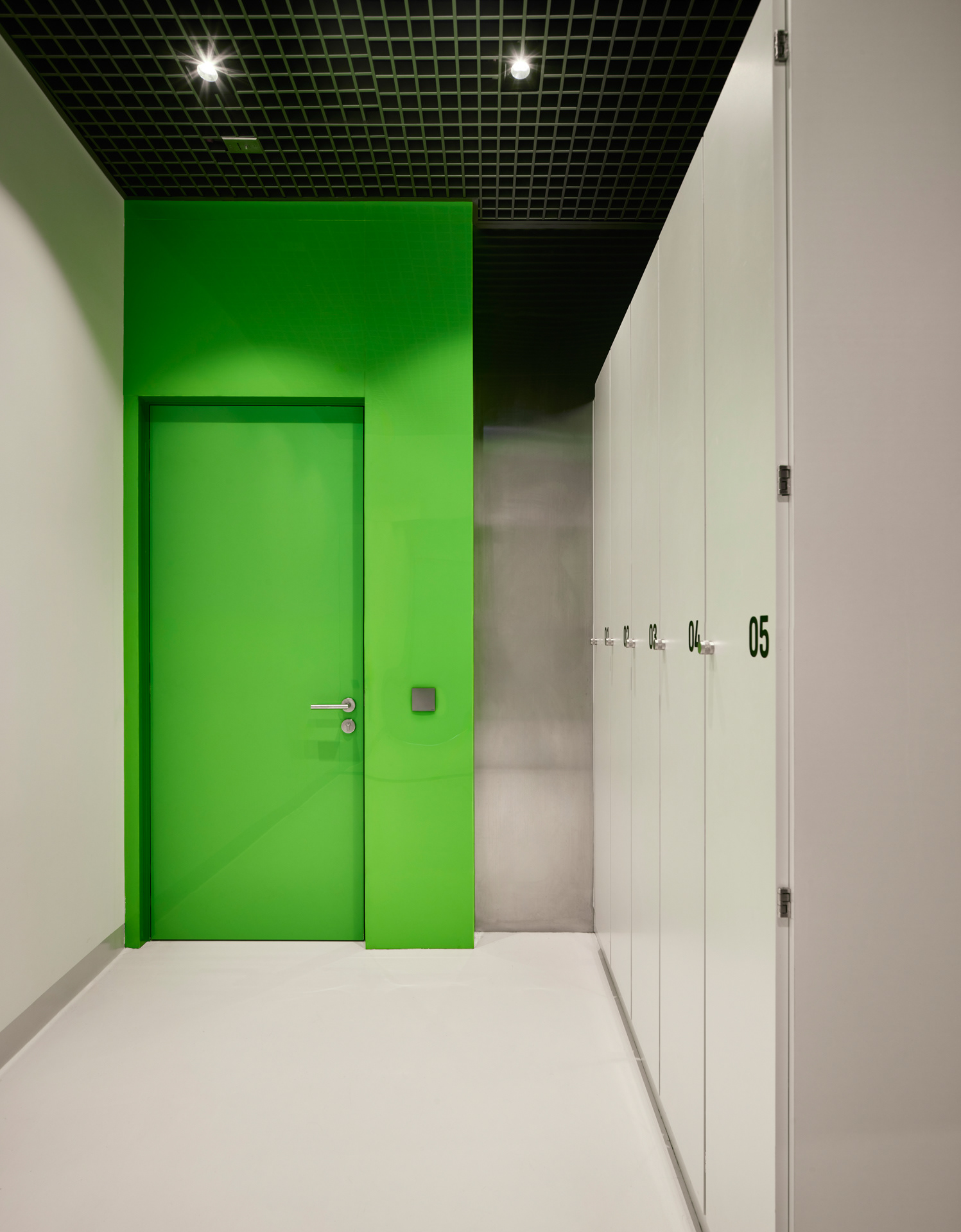The zones themselves are divided into color blocks - different functional zones are assigned their own bright accent colors from the brand book. The locker room area, not adjacent to the main space, is highlighted by a bright entrance portal. Over time, this element became the hallmark of the new club - it is clearly visible from afar, and it attracts people passing by.