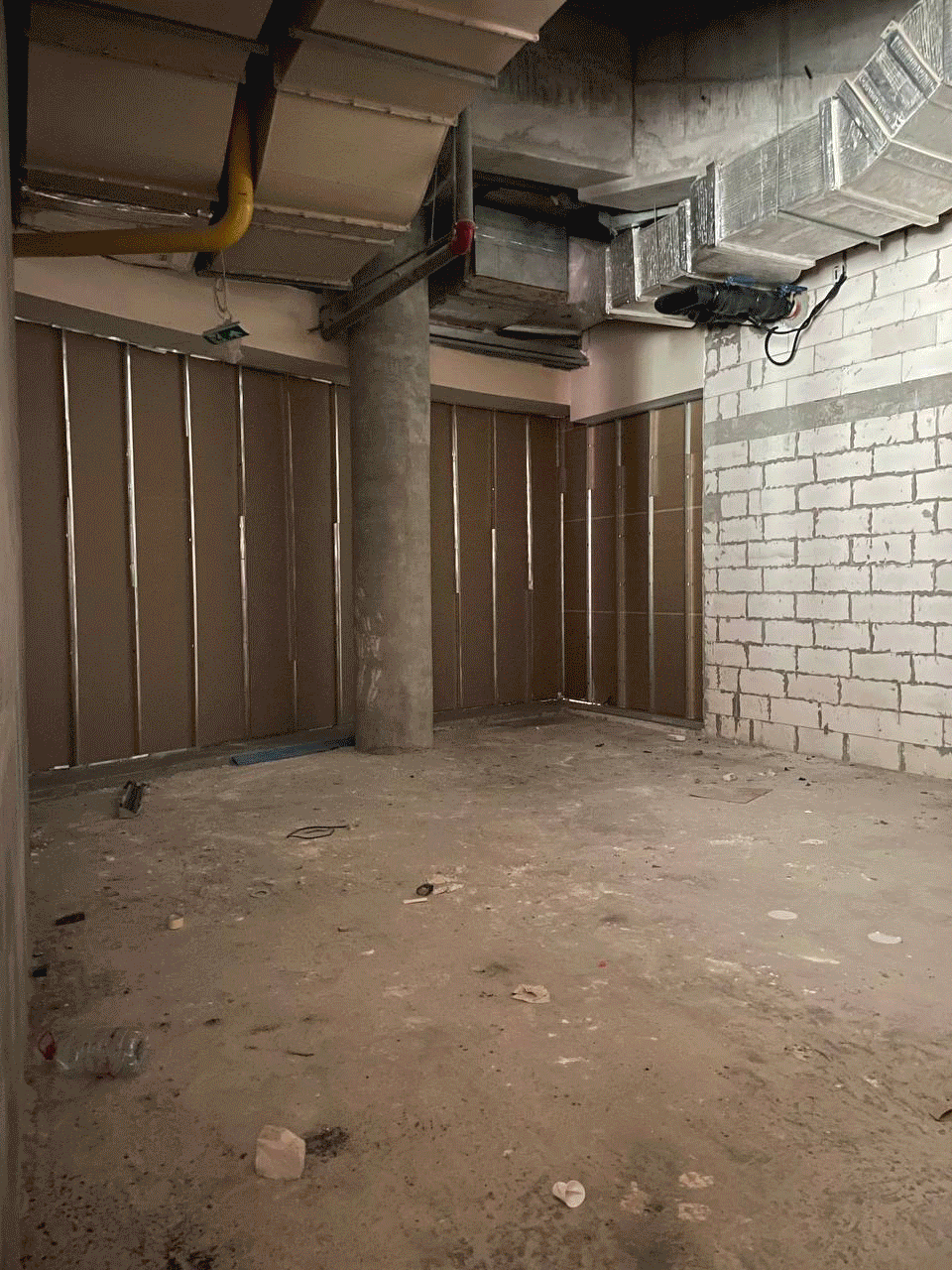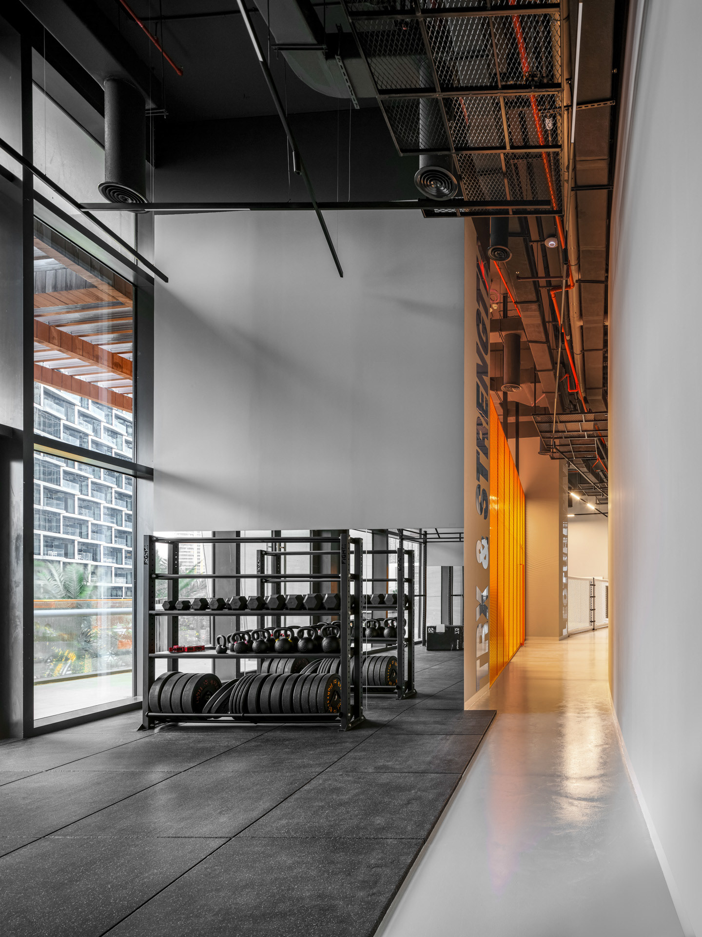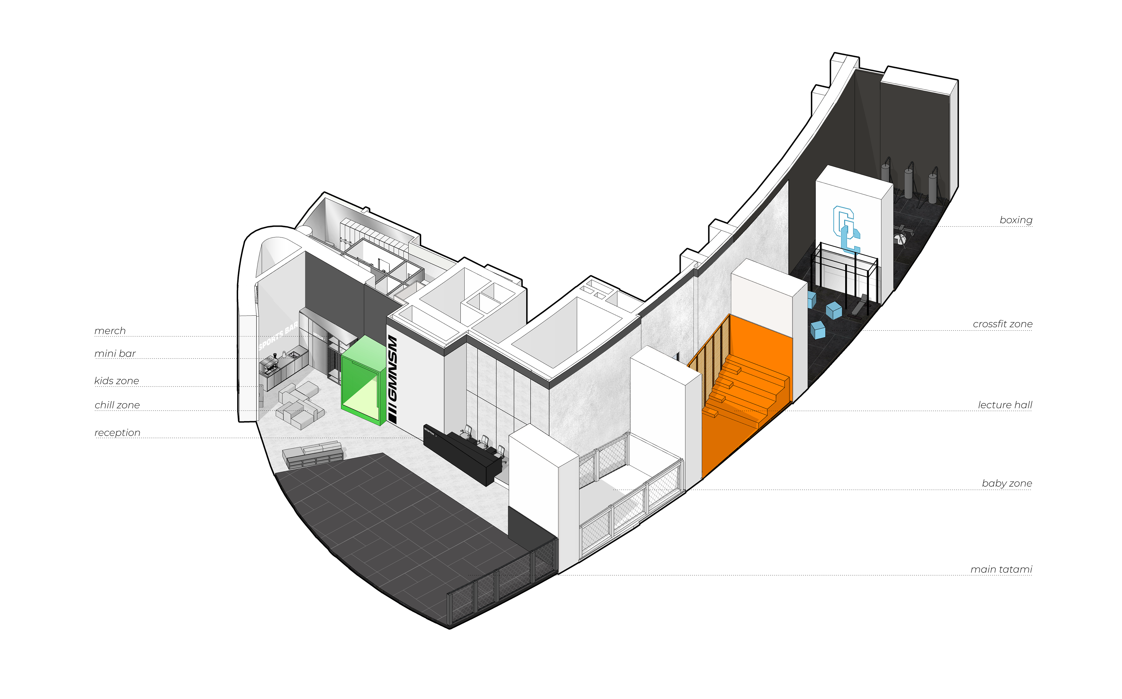 One of the primary tasks when designing a new club in Dubai was the correct organization of zoning in a room with a complex configuration. The nonlinear geometry of the original space set the main direction for the planning solution. The boundaries of functional zones (lecture hall, area for children, crossfit), chaotically multidirectional, reinforce the overall asymmetry of the room.
