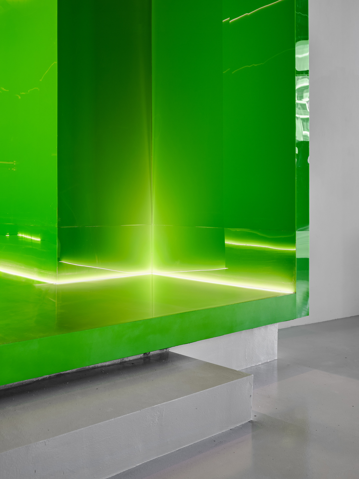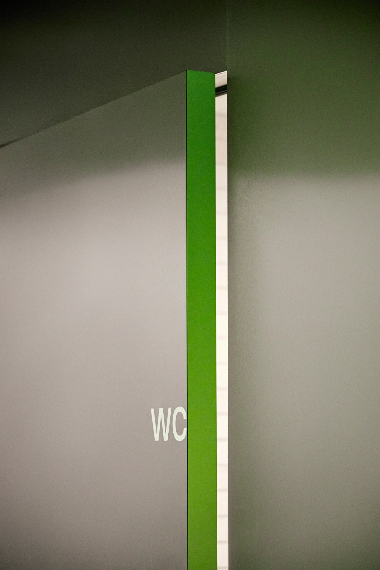 Thanks to the design and placement of the reception desk, it was possible to quietly raise the floor for all the necessary communications - the counter, lined with black porcelain stoneware, consisting of two blocks of different sizes, hides a high podium in which all the engineering is hidden.