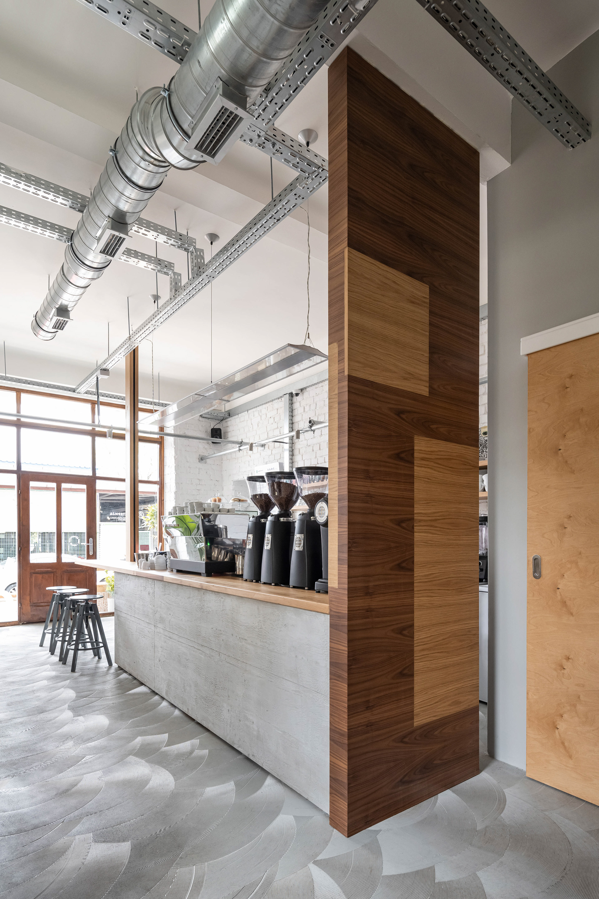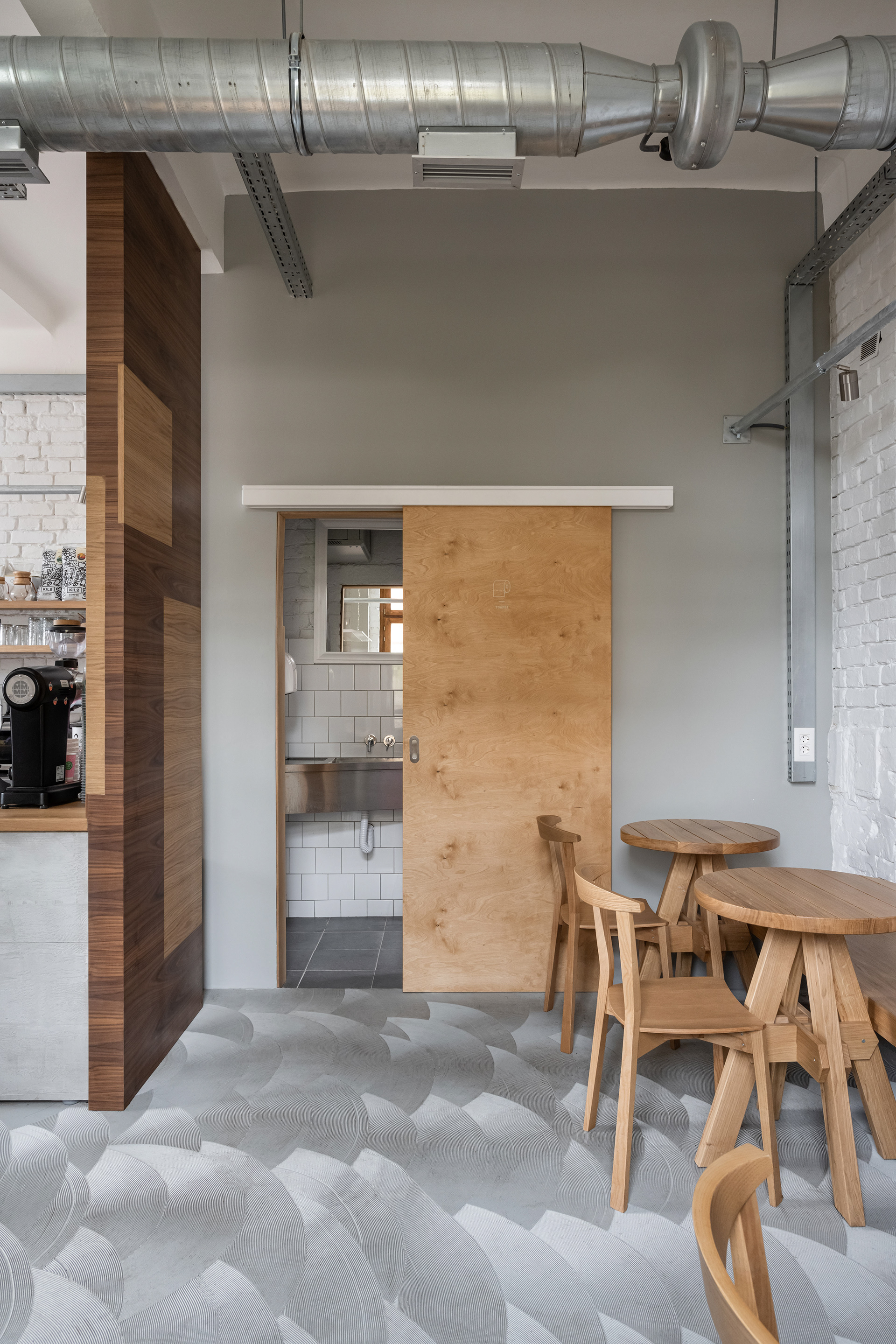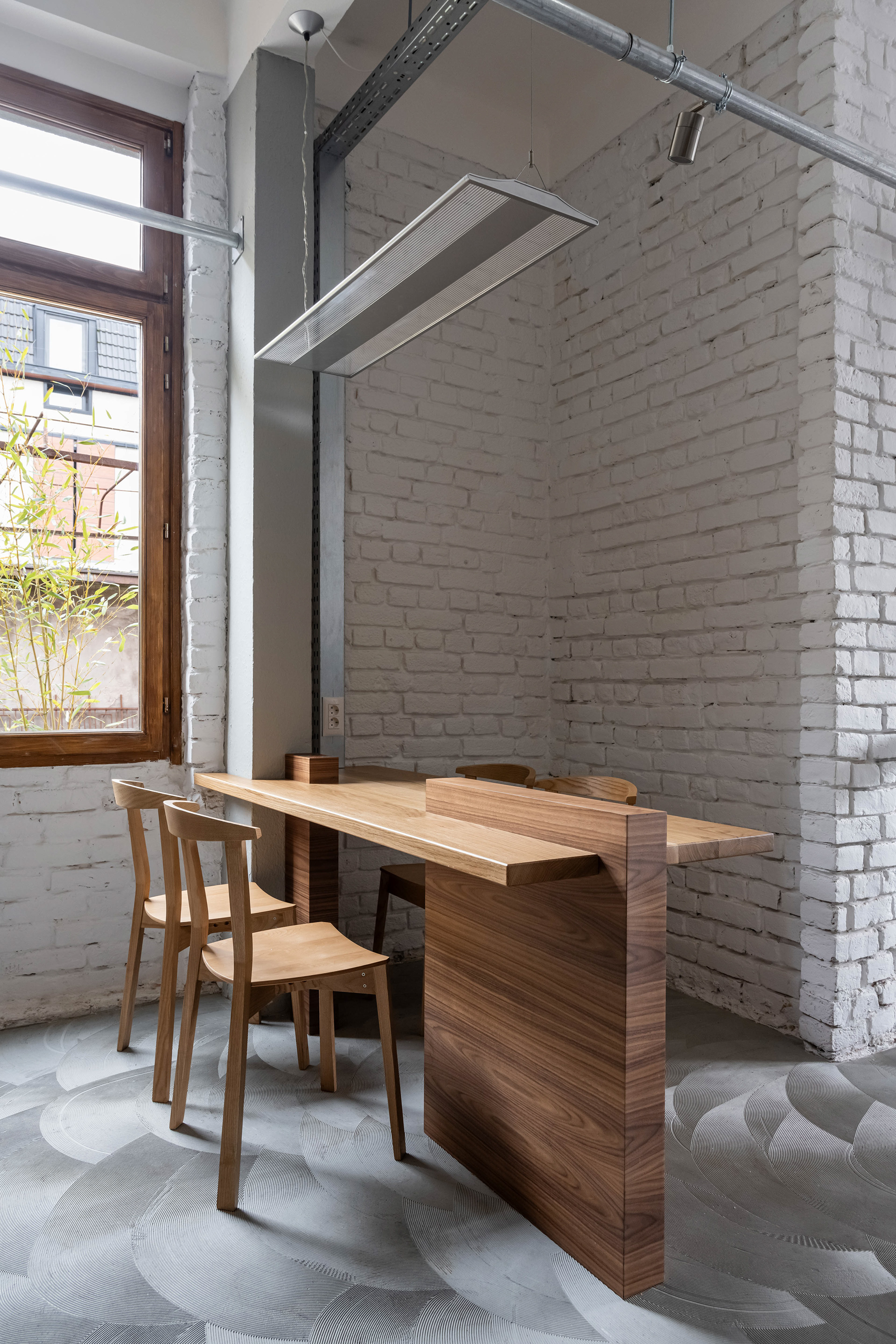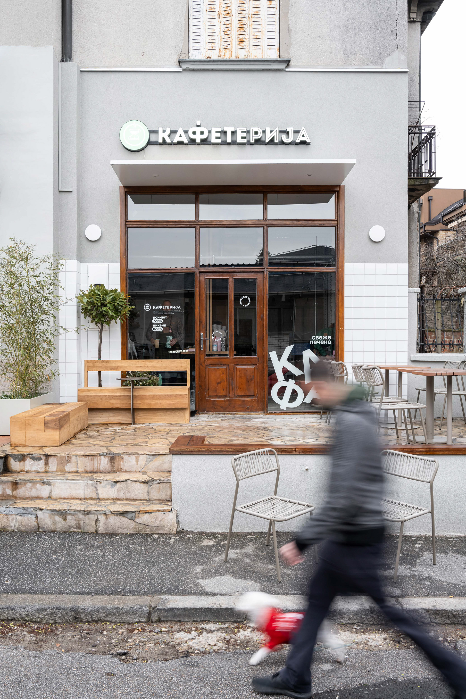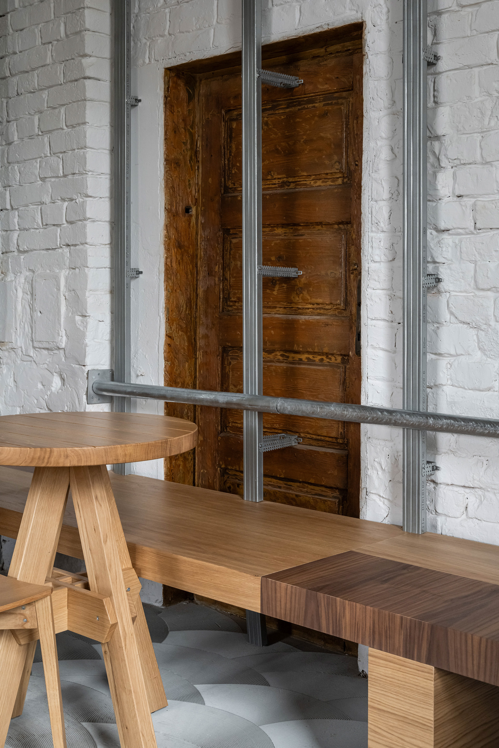 During the renovation process, elements of the original architecture were also discovered and restored, including a wooden door and a facade stained glass window, preserving the look of the building. The result of the studio's work is a space that combines respect for tradition and modern design solutions, reflecting the Kafeterija's philosophy as a place where everyone can find something to suit their taste in an atmosphere of creativity and craftsmanship.