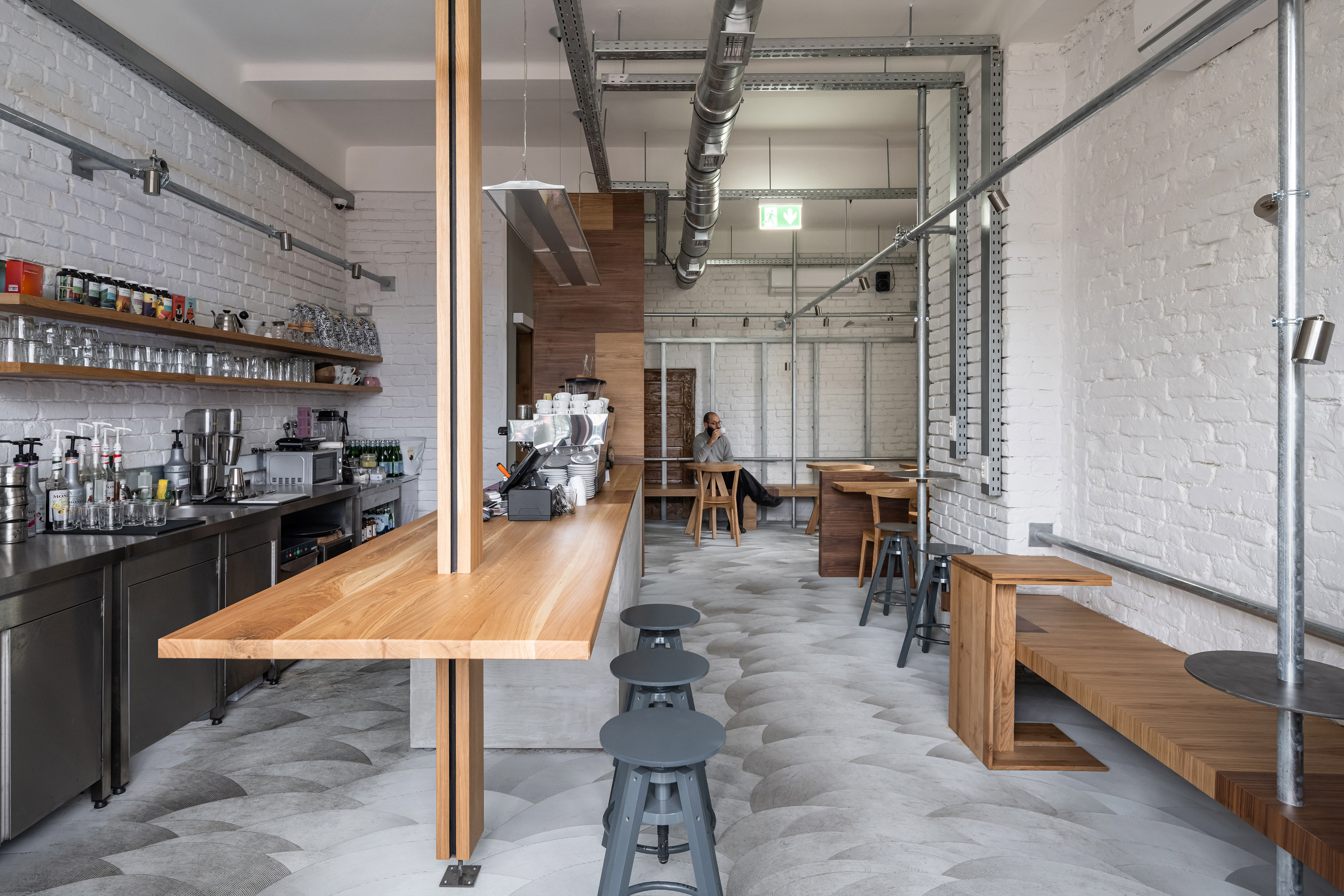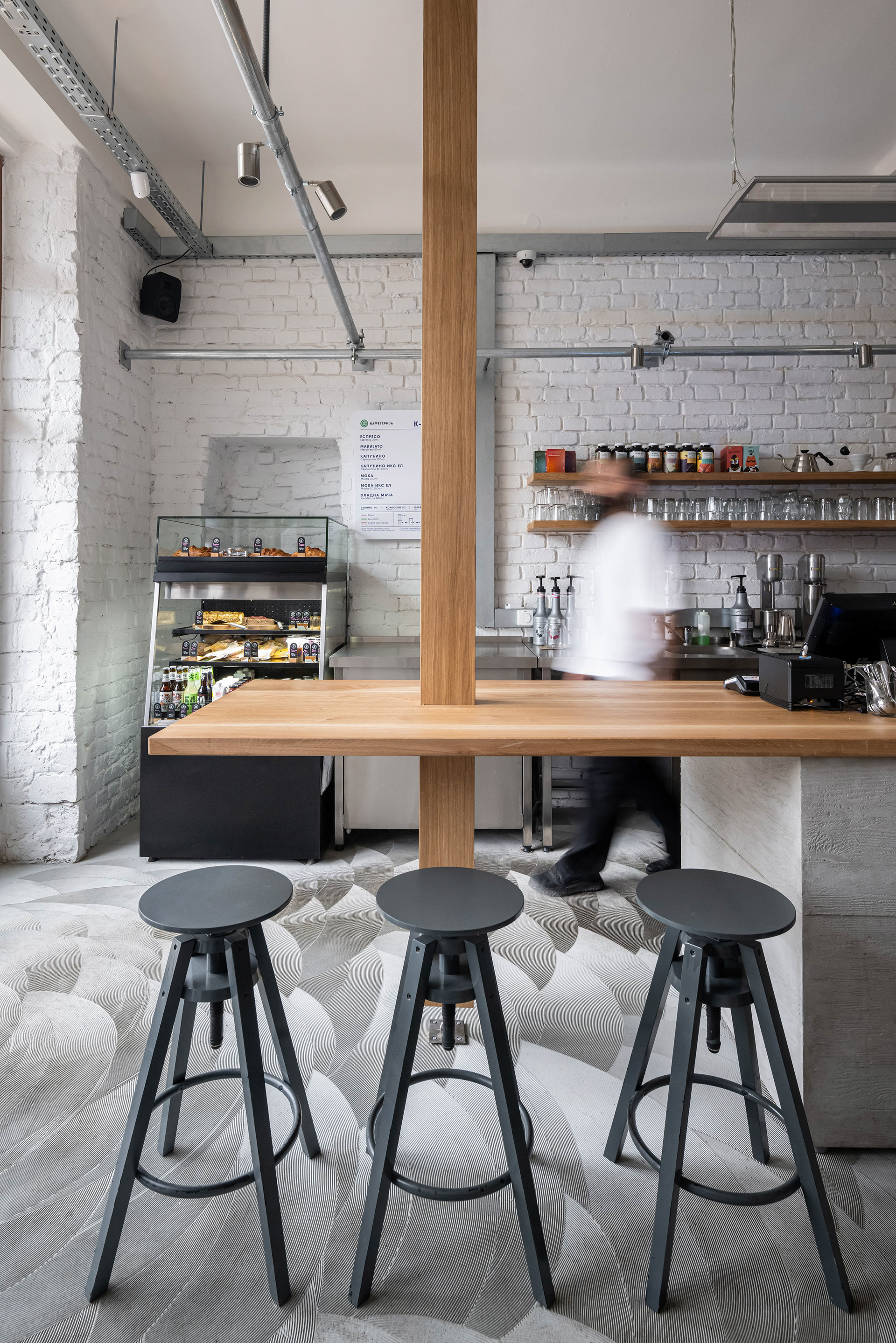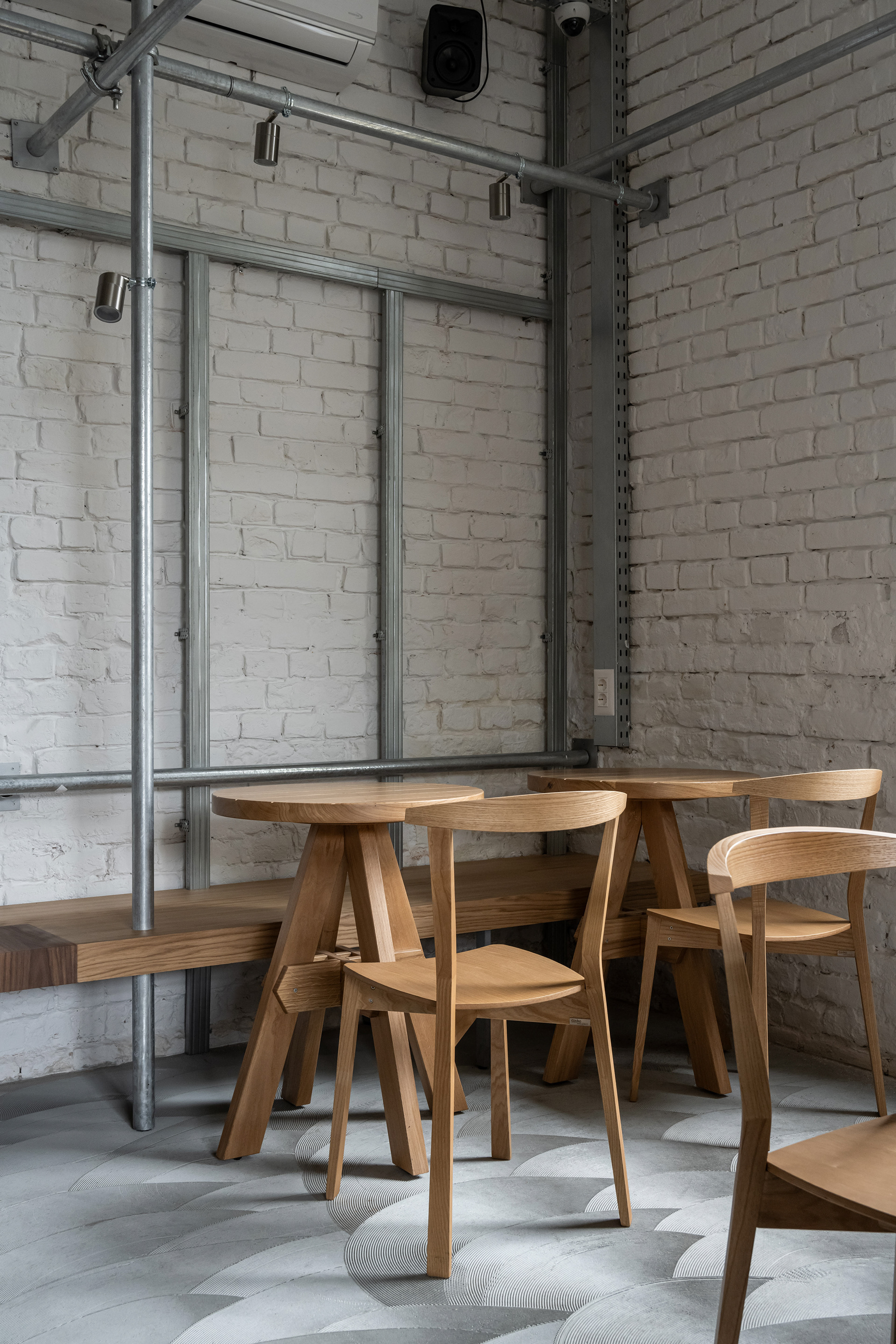 The future coffee house found its home in a historic building with brick walls and stained glass windows, where before there was a local bar. To create a true workshop, the first order of business was to whitewash the walls and engineer in the open. This is the base on which the attributes of a coffee shop - a bar counter, seats for visitors - were later added. Many objects of the room were assembled from what was found during the dismantling and construction process: for example, the counter and benches are made of several types of wood overlaid on each other using patchwork technique.