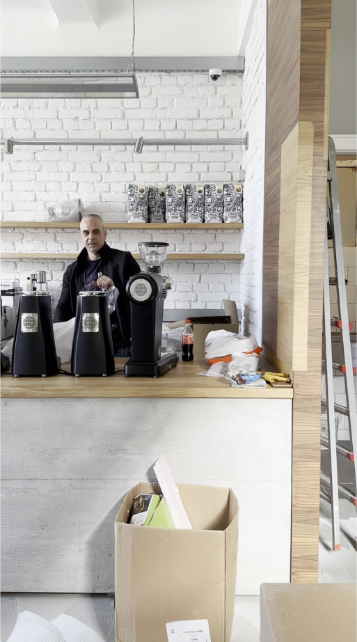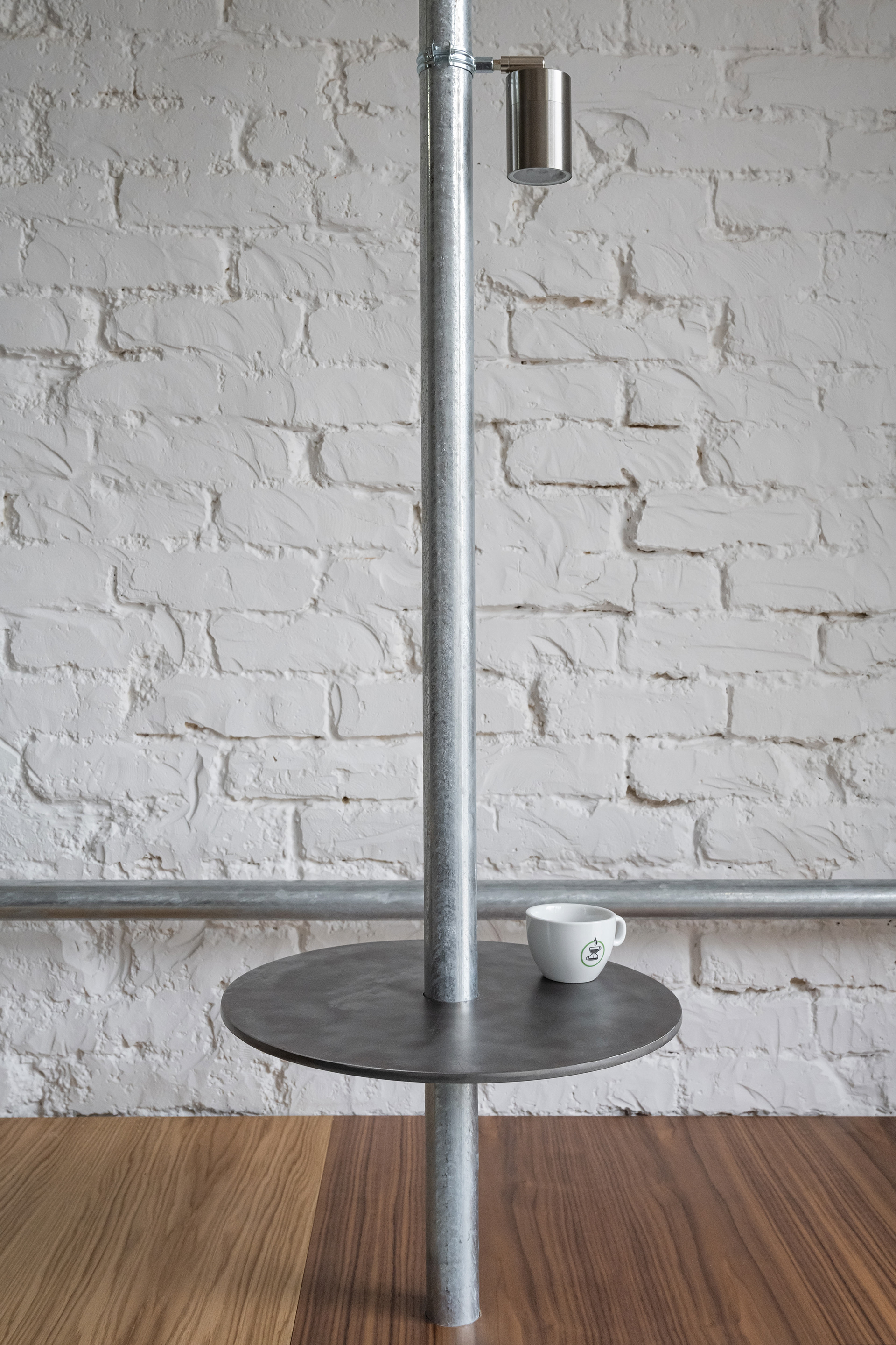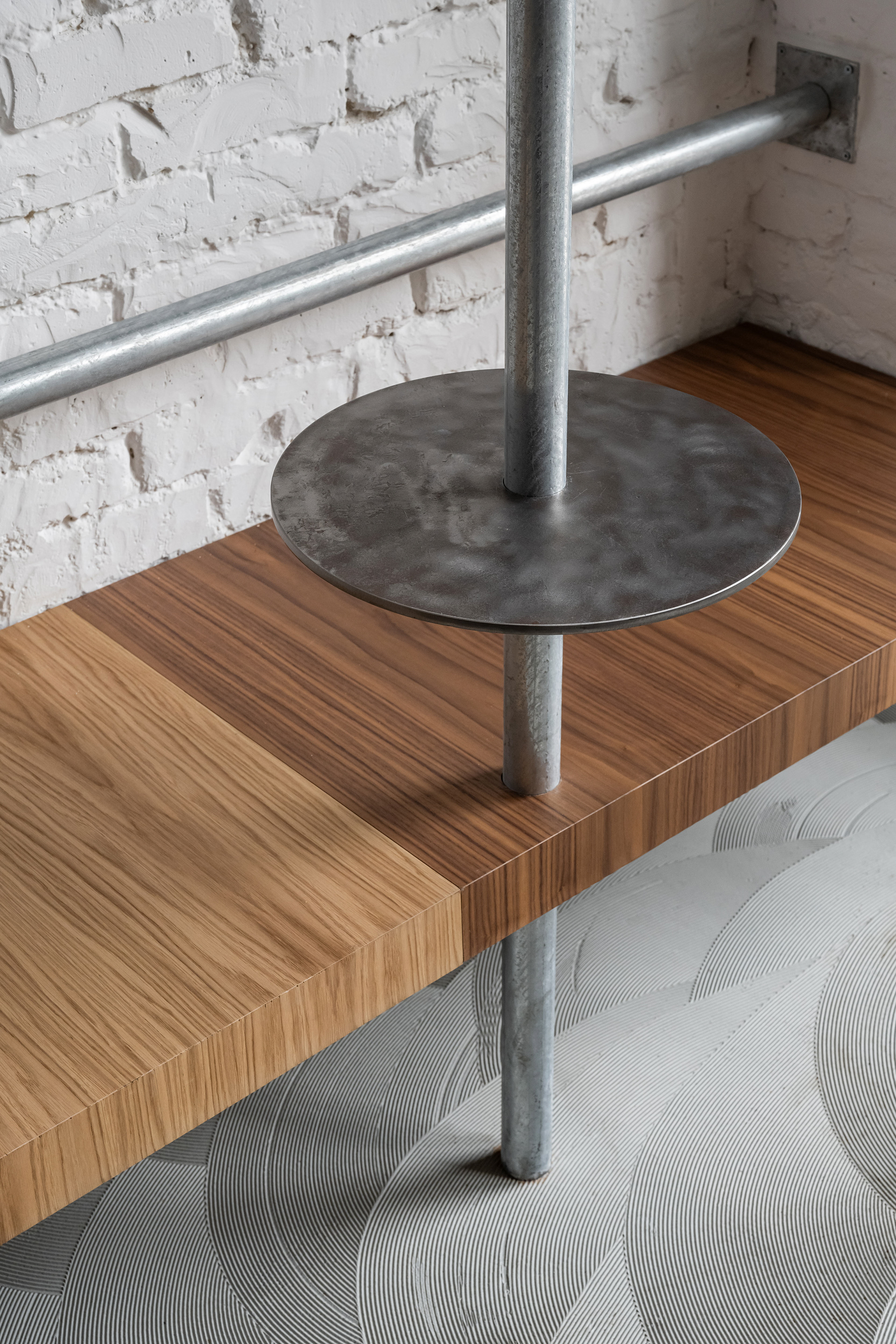 The future coffee house found its home in a historic building with brick walls and stained glass windows, where before there was a local bar. To create a true workshop, the first order of business was to whitewash the walls and engineer in the open. This is the base on which the attributes of a coffee shop - a bar counter, seats for visitors - were later added. Many objects of the room were assembled from what was found during the dismantling and construction process: for example, the counter and benches are made of several types of wood overlaid on each other using patchwork technique.
