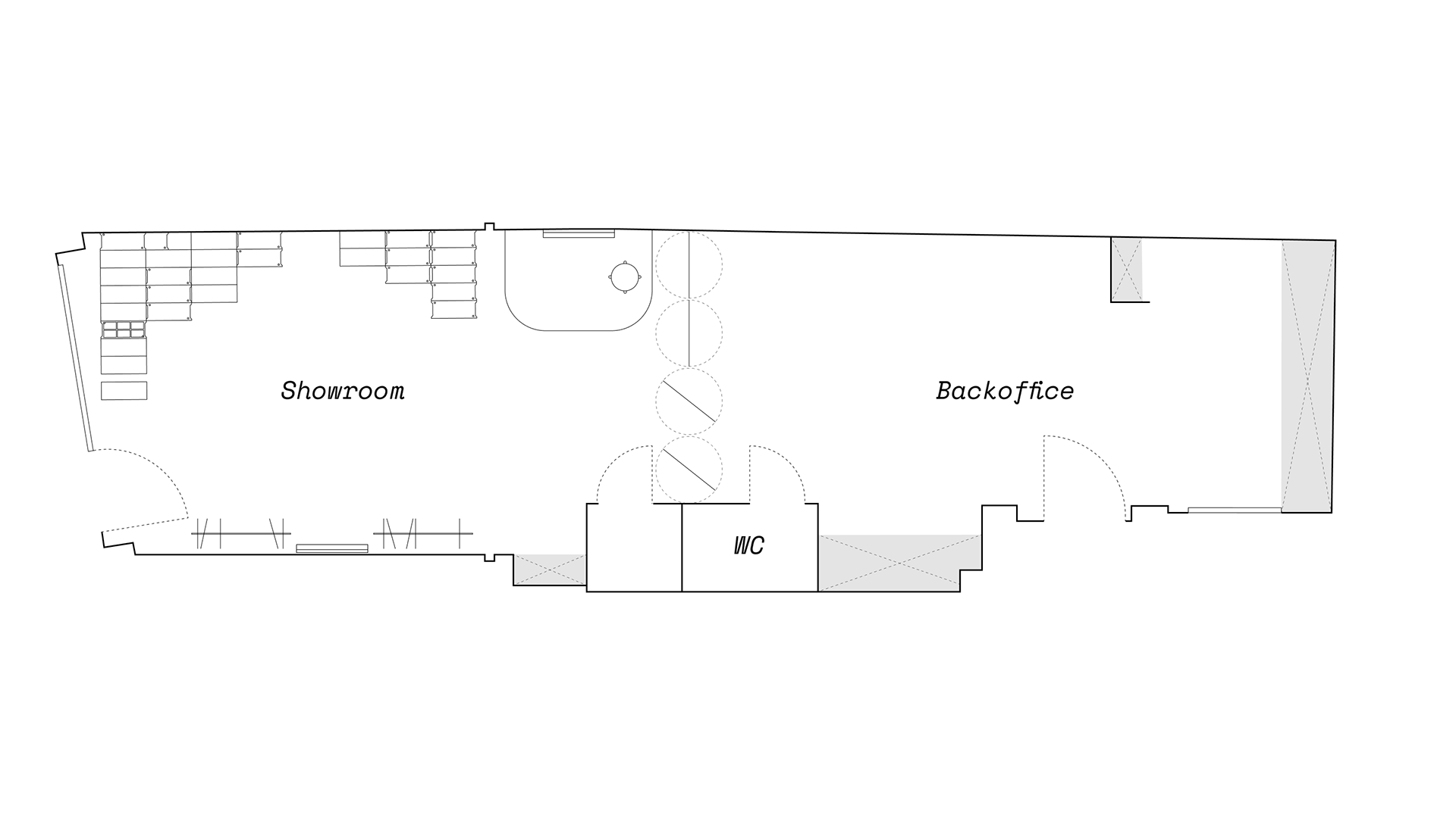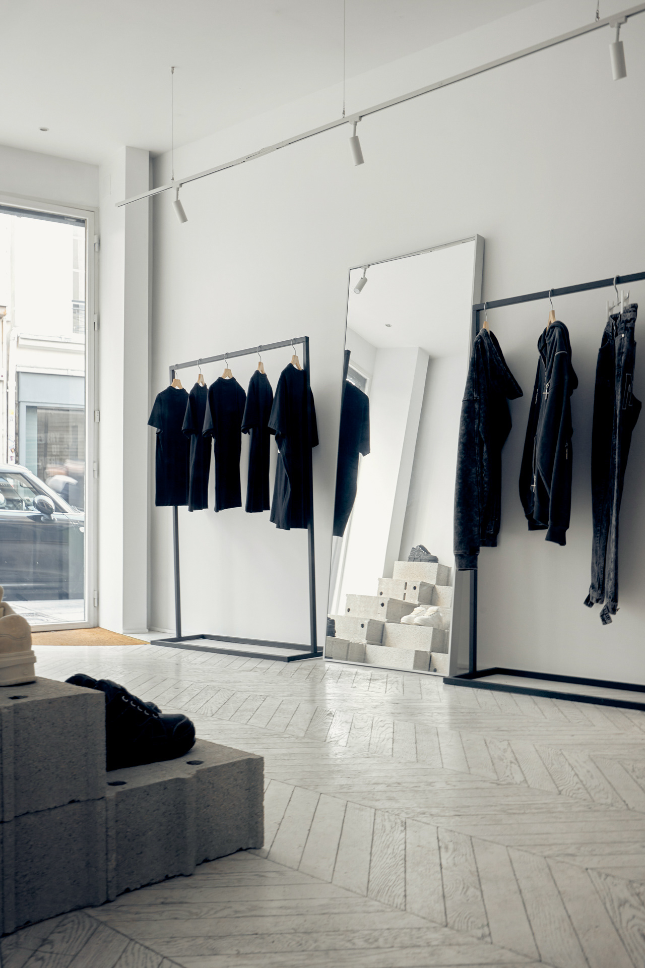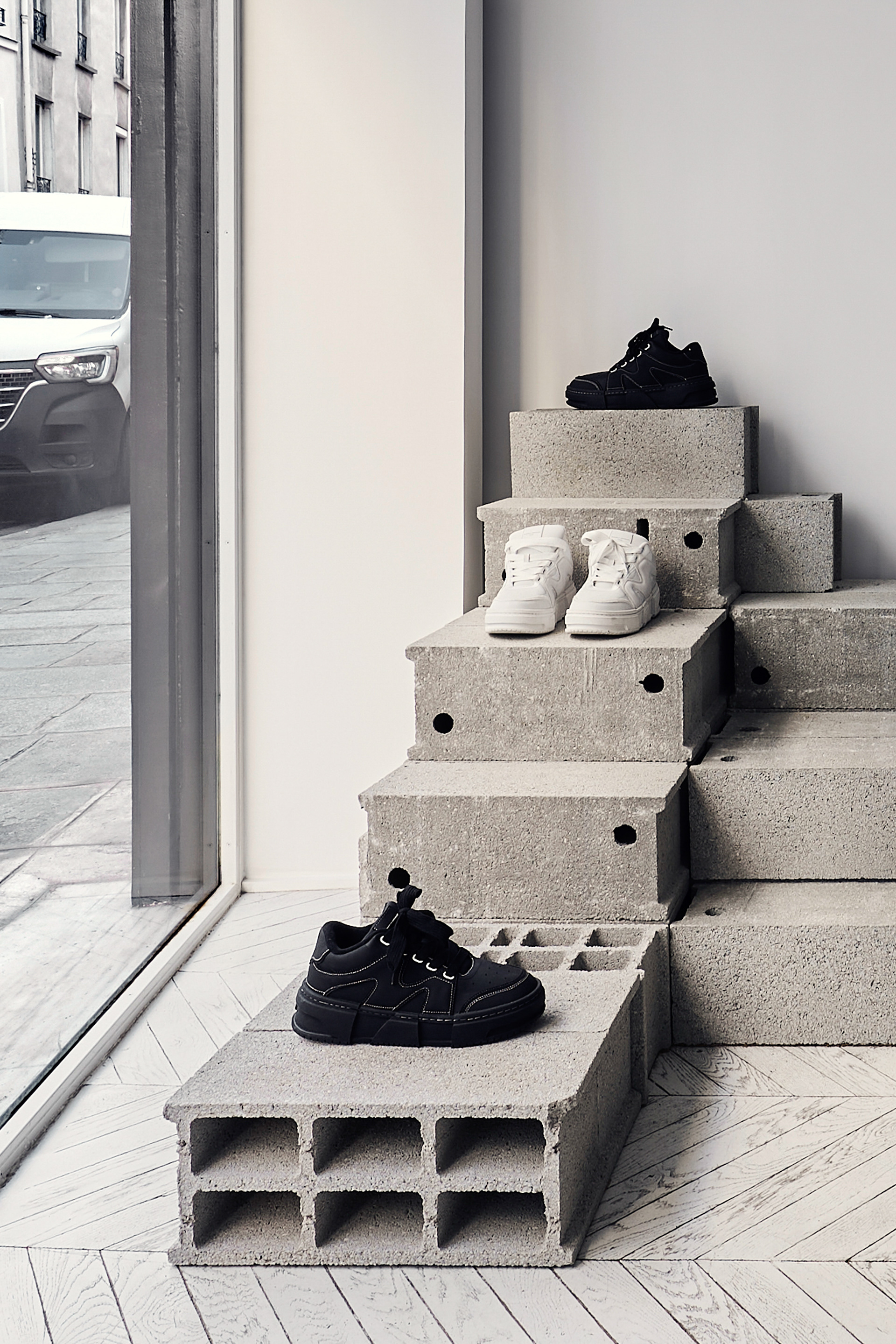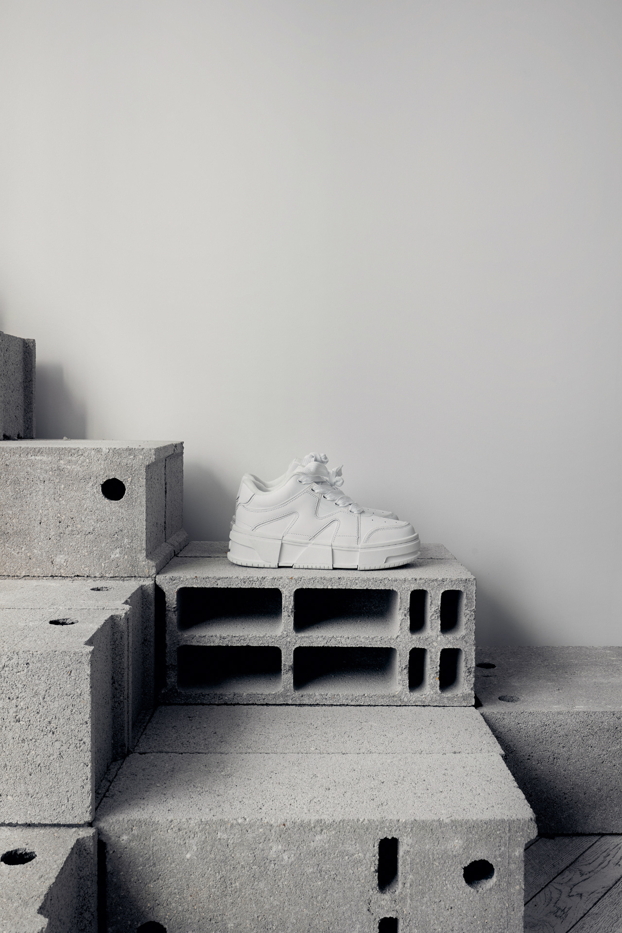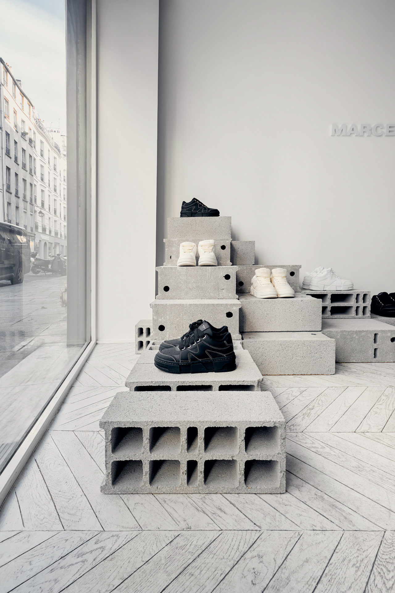 Instead of traditional stands and shelves for shoes, the showroom uses materials and solutions that are a contrast to the brand's products, yet harmoniously complement them. Volumes of brutal concrete building blocks were created, on which shoes are chaotically placed. The light gray color of the blocks does not take up unnecessary attention and is an excellent background for the presentation of the shoes. These blocks are not fixed, they can be moved around, assembled into a DJ rack, a shelving unit, or any other relevant scenario. This way, diversity in brand perception and flexibility in the space was maintained.