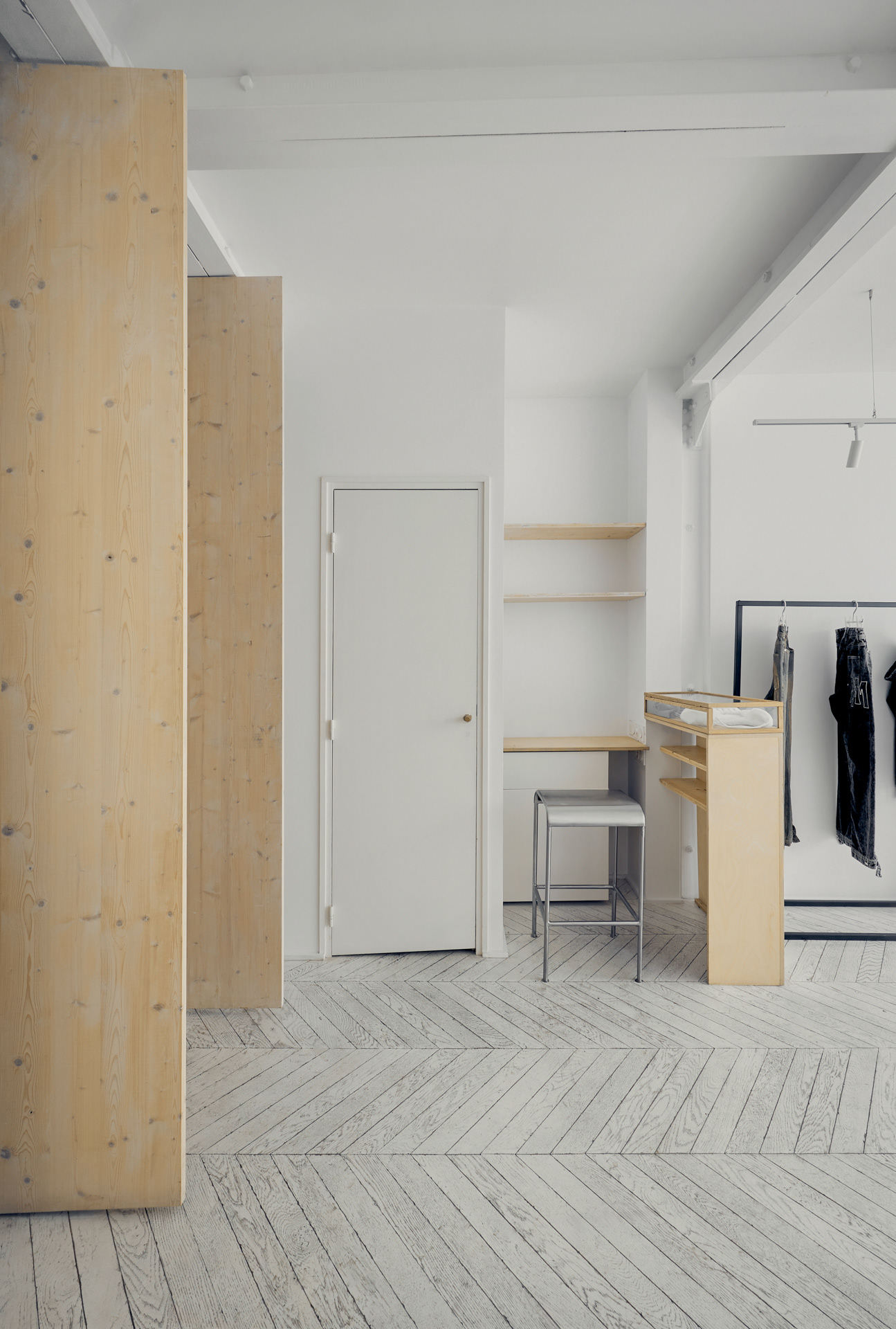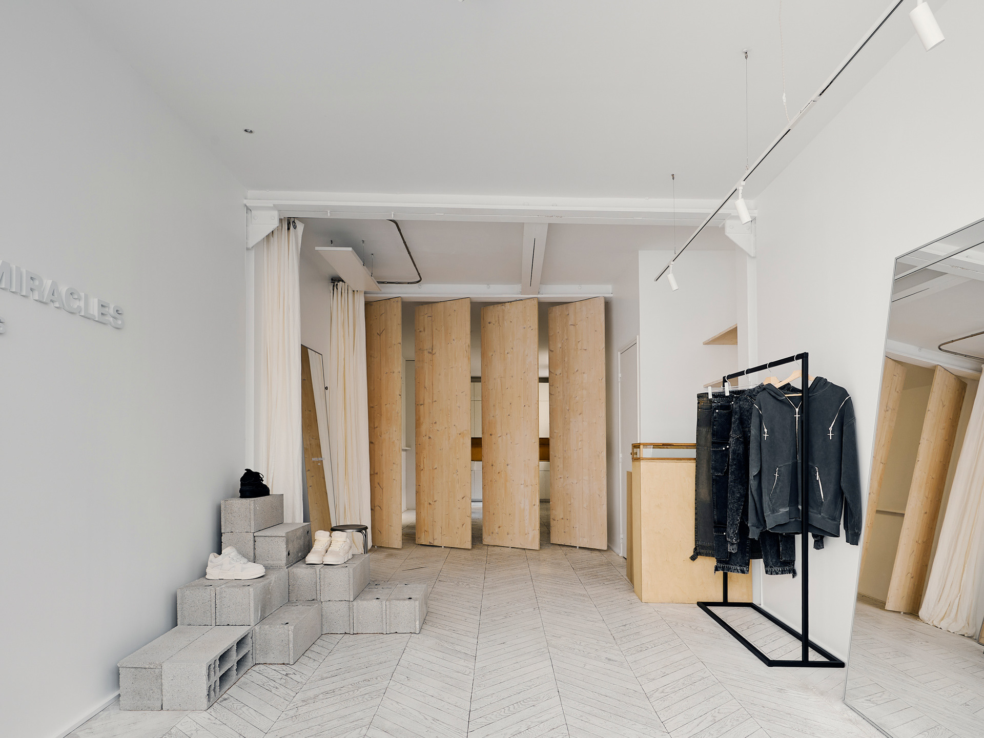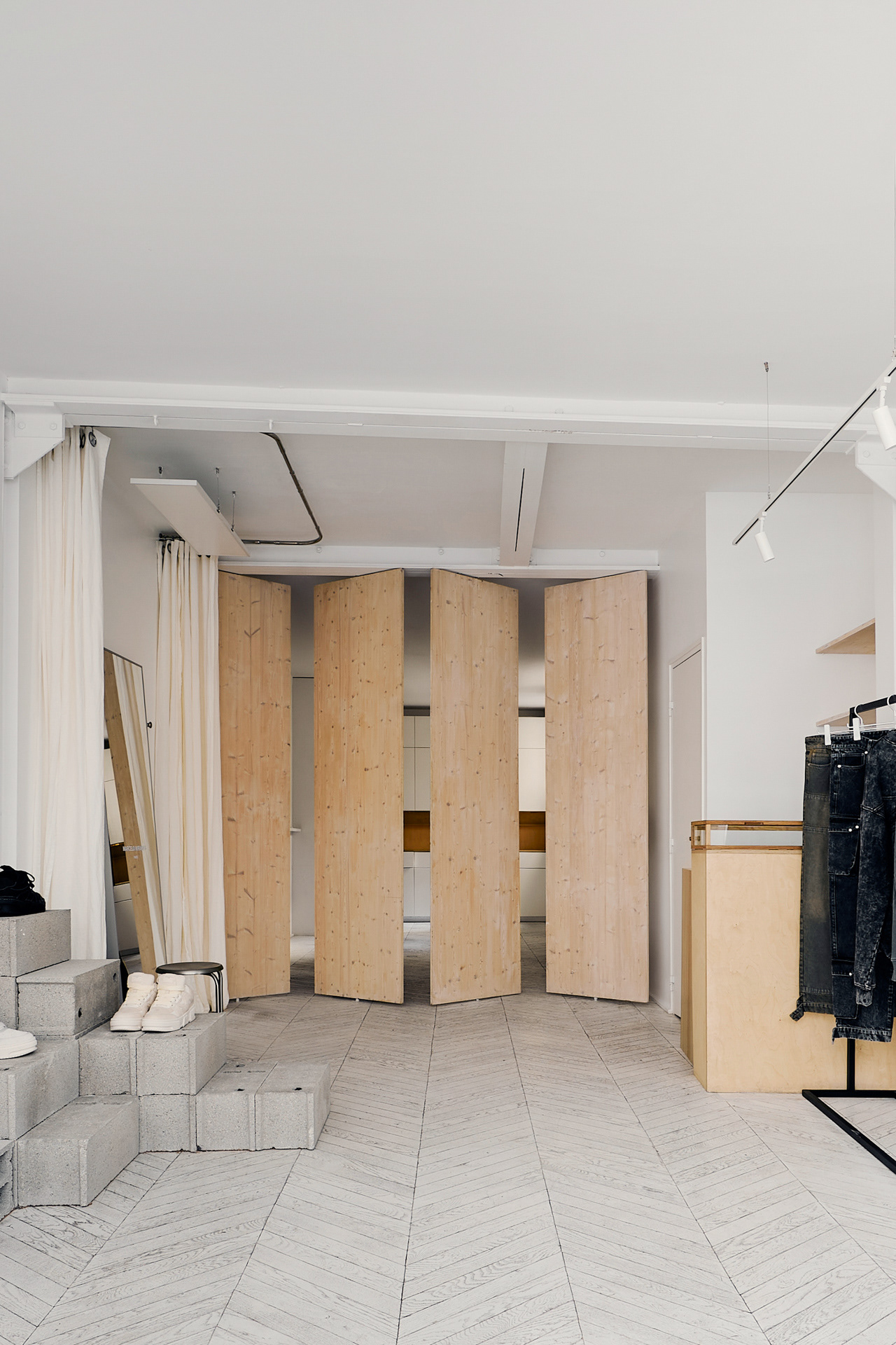The materials were used to create contrasts, which made the room fuller but still light. The building blocks are not an accent color, with their concrete texture contrasting with the smoothness of the walls. So does the warm wood of which the movable partitions are made. Combined with the white and gray walls, it does not add accents but gathers the space around itself. Black rails were chosen with the same idea in mind - to add contrast and graphicality to the space, keeping it light.