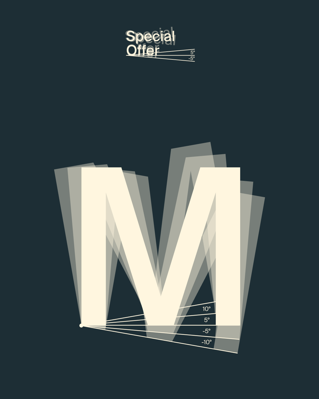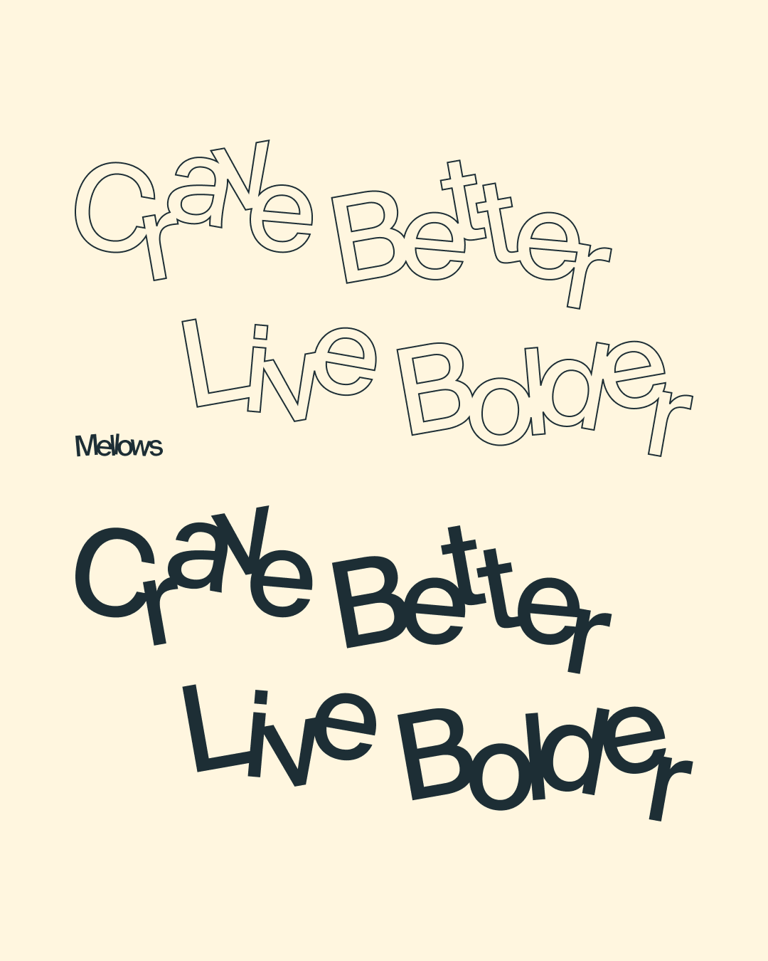 In headlines and key phrases, the letters behave just like Mellows itself — free, bold, and unapologetically their own. Each letter can be tilted at precise angles of –10°, –5°, 5°, or 10°, and may shift slightly along the baseline.