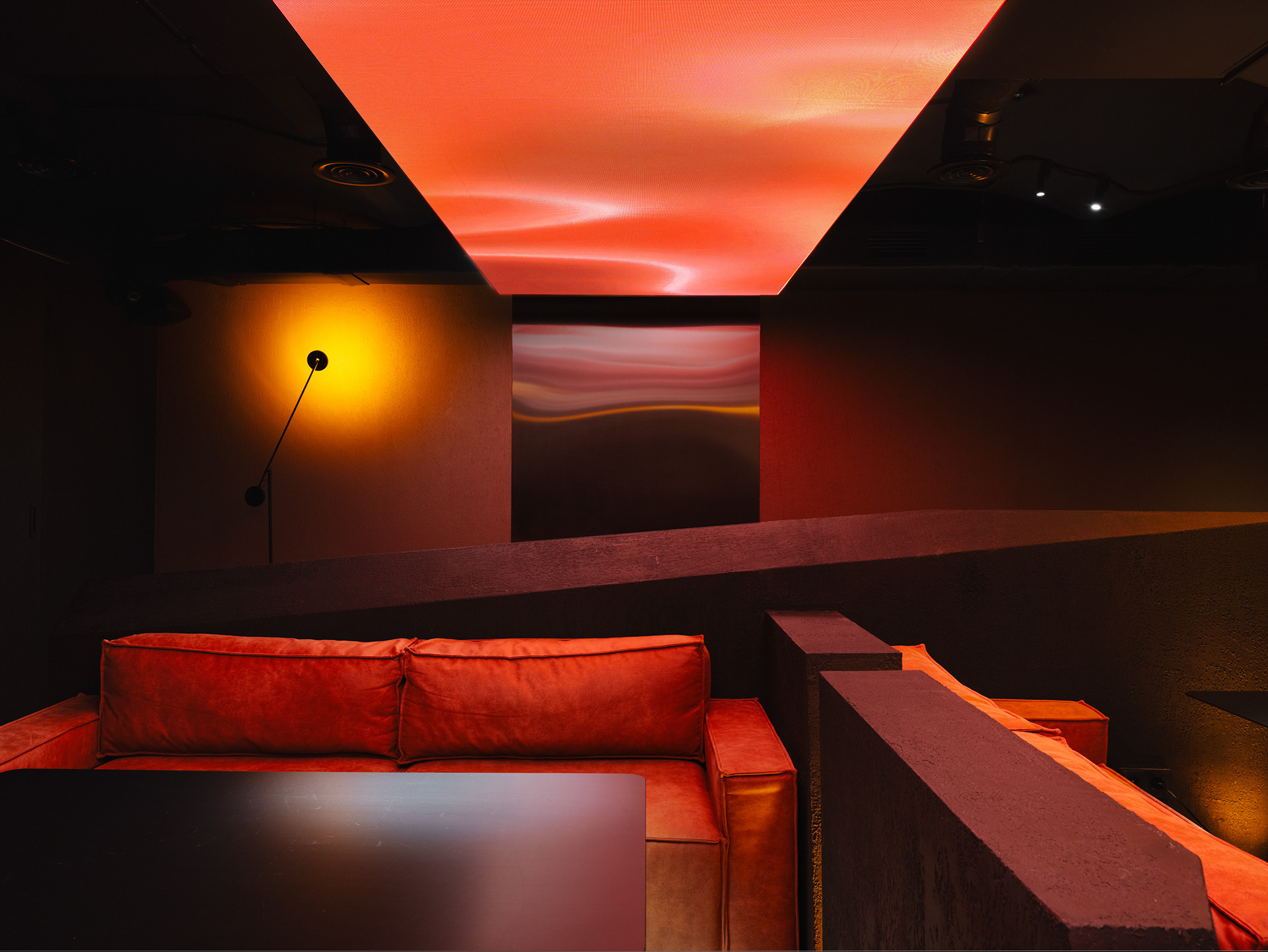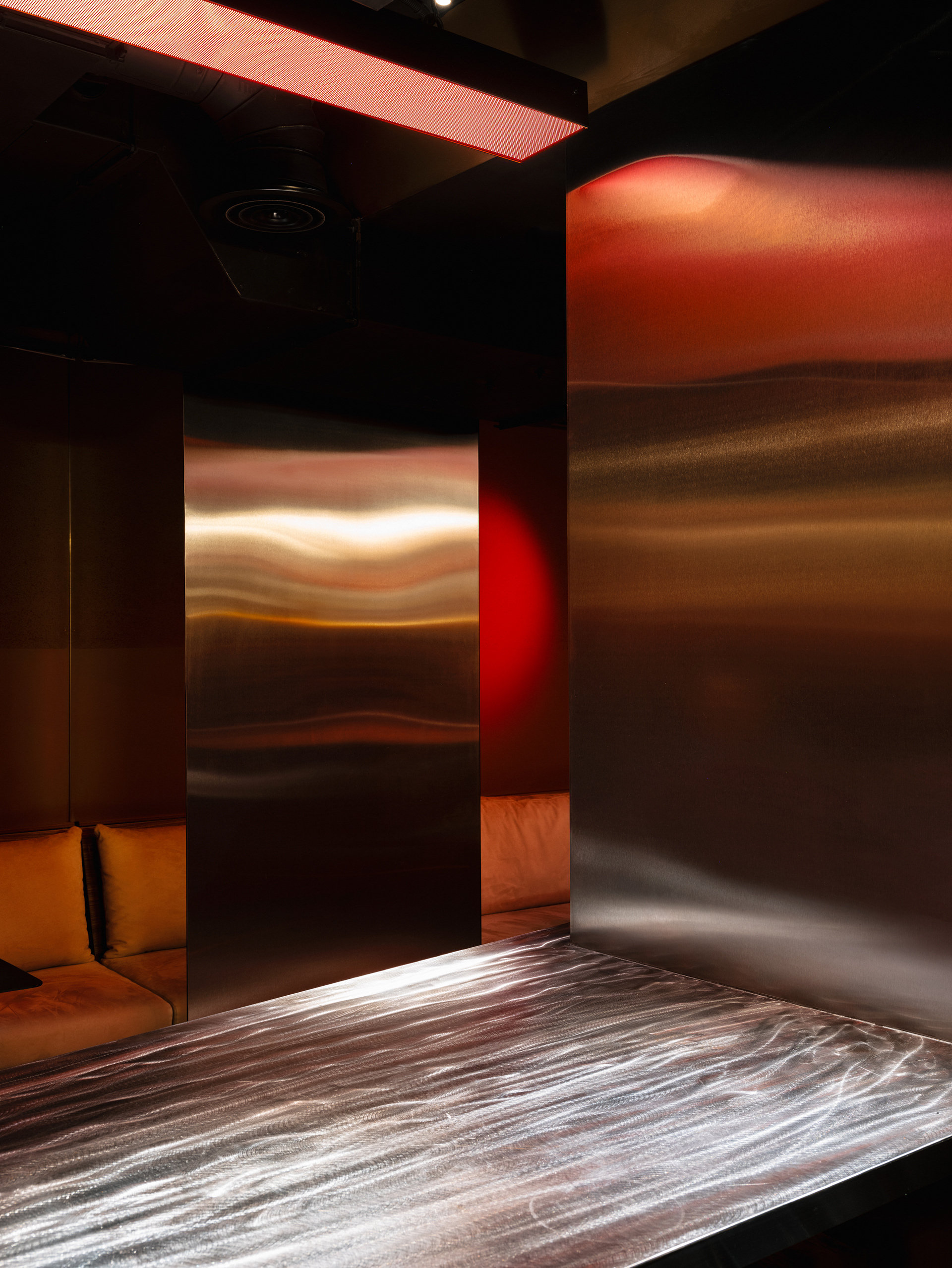 To enhance the immersive experience, an RGB ceiling panel displays a pulsating lava video sequence, visually unifying the entire space. Columns are clad in stainless steel, contributing to a cohesive, monolithic aesthetic.