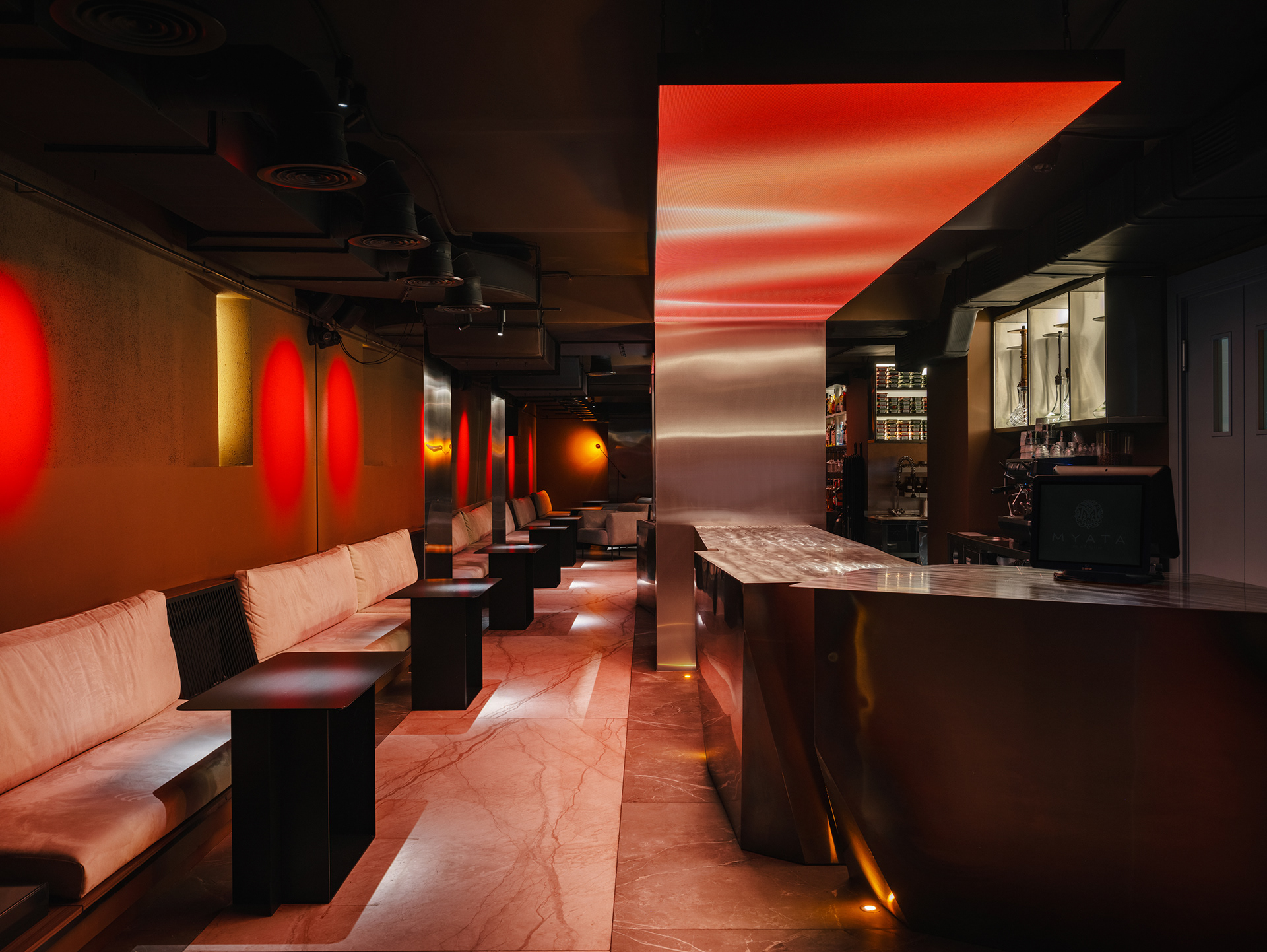 Myata is a chain of lounge-style spaces. Our task was to rethink the familiar perception of the brand's concept and create a unique, atmospheric interior — transforming spatial limitations into strengths. The project was located in a basement with a narrow layout, low ceilings, and no natural light.