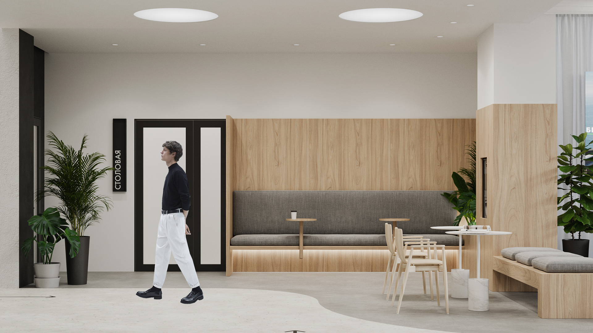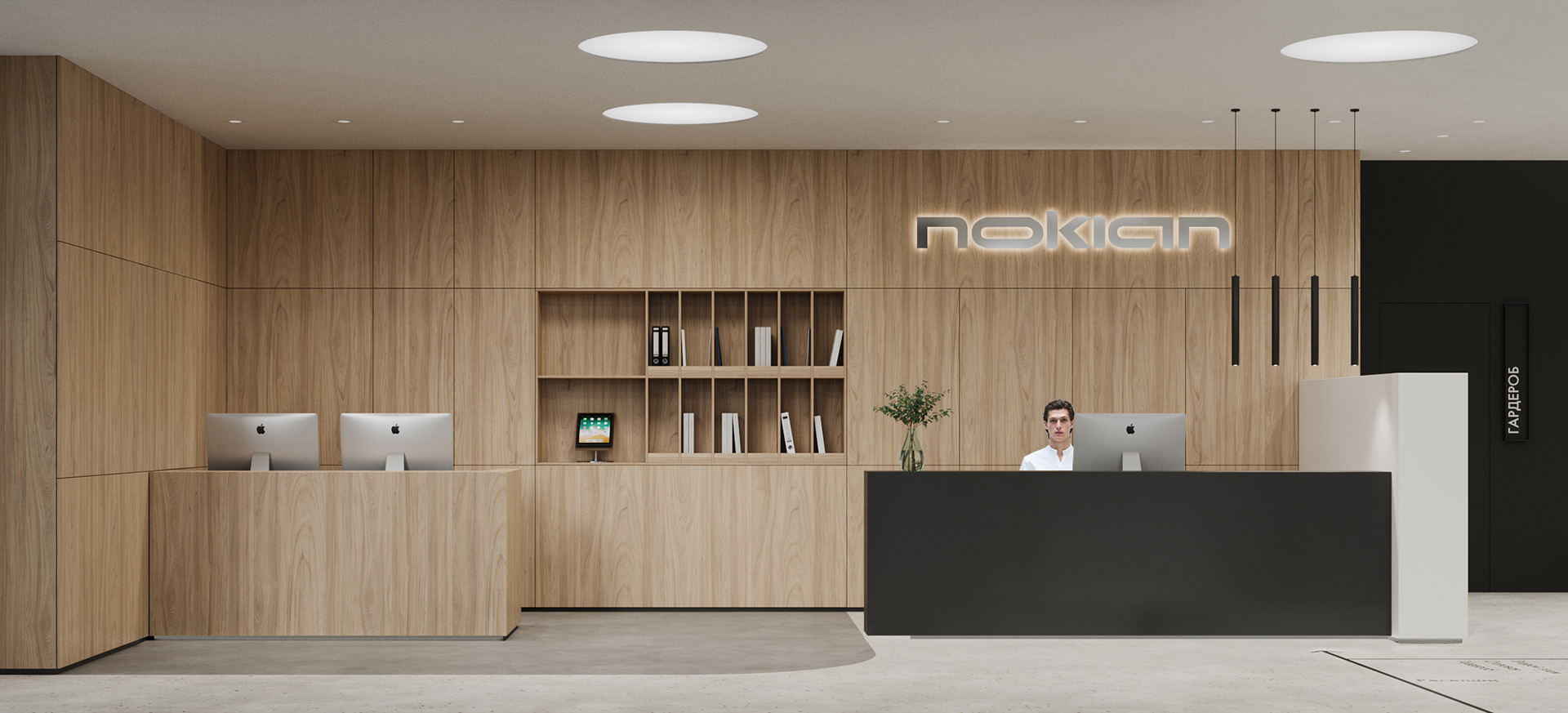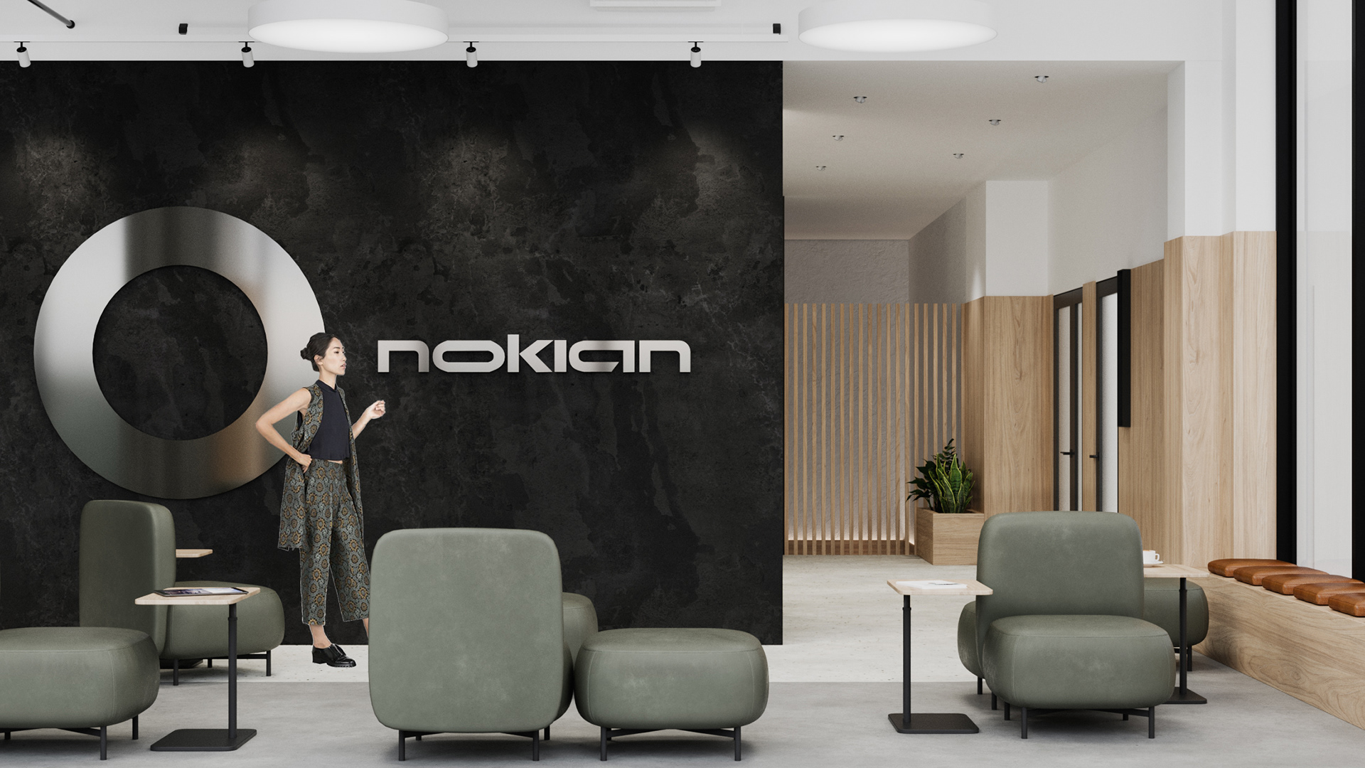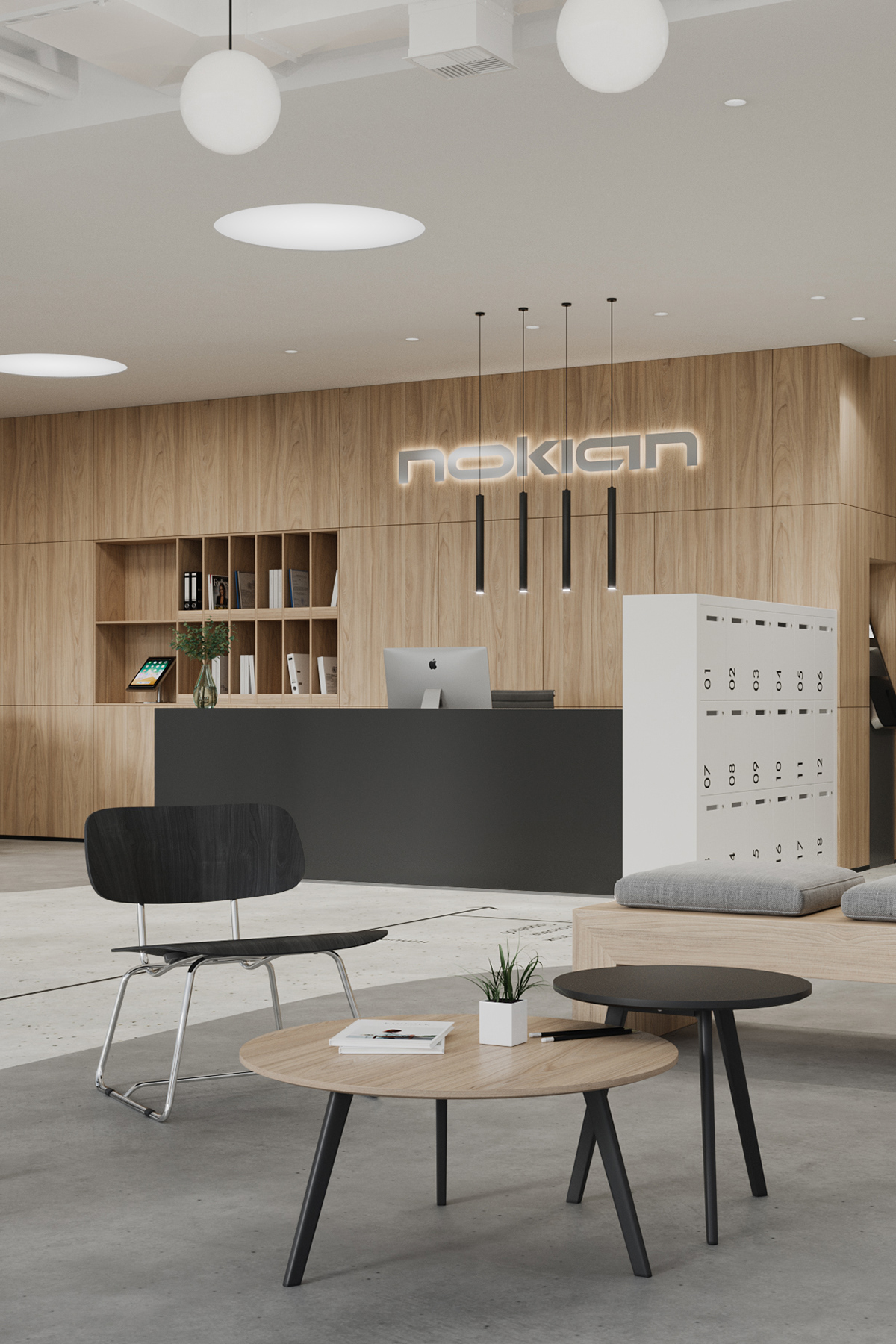 Nokian Tires is a Finnish tire manufacturer, which means it is connected to the entire automotive industry and the road structure. The interior concept is based on the interpretation of the street theme and the Scandinavian spirit. The street theme (road markings, tire tracks) is implemented delicately - in the drawing of different floor coverings and navigation. Navigation serves as an additional source of information and complements the interior