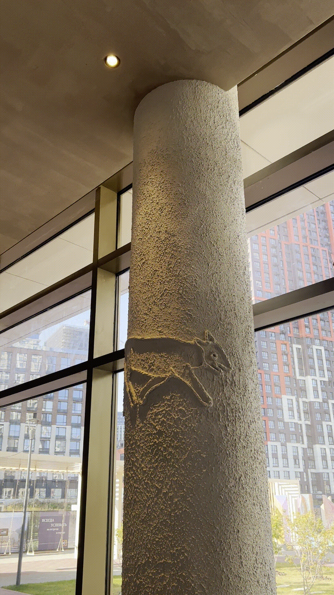 Wall impressions are a fusion of traditions, combining religious symbols and figures from Georgian temples with animals inspired by Pirosmani’s paintings and motifs from Georgian script. A golden installation in the center of the hall references icon frames, underscoring the significance of religion in Georgian life. Inside, the restroom is designed with elements inspired by ancient temples — vaulted ceilings, reliefs, and decorative finishes.