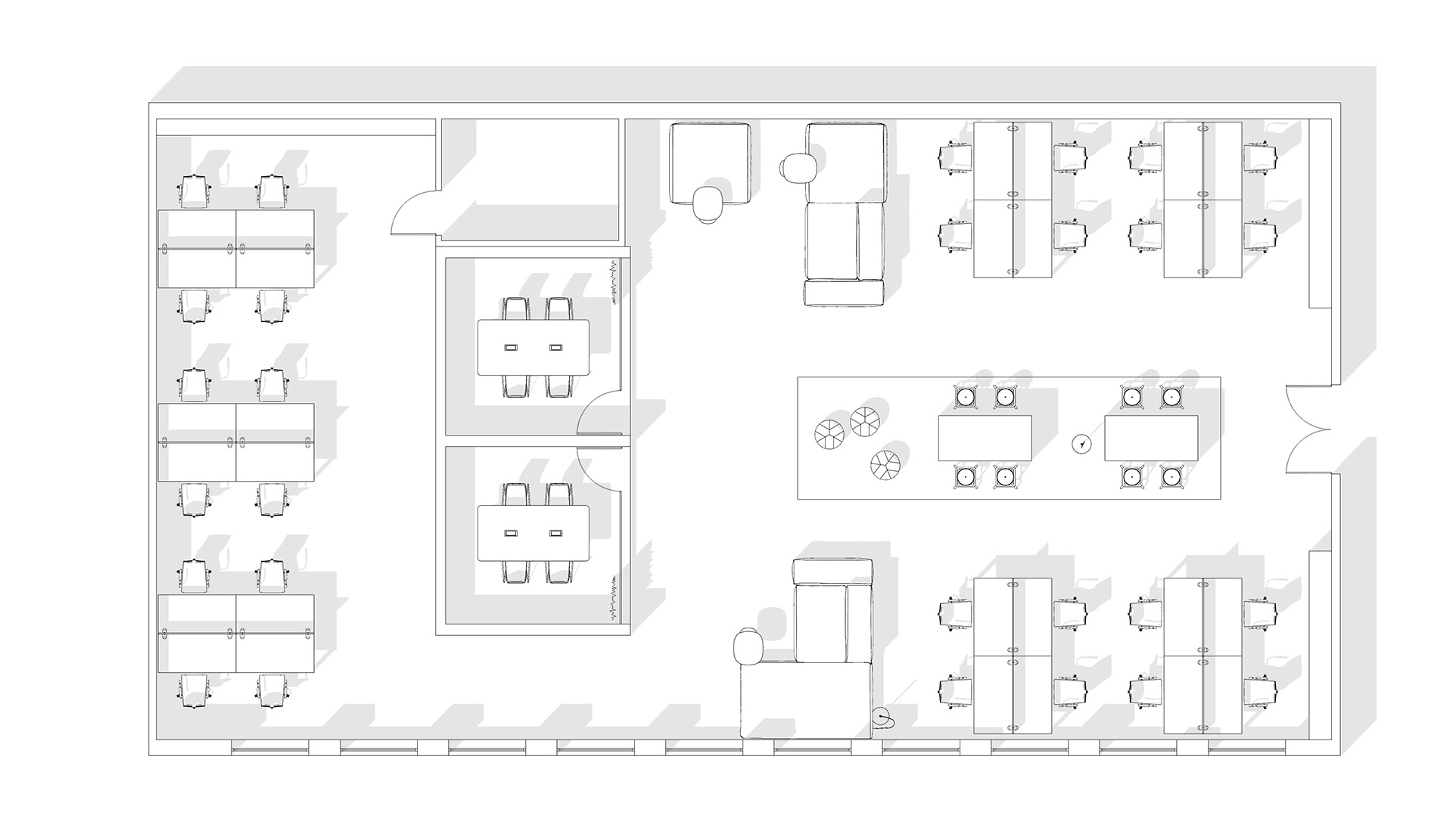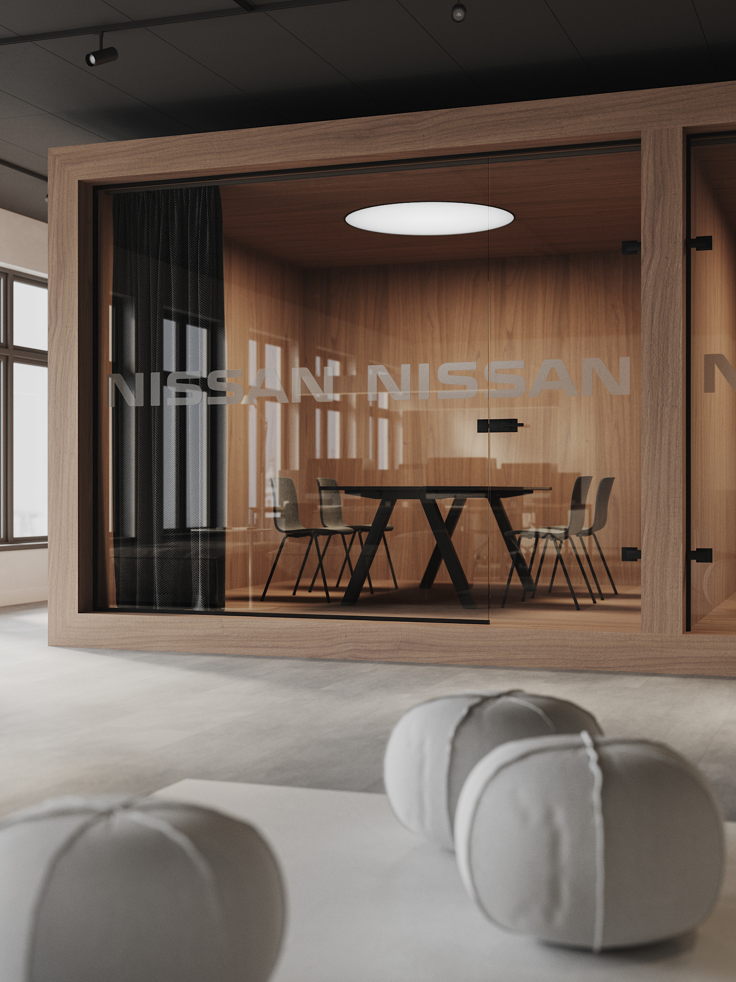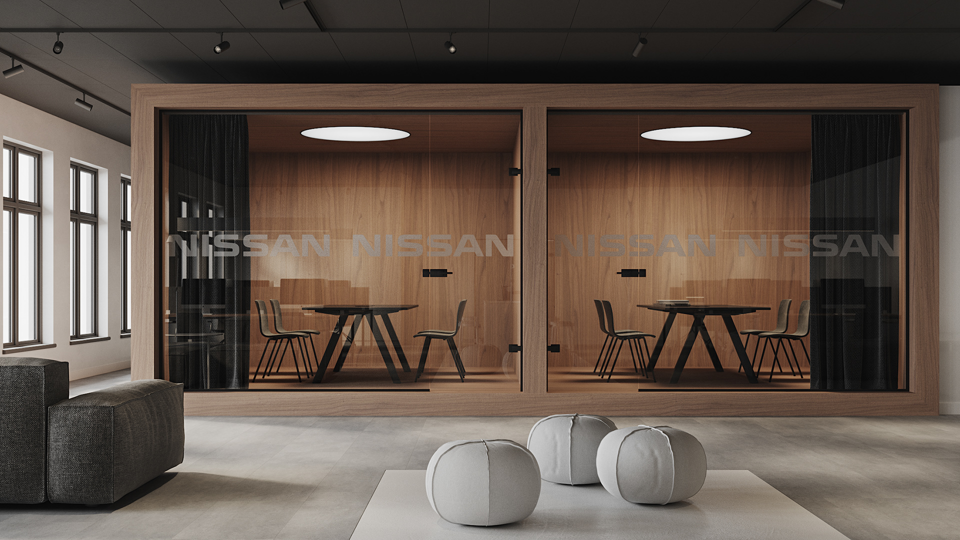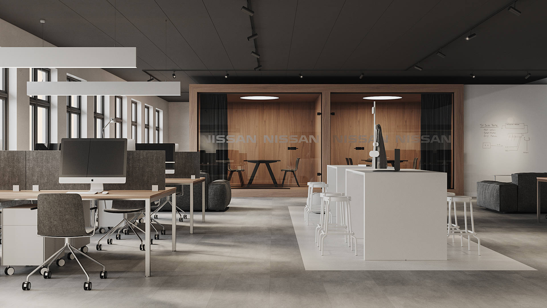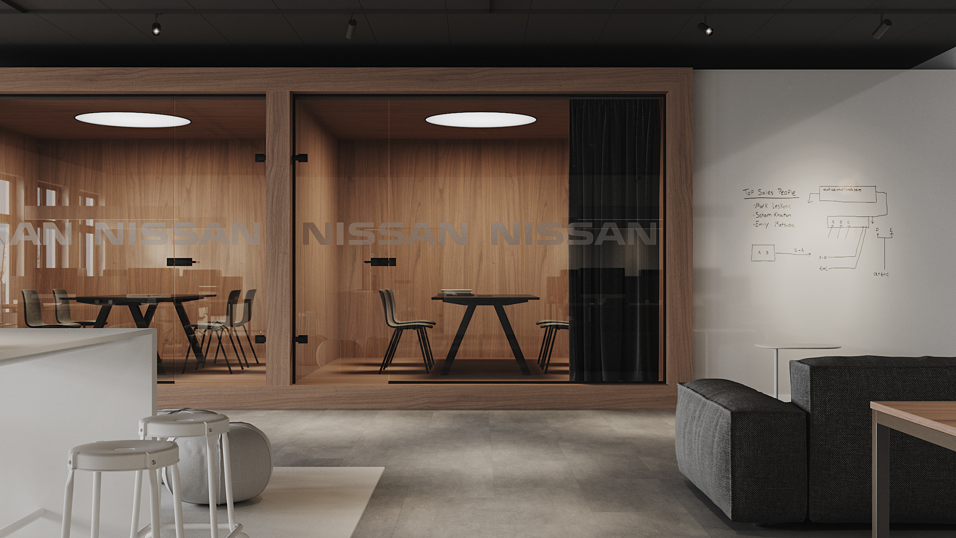 Repair of the office for the sales department of the St. Petersburg branch of the Nissan. We faced the problem of creating space as part of the general renovation of the administrative part of the plant. We divided the common open space into several areas - meeting rooms, work areas, soft seating areas and tables for quick meetings. The overall color scheme is neutral, light, using natural materials